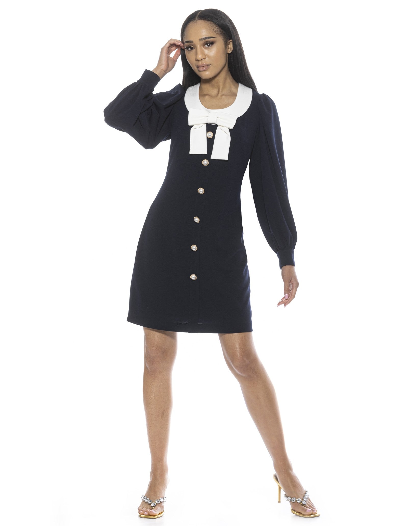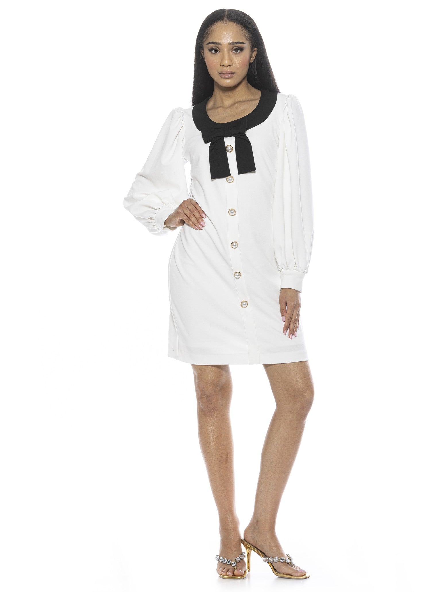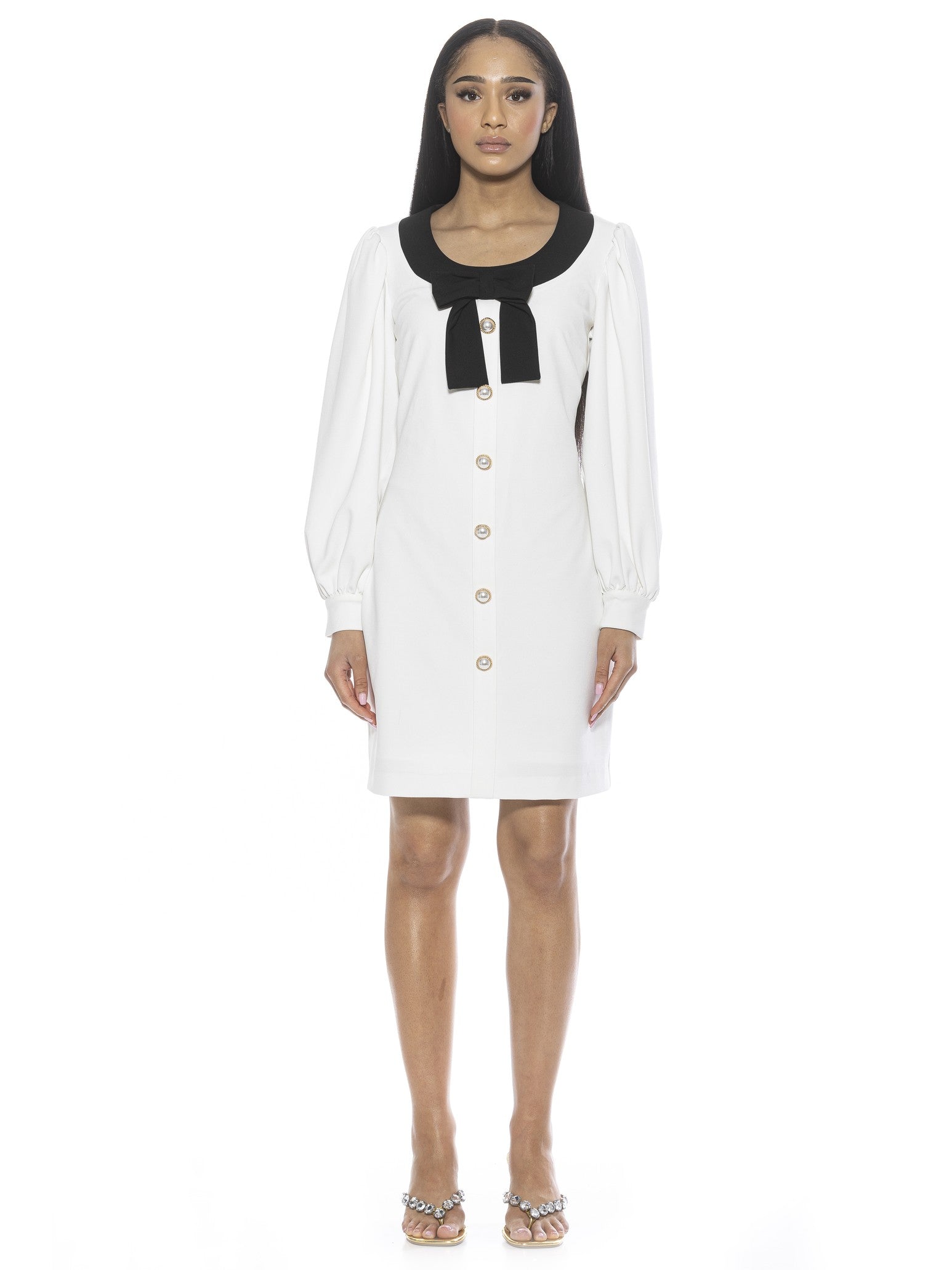 Introducing the luxurious Miyako Dress, a masterpiece of elegance and sophistication. This mini dress features a delicate bow and contrast trim, with pearl buttons that add a touch of opulence. The scoop neck and long sleeves complete this exclusive look, perfect for any occasion.