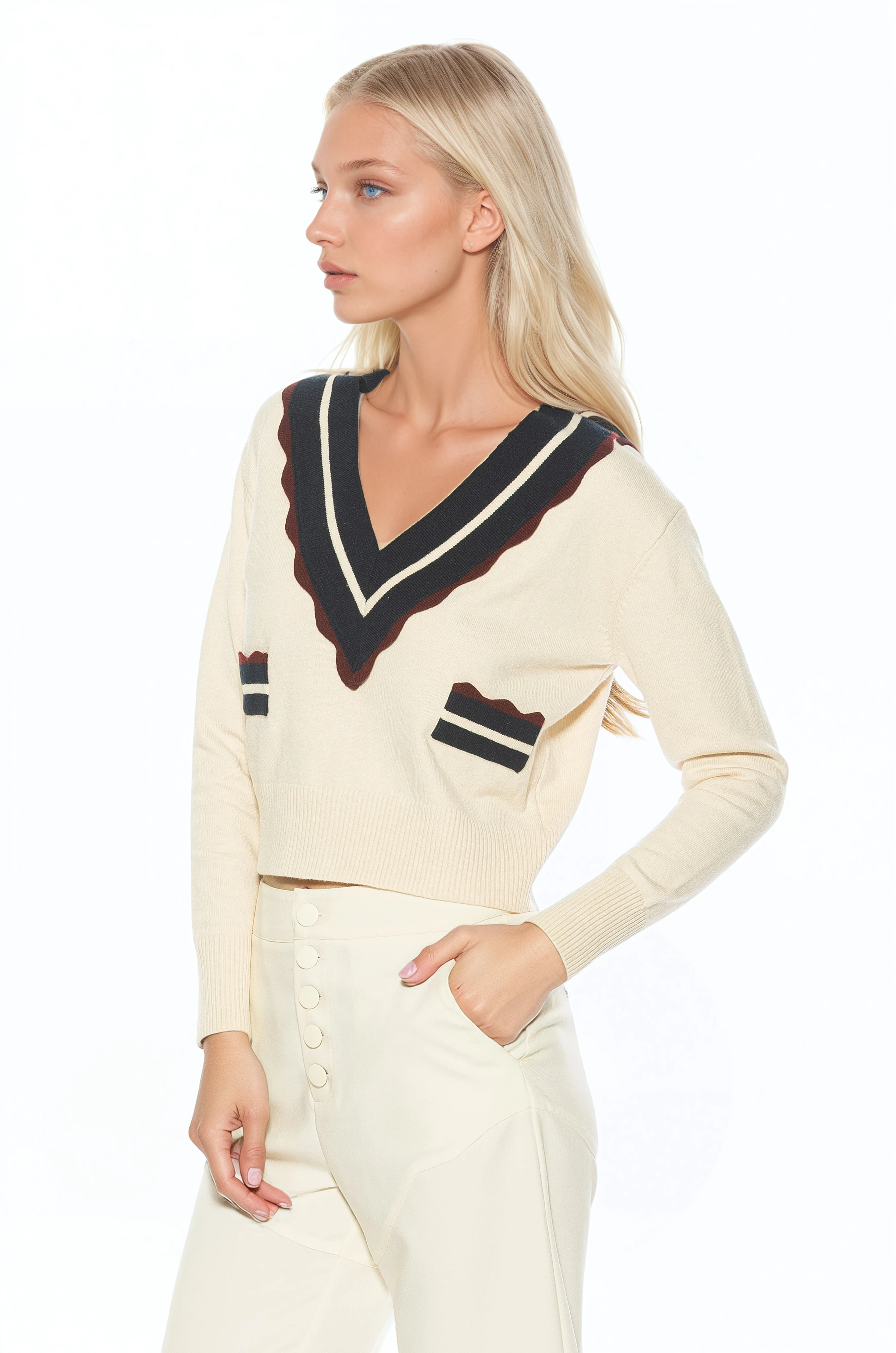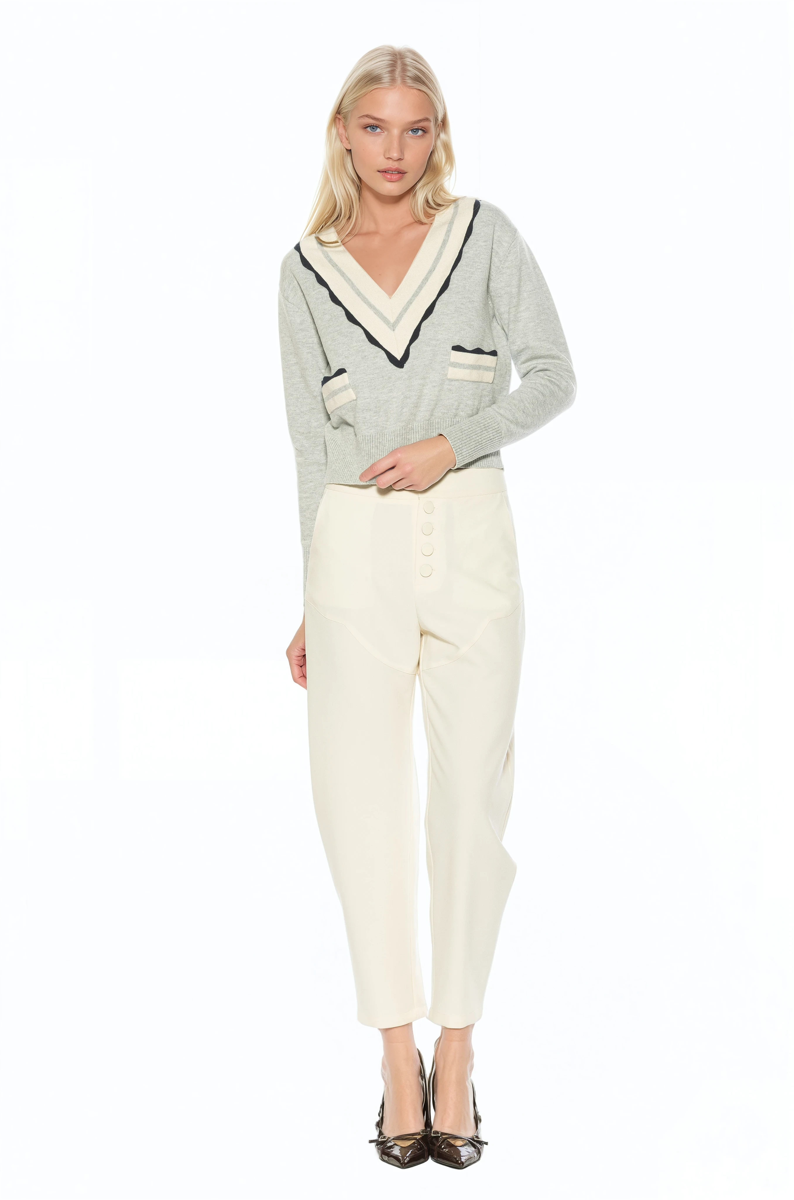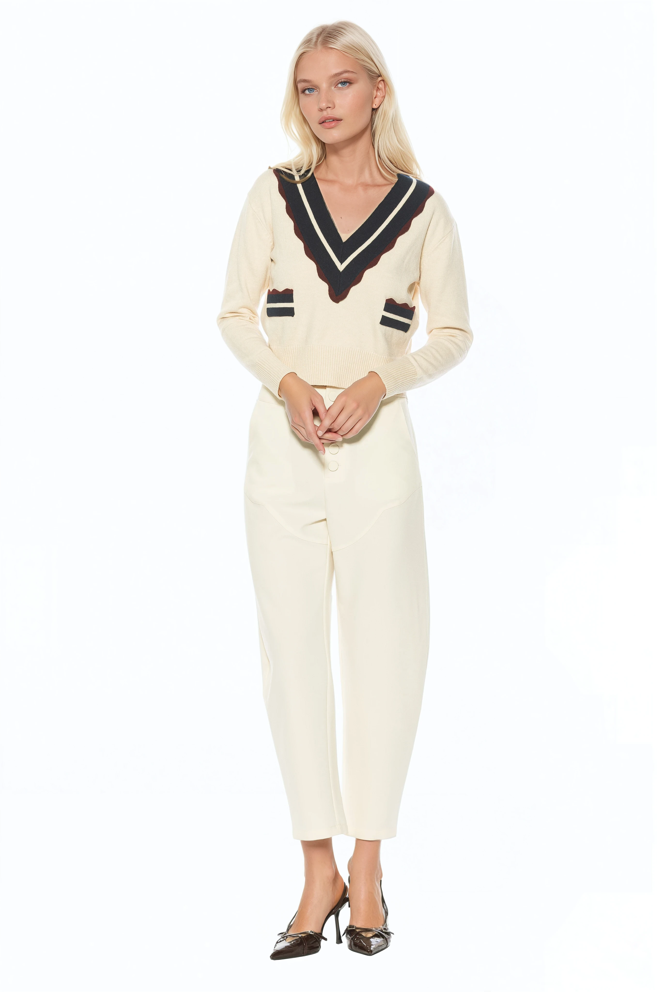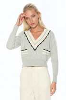 Classic with a modern twist, the Arden Deep V Contrast Trim Cardigan is a refined knit essential designed to elevate everyday layering. Crafted in a fully knit sweater construction, this piece features a deep V neckline accented with contrasting trim for a clean, graphic finish. Designed with a relaxed yet polished silhouette, the Arden cardigan offers comfortable structure and effortless style. The contrast detailing adds visual interest while maintaining timeless appeal, making it an easy staple to pair with tailored bottoms or casual separates.