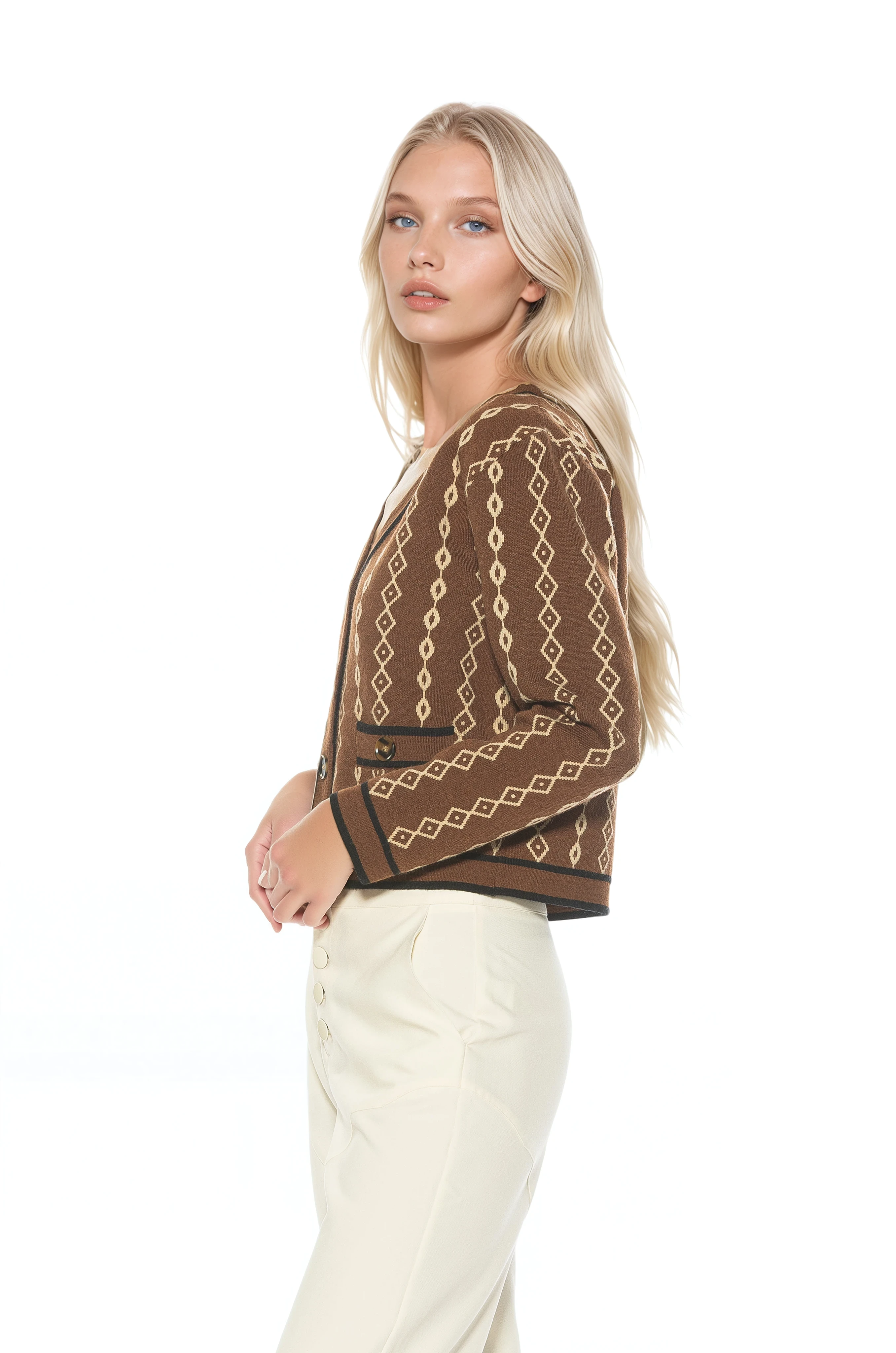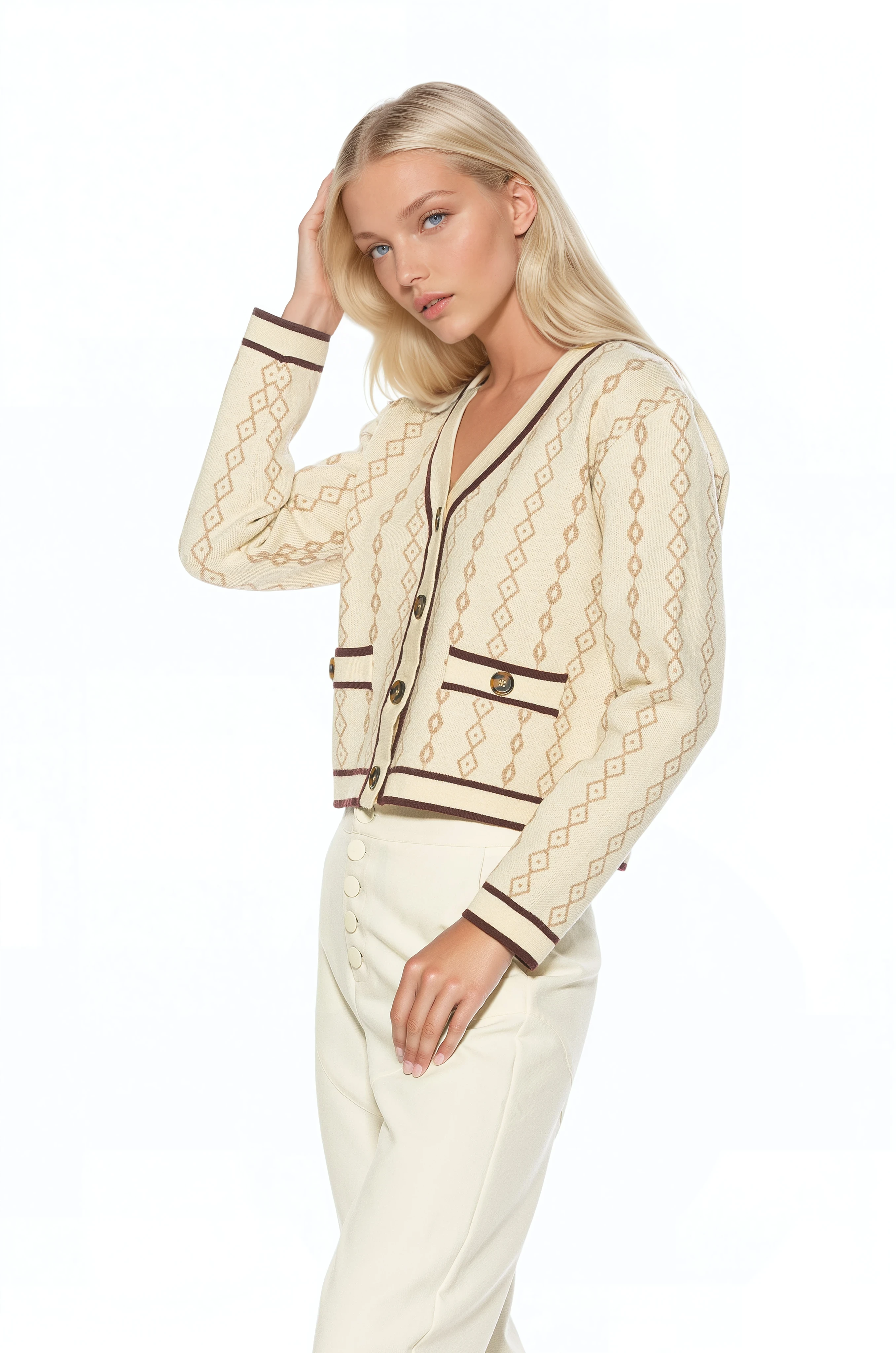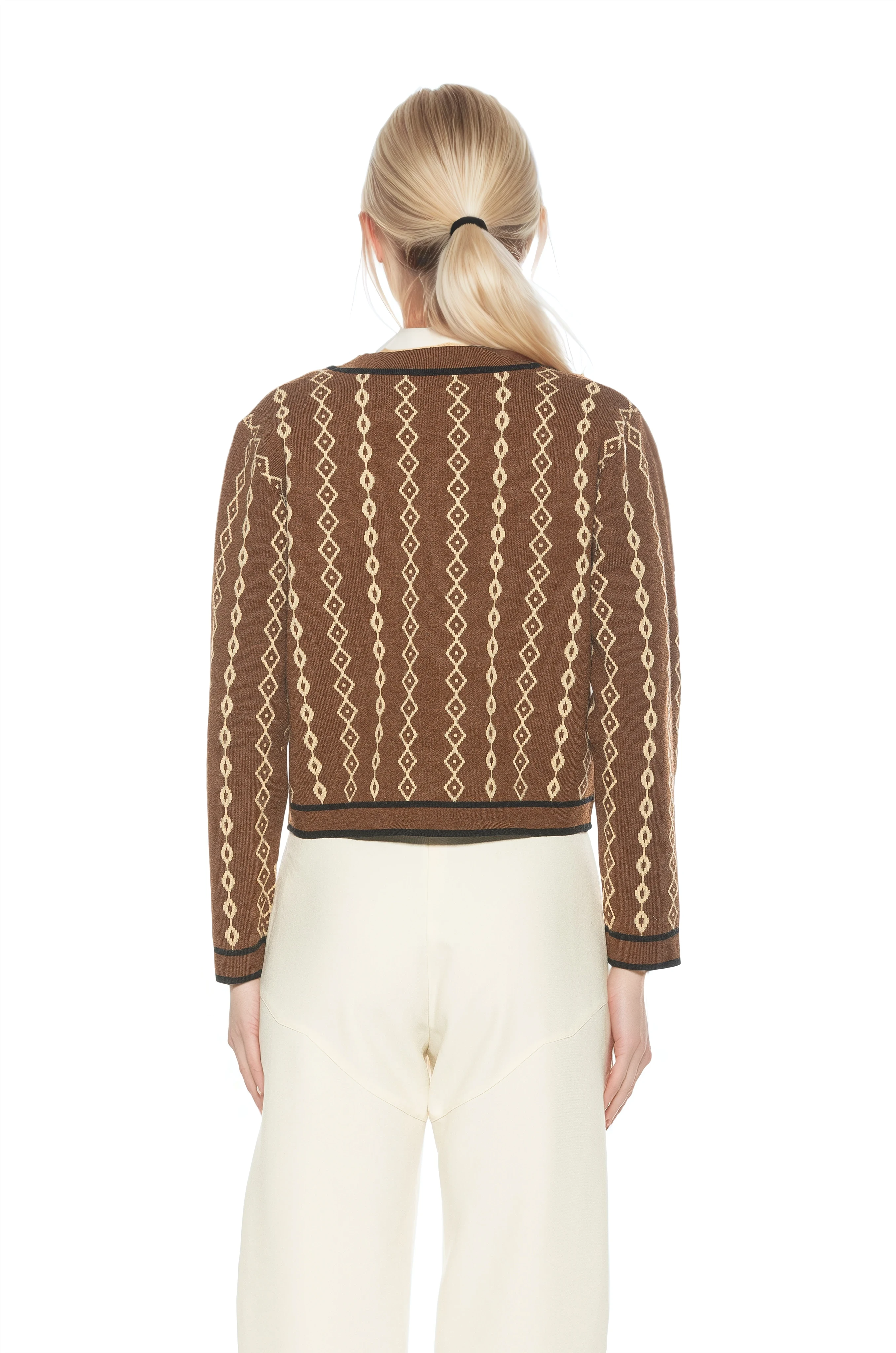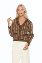 Classic collegiate styling meets modern polish in the Briar Collegiate Contrast Trim Cardigan. Designed with an artistic allover pattern, this fully knit V-neck cardigan features bold contrast trim and functioning front buttons for a timeless yet distinctive look. Crafted to offer comfortable structure and elevated detailing, the Briar cardigan layers effortlessly over tees or blouses while standing strong on its own. The patterned knit and contrast accents bring refined visual interest to an everyday essential.