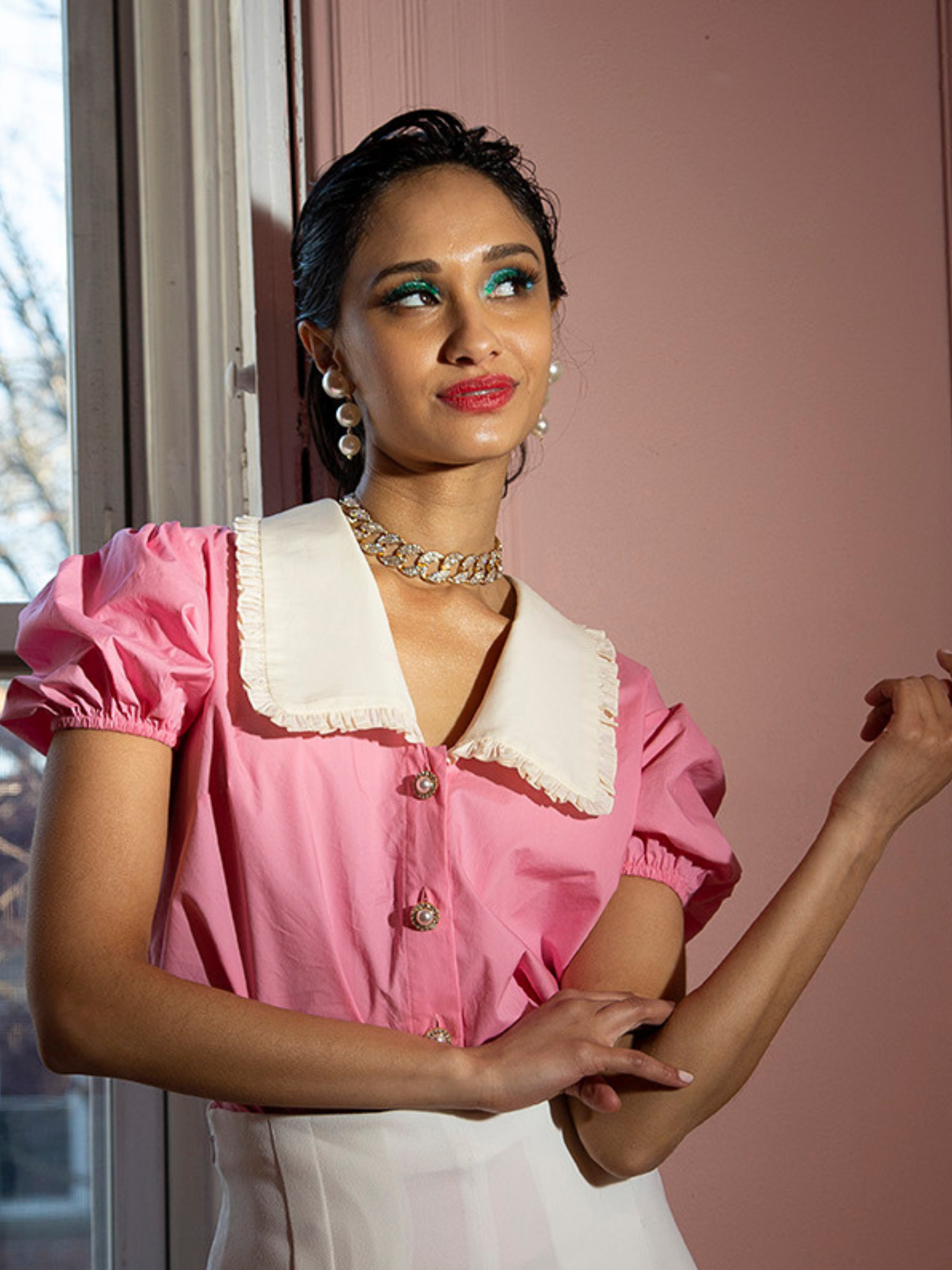 She's girly. The Sandra is a cropped length top with a collared neckline. It buttons down the front and has puff sleeves and pearl buttons.