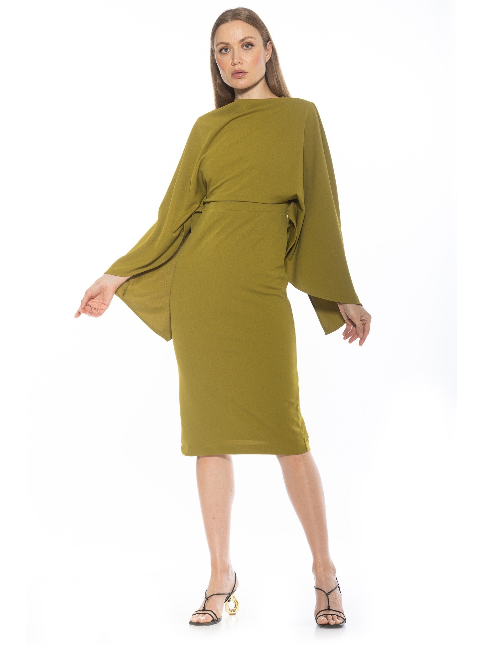 Indulge in luxury with our Vida dress. The high neck adds a touch of sophistication while the draped cape sleeve creates an elegant silhouette. The sheath design and midi length offer a stylish and flattering look. Elevate any occasion with this must-have piece.