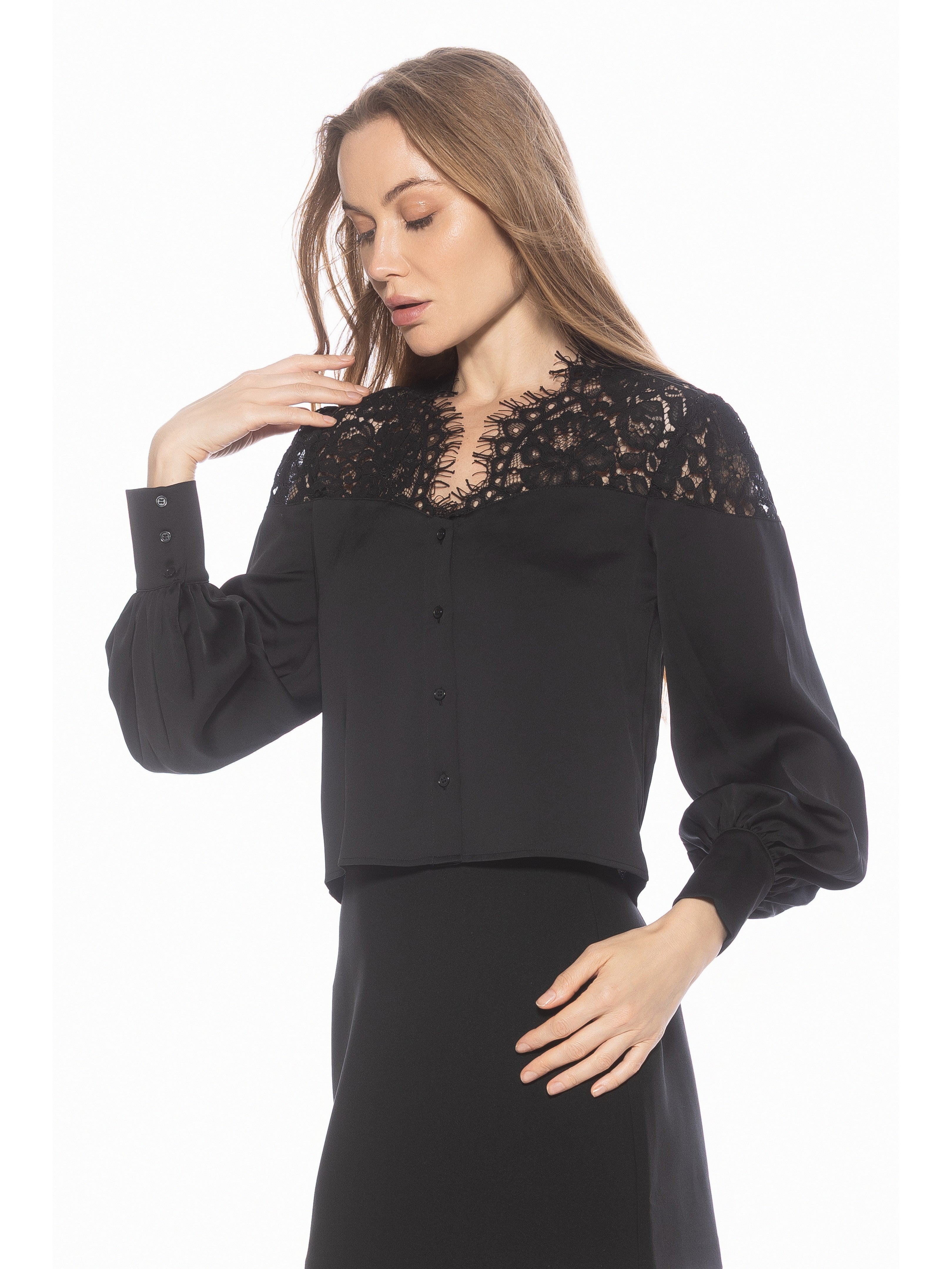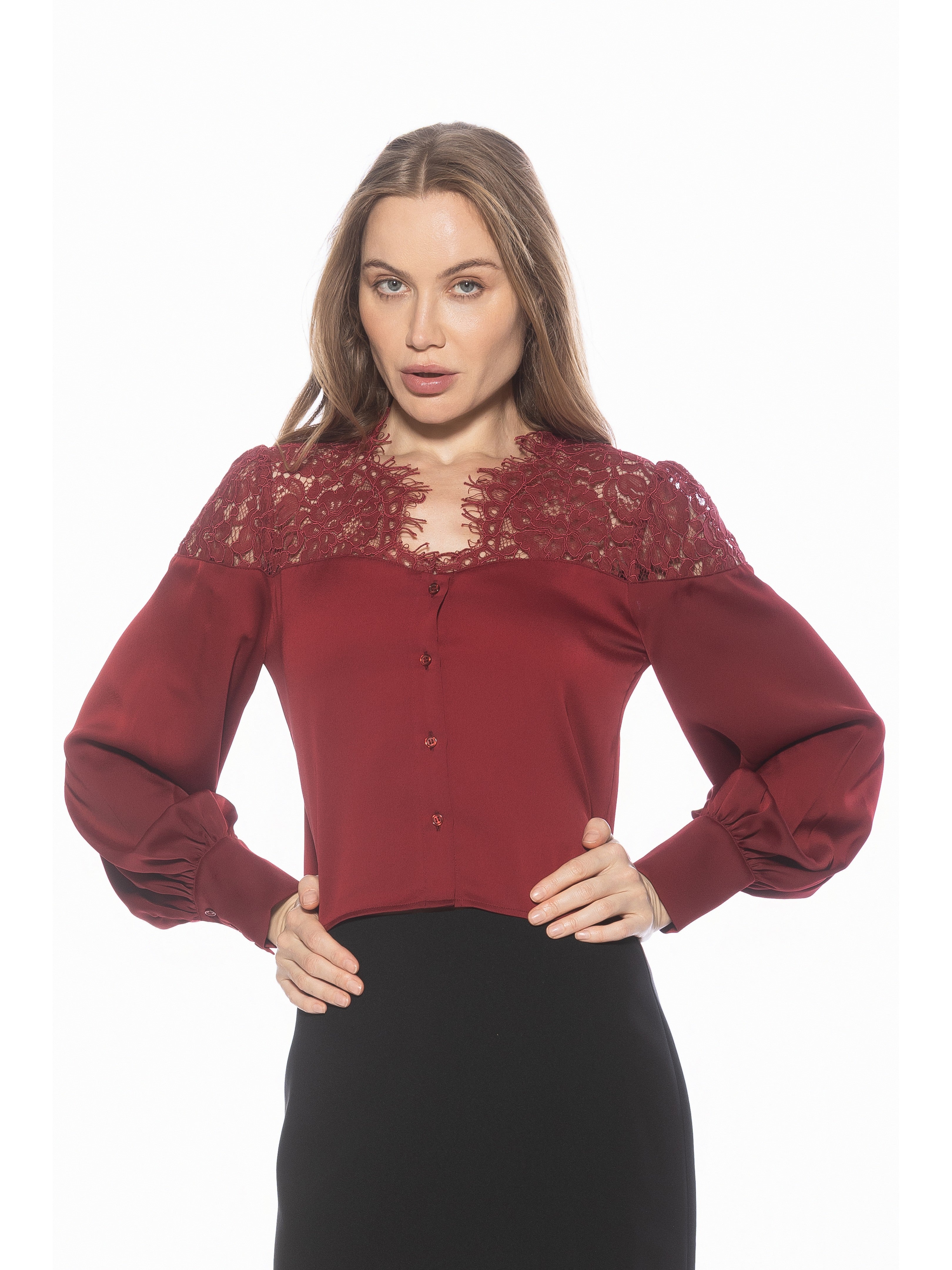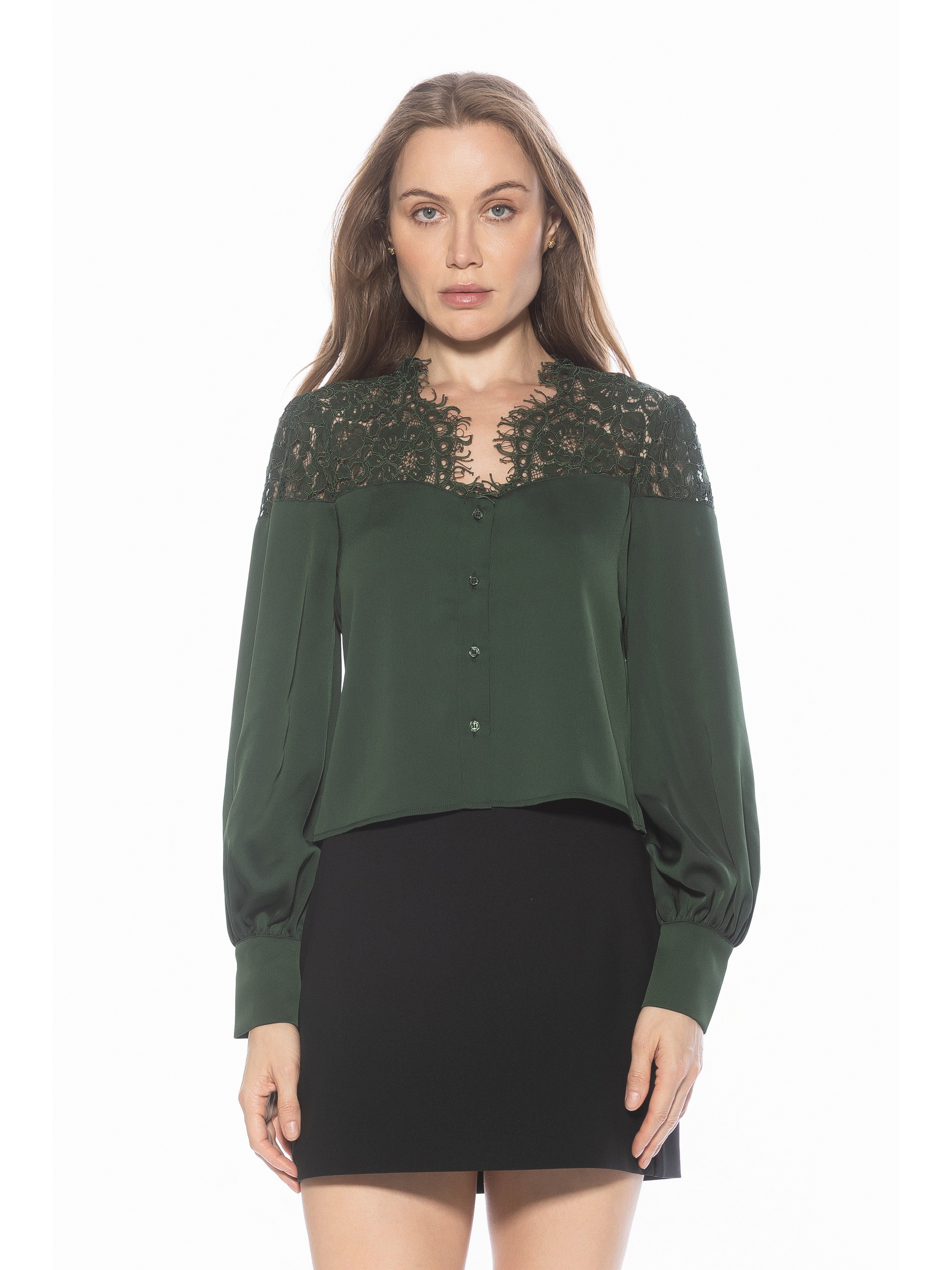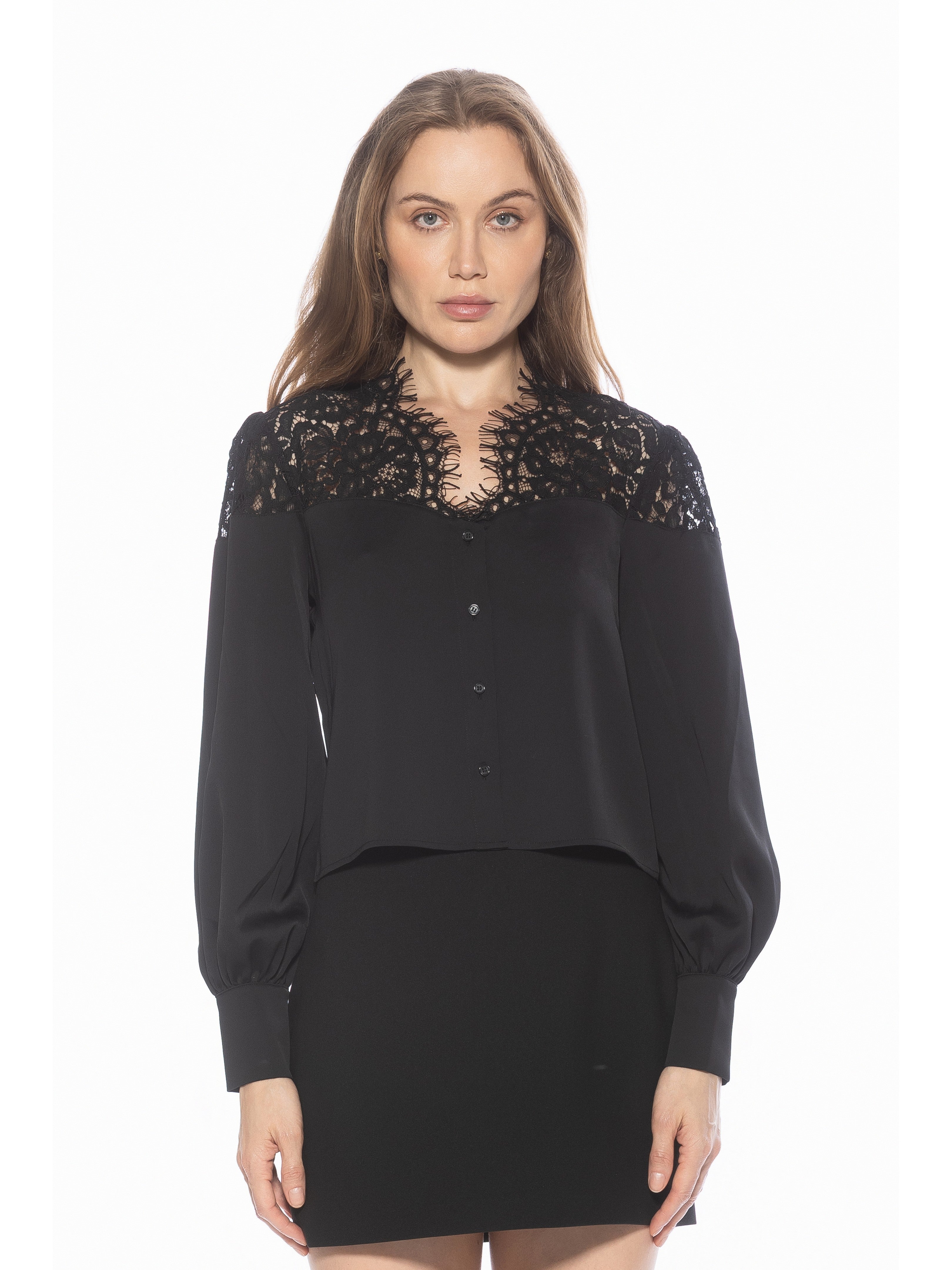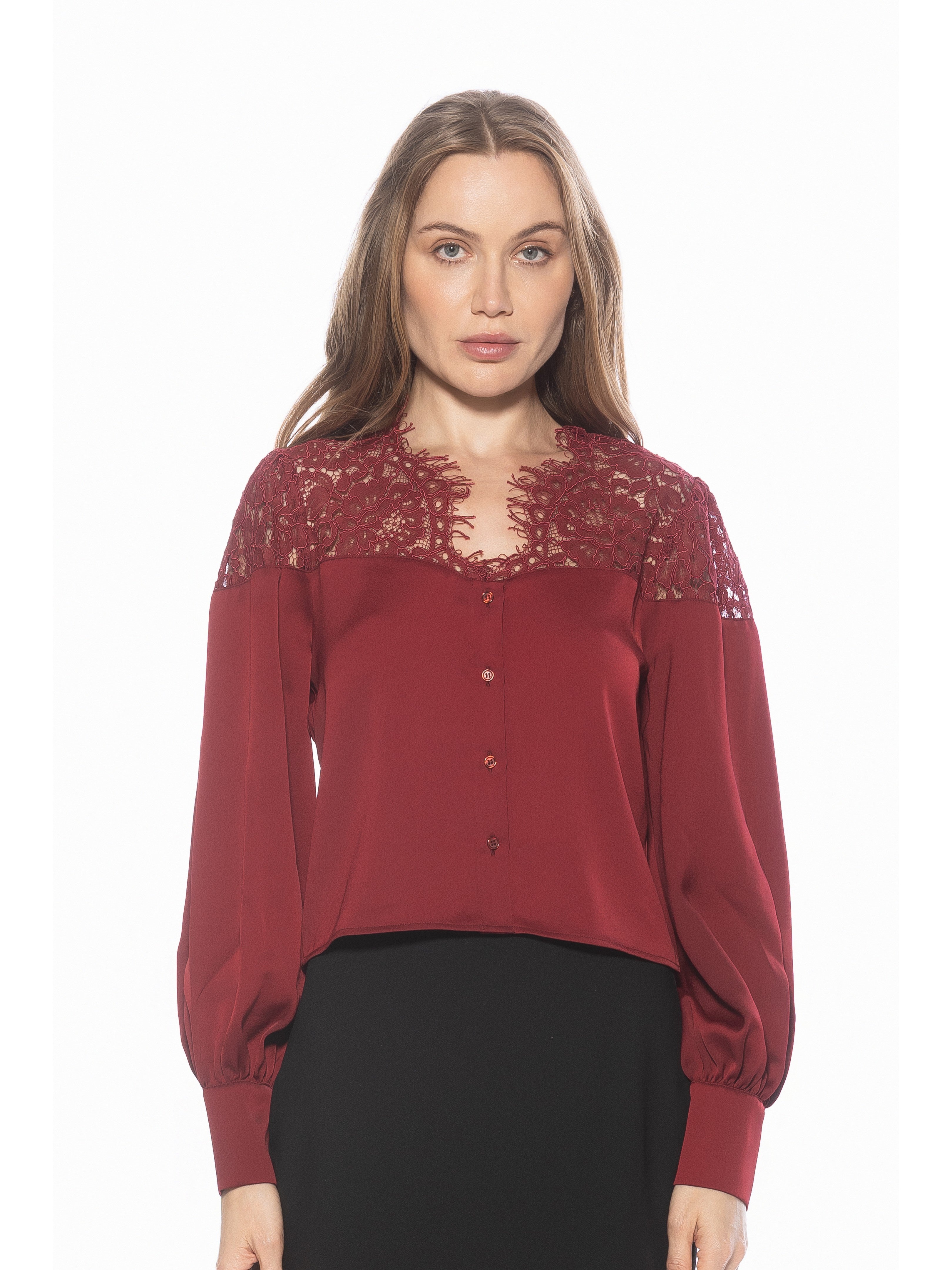 The Bryne Lace Applique Silky Blouson Sleeve Top Is A Must Have For Your Wardrobe. This Top Features Lace Detail, Front Button Down Detail, And Blouson Sleeves. This Top Fits True To Size.