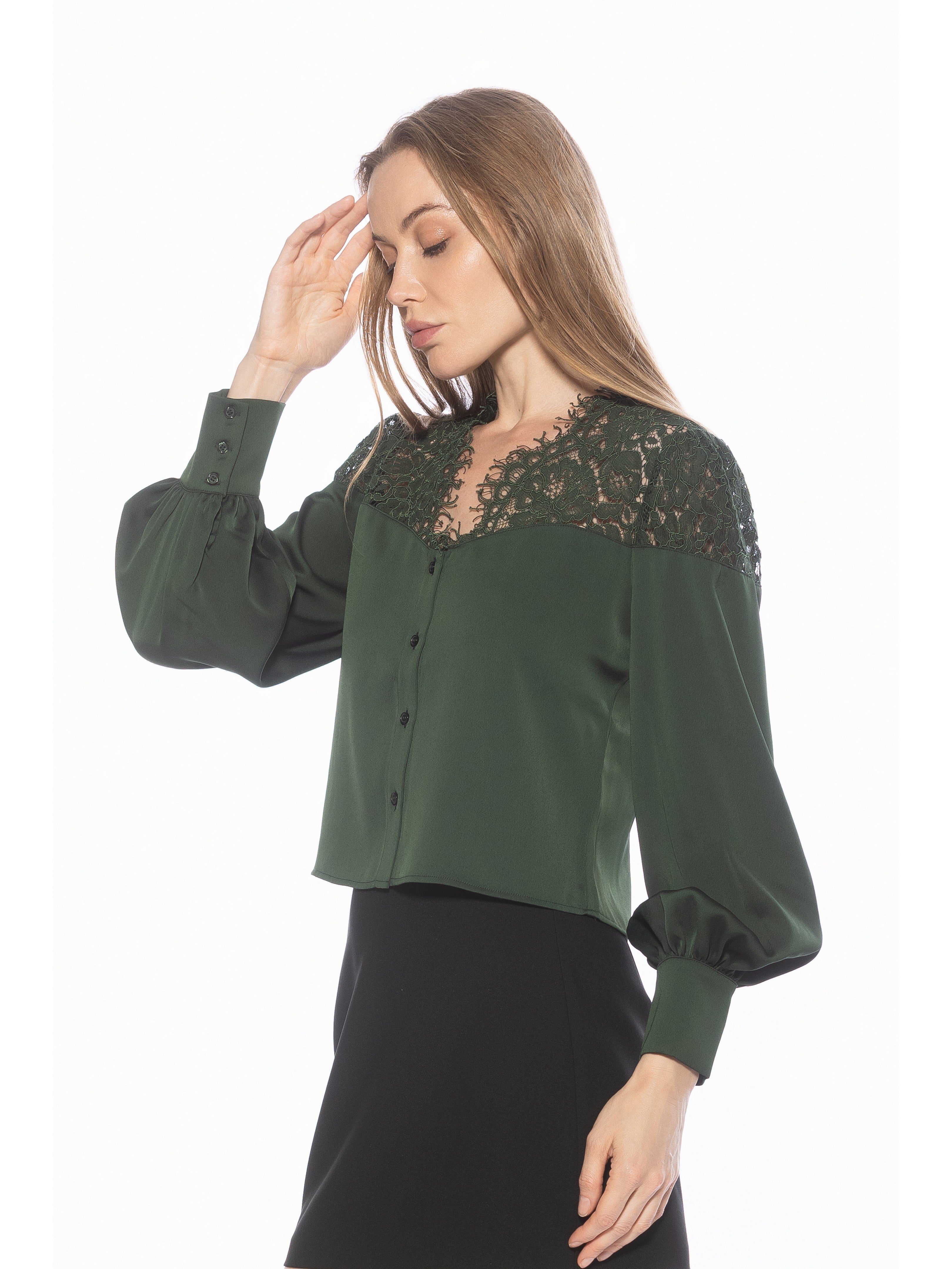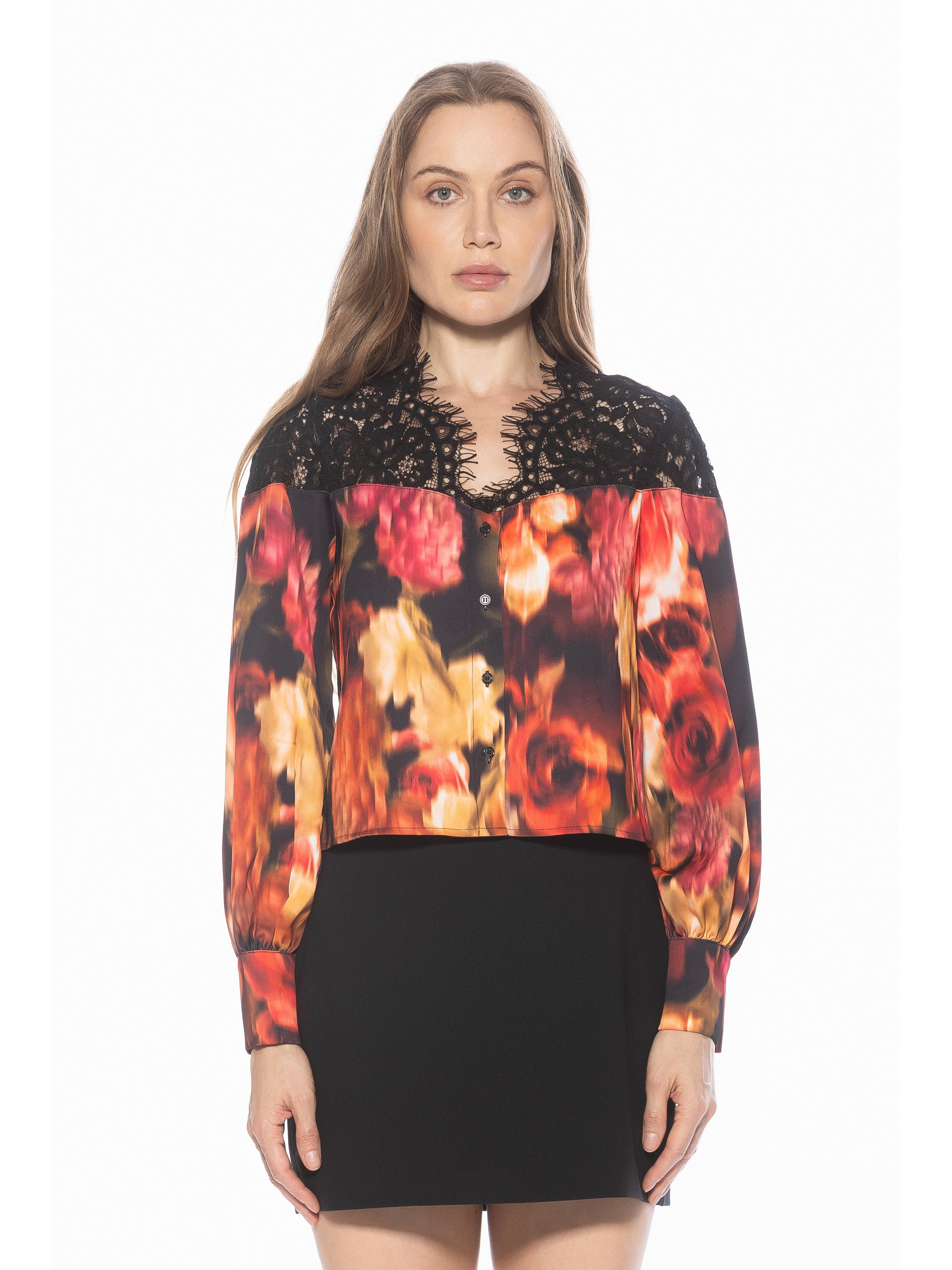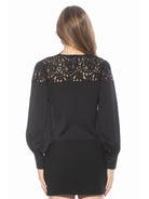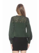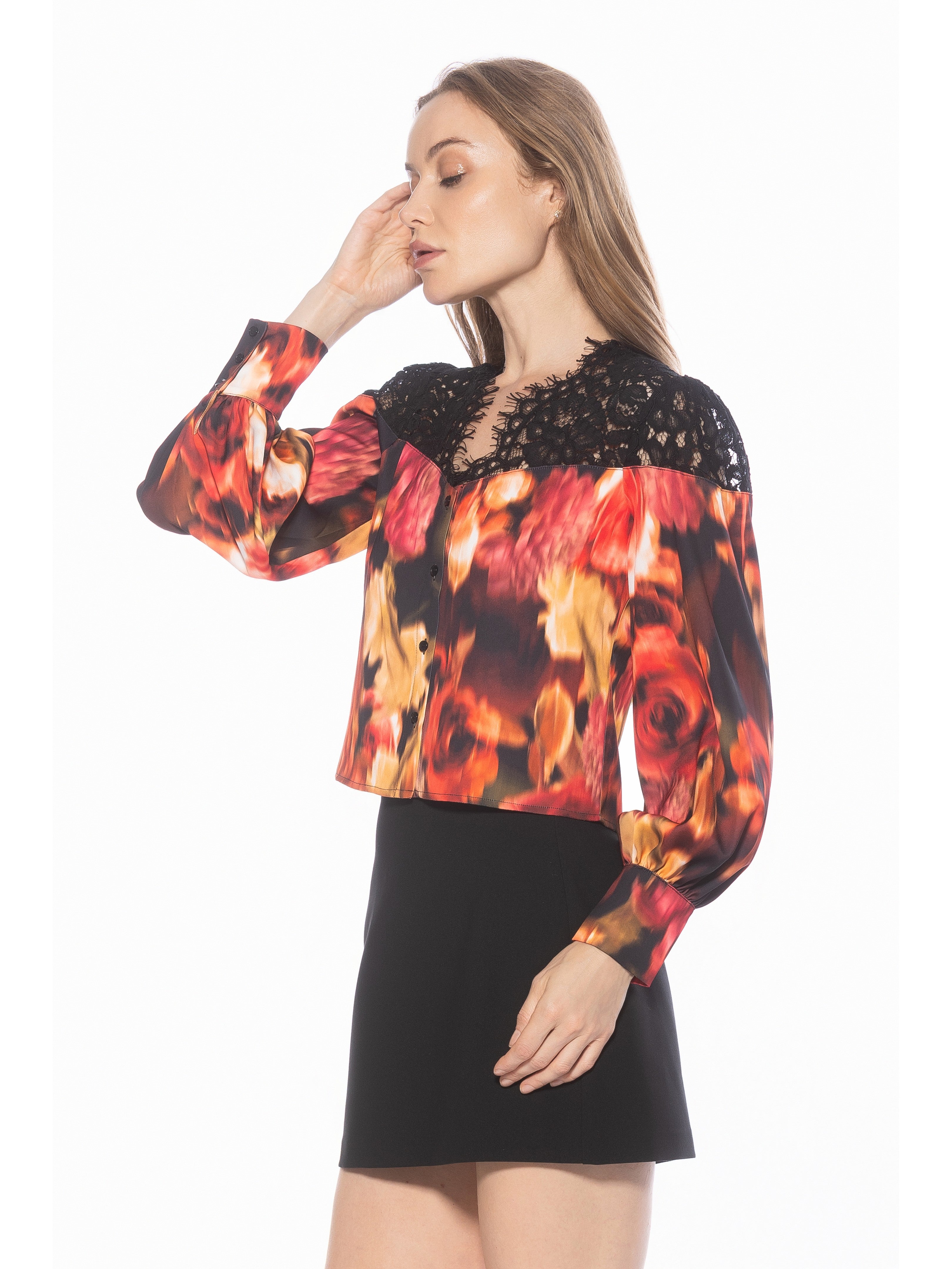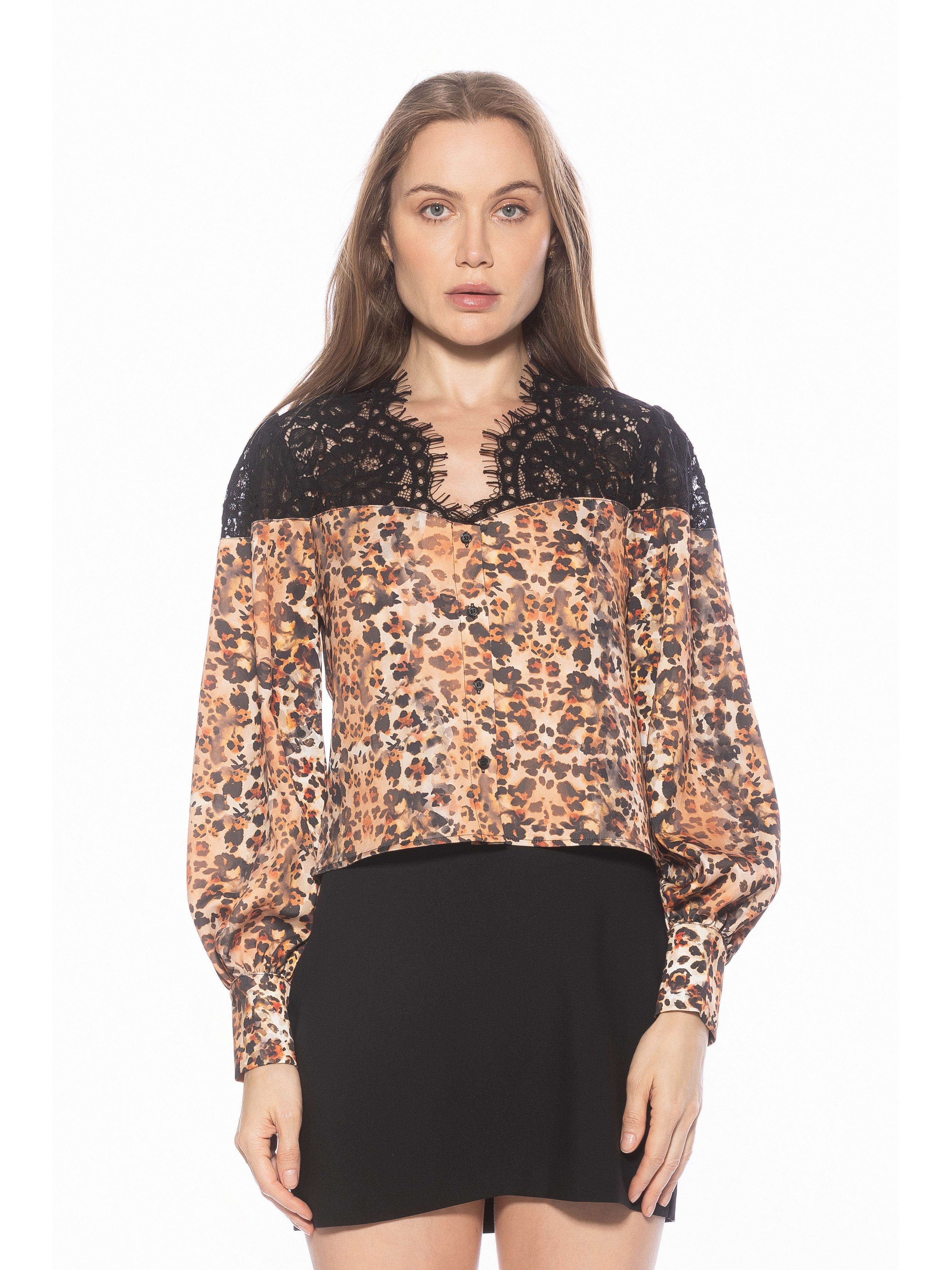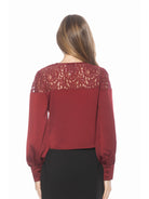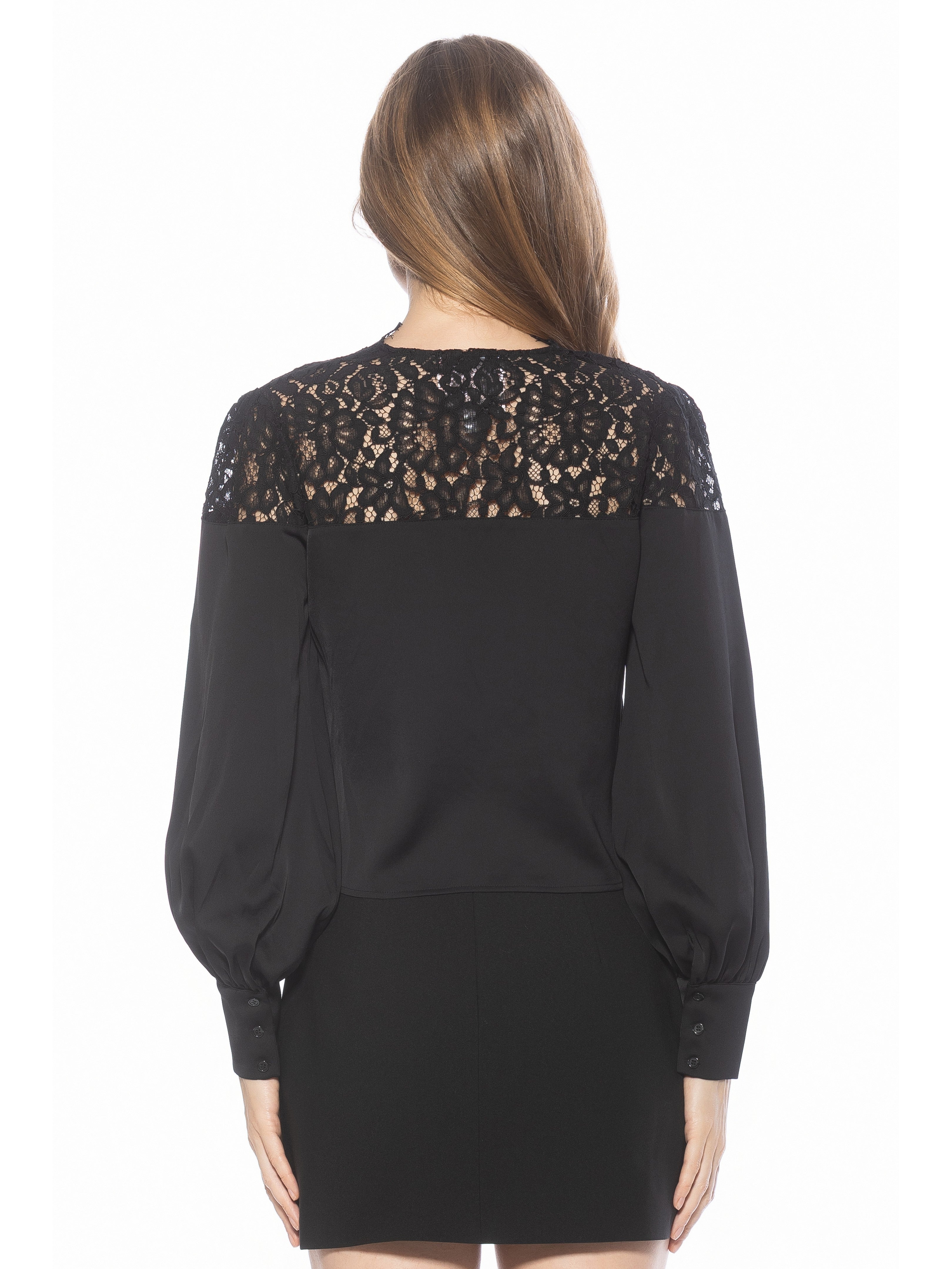 The Bryne Lace Applique Silky Blouson Sleeve Top Is A Must Have For Your Wardrobe. This Top Features Lace Detail, Front Button Down Detail, And Blouson Sleeves. This Top Fits True To Size.