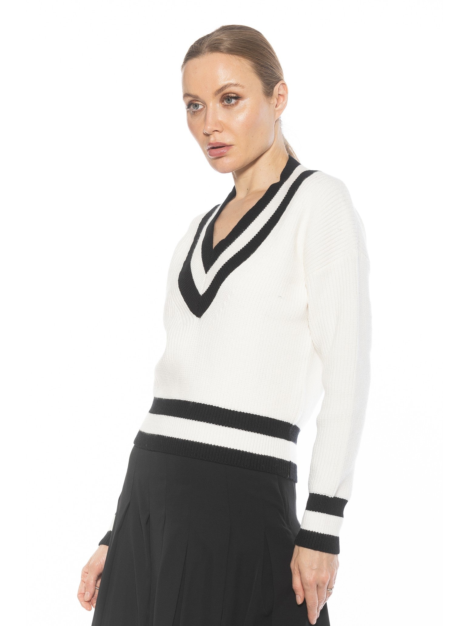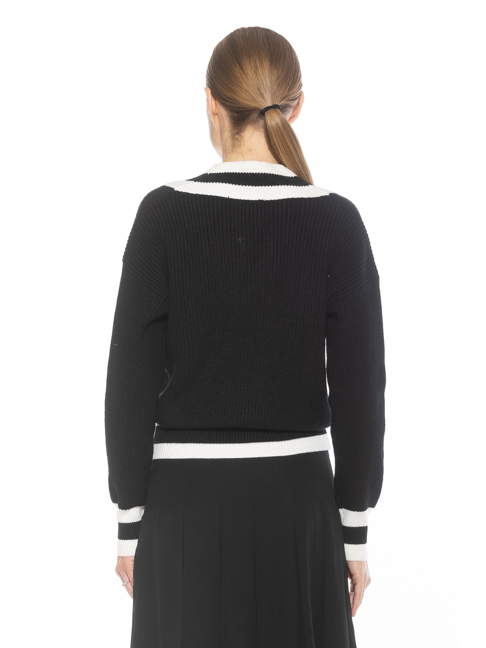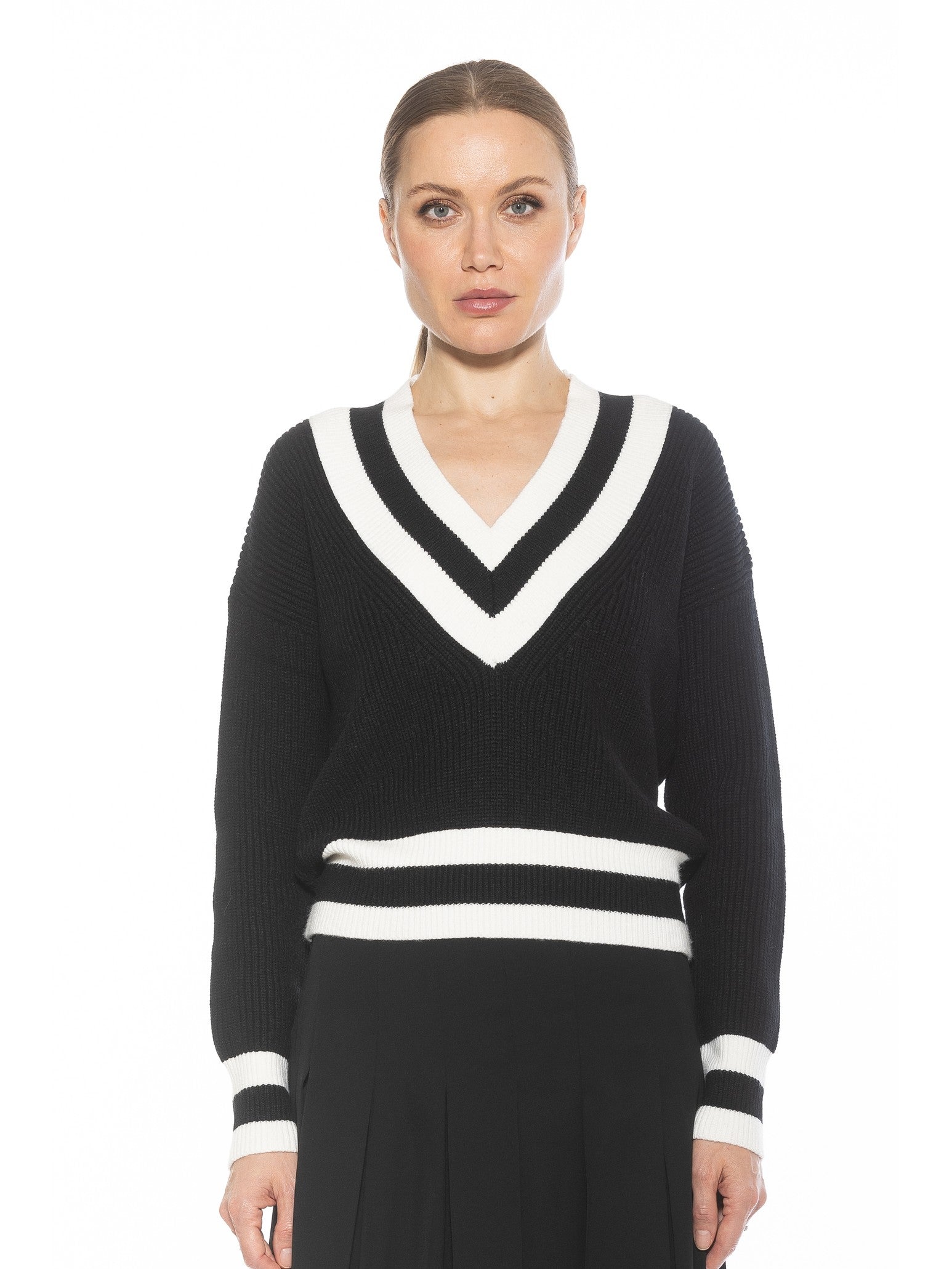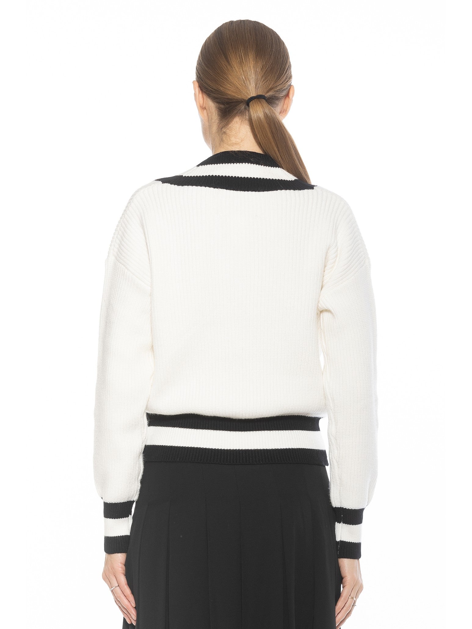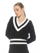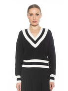 The Leona Long sleeve V Neck Varsity Polo Sweater Top Is A Must Have Piece For Your Wardrobe. This Sweater Features Luxe Knit Material, Contrast Stripe Detail And Long Sleeves. This Item Runs Large.