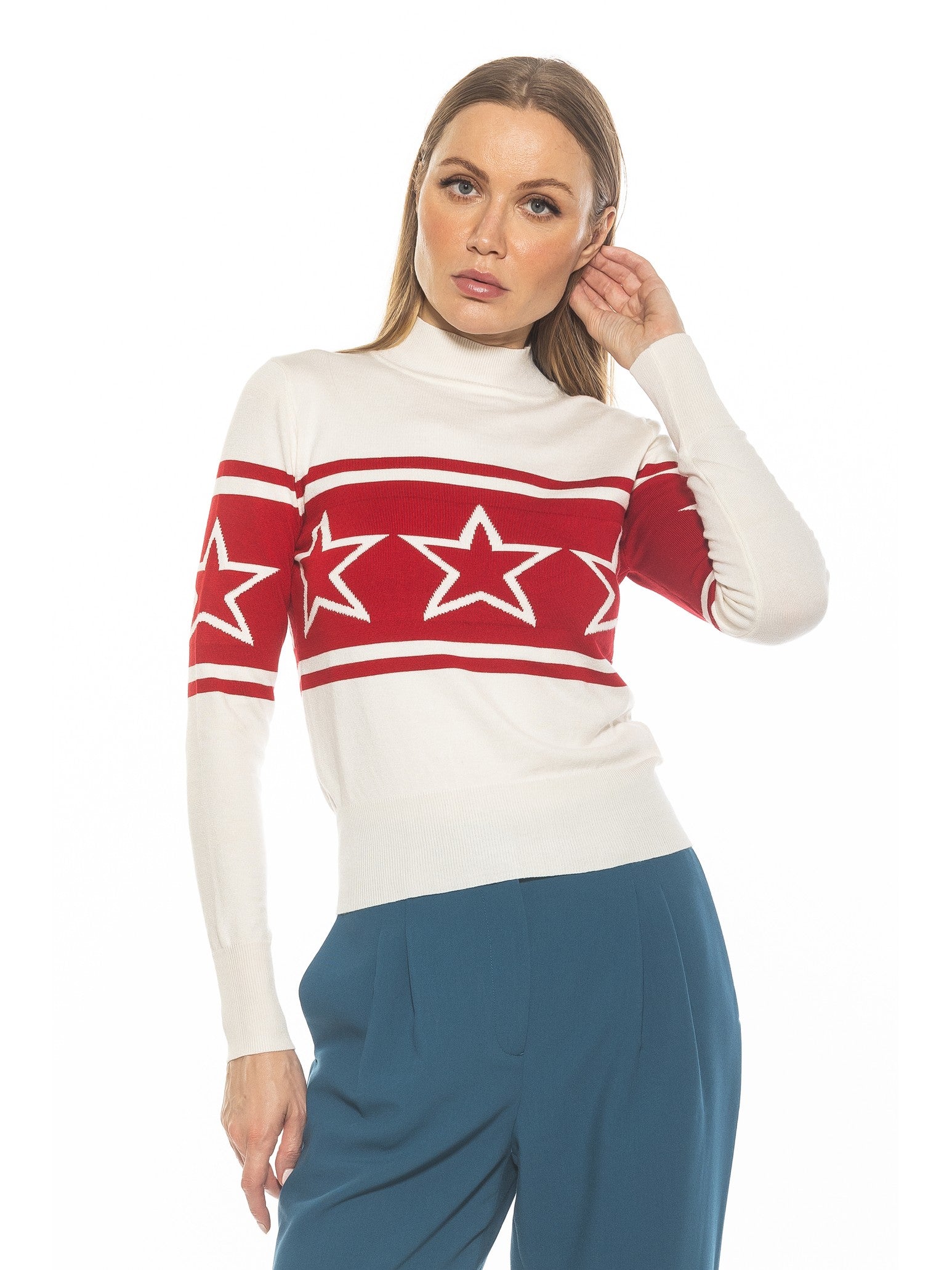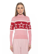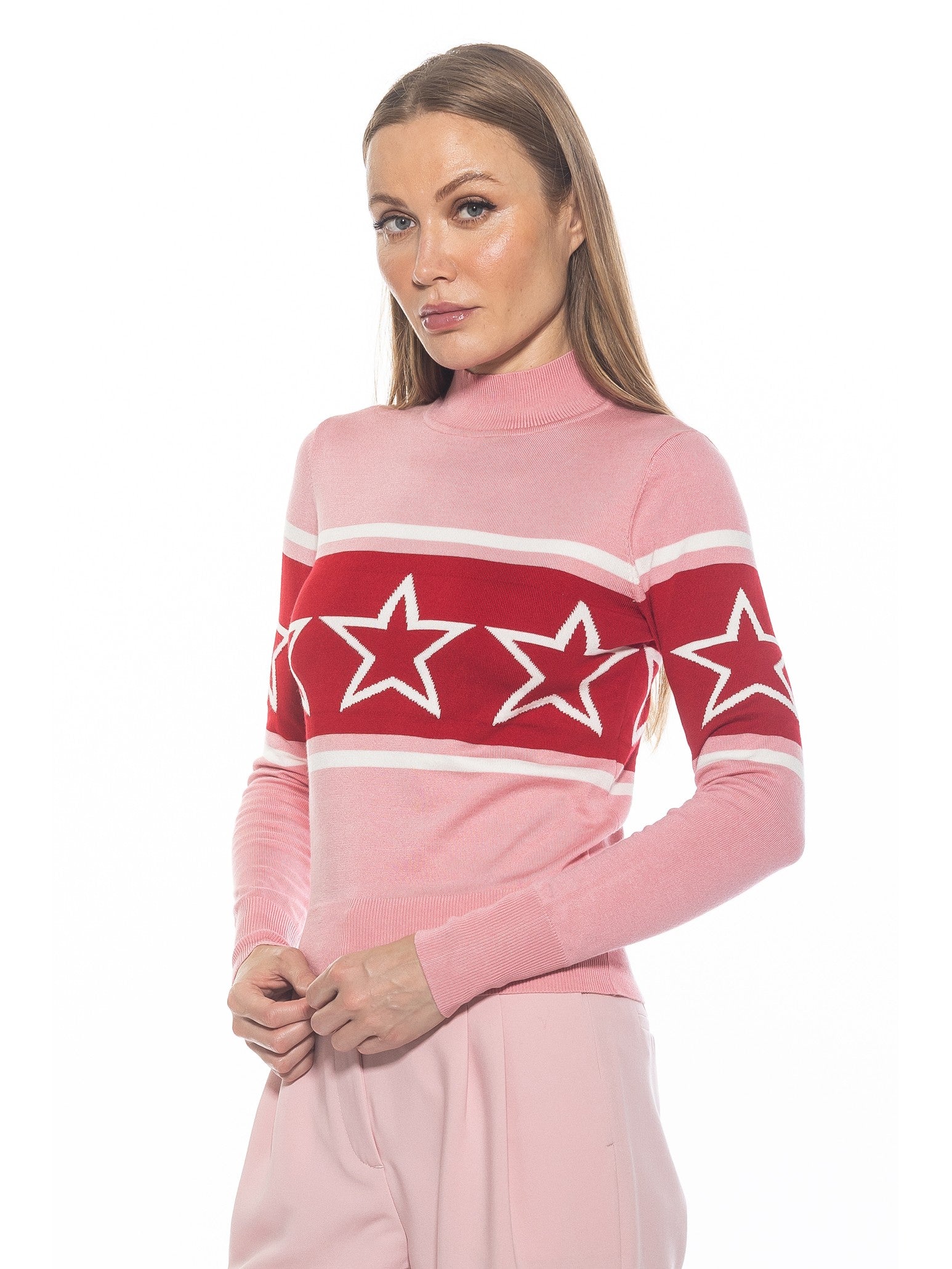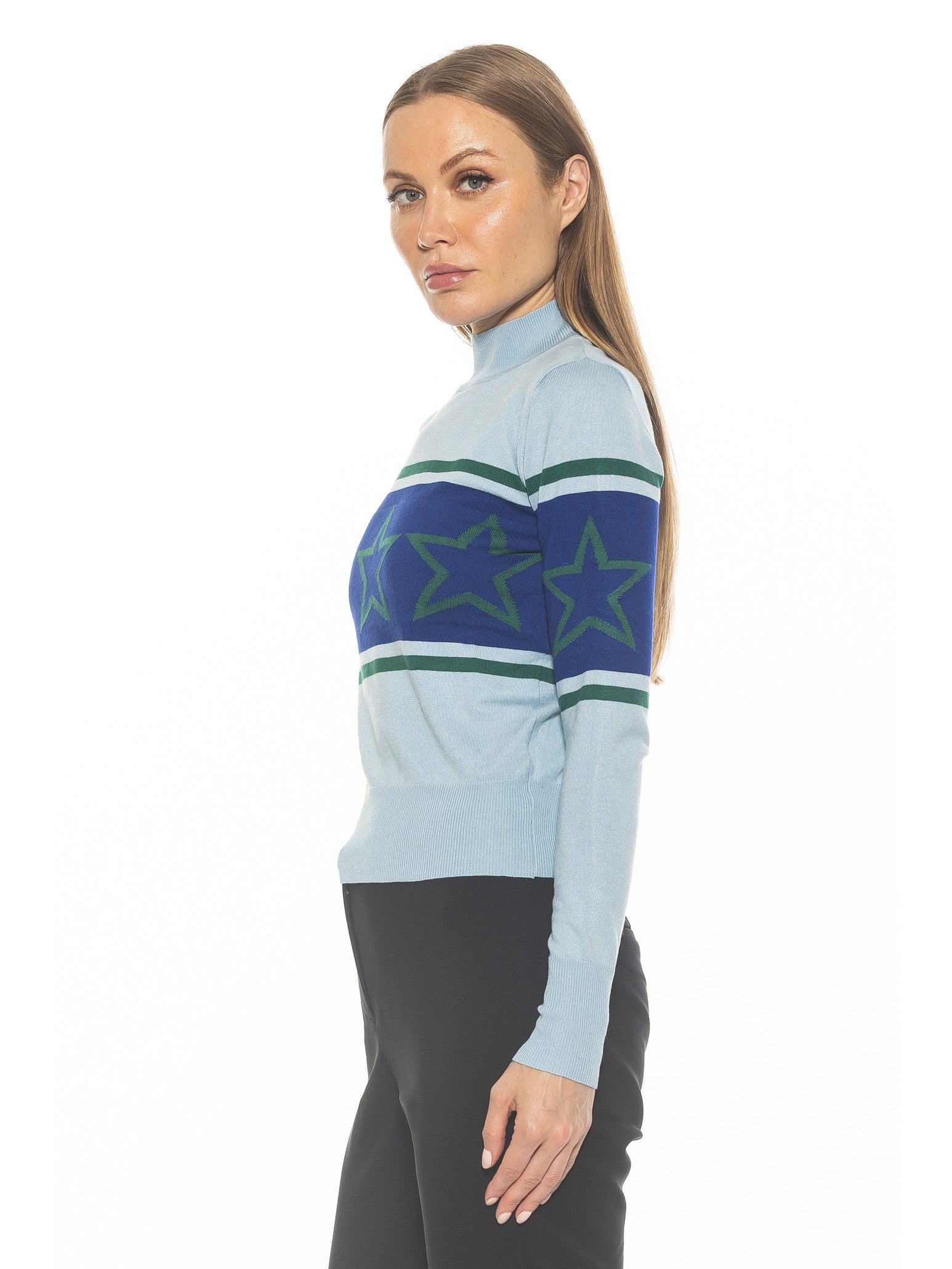 Indulge in luxury with our Lisa sweater, featuring a striking star motif and chic color blocking. The long sleeve design adds sophistication to any outfit, while the mockneck keeps you cozy and stylish. Elevate your wardrobe with this exclusive piece.
