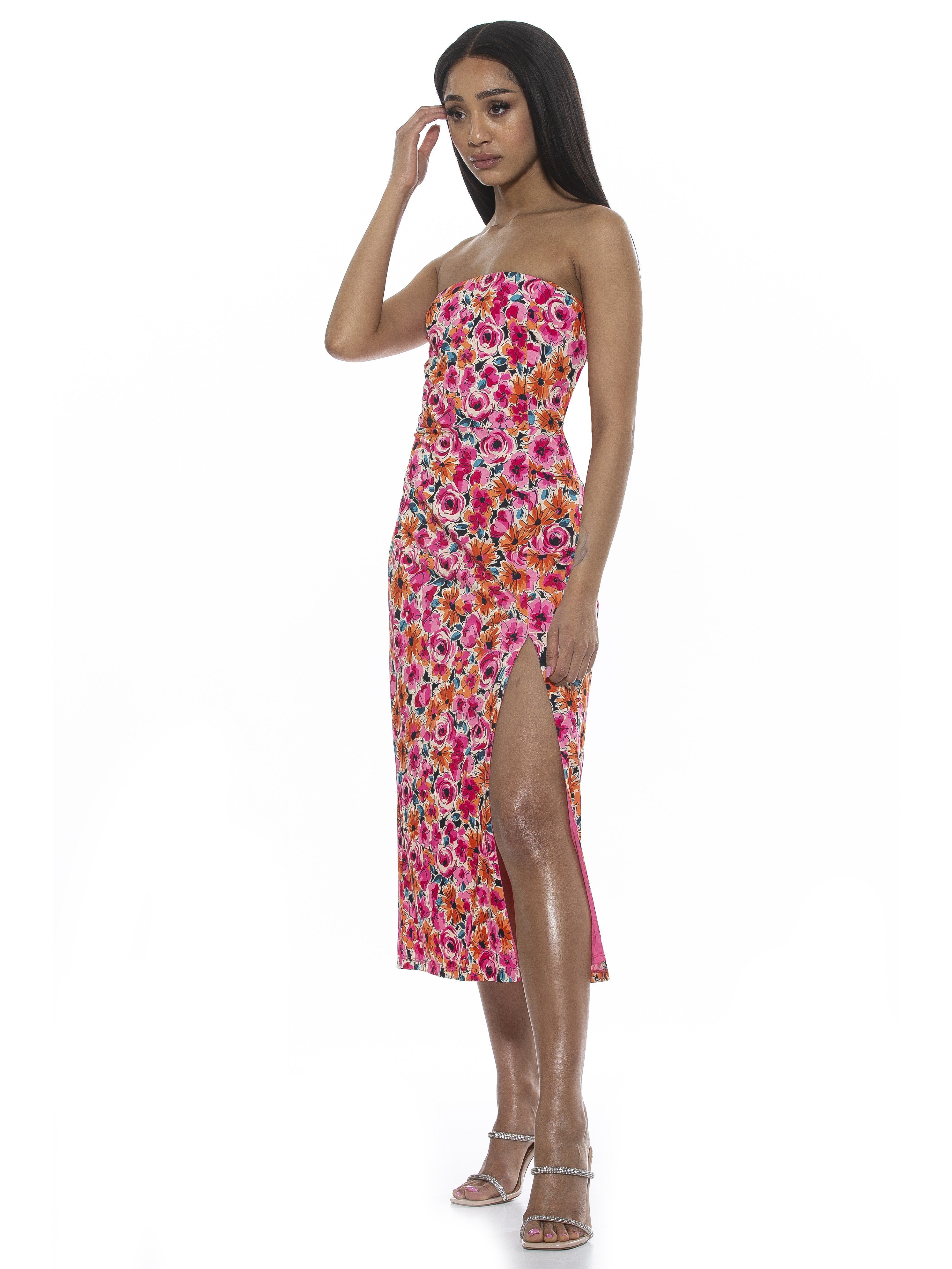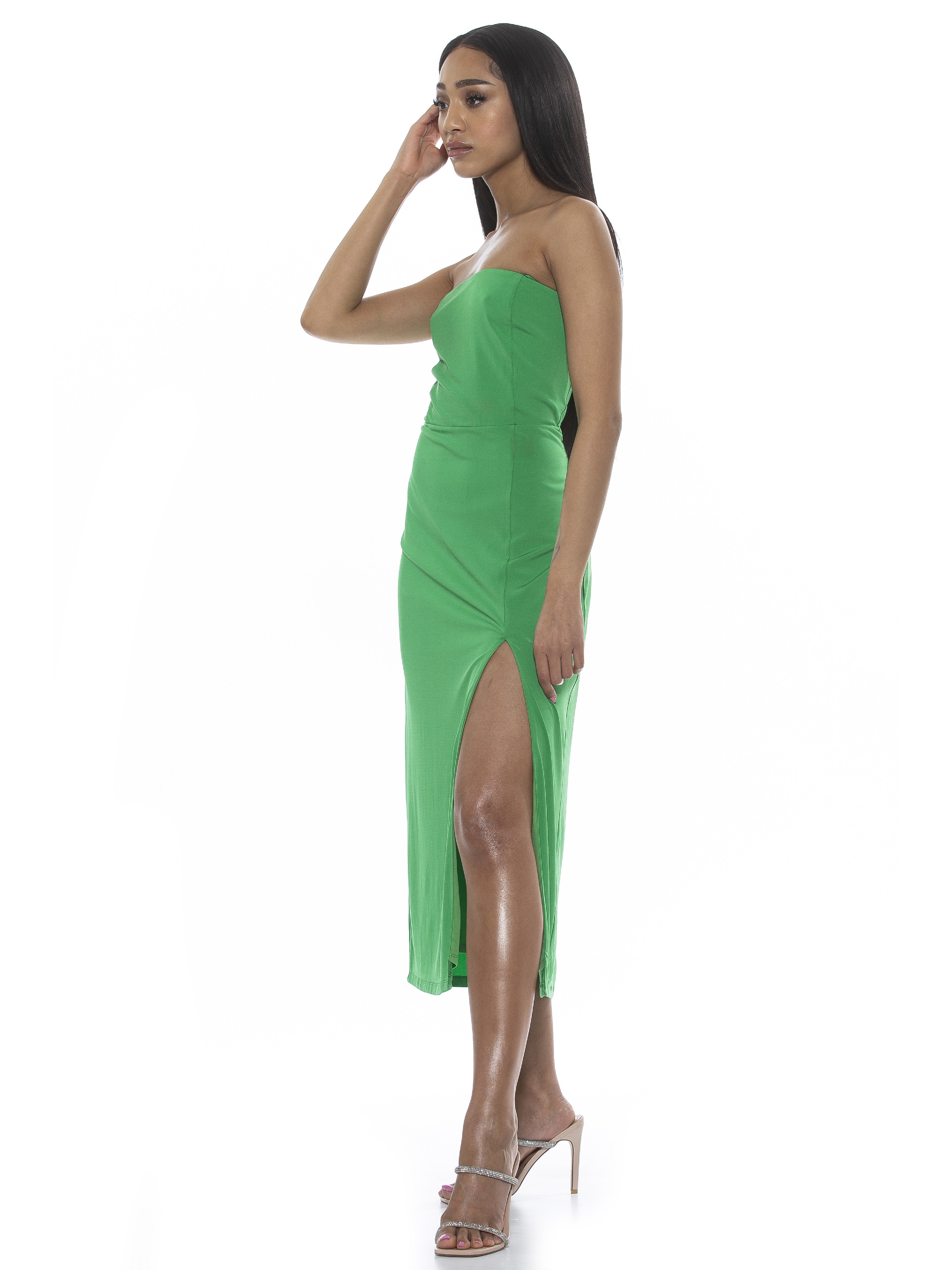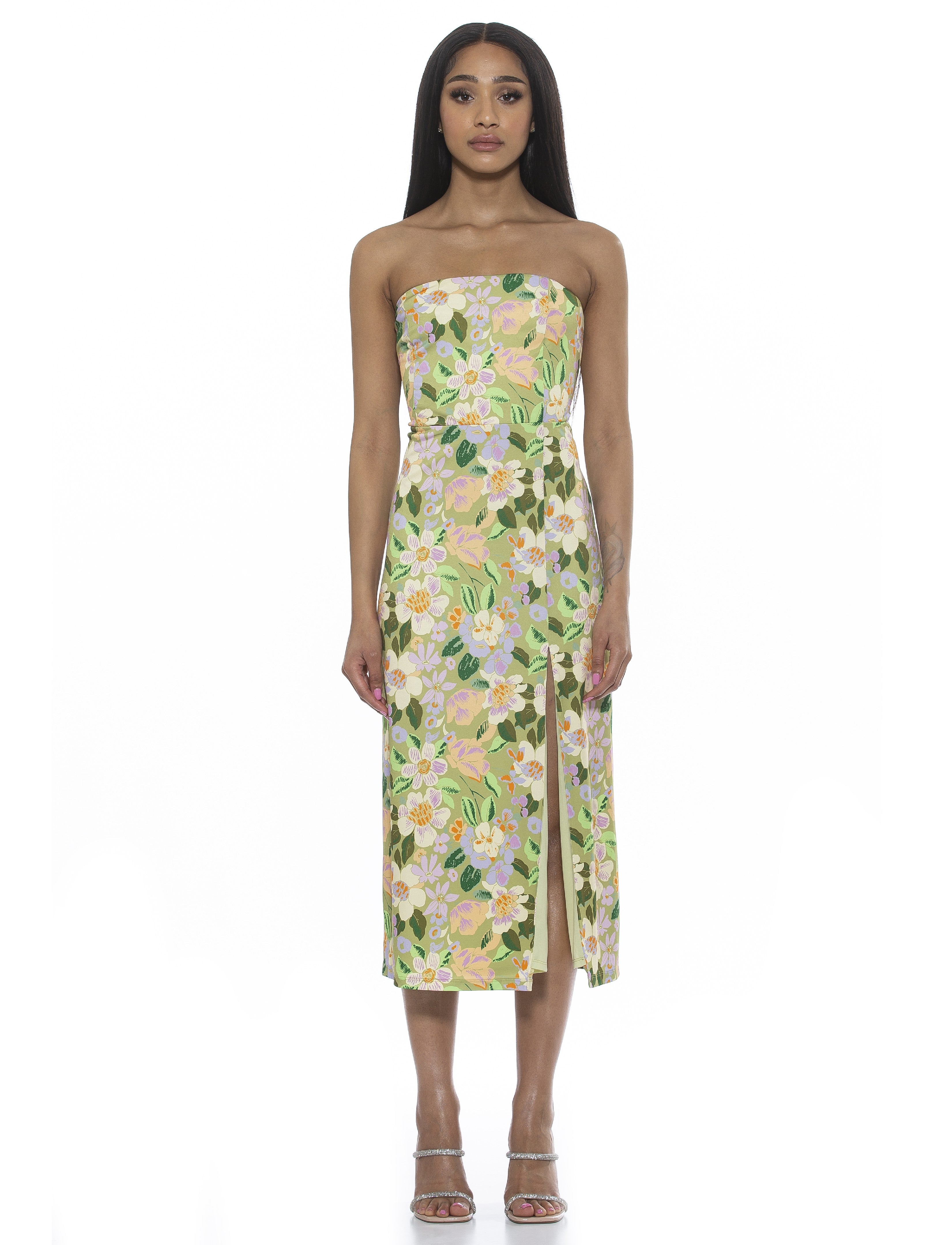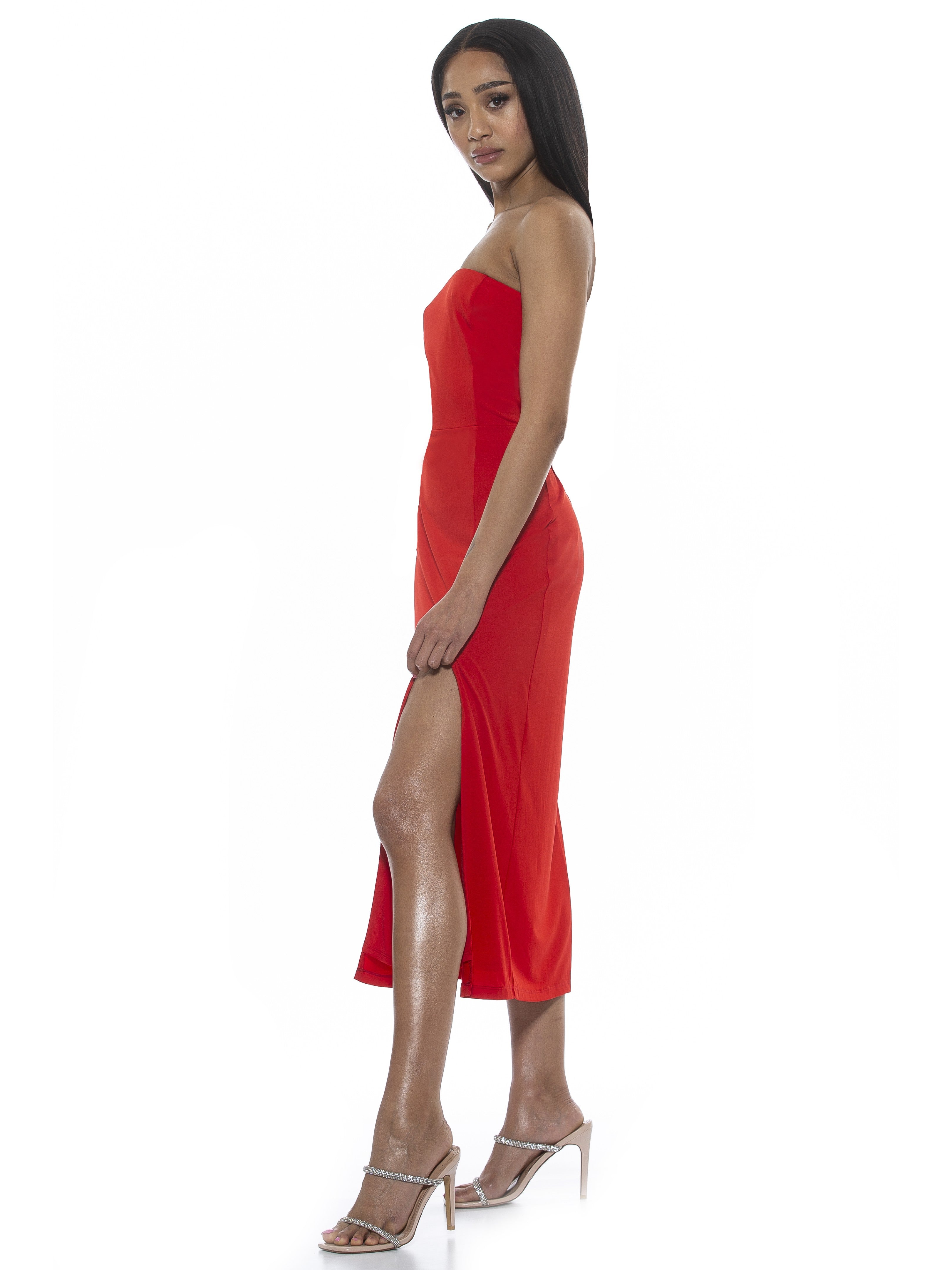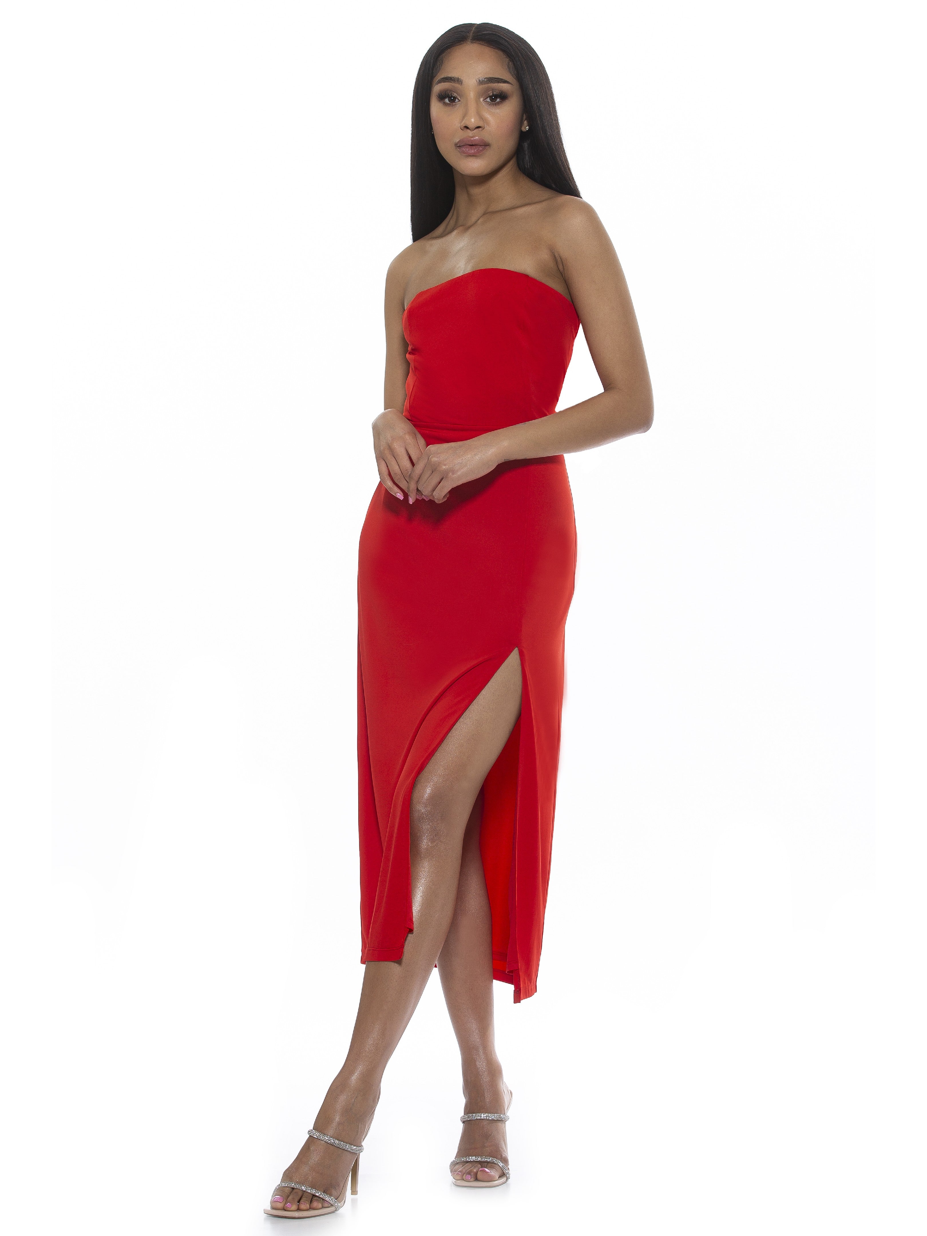 Let your legs out for a bit. The Camden is a sleeveless, midi dress with a side slit, straight neckline, and a fitted waist.
