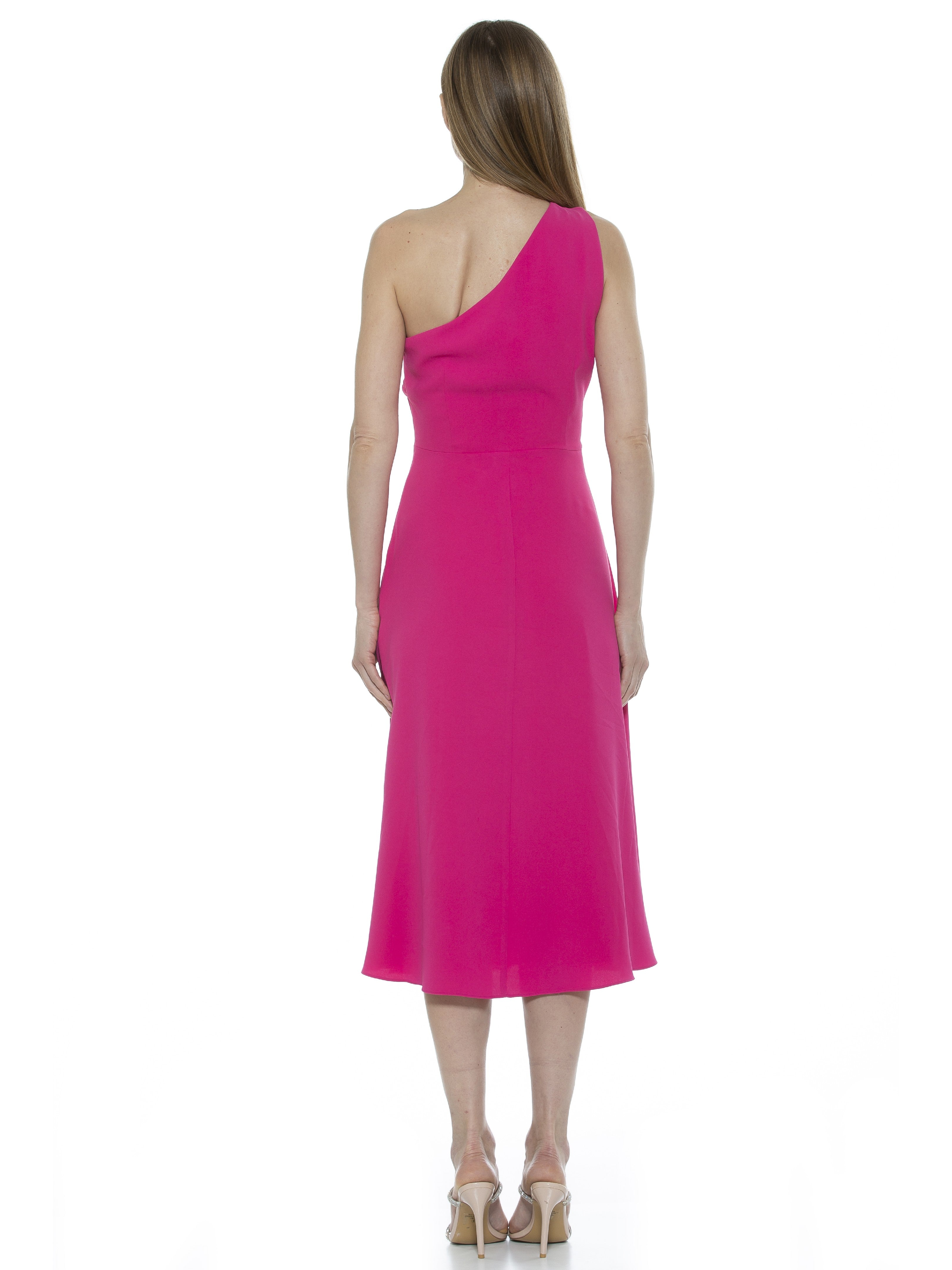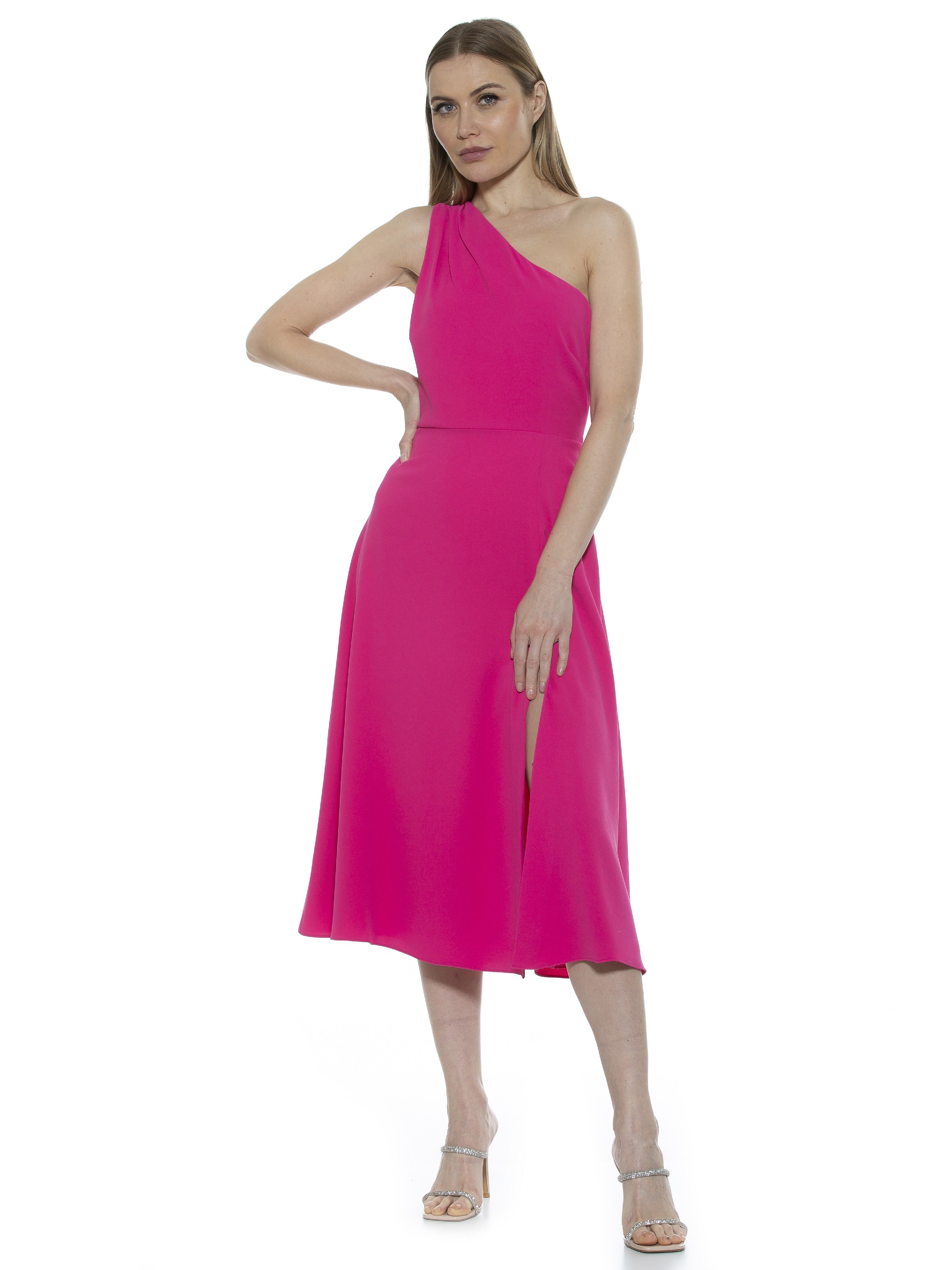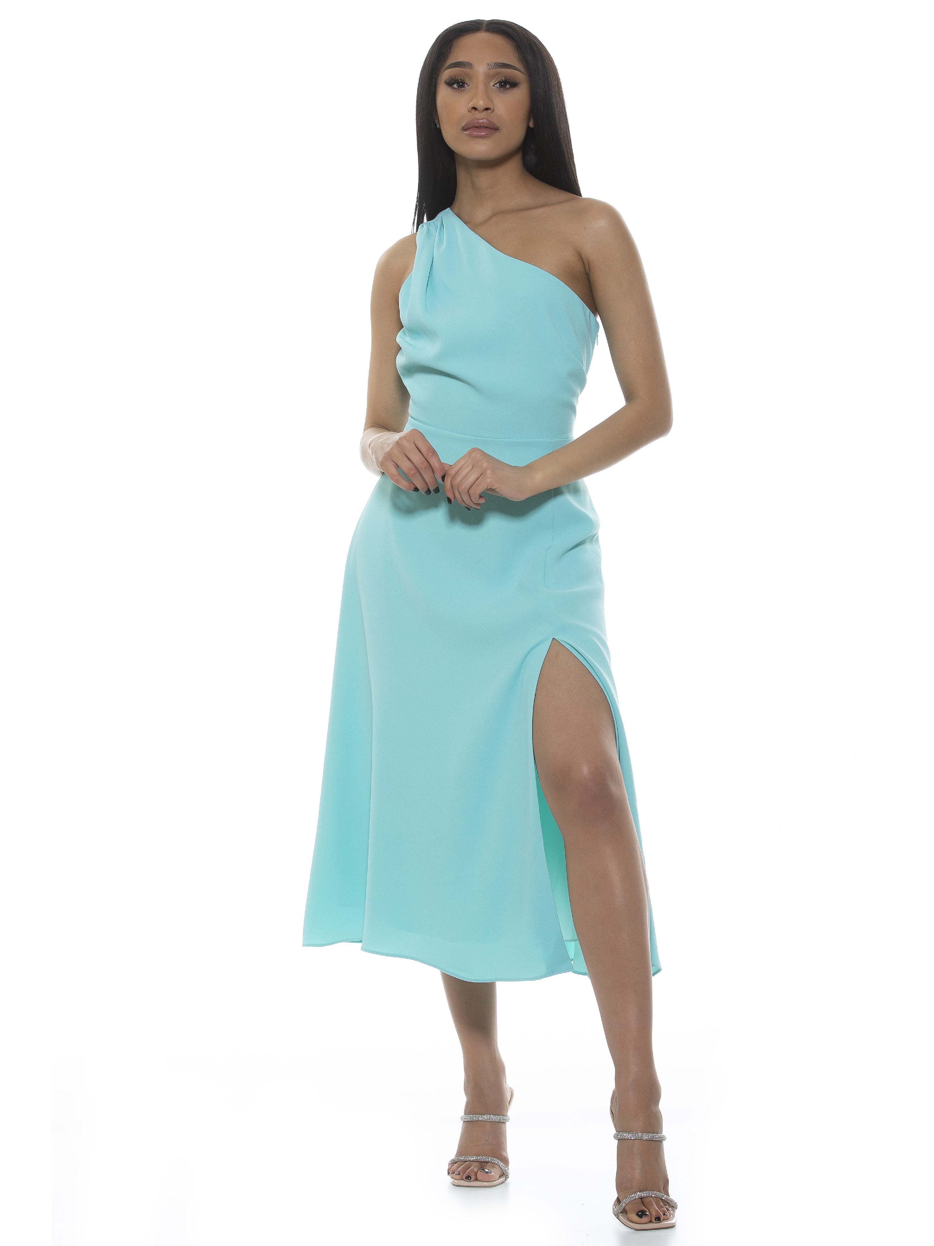 The Fay Dress is a one shoulder design with a side slit and fit and flare silhouette in an elegant midi dress. Make a statement with its unique shape and feel the confidence of a unique and beautiful look.
