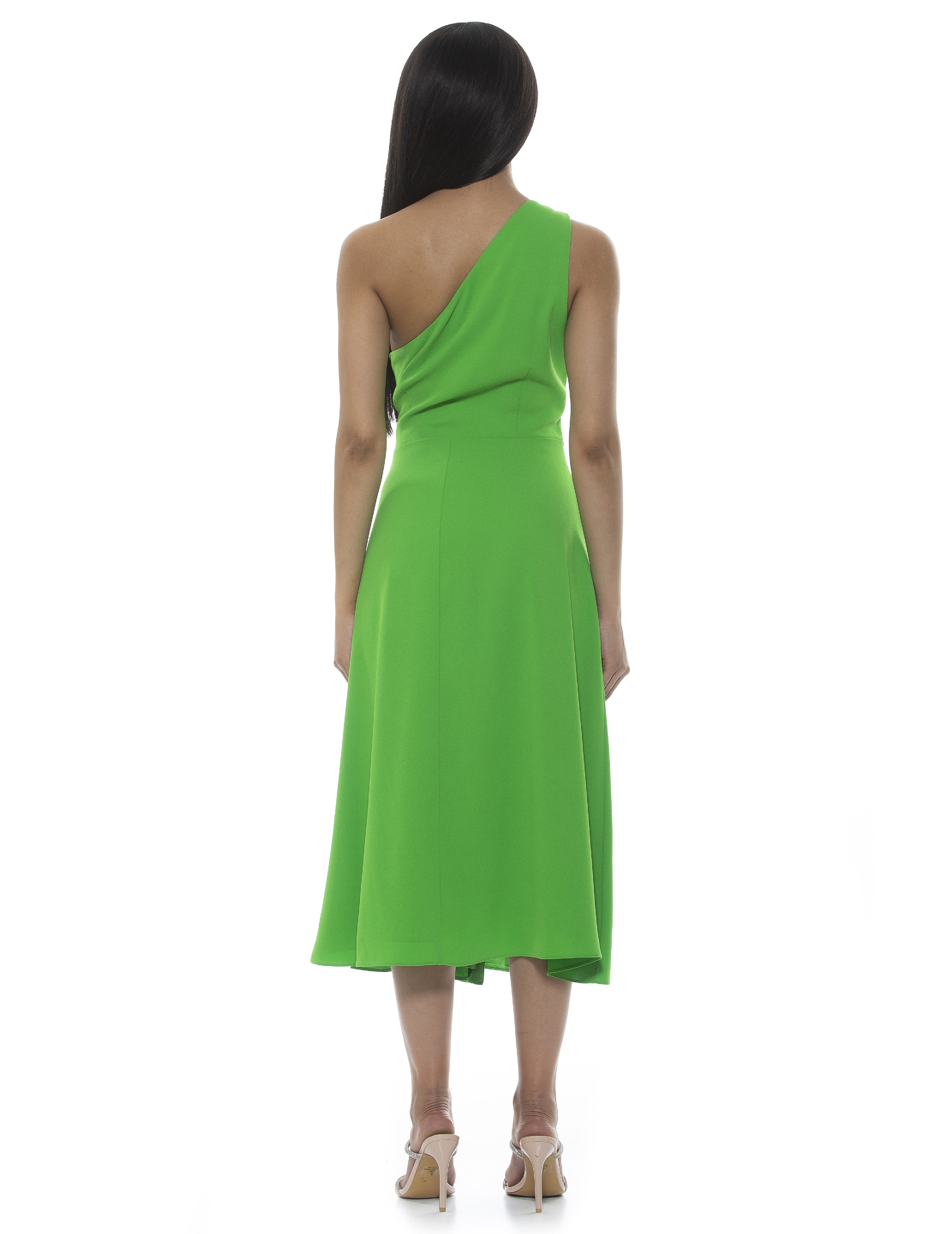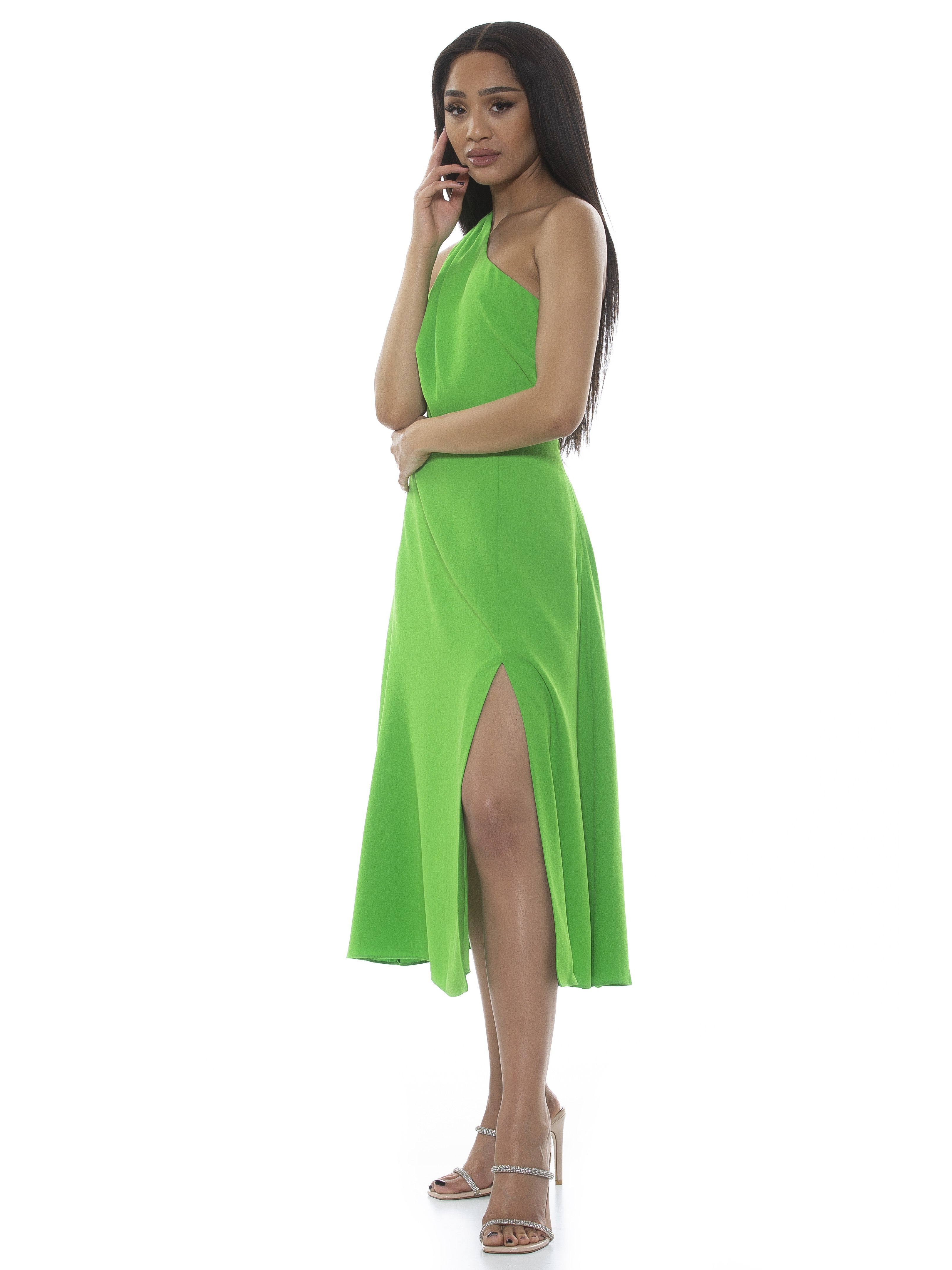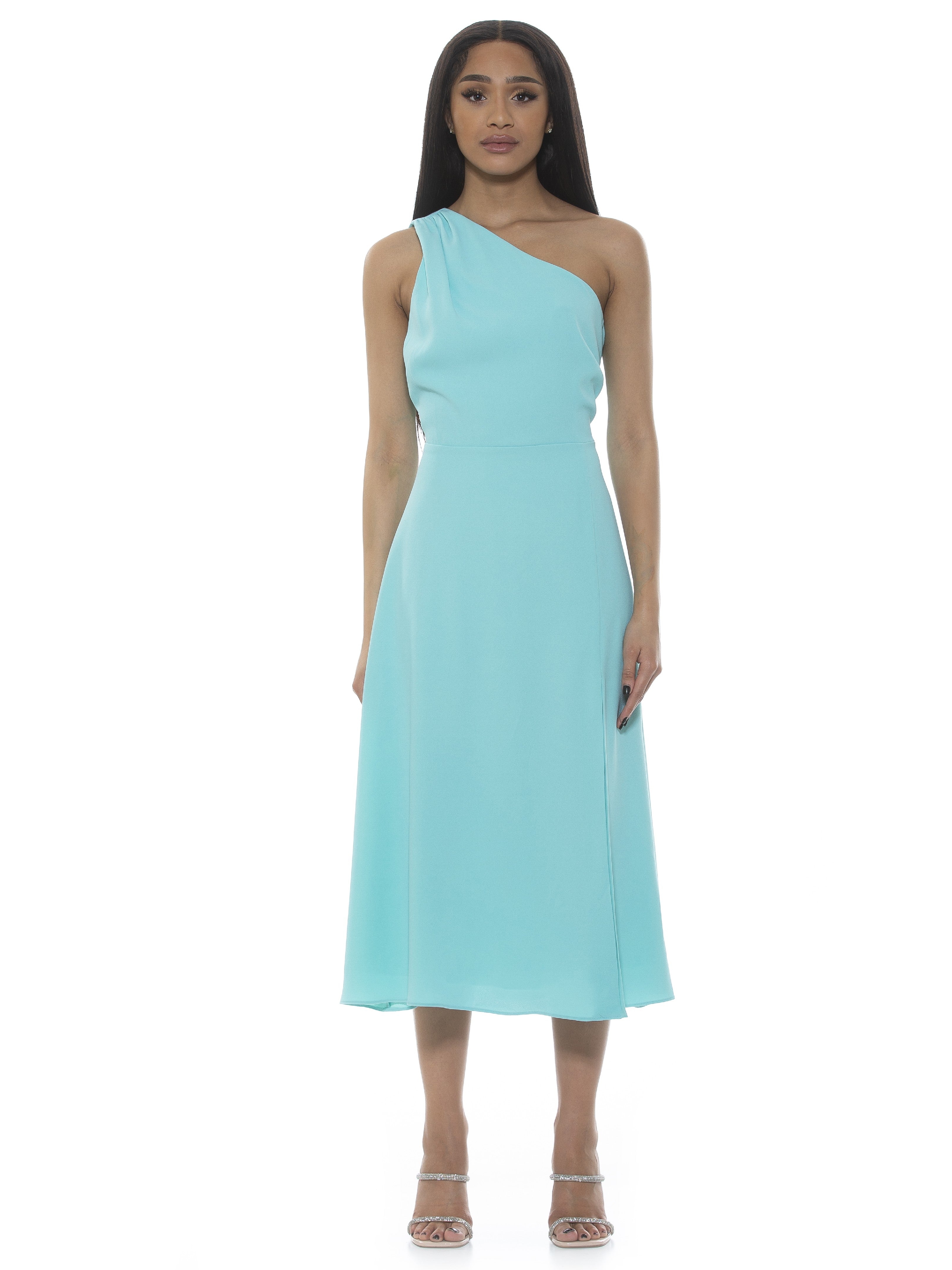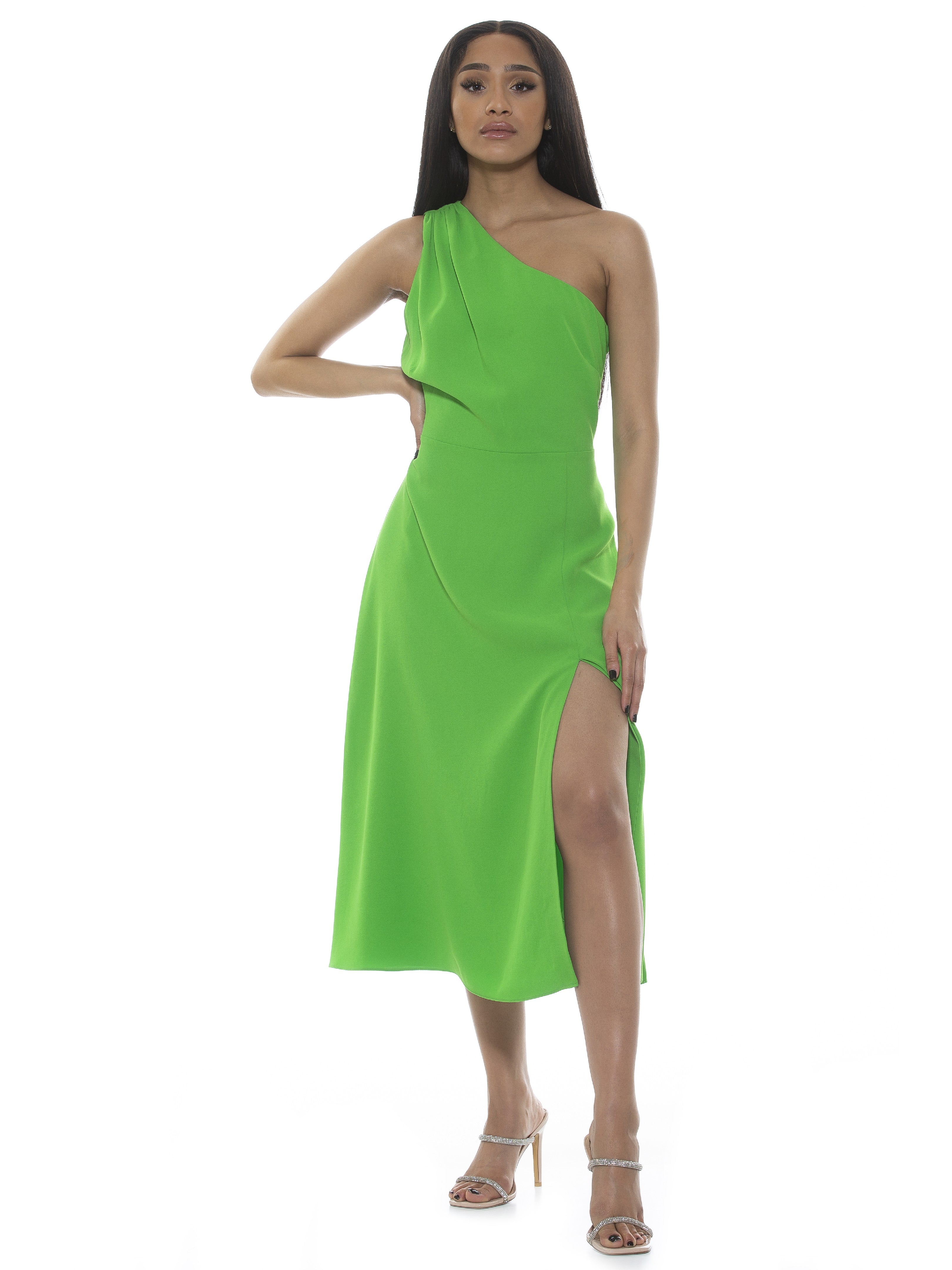 The Fay Dress is a one shoulder design with a side slit and fit and flare silhouette in an elegant midi dress. Make a statement with its unique shape and feel the confidence of a unique and beautiful look.
