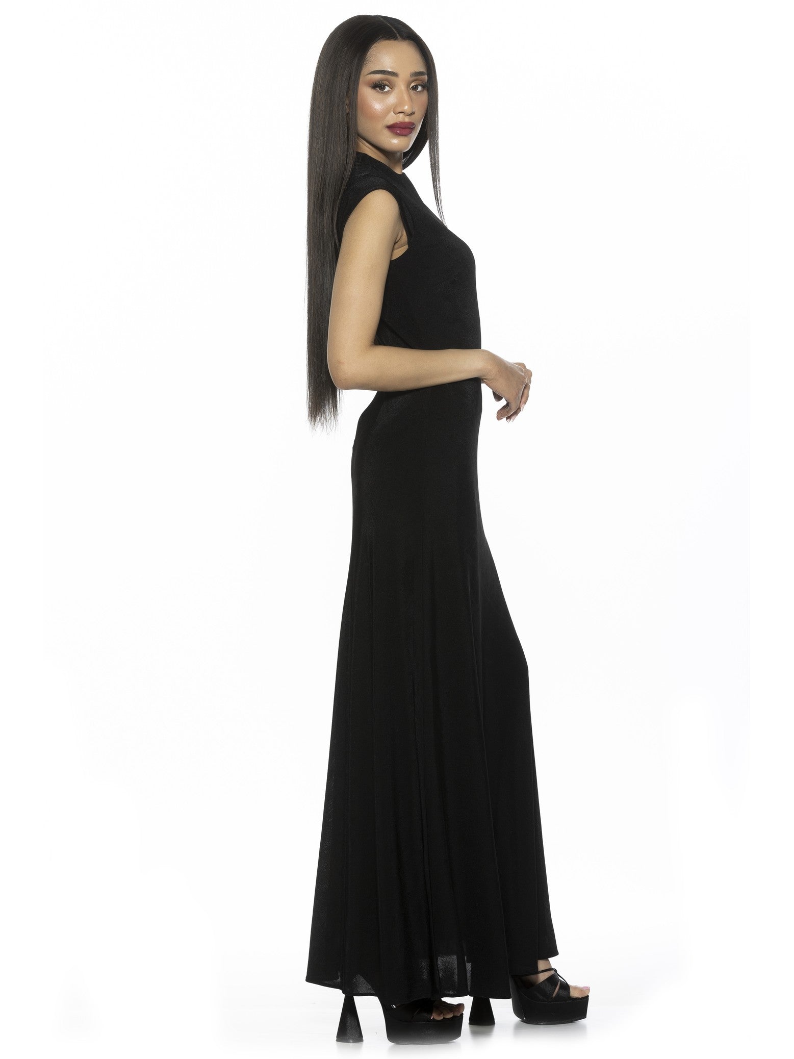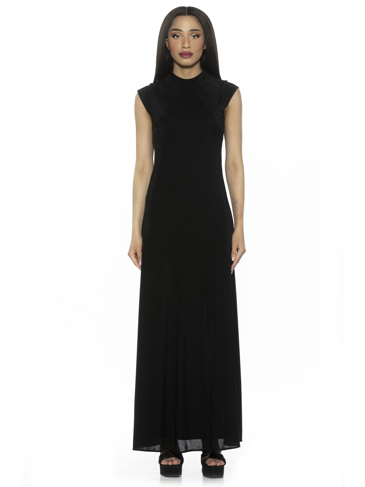 Introducing the Nalani Dress. This luxurious dress features a sleek, sleeveless design and a high mock neck for a chic and sophisticated look. Made from high-quality fabric, it is perfect for making a statement at any event. Elevate your style with Nalani.