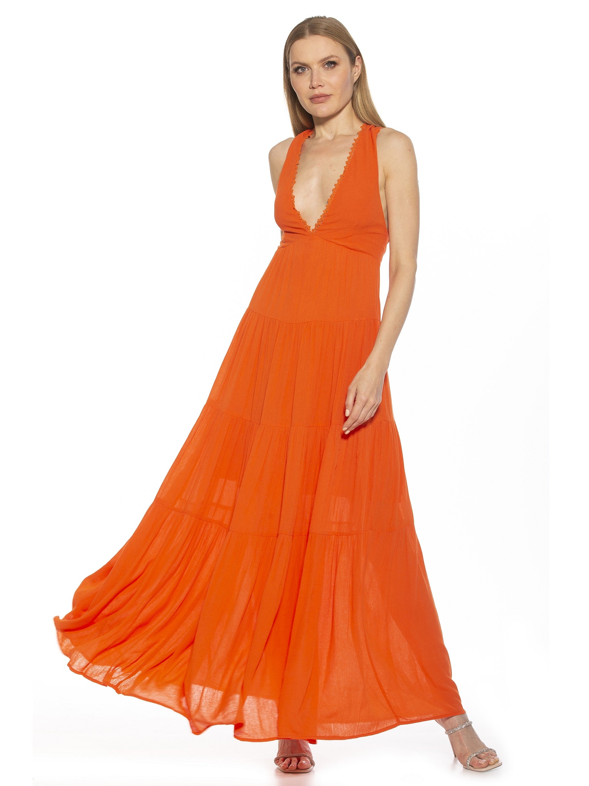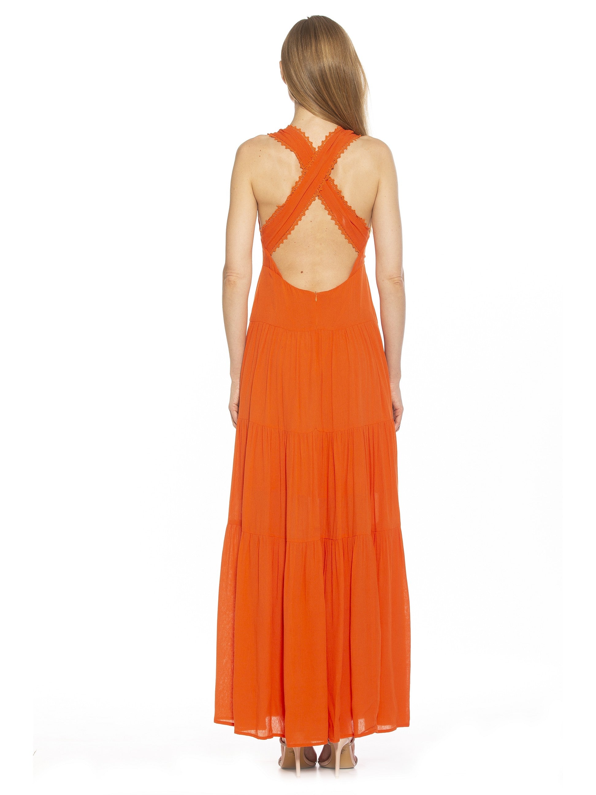 The Tezzi v neck tiered maxi dress with lace detailing is a must have piece for your wardrobe. This dress features v neck front bodice with lace trim detail, sleeveless, crisscross back with lace and tiered maxi skirt . This dress fits true to size.