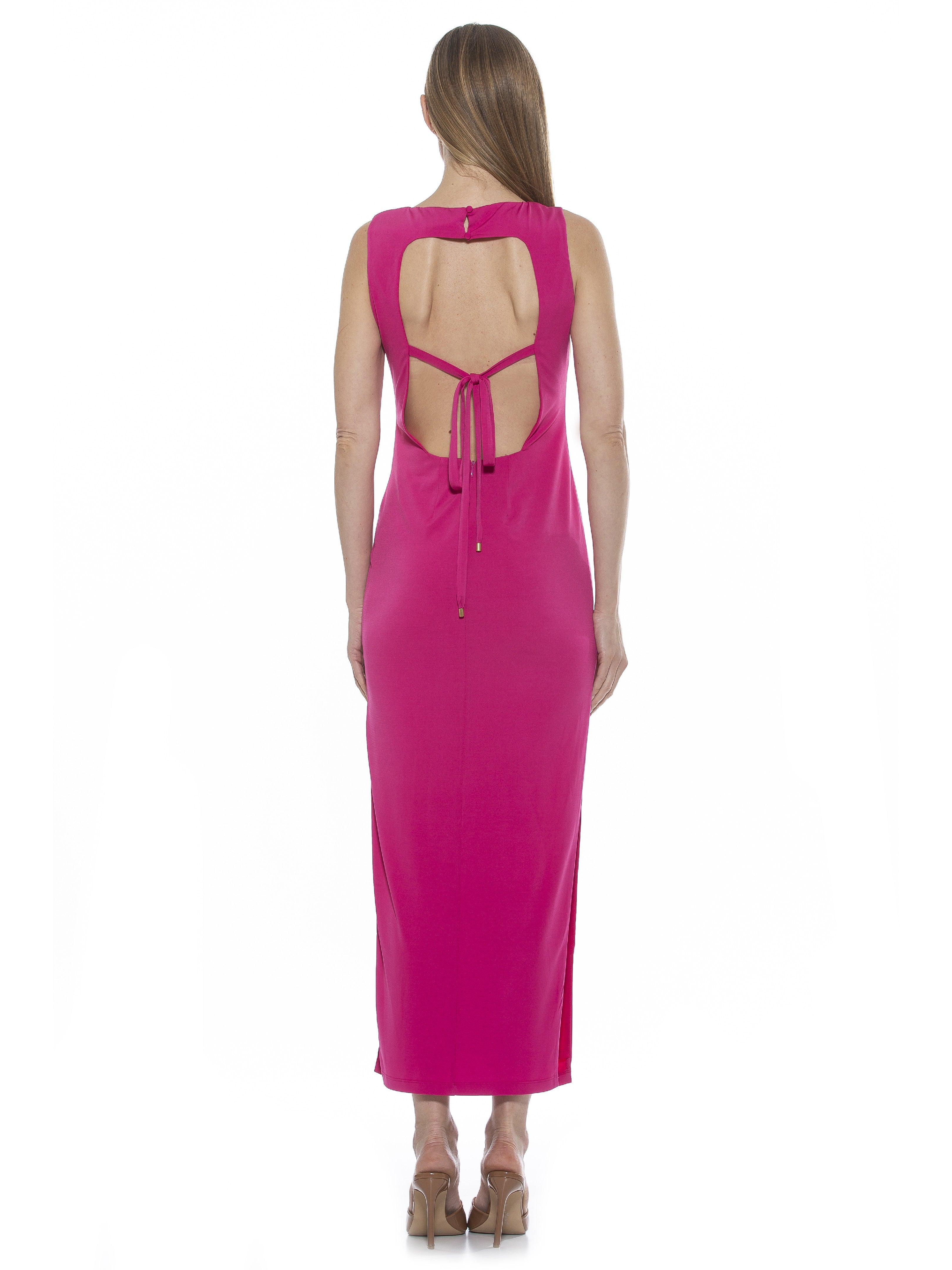 Sleeves are cancelled. The Violet is a sleeveless, maxi dress with a high boat neckline, and an open back with a tie detail.
