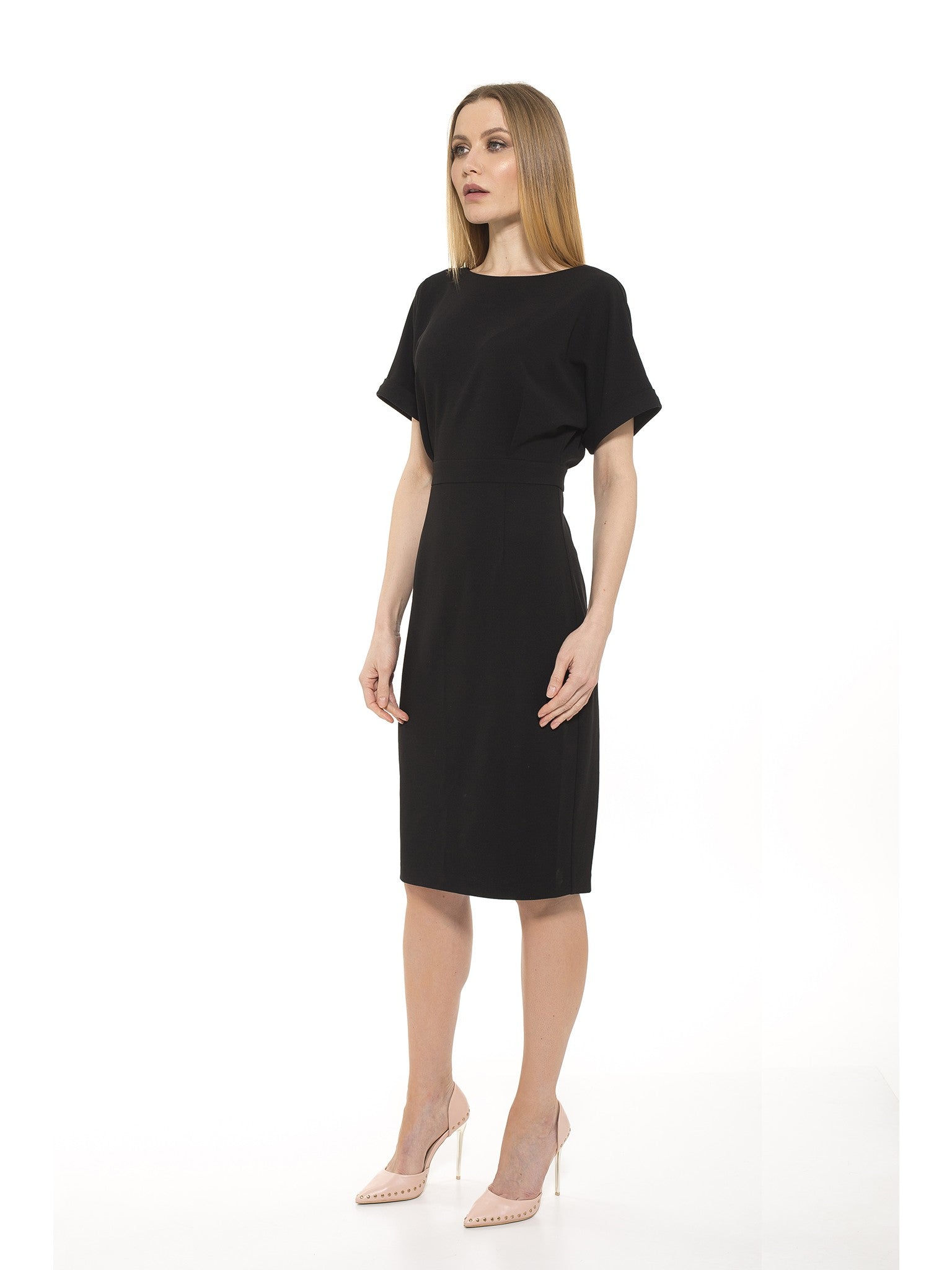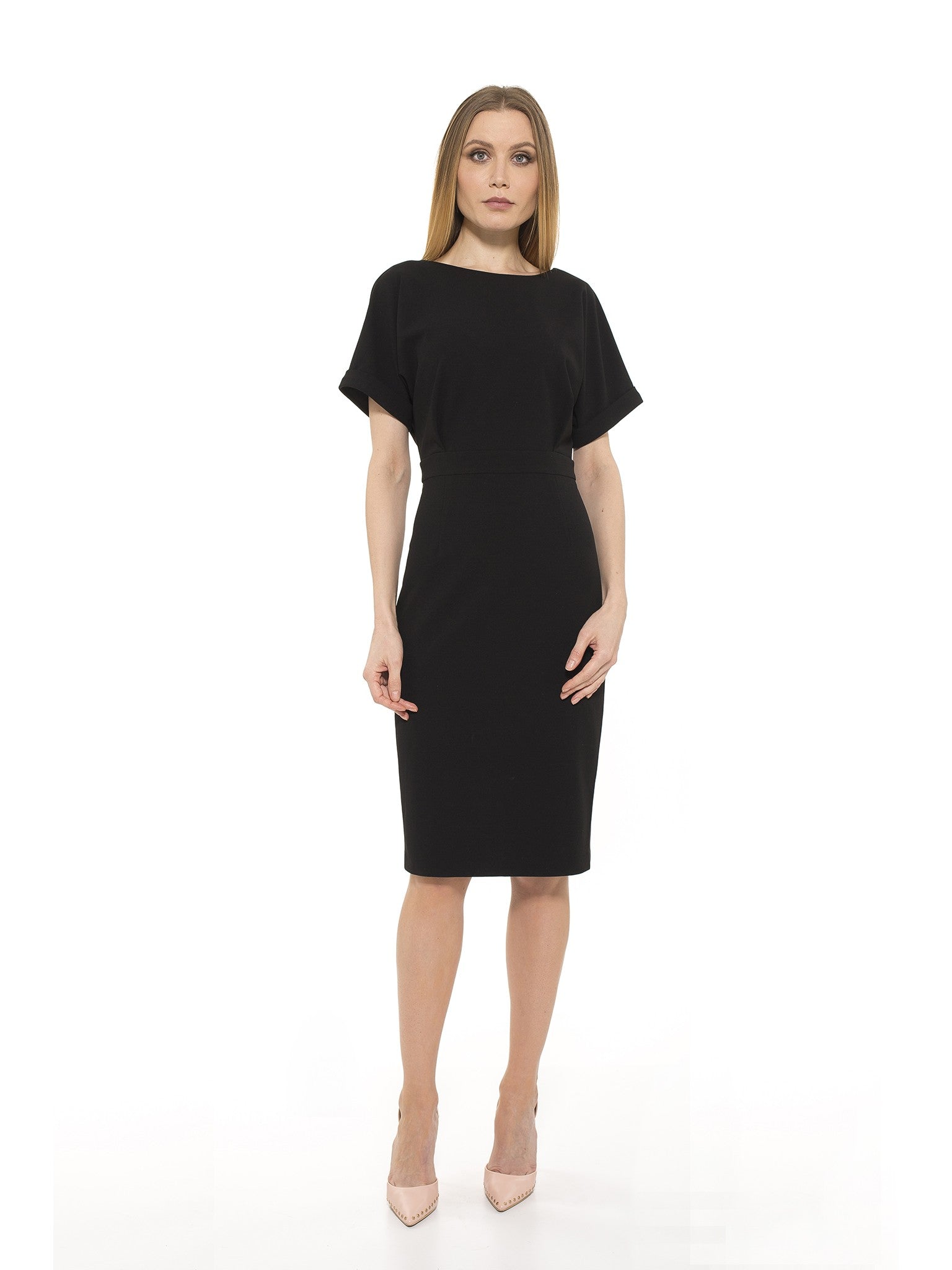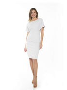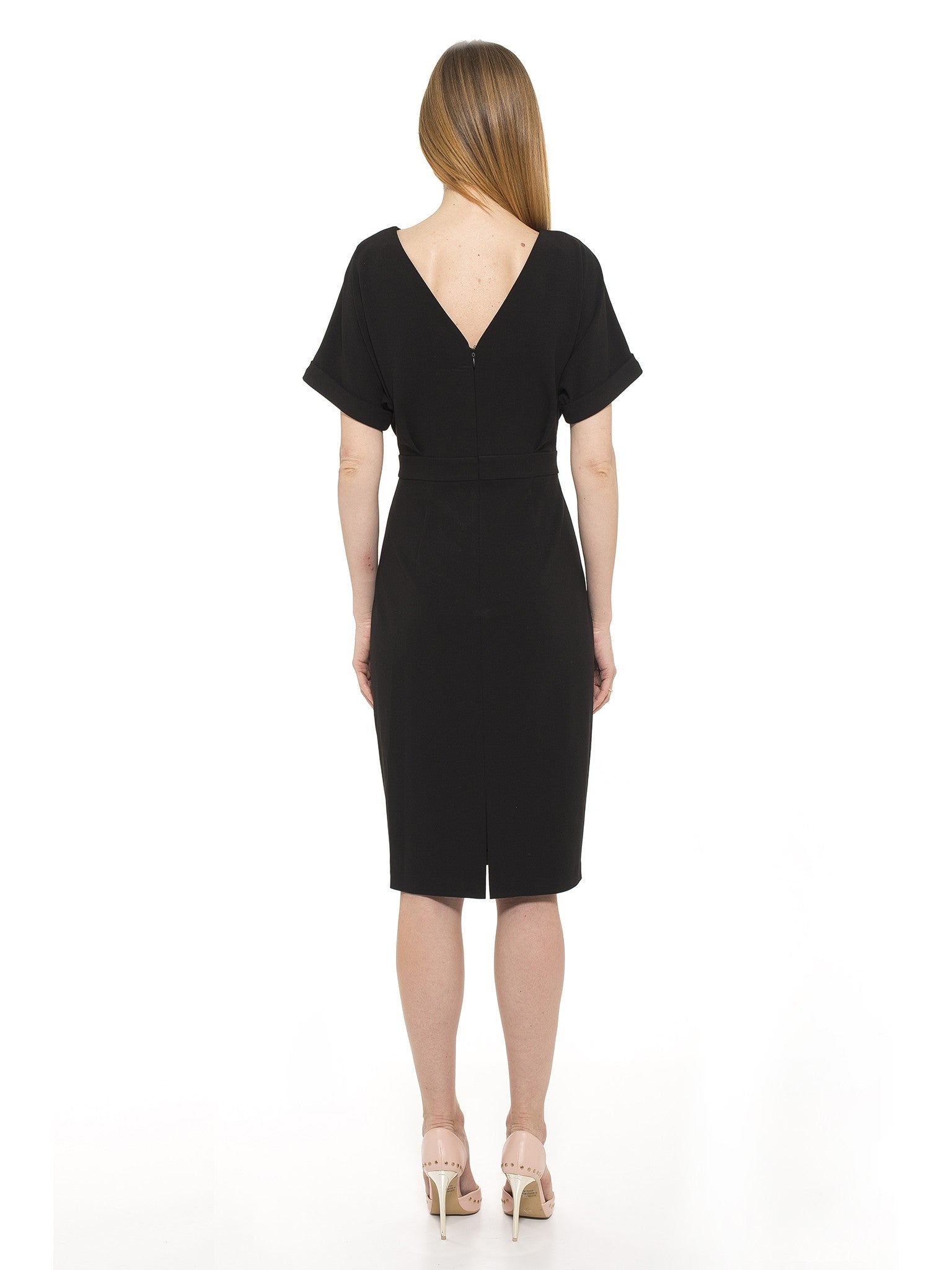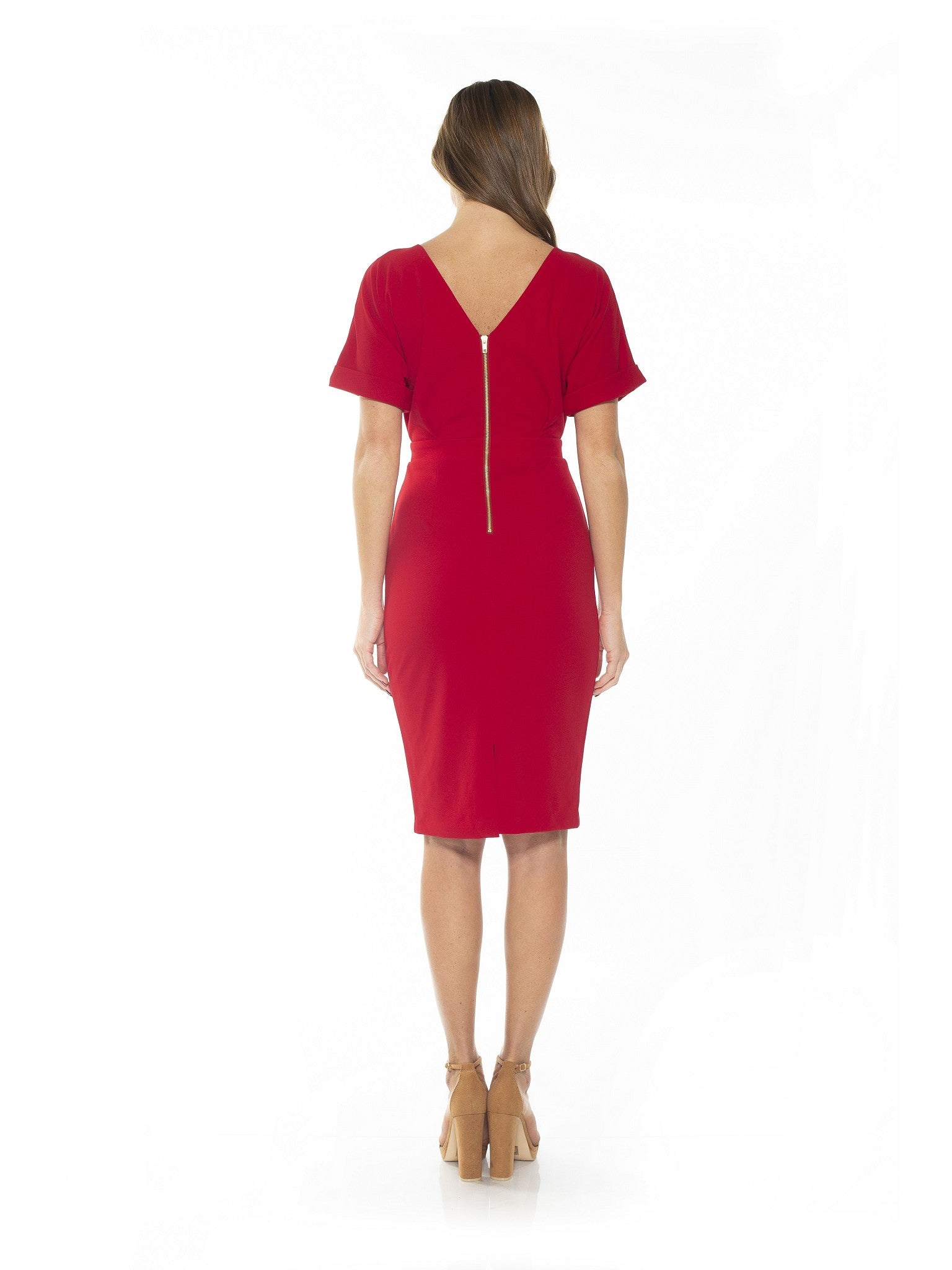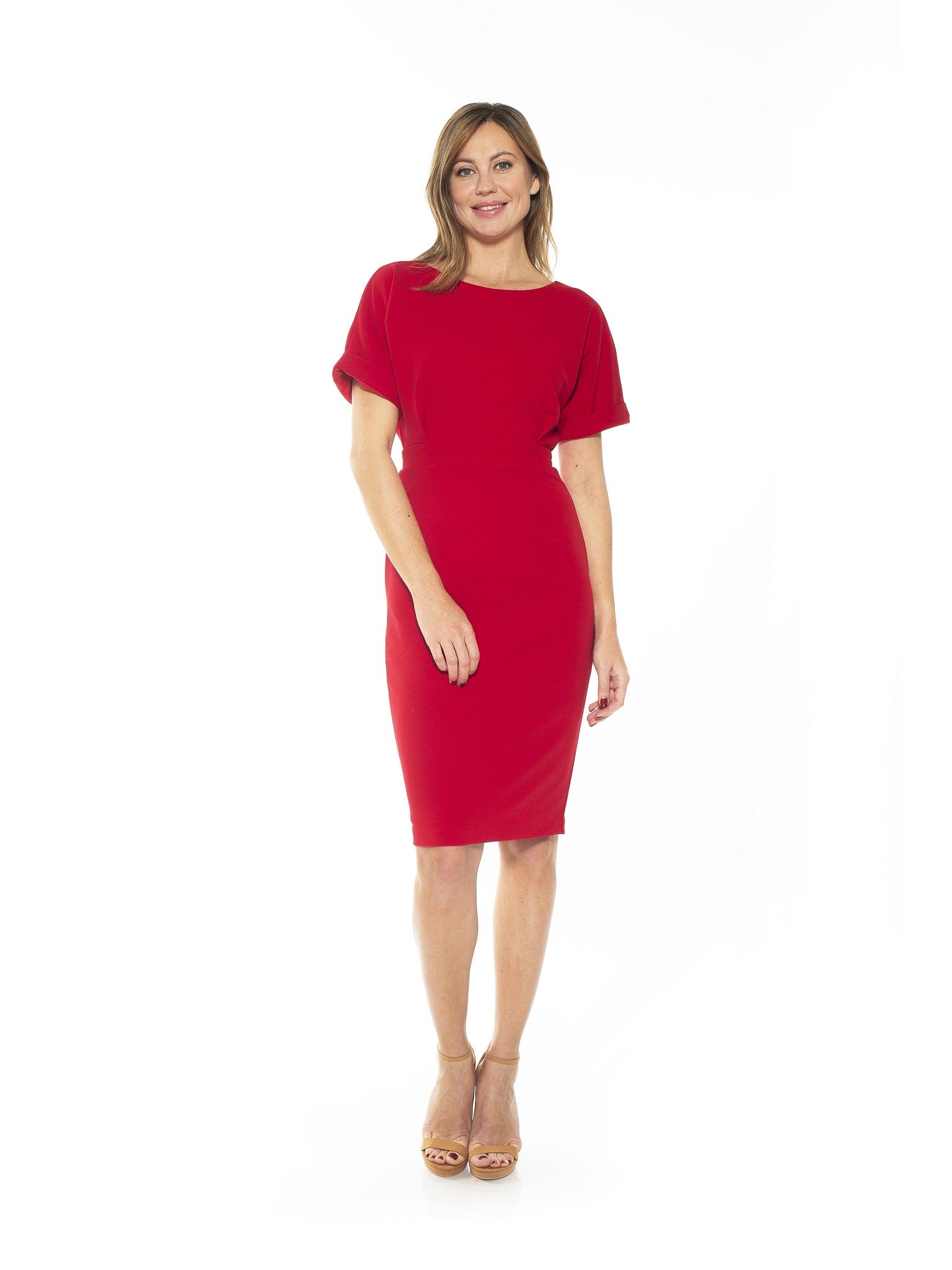 Turn heads this season in our stunning Jacqueline Midi Dress! This sheath dress features a boatneck, short dolman sleeves, back zip closure and a stunning V-cut back with a back slit to show a little bit of leg.