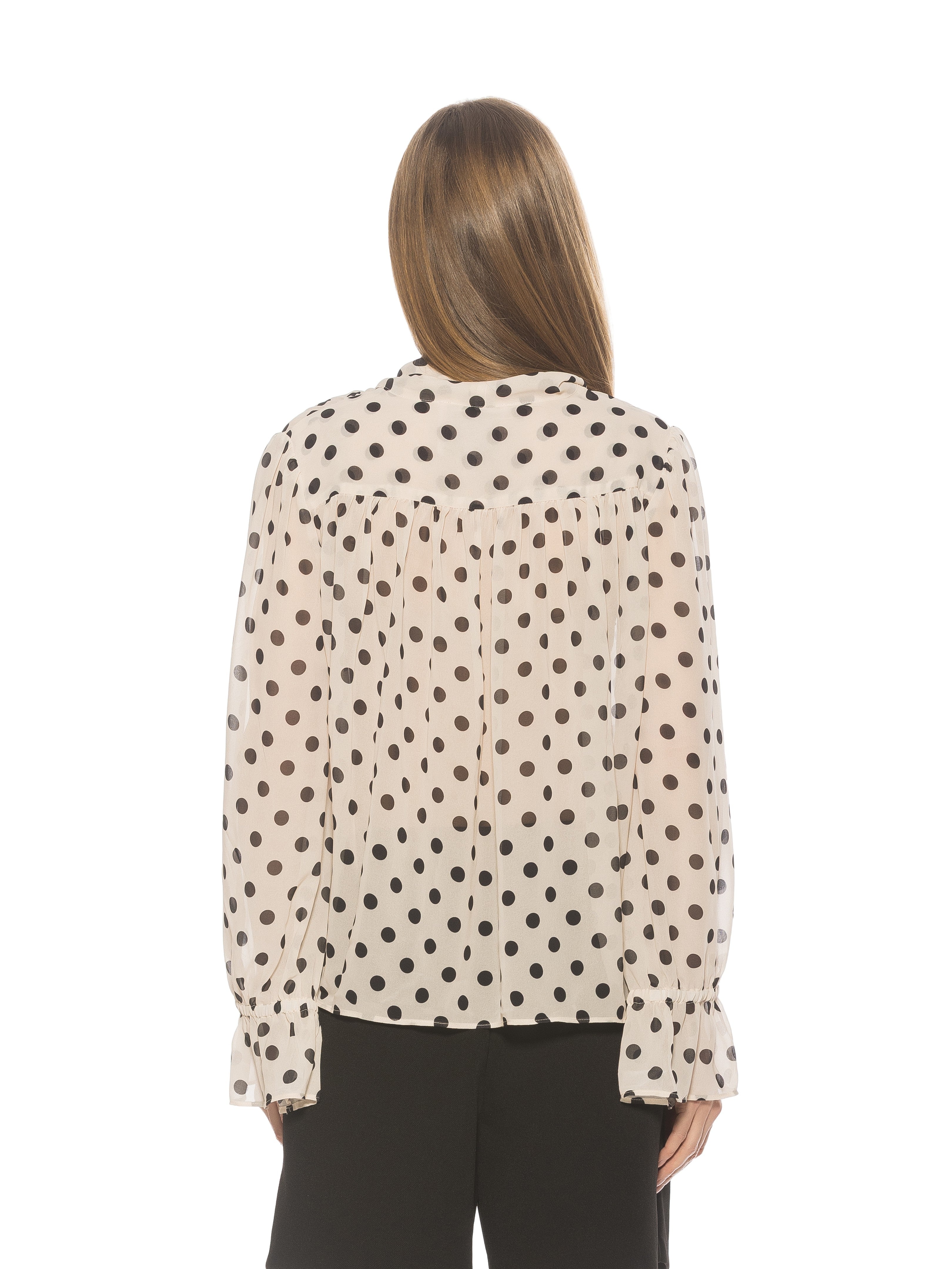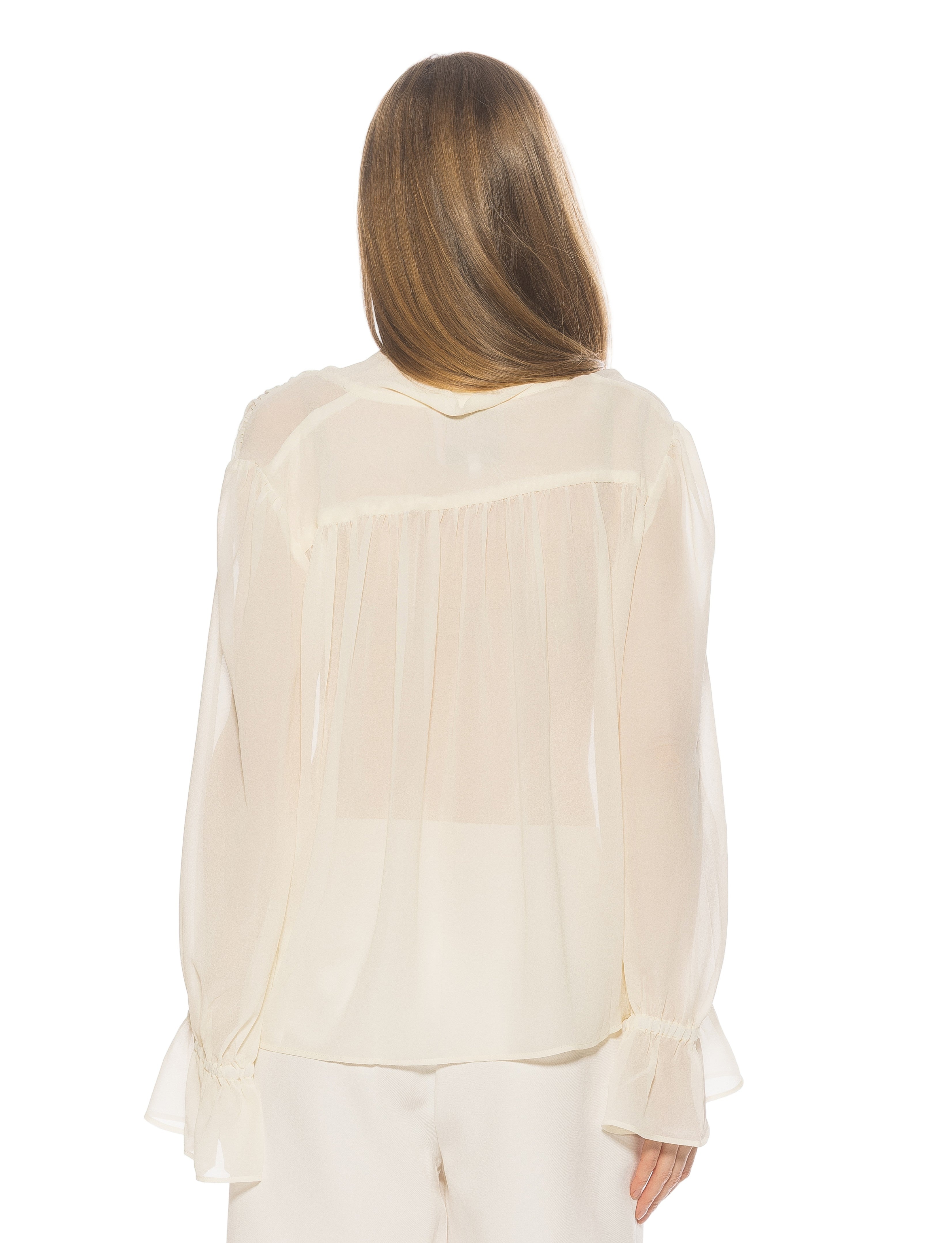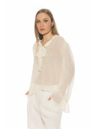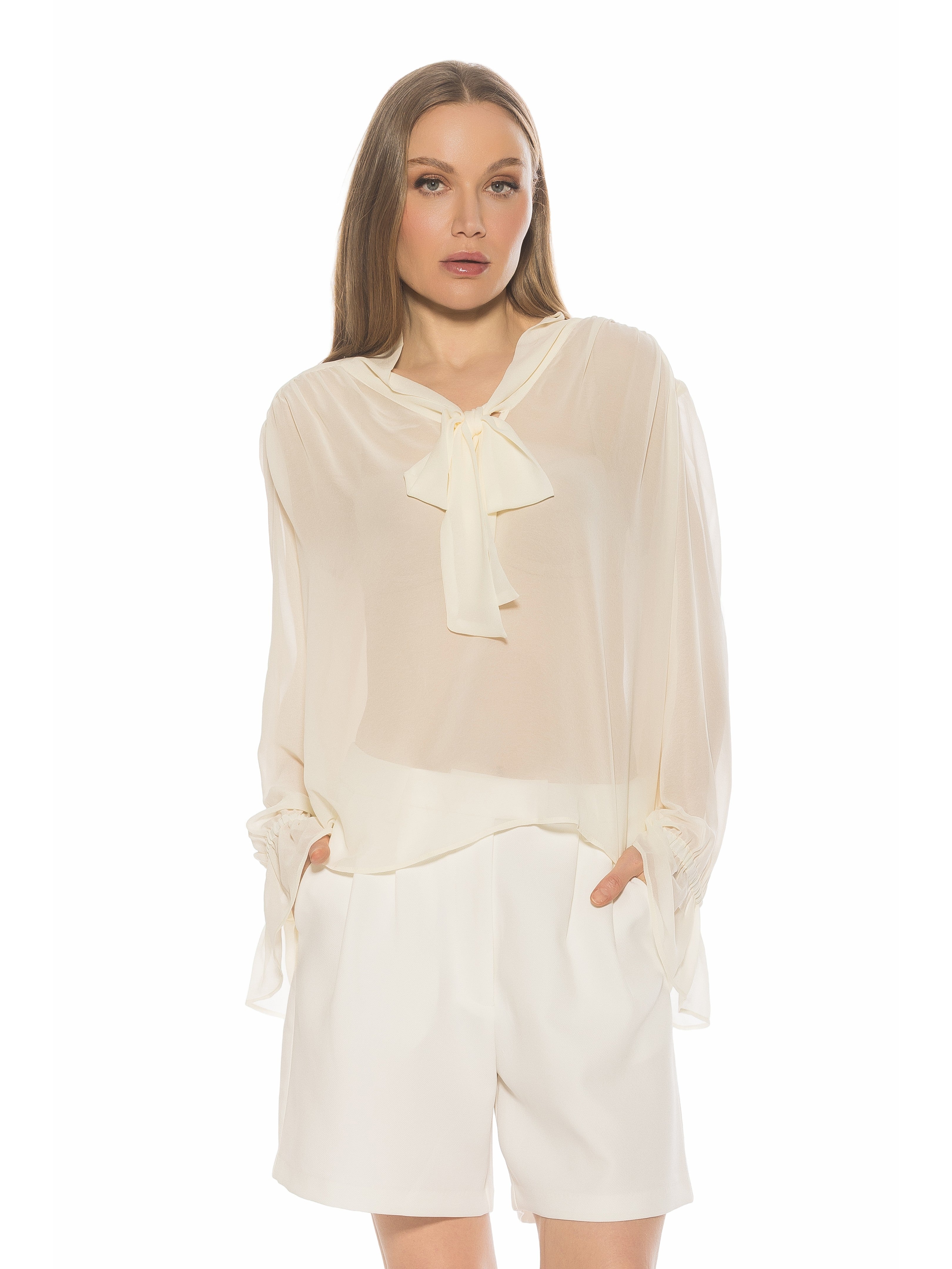 Romantic and airy with timeless elegance, the Lin Sheer Bow Tie Blouse is designed to elevate everyday dressing. Crafted in lightweight chiffon, this blouse features a soft front bow detail and delicate shirring that adds subtle texture and feminine movement. Unlined for an effortlessly sheer, floaty feel, the Lin blouse drapes beautifully on the body while maintaining a refined silhouette. Finished with long sleeves and gentle volume, it’s perfect for pairing with tailored bottoms or layered under suiting for a polished look.