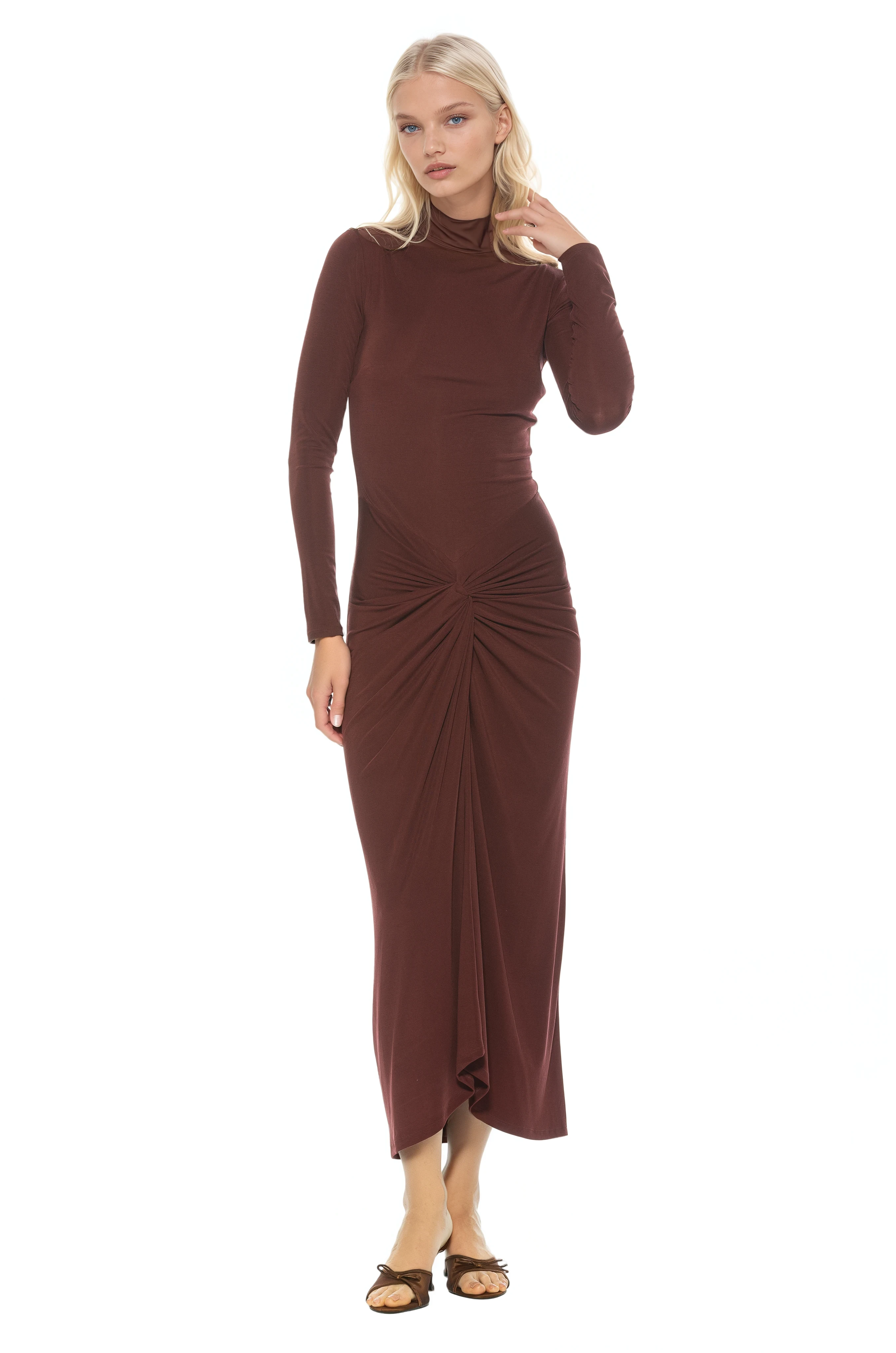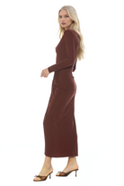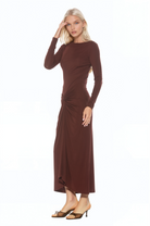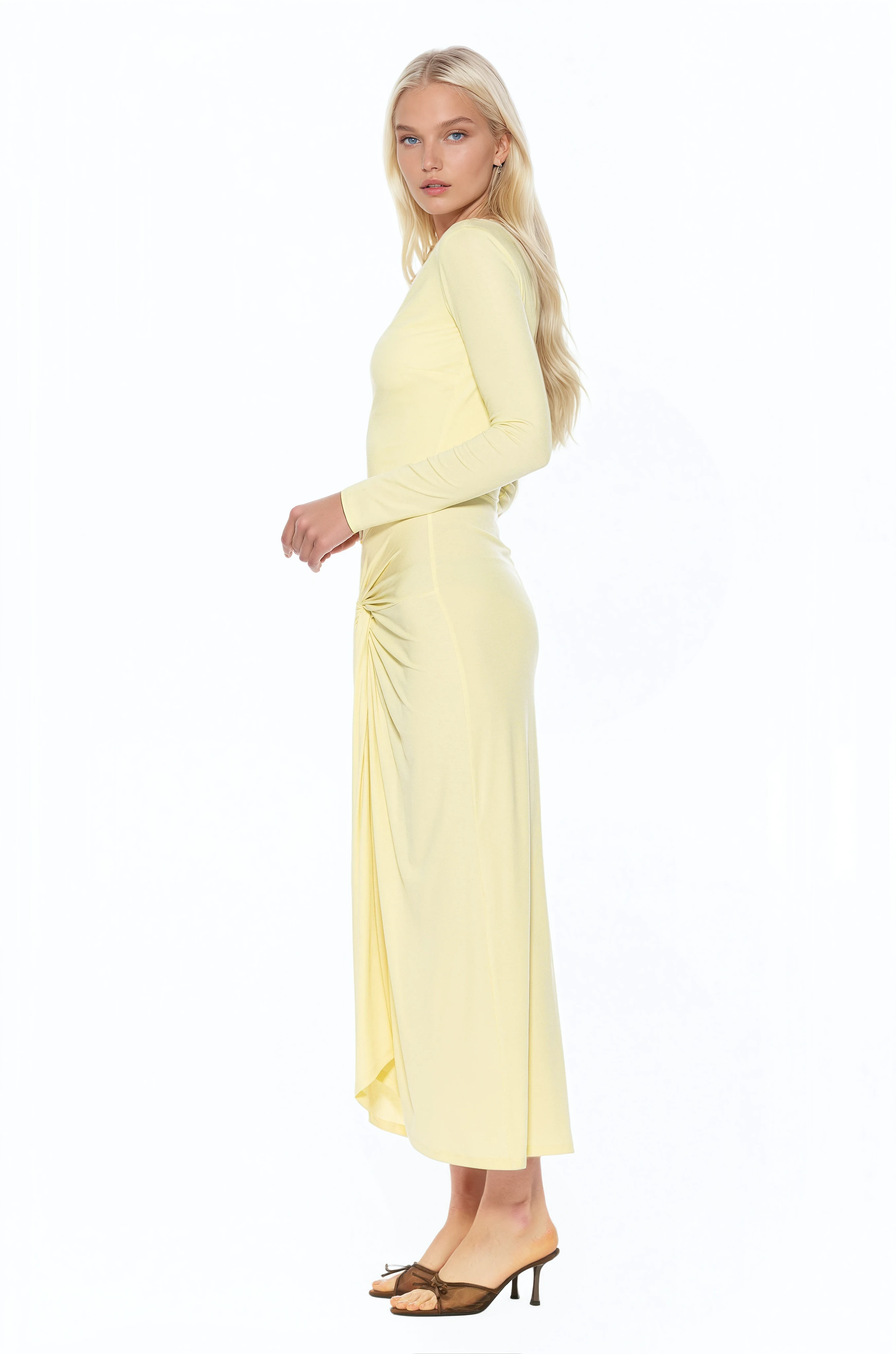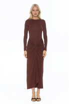 Sleek and sculptural with effortless elegance, the Revel Long Sleeve Draped Skirt Midi Dress is designed to contour and flatter. Crafted in smooth stretch jersey, this dress features a refined long sleeve silhouette with a softly draped skirt that creates movement and dimension through the body. The bodice is lined for added comfort and structure, while the fluid jersey fabric allows for ease and flexibility. Balanced and modern, the Revel dress transitions seamlessly from day to evening with timeless appeal.