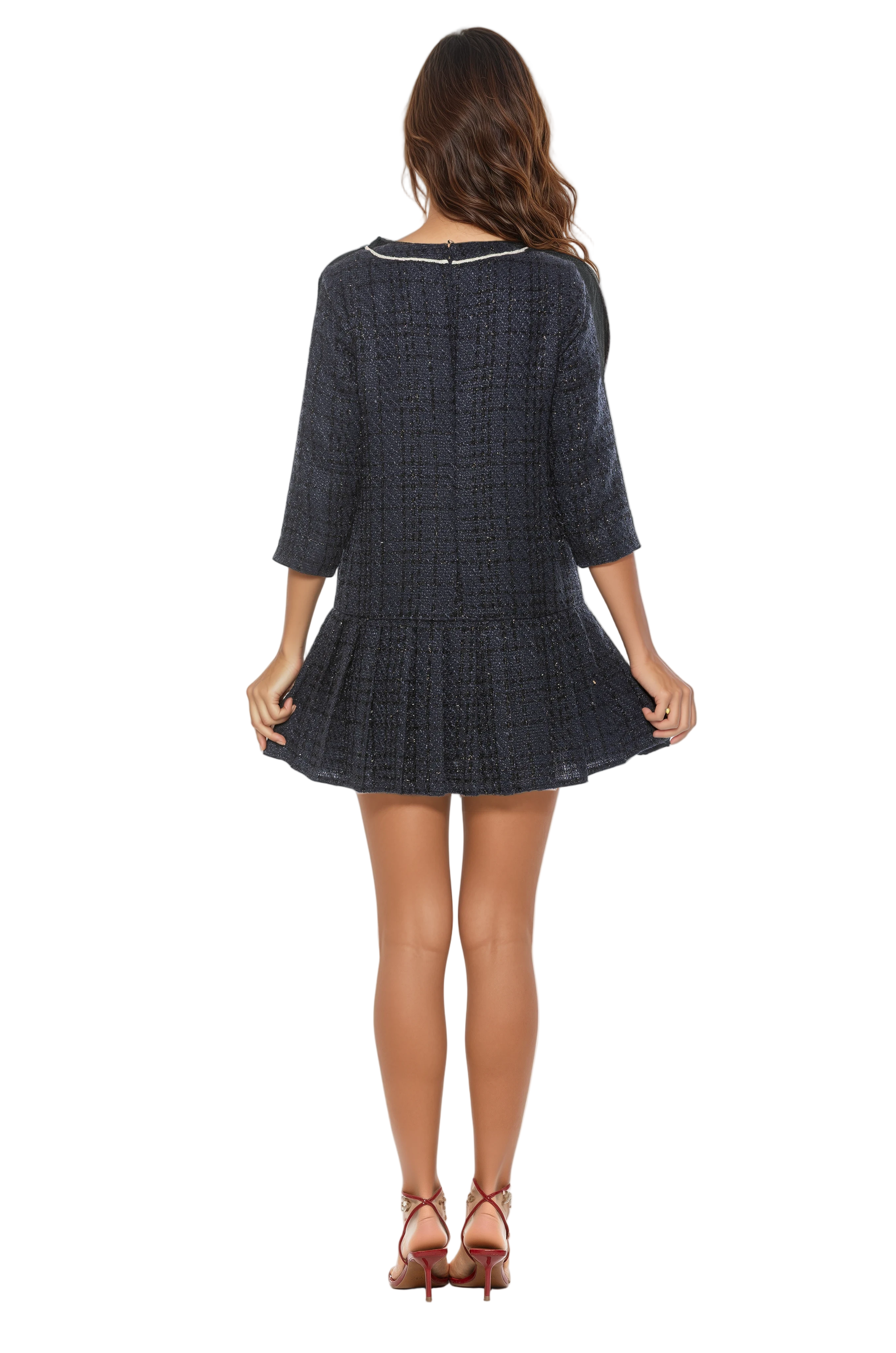 The Sabine Crewneck 3/4” Sleeve Dropped Waist Pleated Skirt. This Dress Features Luxe Fabric, Pleated Skirt Detail, And Dropped Waist. This Dress Fits True To Size.
