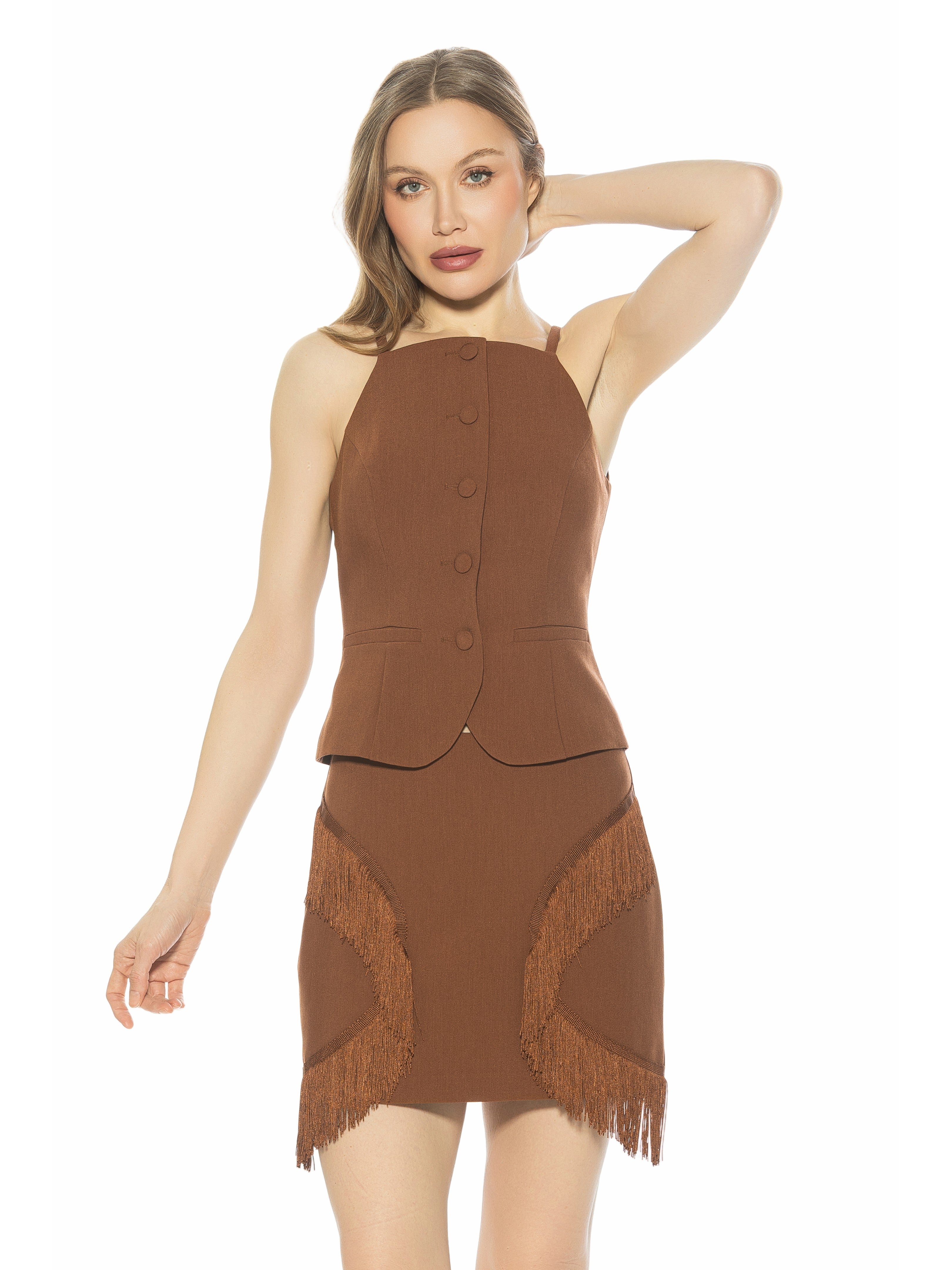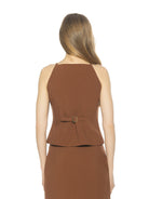 The Ziv High Neck Button Down Vest Top delivers sleek, modern tailoring with a refined, feminine edge. Designed with a halter-inspired high neckline and delicate thin strap, this fitted vest silhouette highlights the waist while maintaining a clean, sophisticated finish. Thoughtful tailoring details elevate the look, making Ziv a standout piece for day or night.