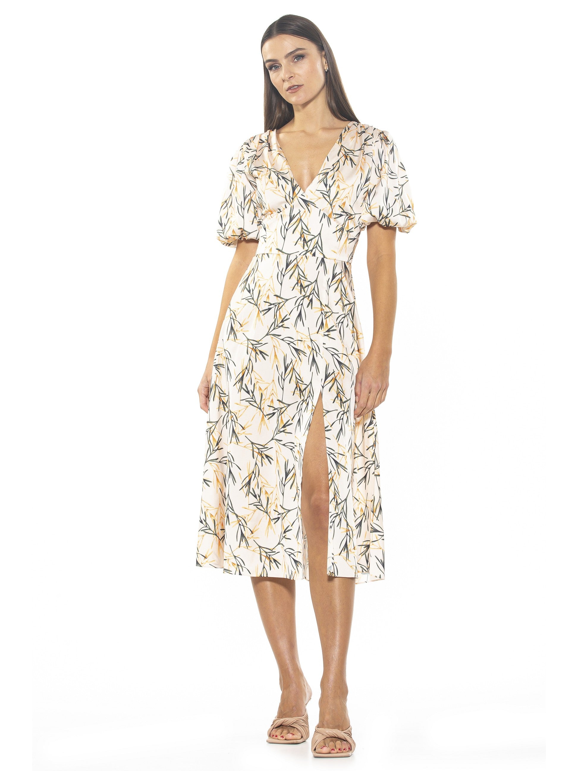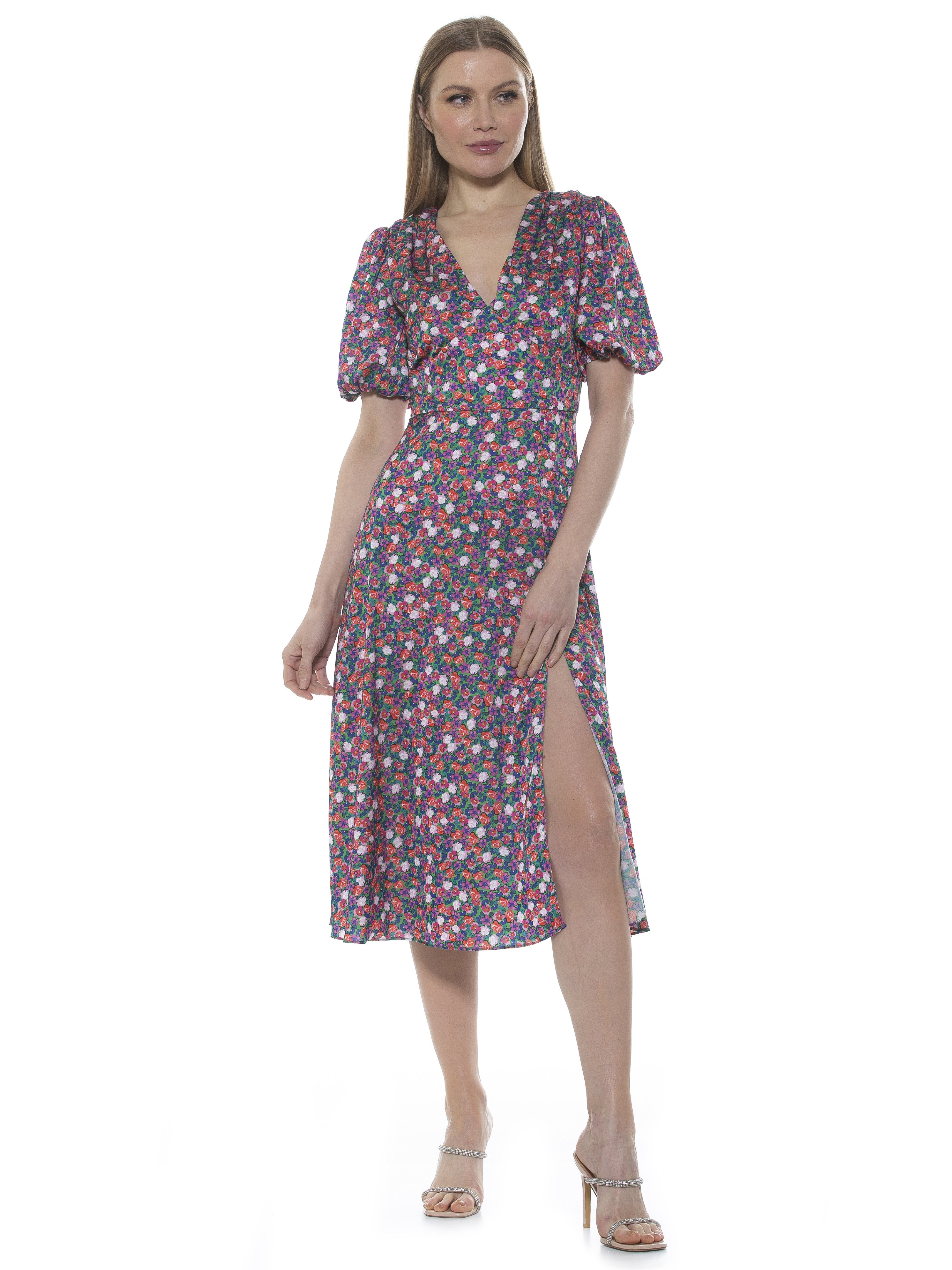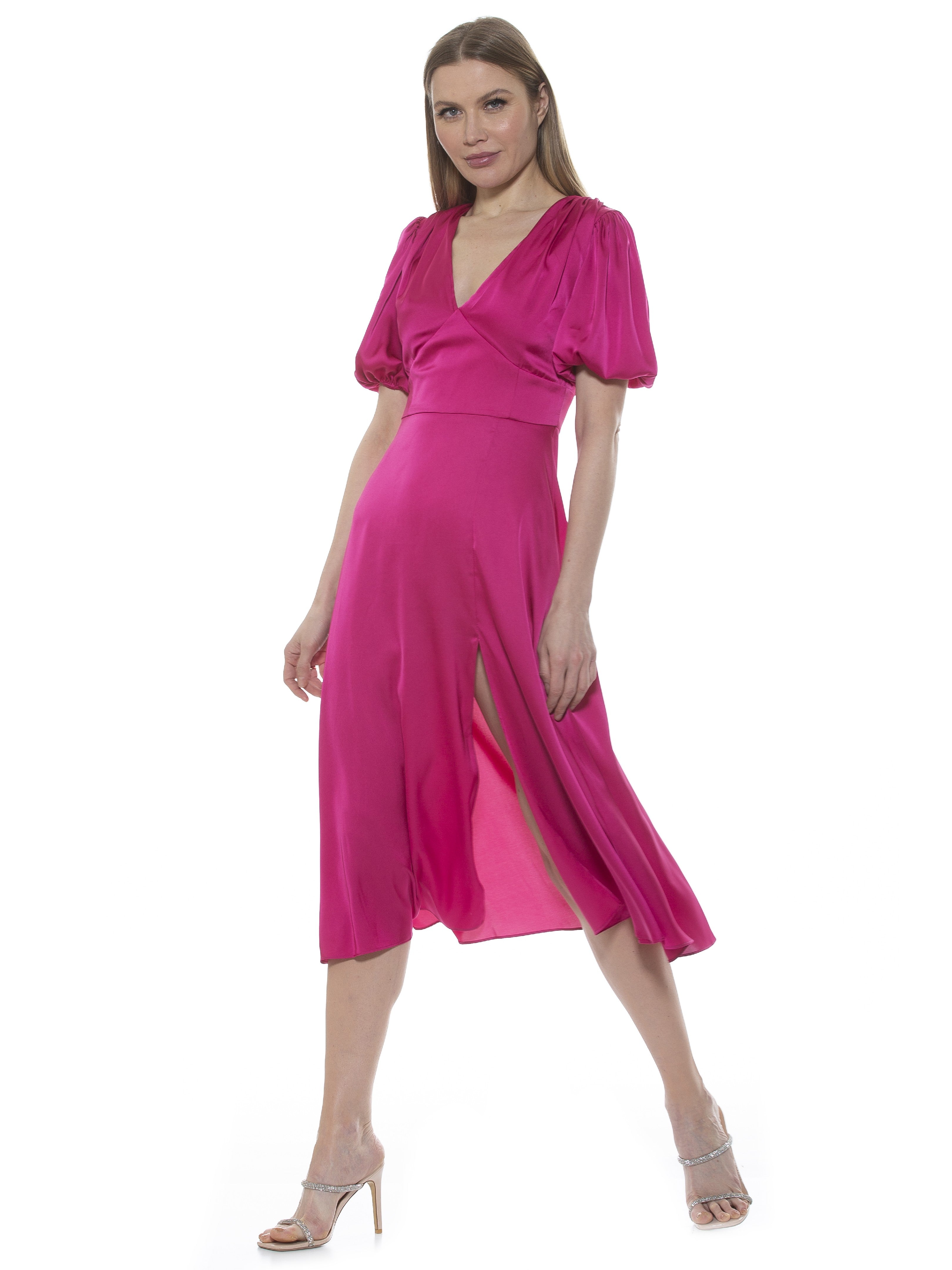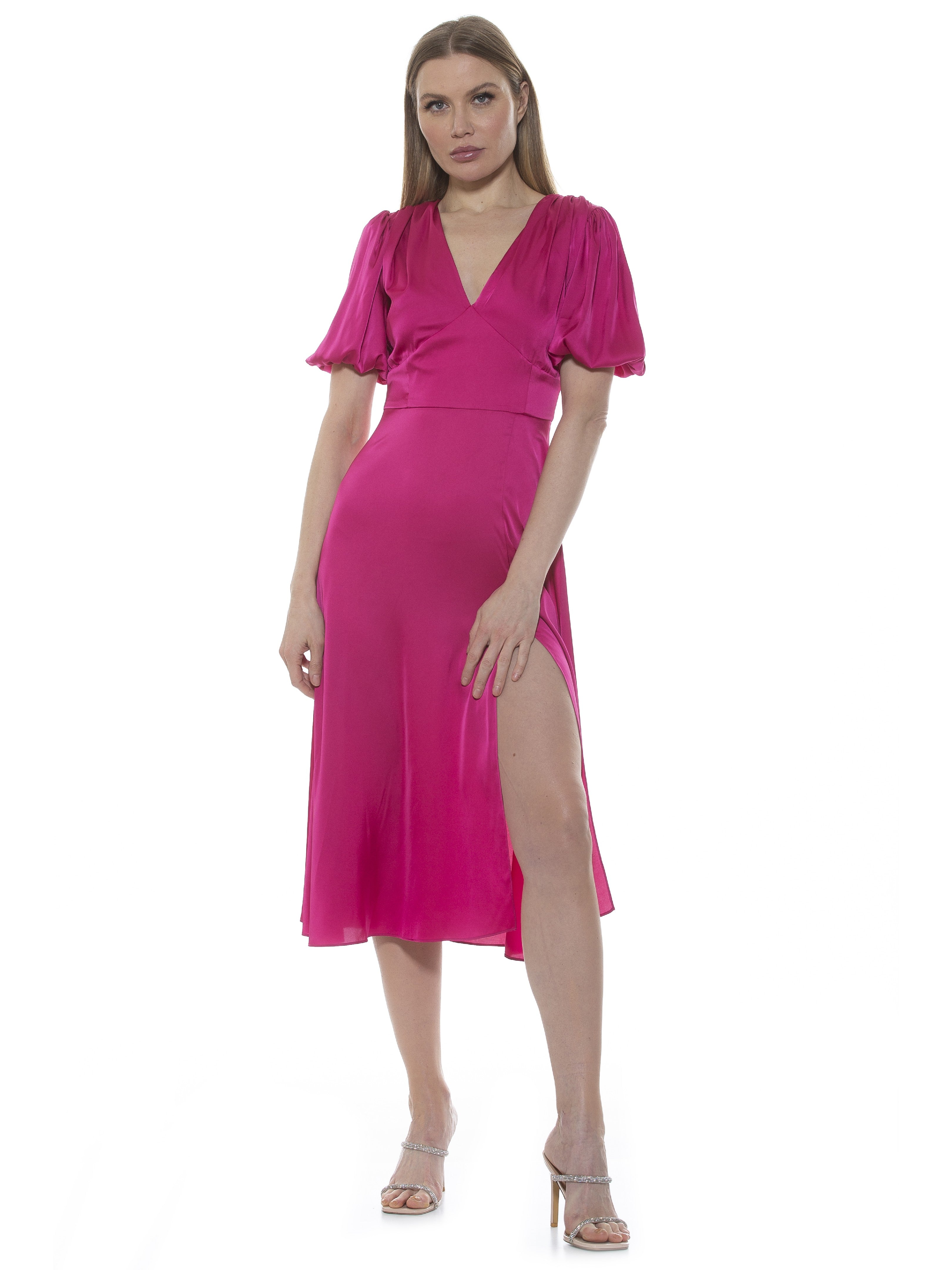 The Nola Dress is a timeless classic that will make a glamorous addition to any wardrobe. Featuring a delicate puff sleeve, a flattering V-neckline, a midi length skirt with a daring slit on the leg, and a fit and flare silhouette, it exudes modern sophistication. Perfect for any event, this dress will make a refined statement.
