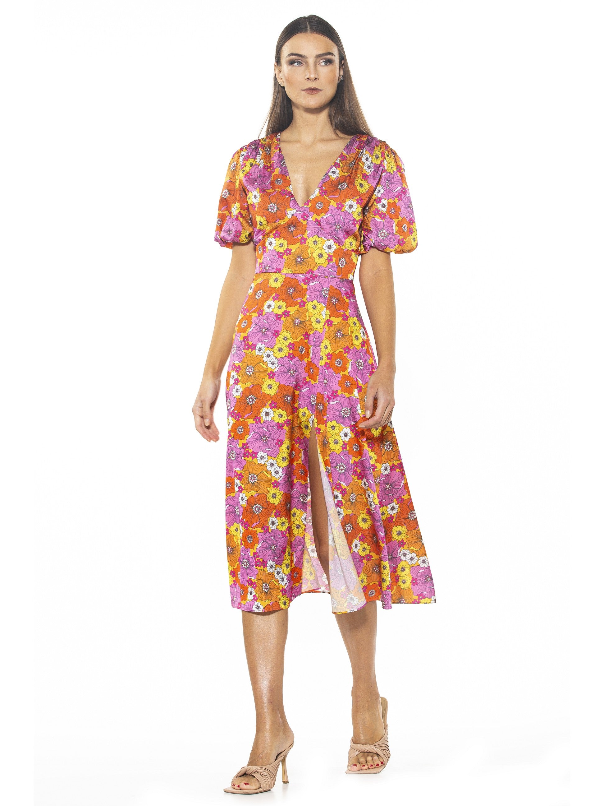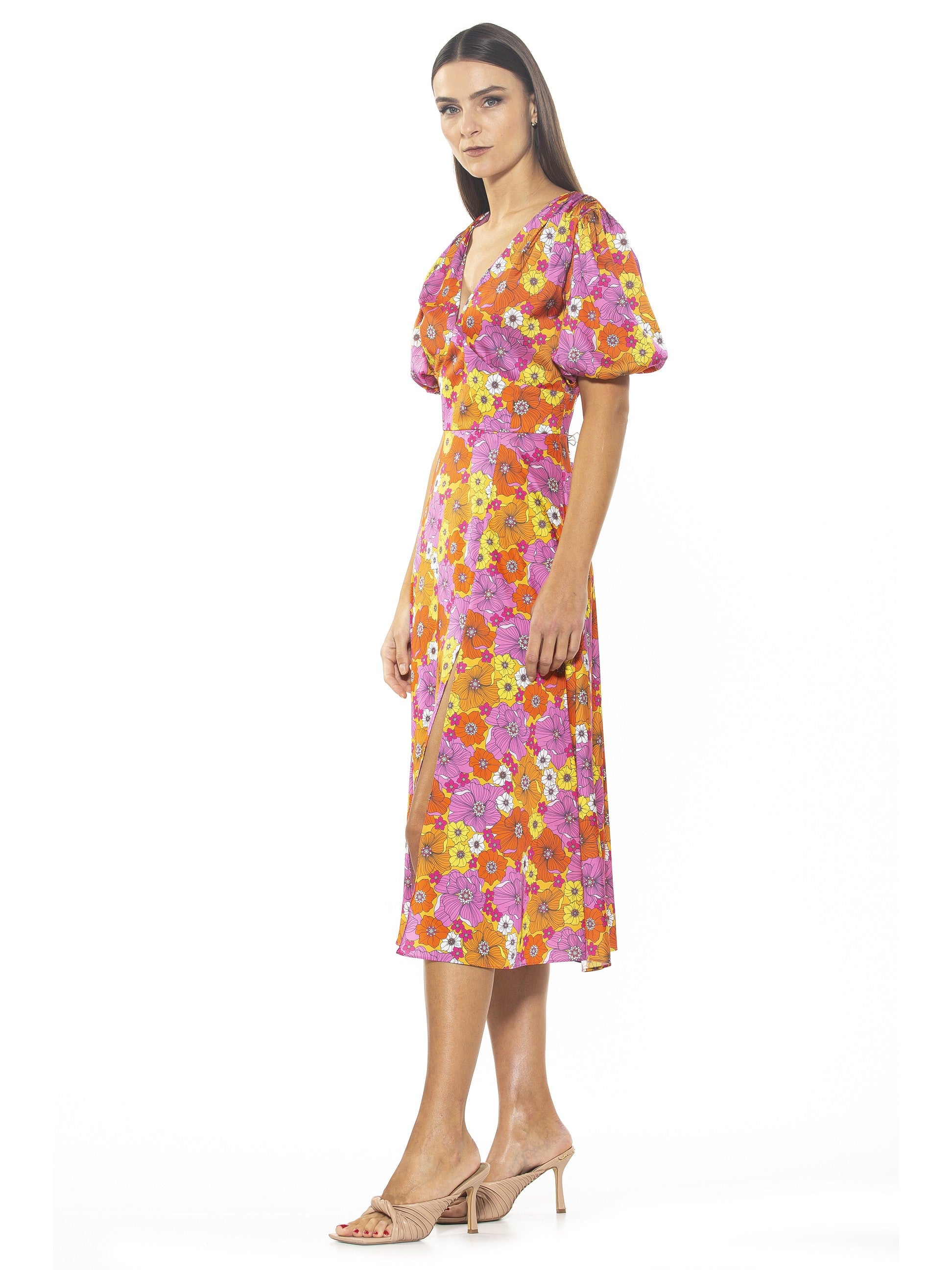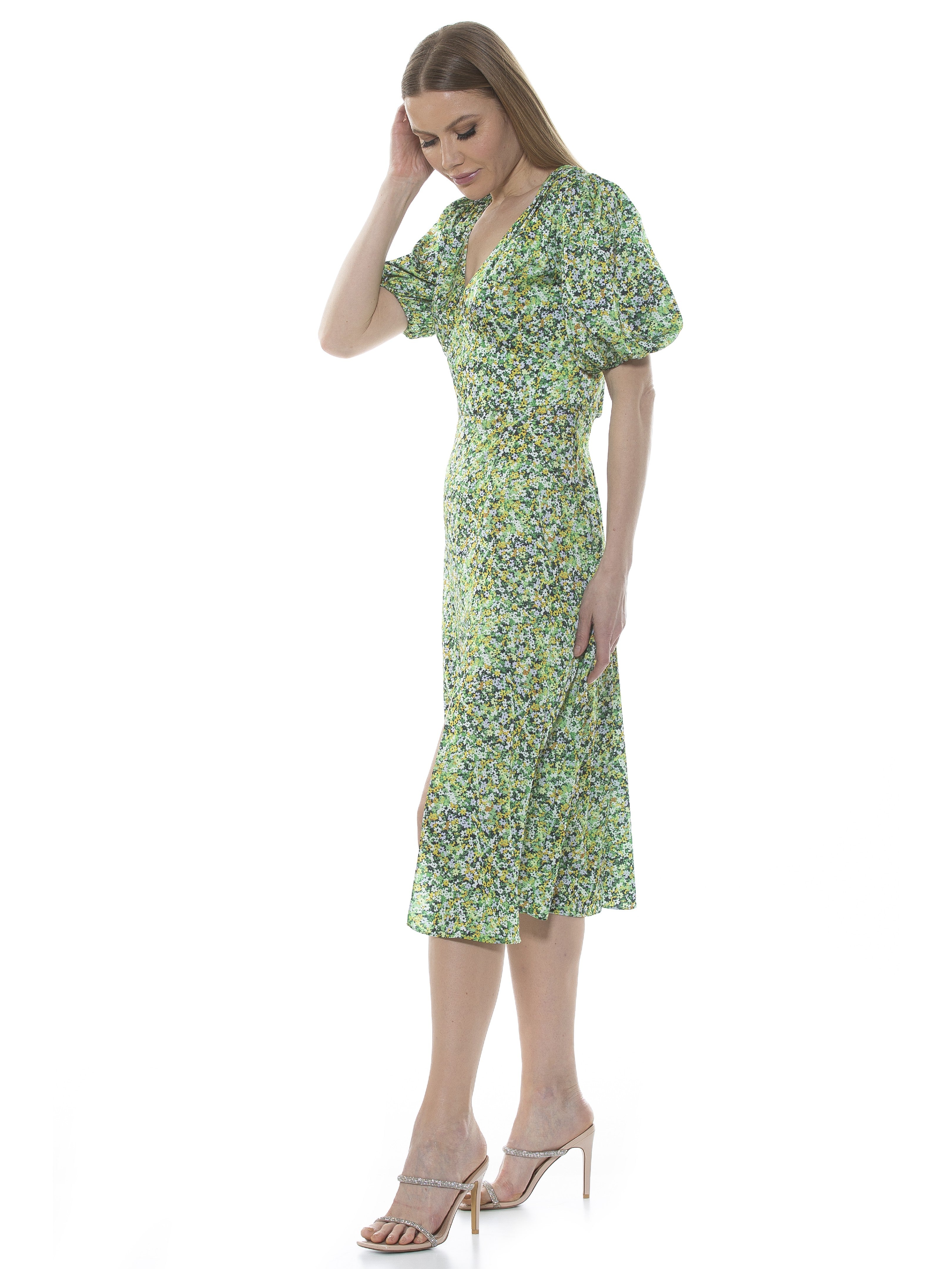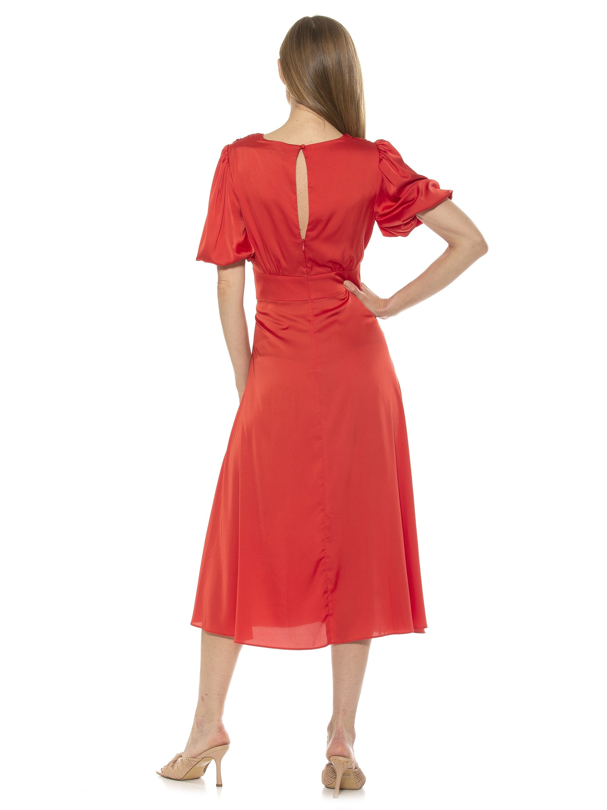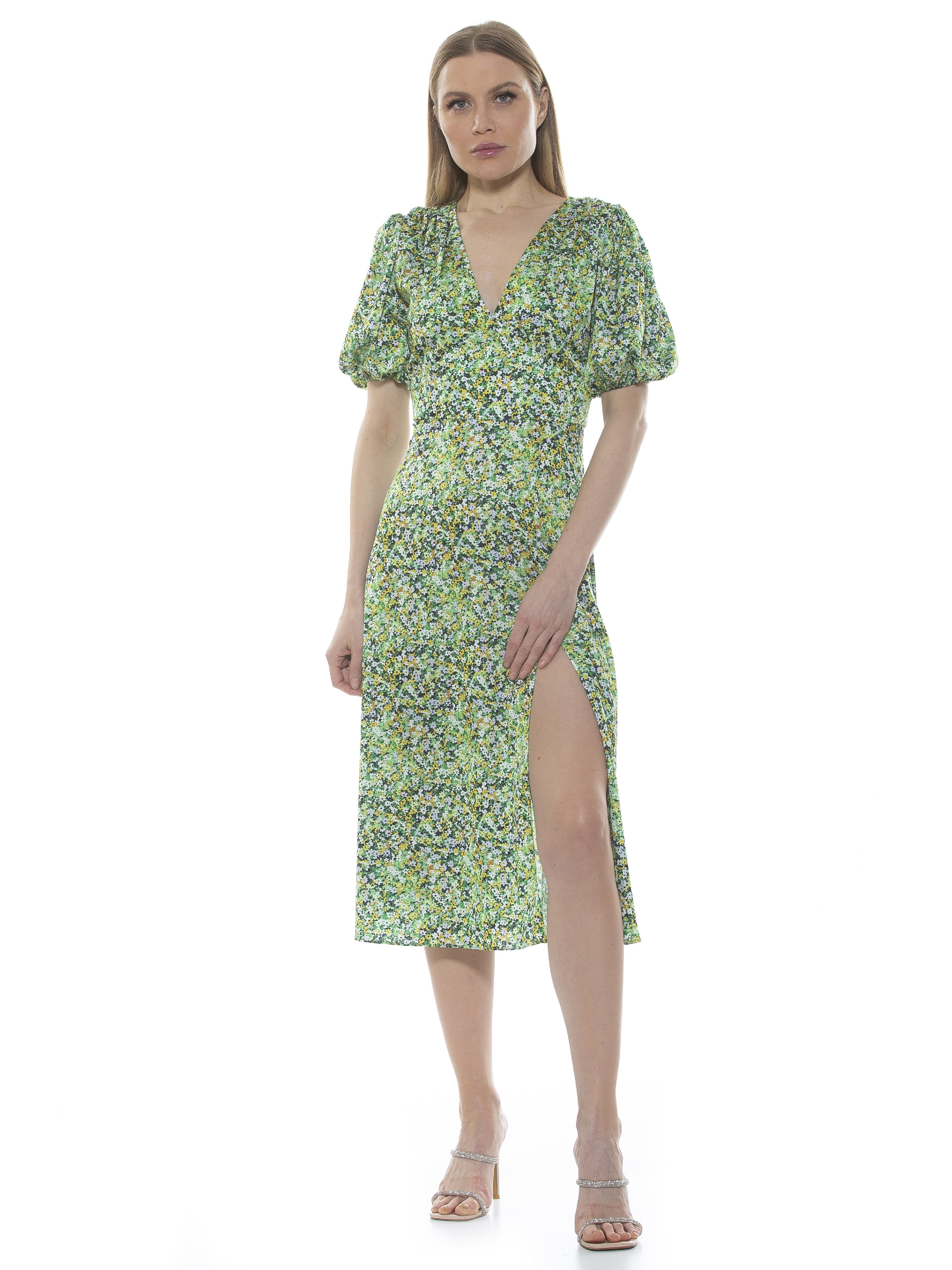 The Nola Dress is a timeless classic that will make a glamorous addition to any wardrobe. Featuring a delicate puff sleeve, a flattering V-neckline, a midi length skirt with a daring slit on the leg, and a fit and flare silhouette, it exudes modern sophistication. Perfect for any event, this dress will make a refined statement.