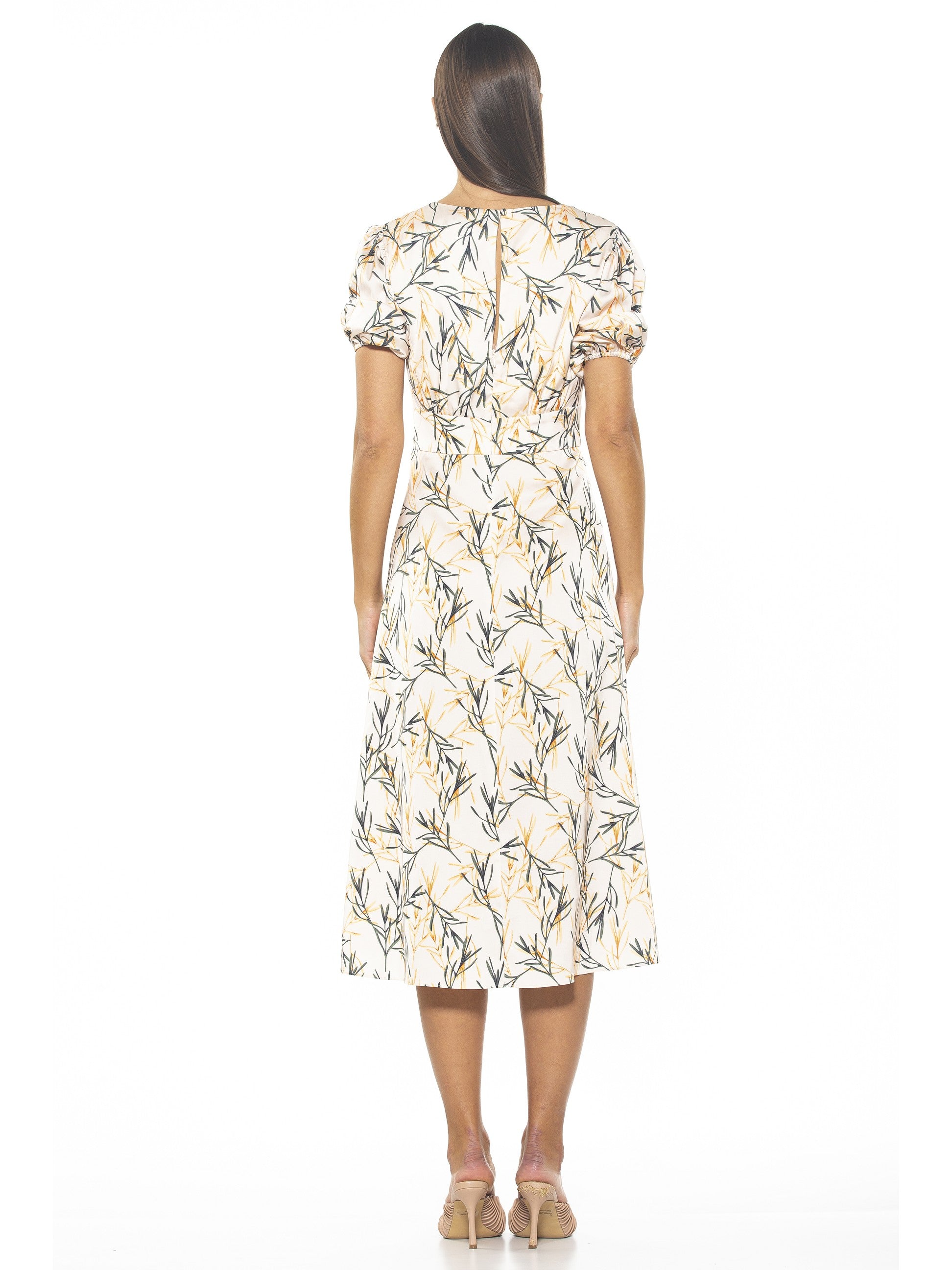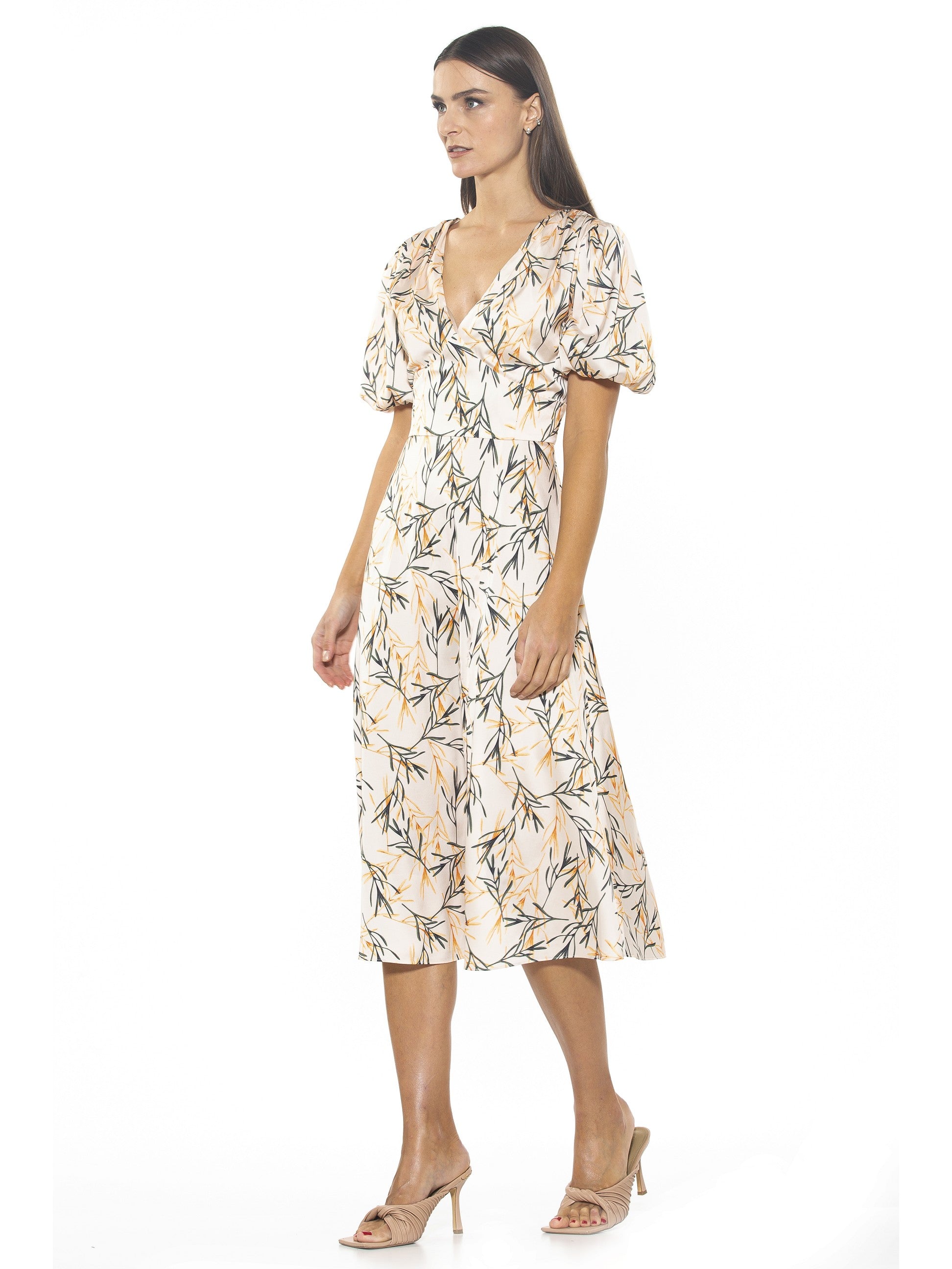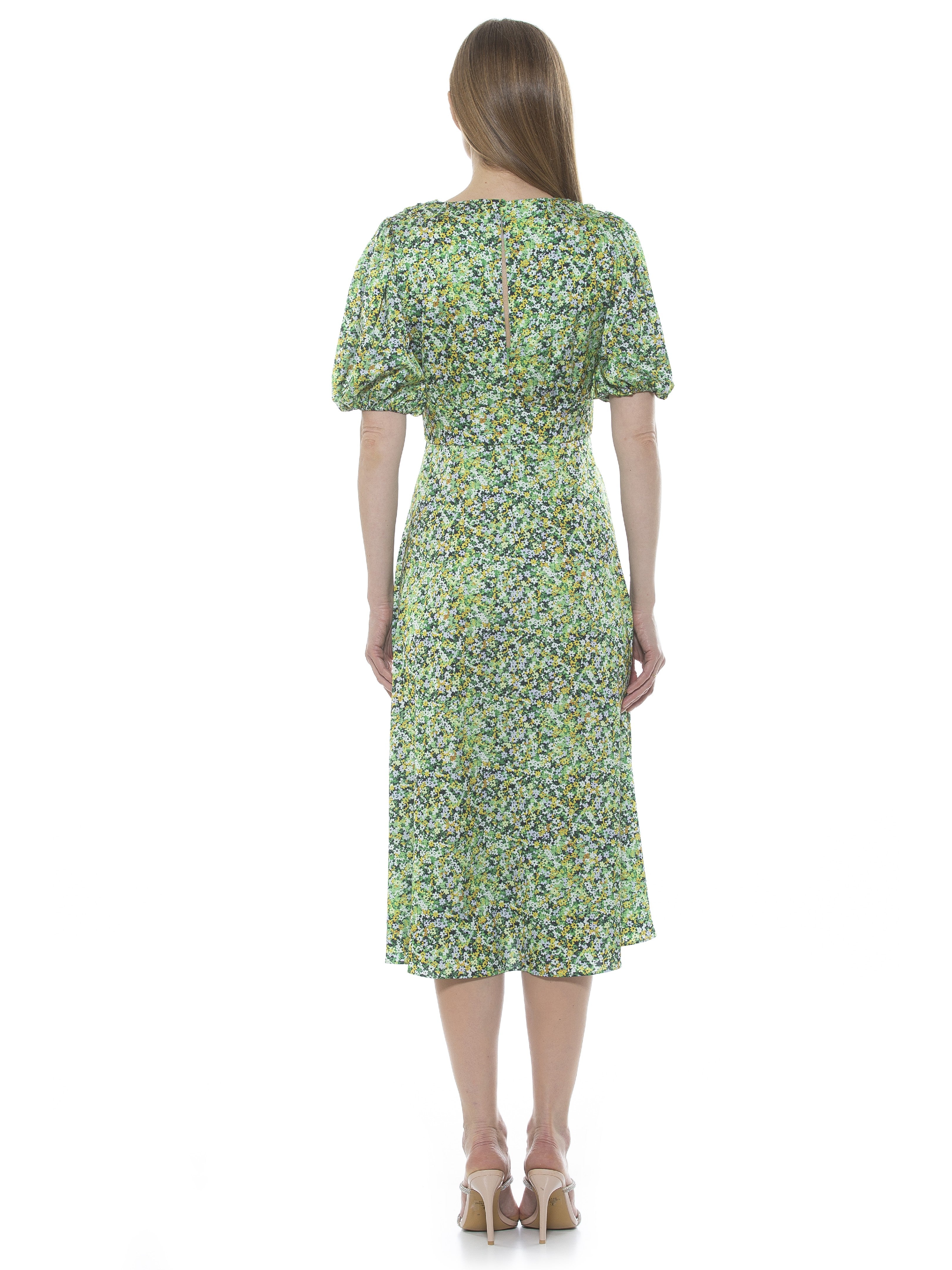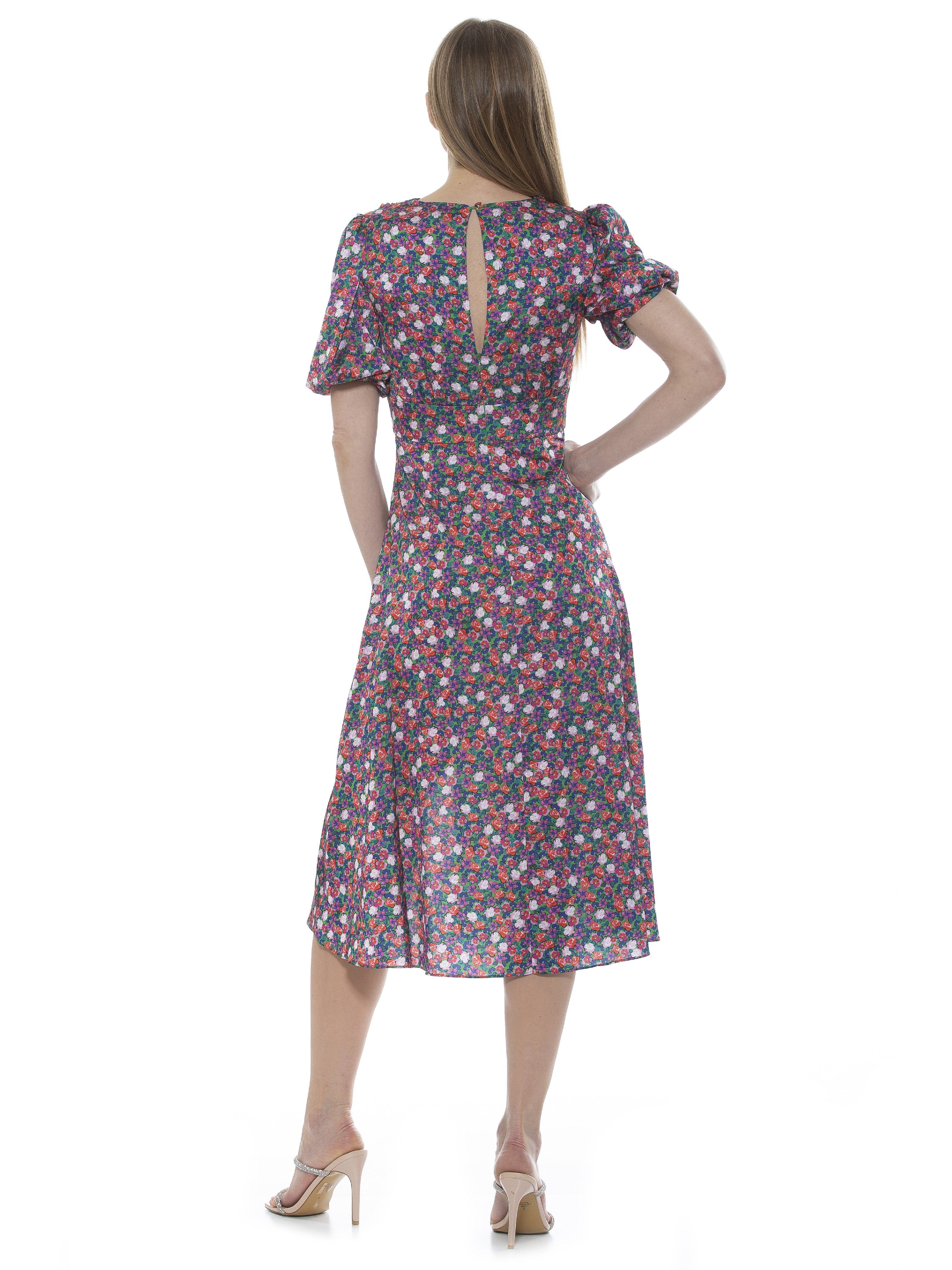 The Nola Dress is a timeless classic that will make a glamorous addition to any wardrobe. Featuring a delicate puff sleeve, a flattering V-neckline, a midi length skirt with a daring slit on the leg, and a fit and flare silhouette, it exudes modern sophistication. Perfect for any event, this dress will make a refined statement.