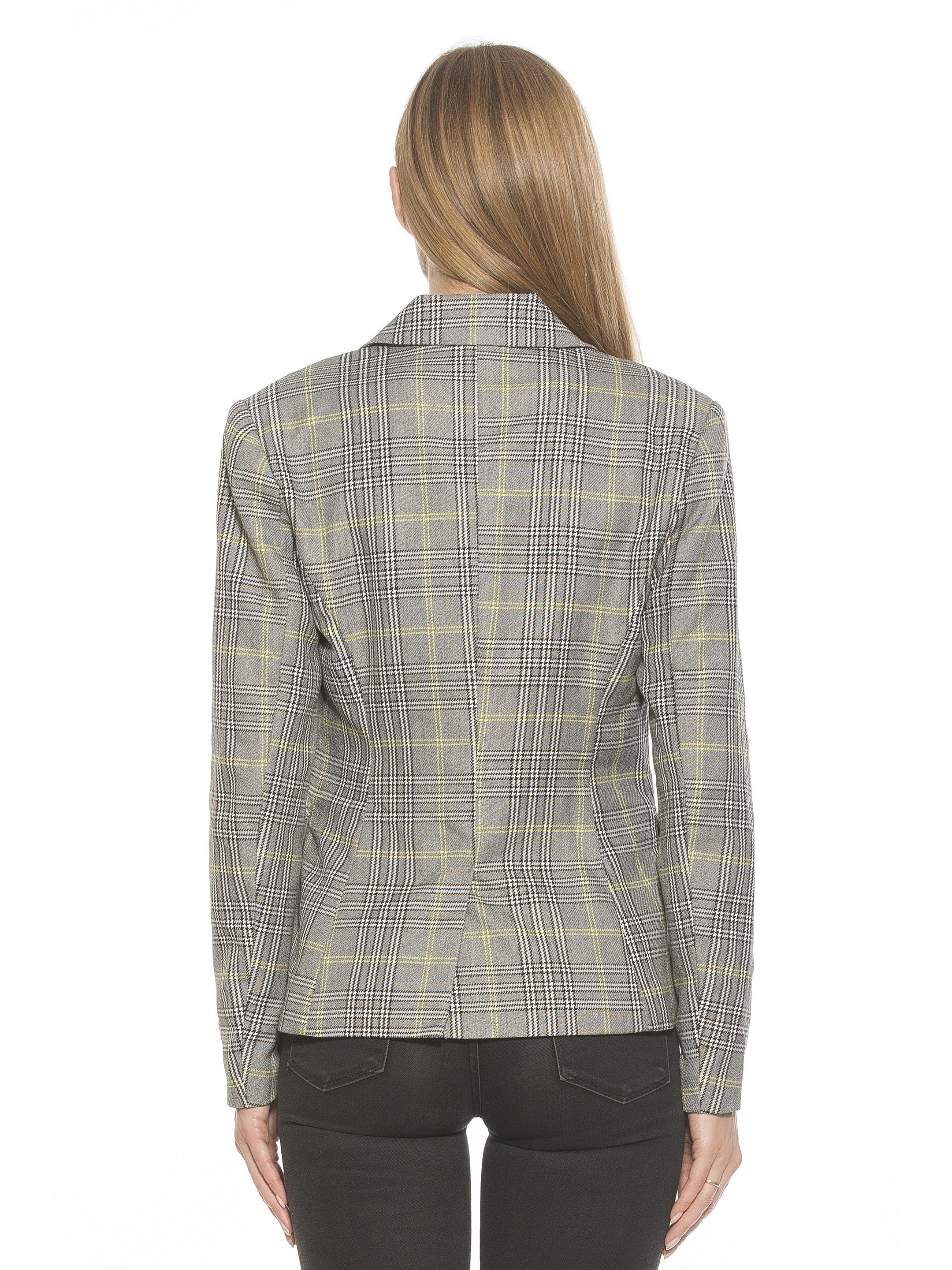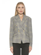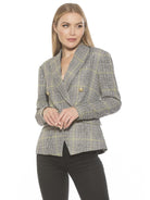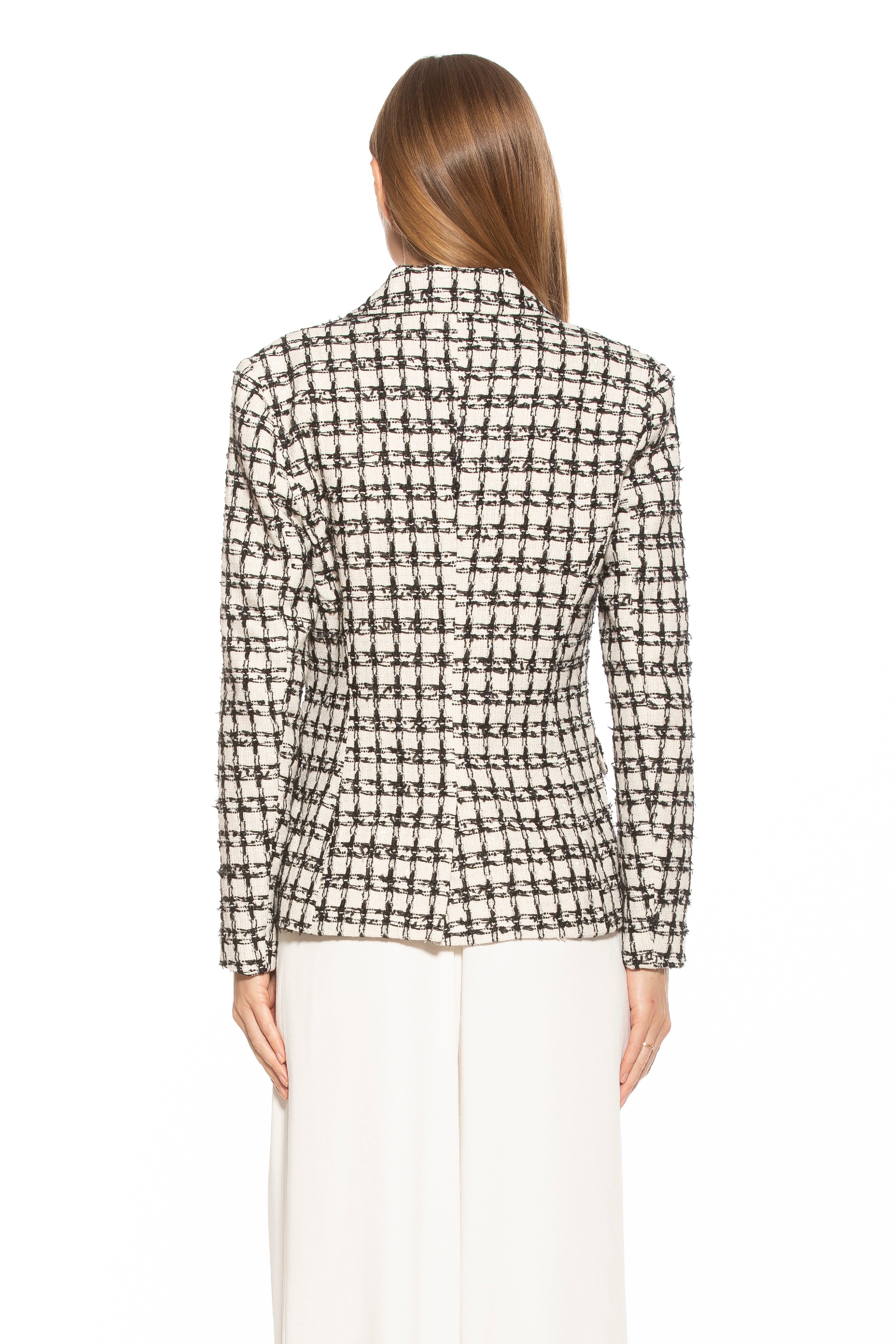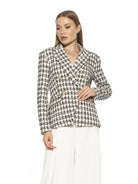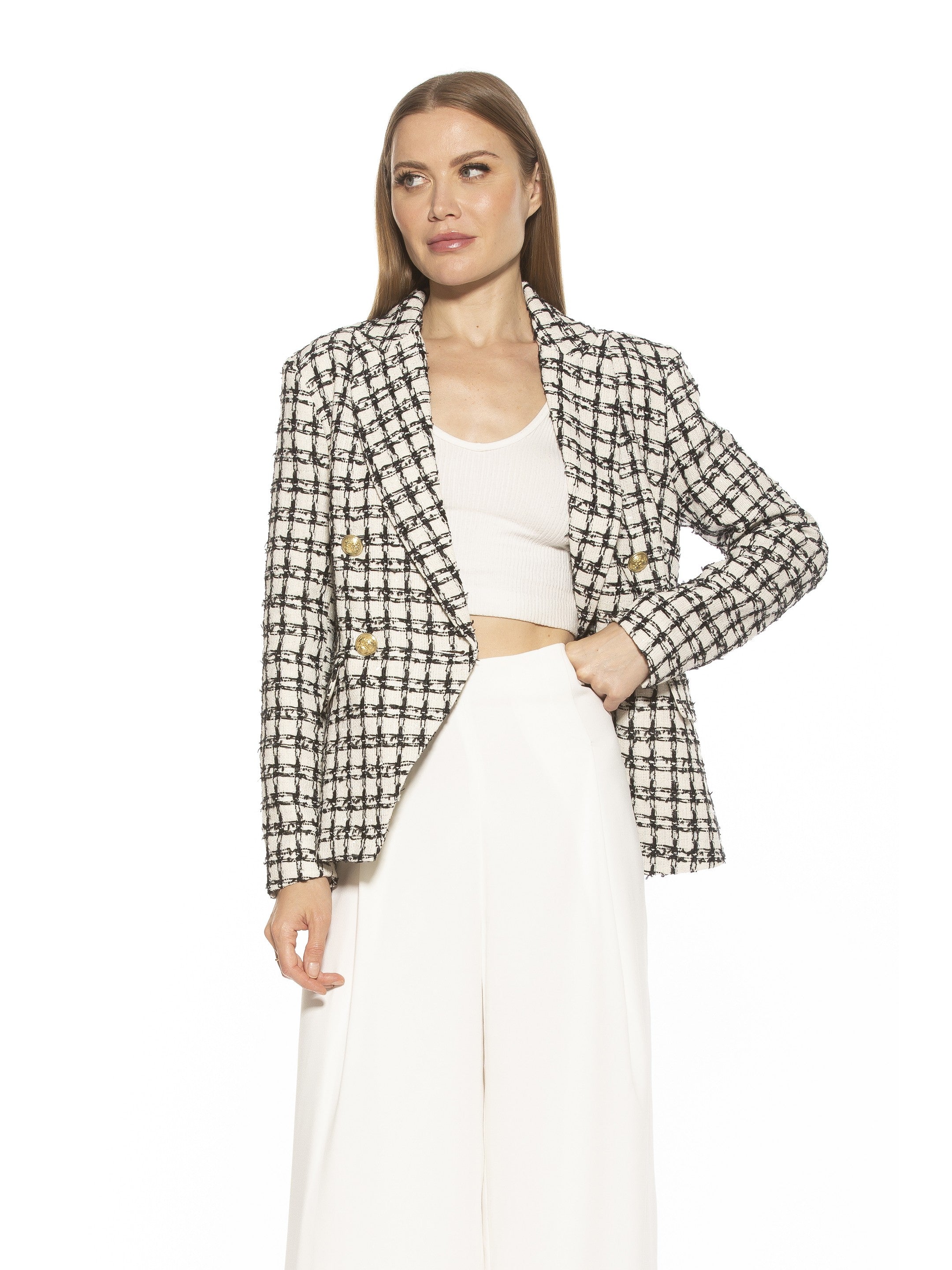 This Classic Blazer features a fitted cut with peaked lapels, long sleeves, and gold buttons. The luxurious tweed fabric elevates the look, while the double-breasted button closure provides a secure and flattering fit. A perfect piece for professional chic attire.