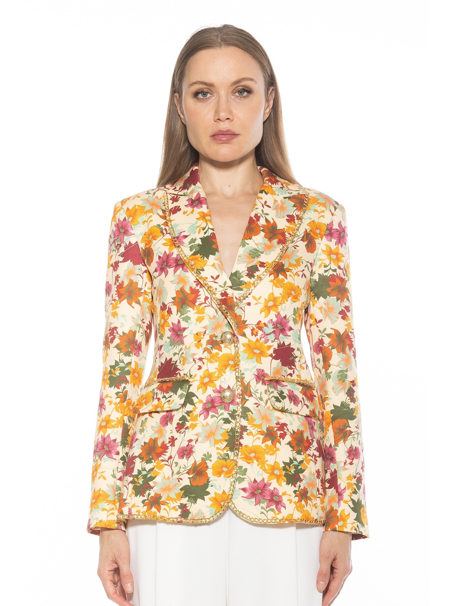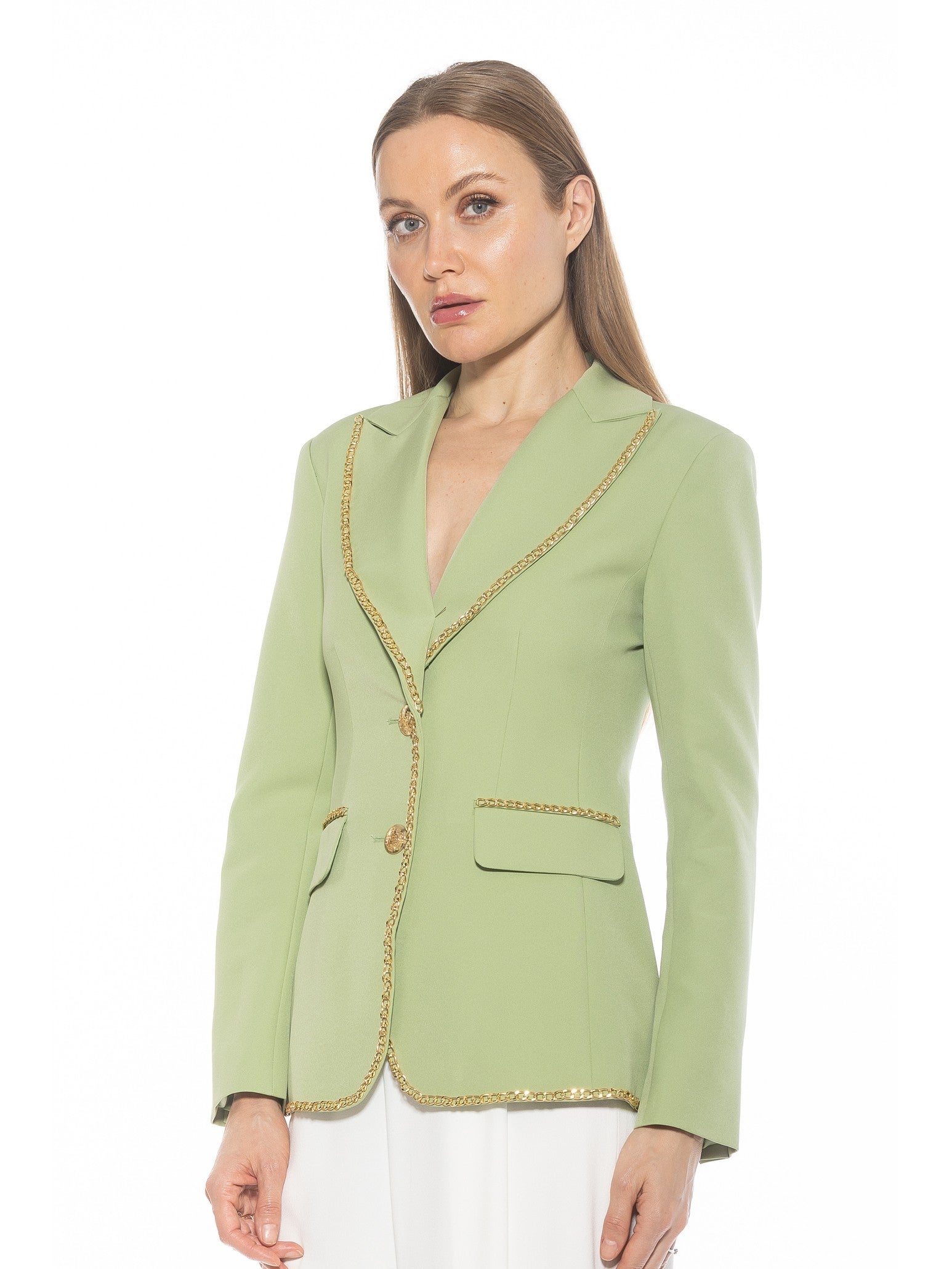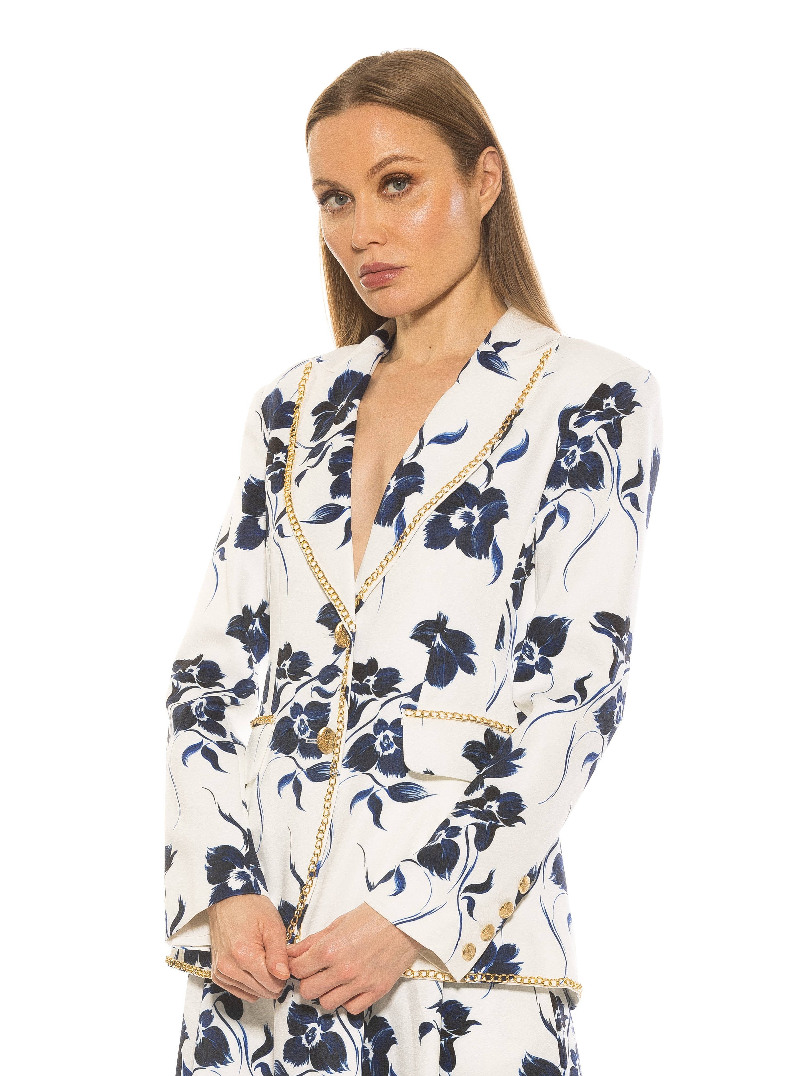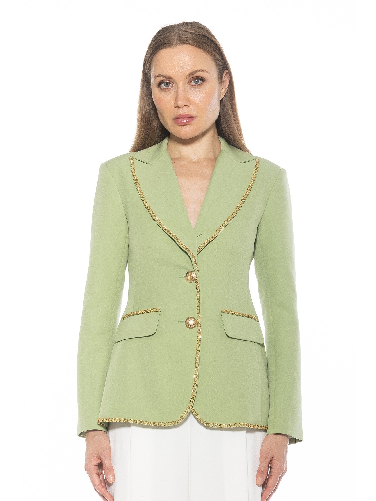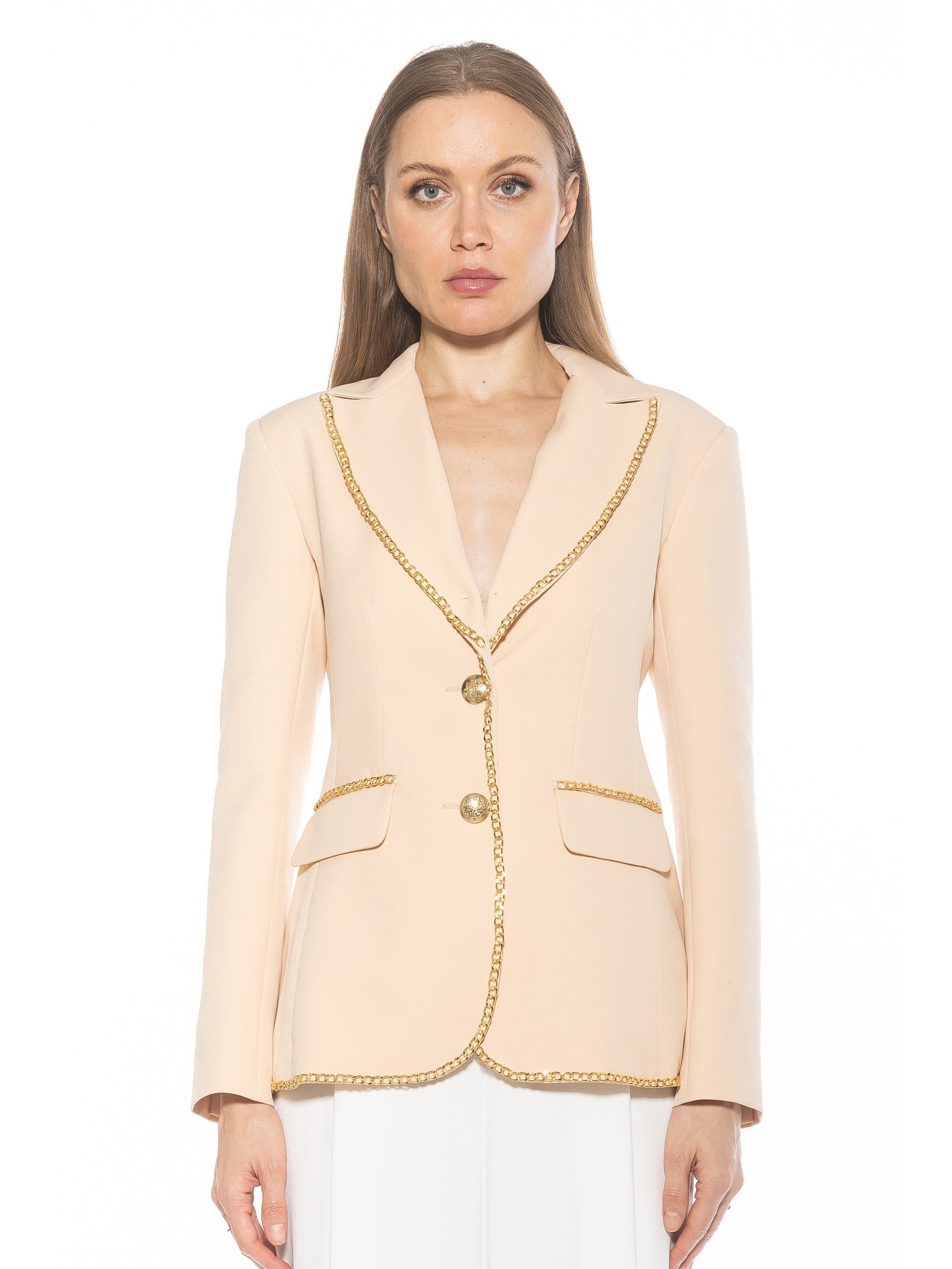 Introducing the Janet Fitted Blazer - the epitome of sophisticated style. Adorned with luxurious gold chain detailing and gold buttons, this blazer exudes elegance. The fitted silhouette and two front pockets make it a practical and chic addition to any wardrobe. Channel your inner luxury with this must-have piece.