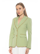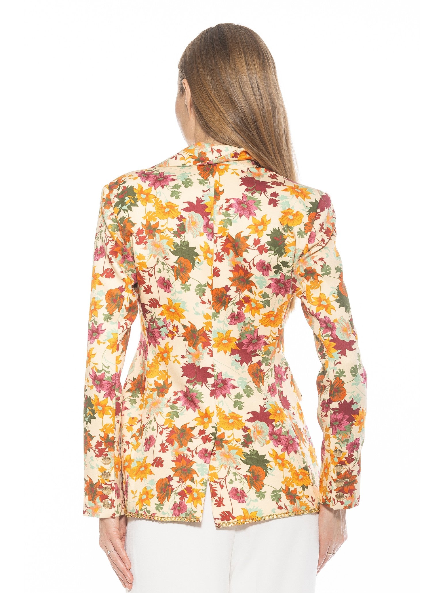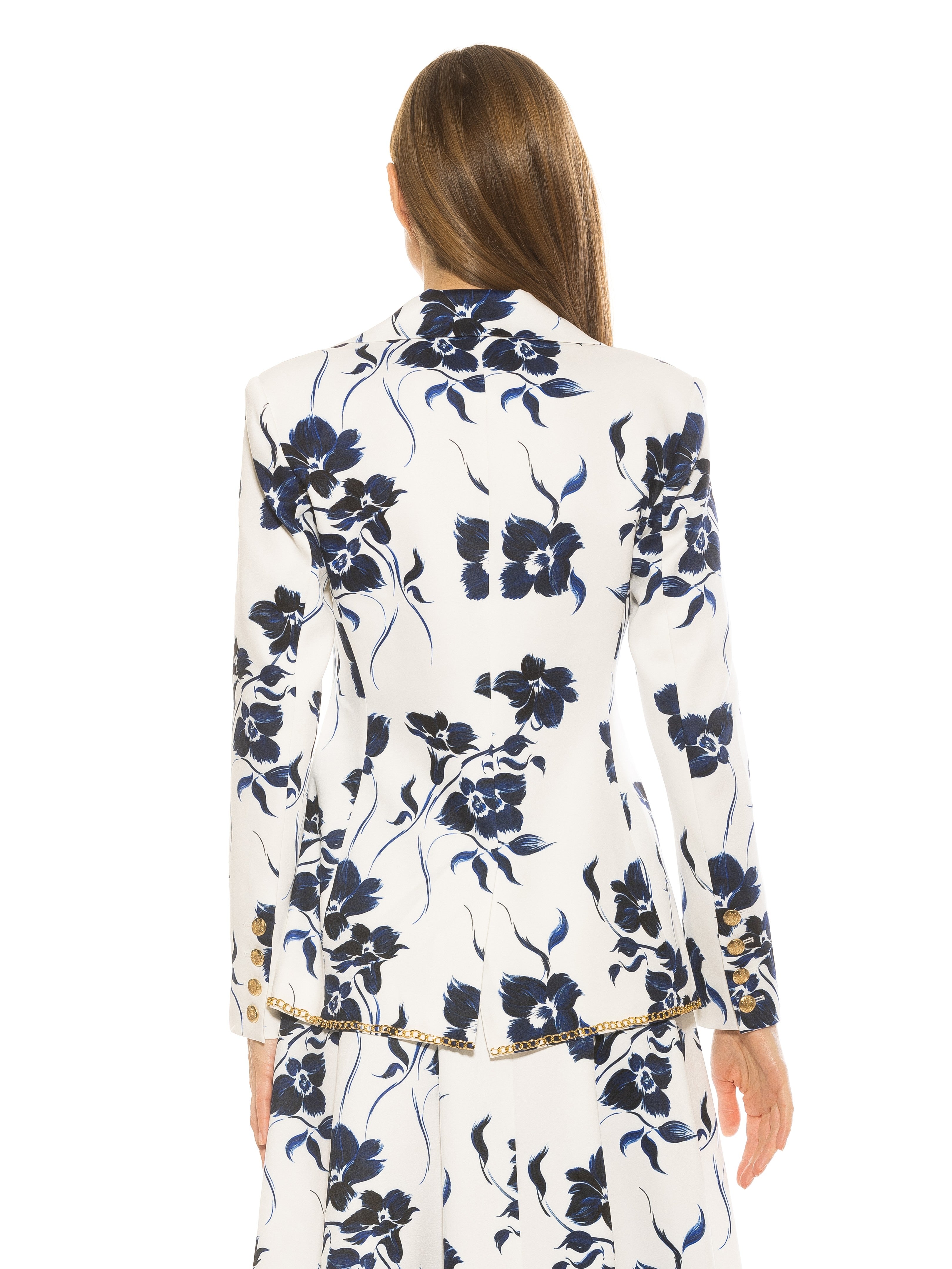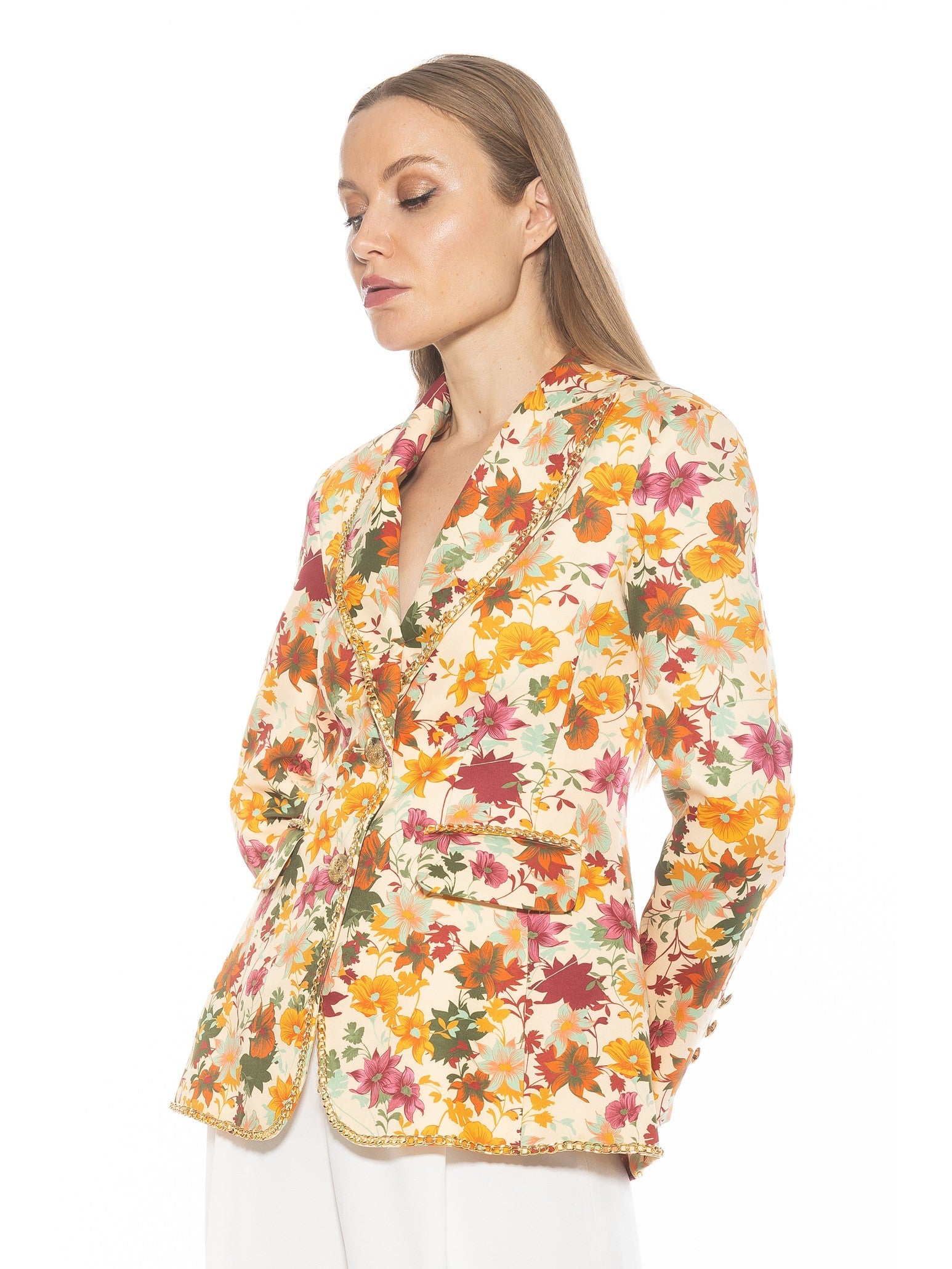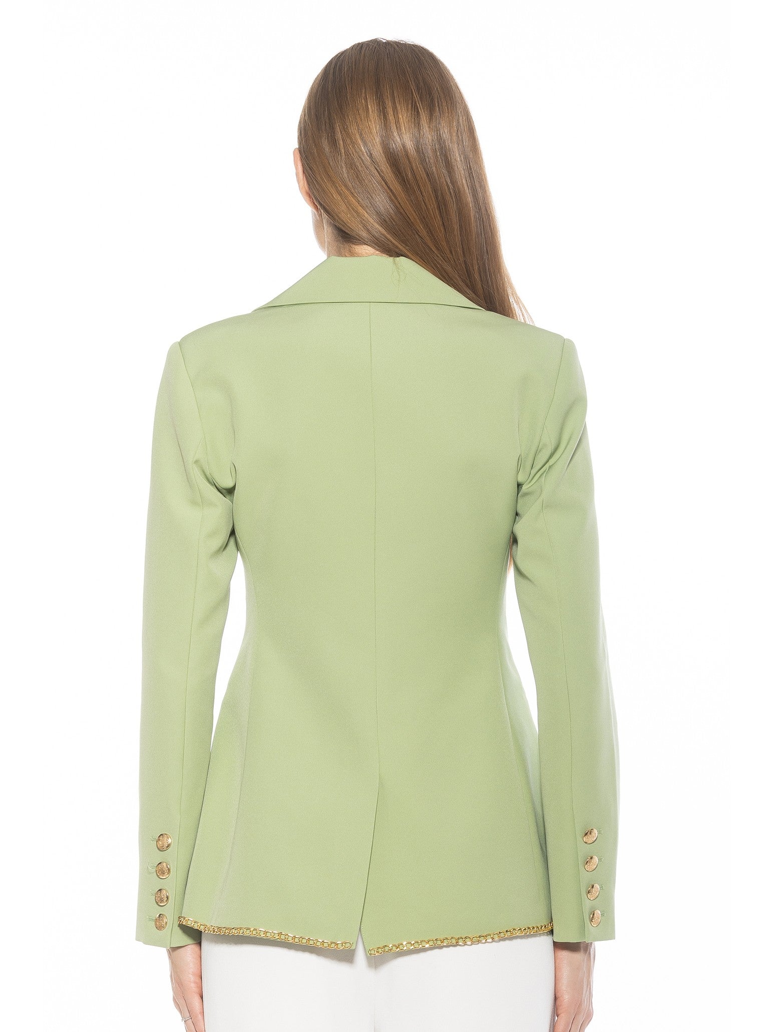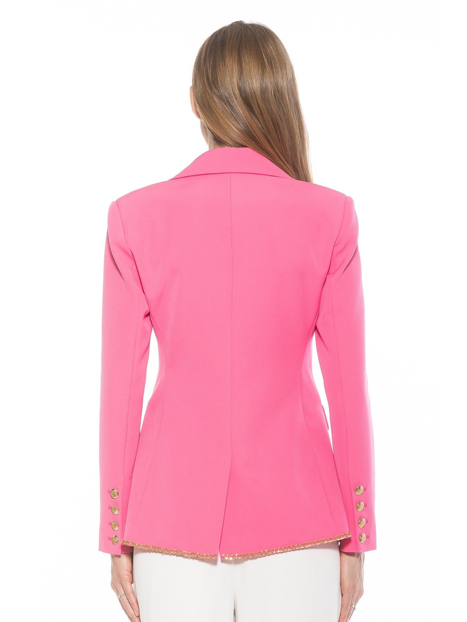 Introducing the Janet Fitted Blazer - the epitome of sophisticated style. Adorned with luxurious gold chain detailing and gold buttons, this blazer exudes elegance. The fitted silhouette and two front pockets make it a practical and chic addition to any wardrobe. Channel your inner luxury with this must-have piece.
