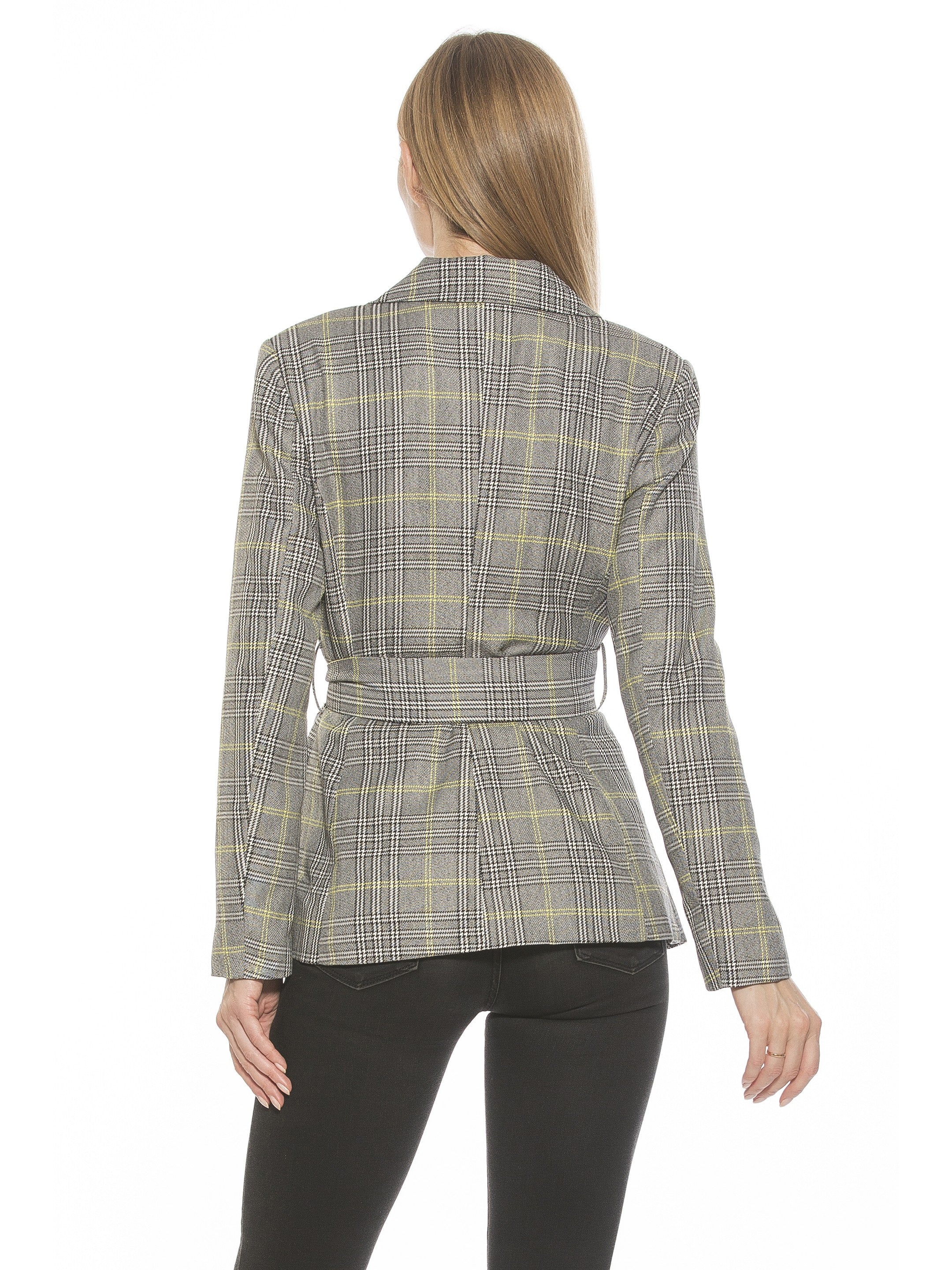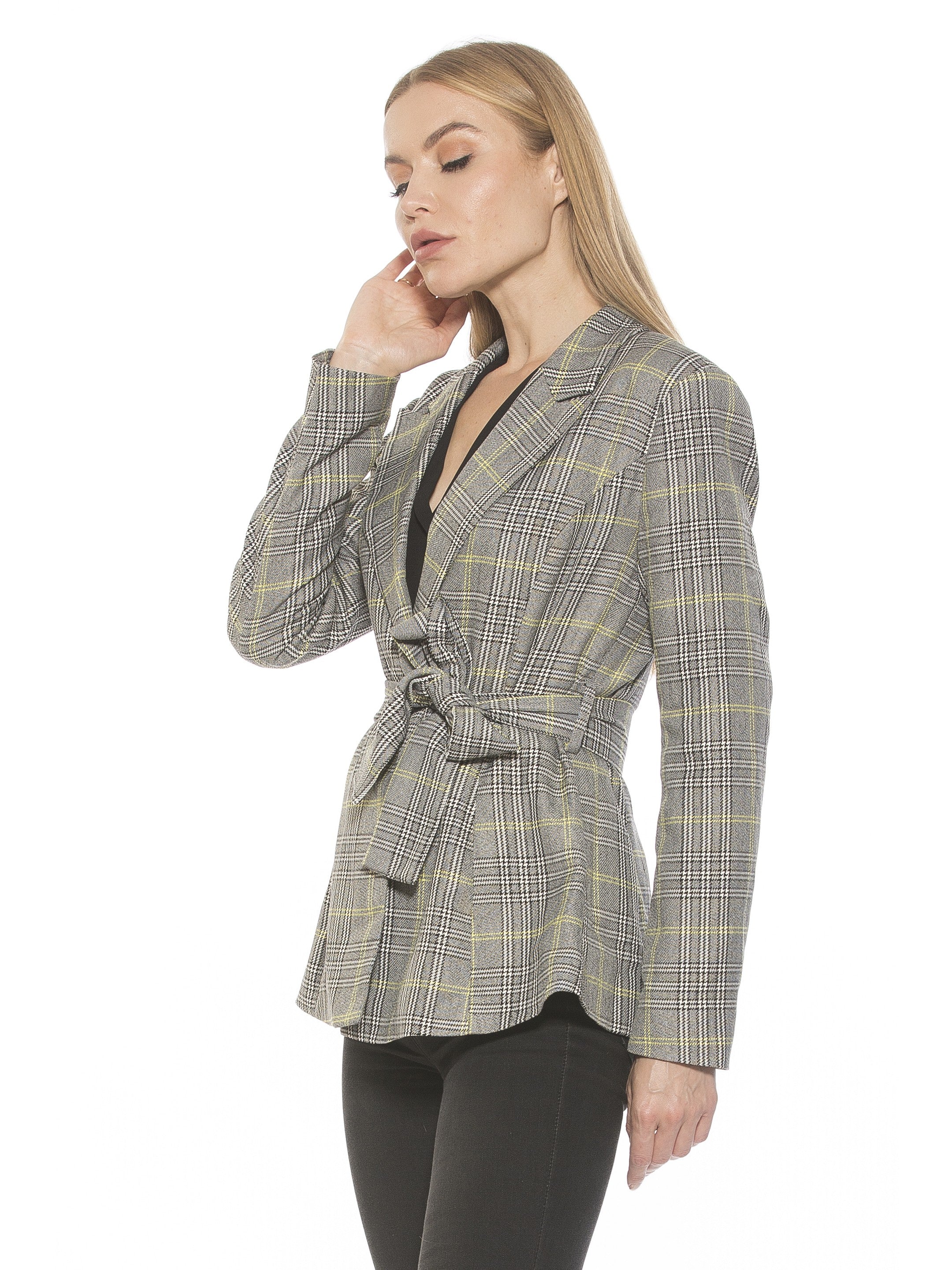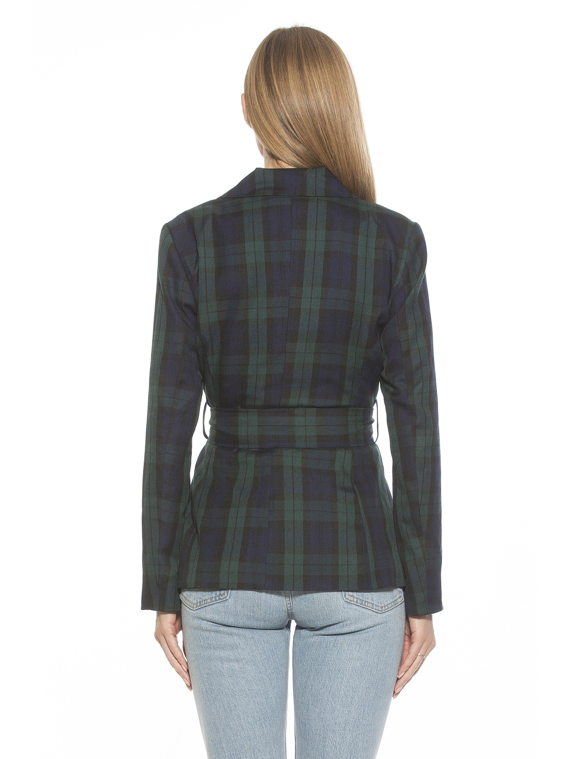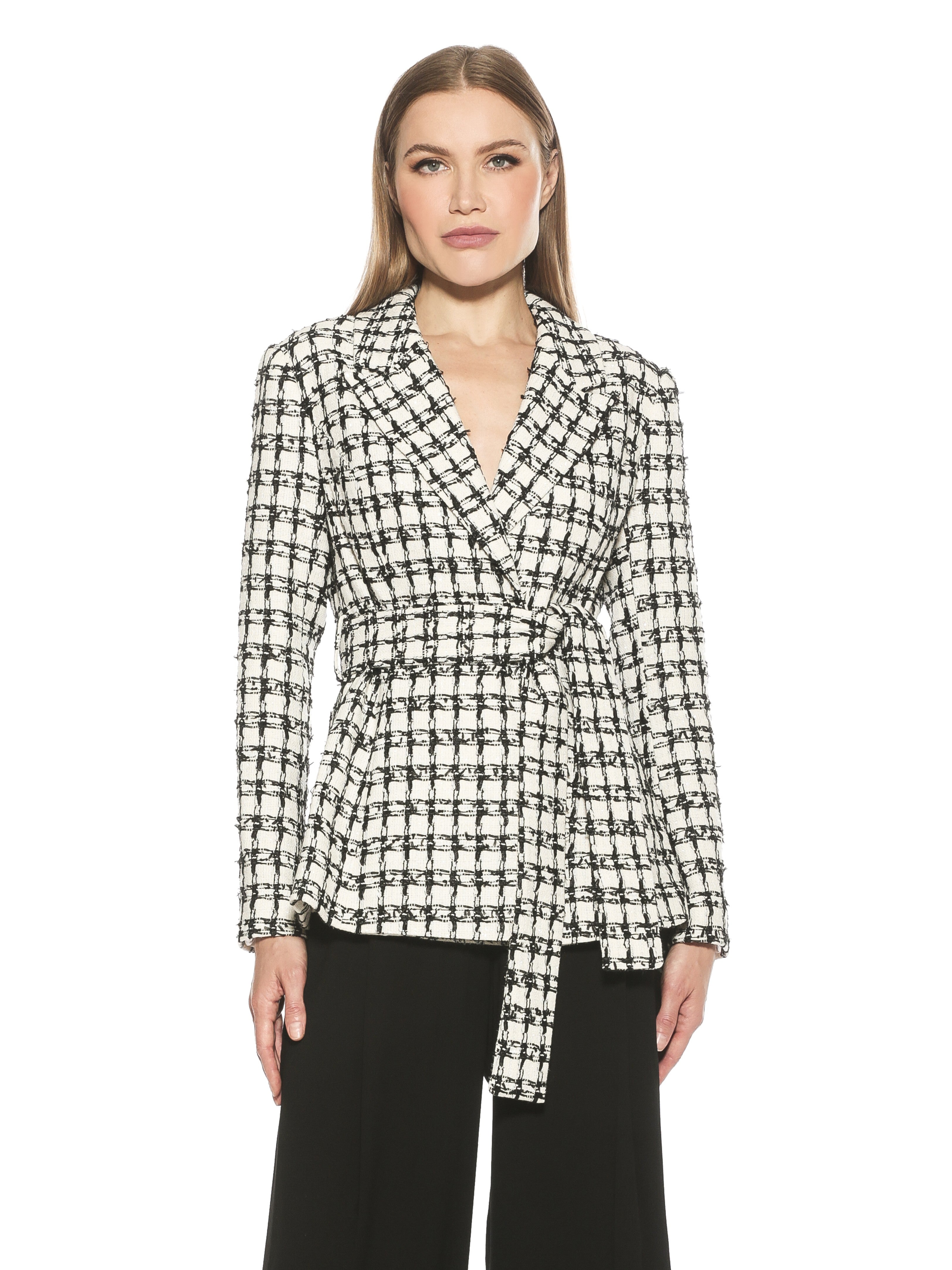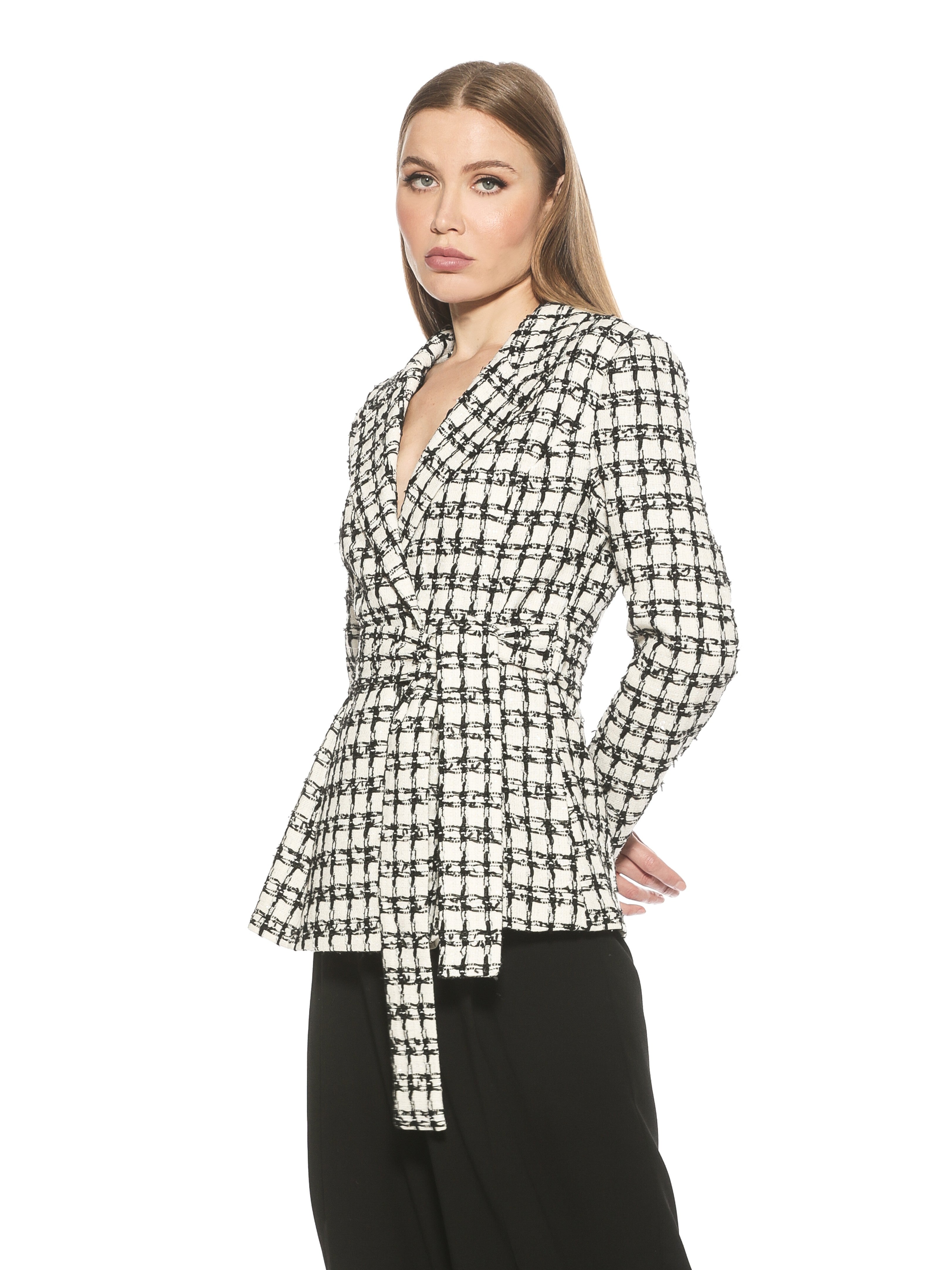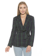 Introducing the Olya Blazer. This fitted blazer is designed to provide a fashionable yet professional look. Featuring a tie waist to ensure a perfect fit, it is finished with a unique plaid pattern to make a lasting impression. Make the Olya Blazer your go-to for a sharp, sophisticated style.