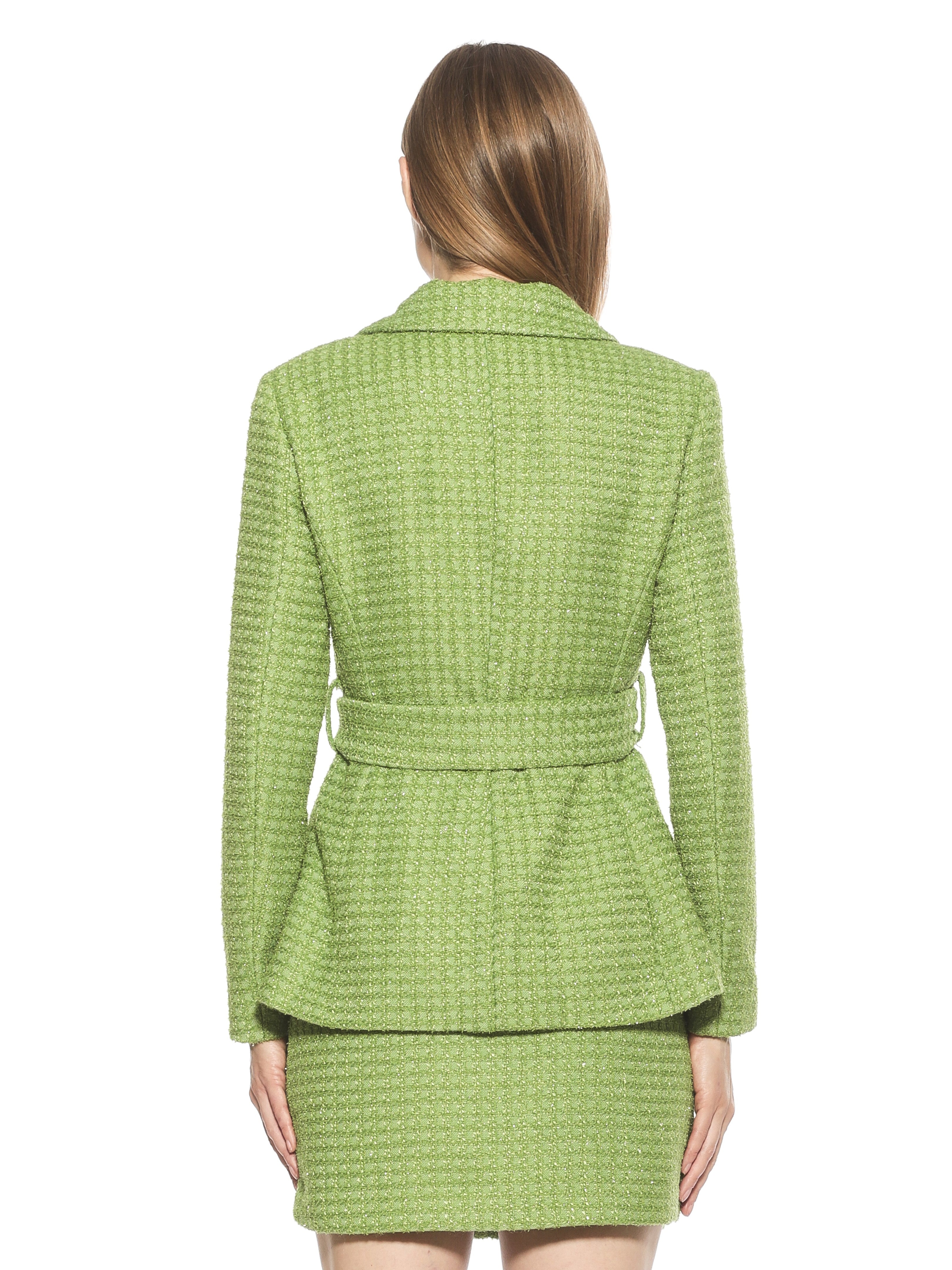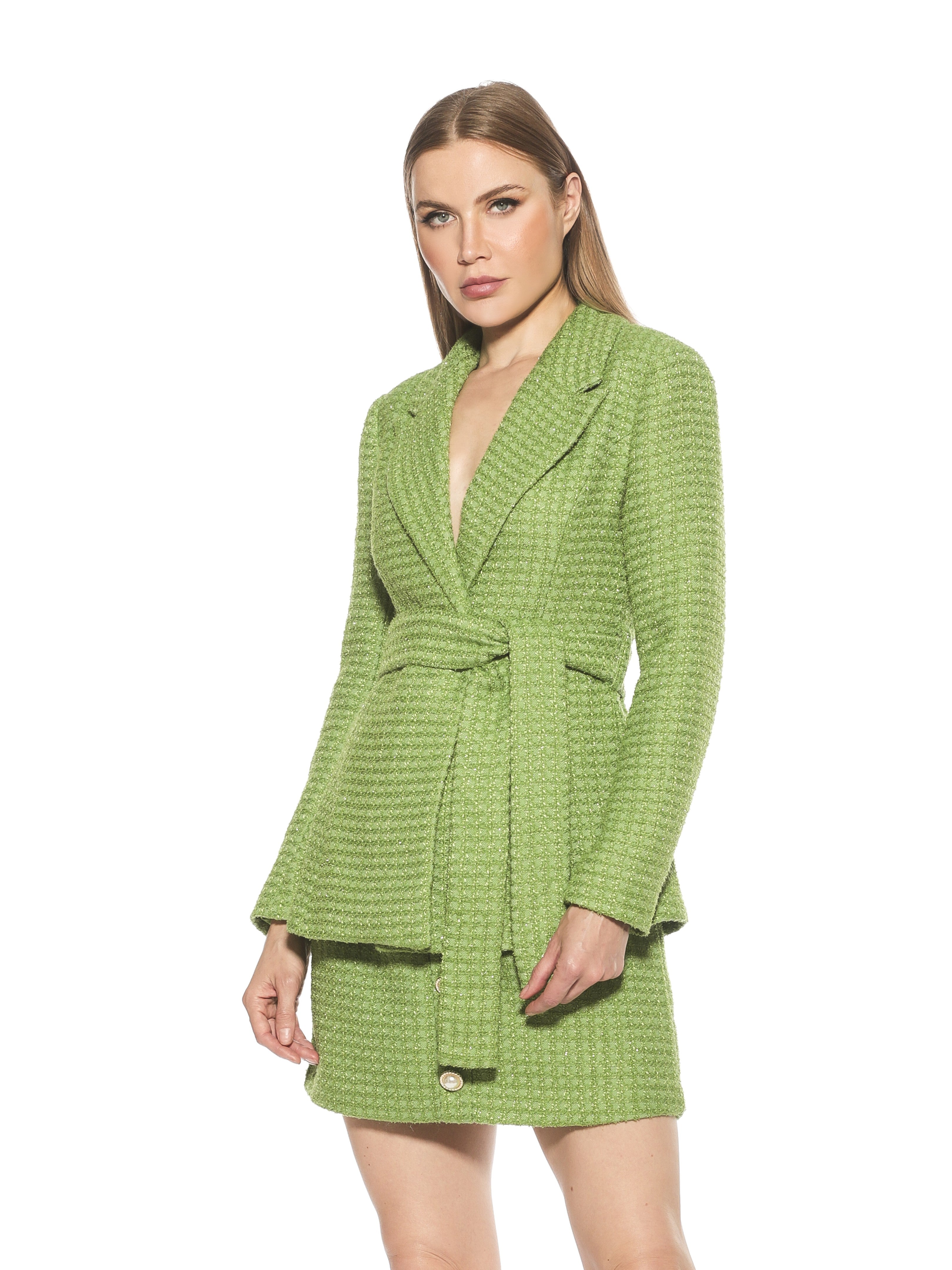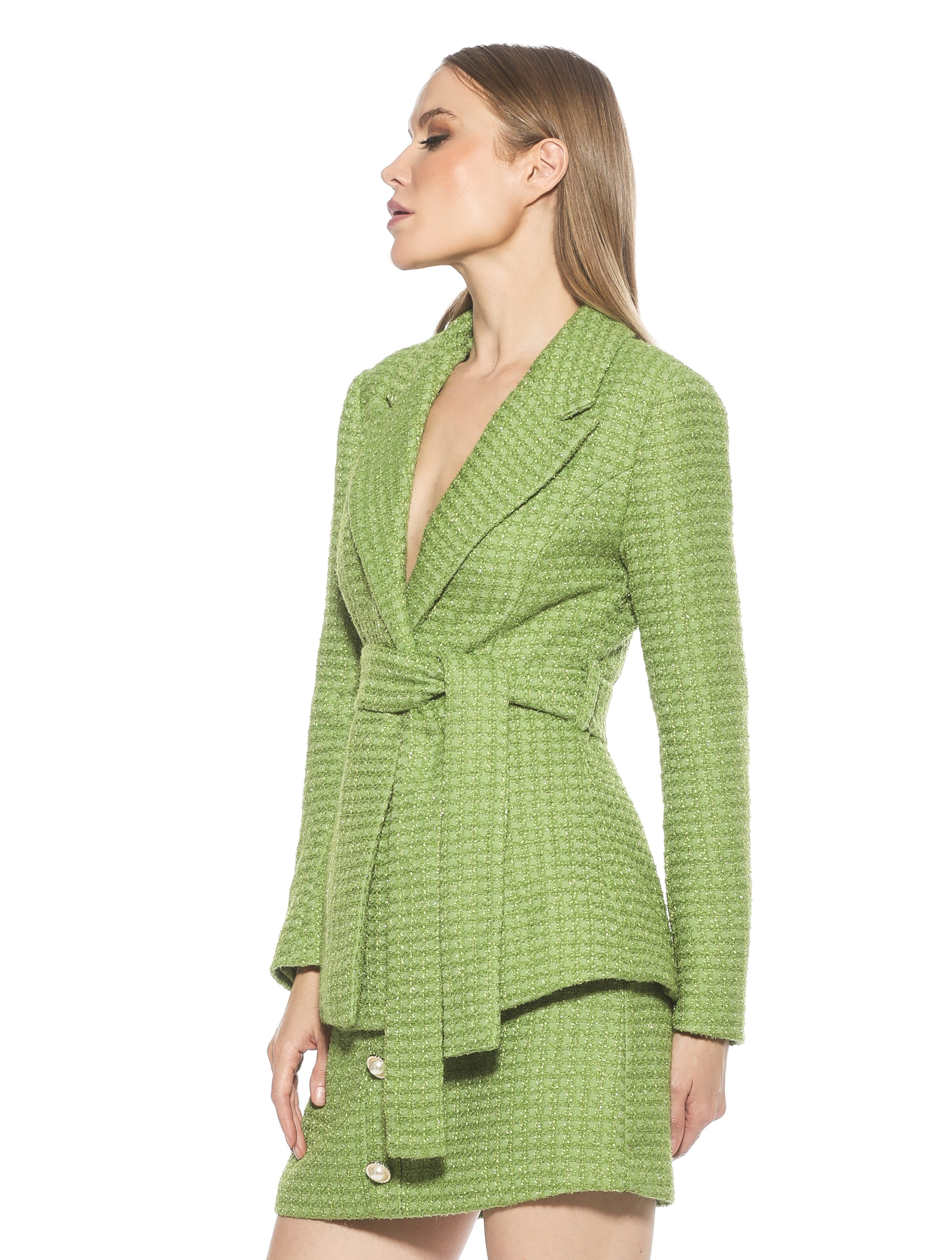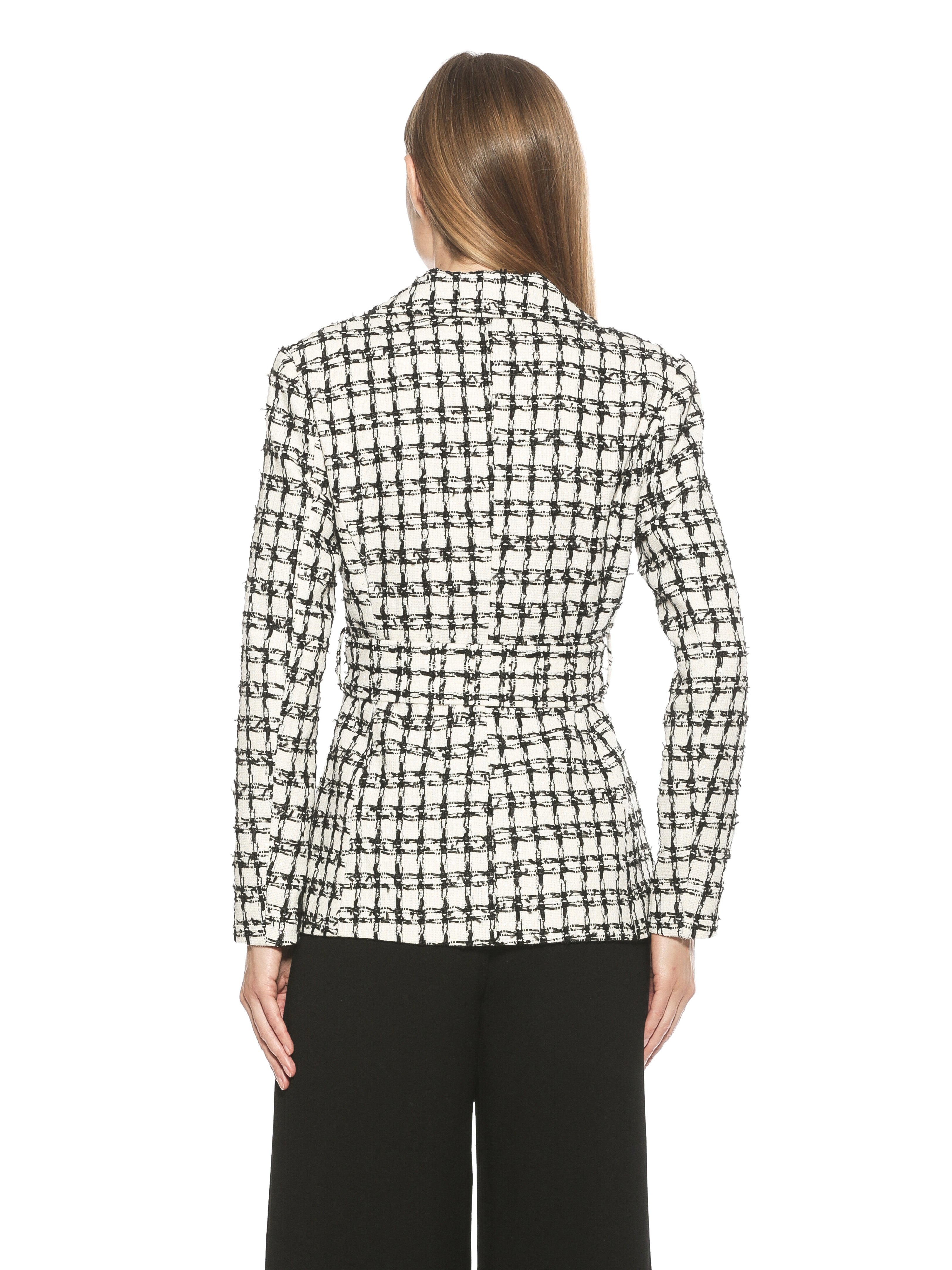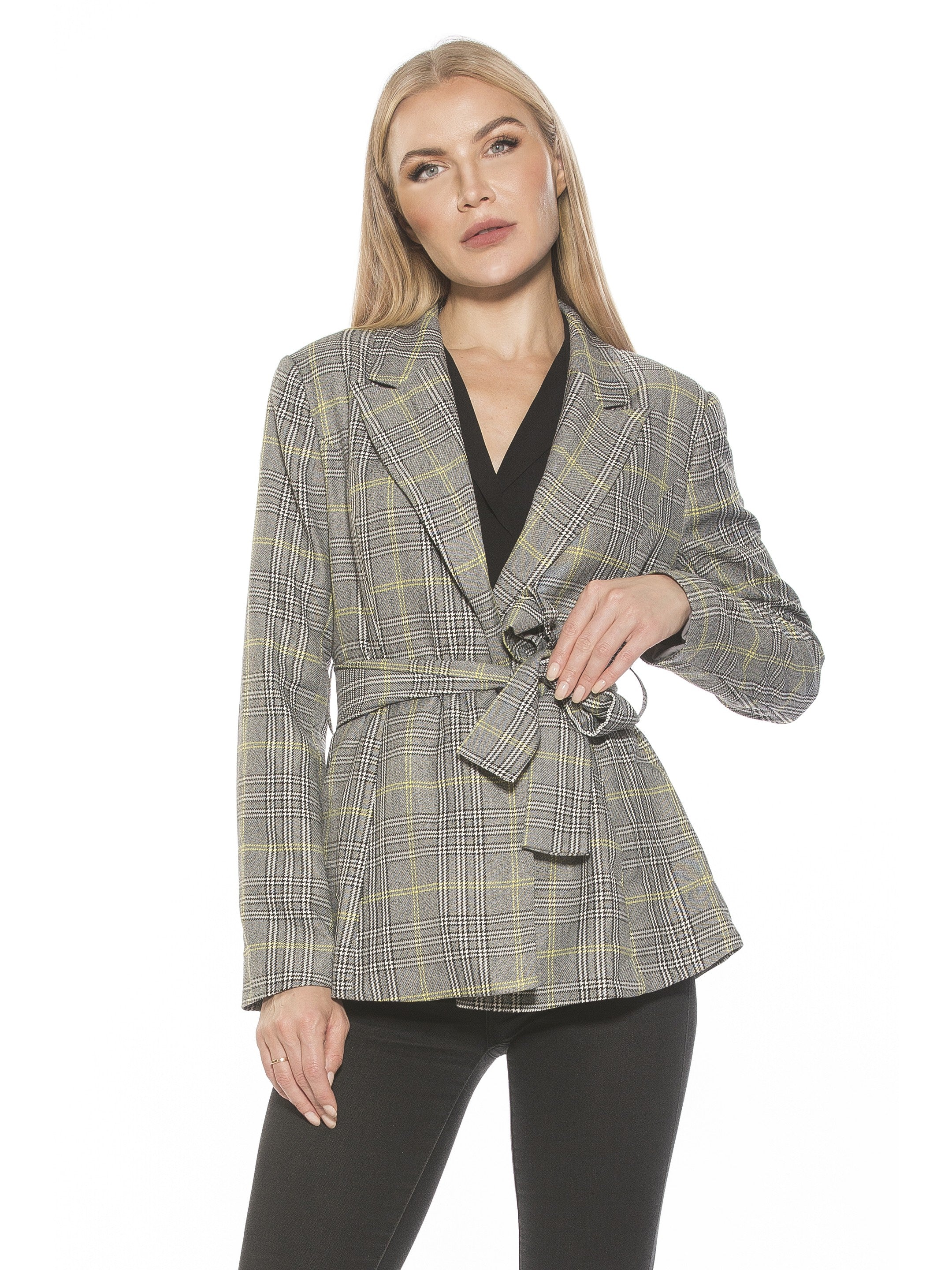 Introducing the Olya Blazer. This fitted blazer is designed to provide a fashionable yet professional look. Featuring a tie waist to ensure a perfect fit, it is finished with a unique plaid pattern to make a lasting impression. Make the Olya Blazer your go-to for a sharp, sophisticated style.