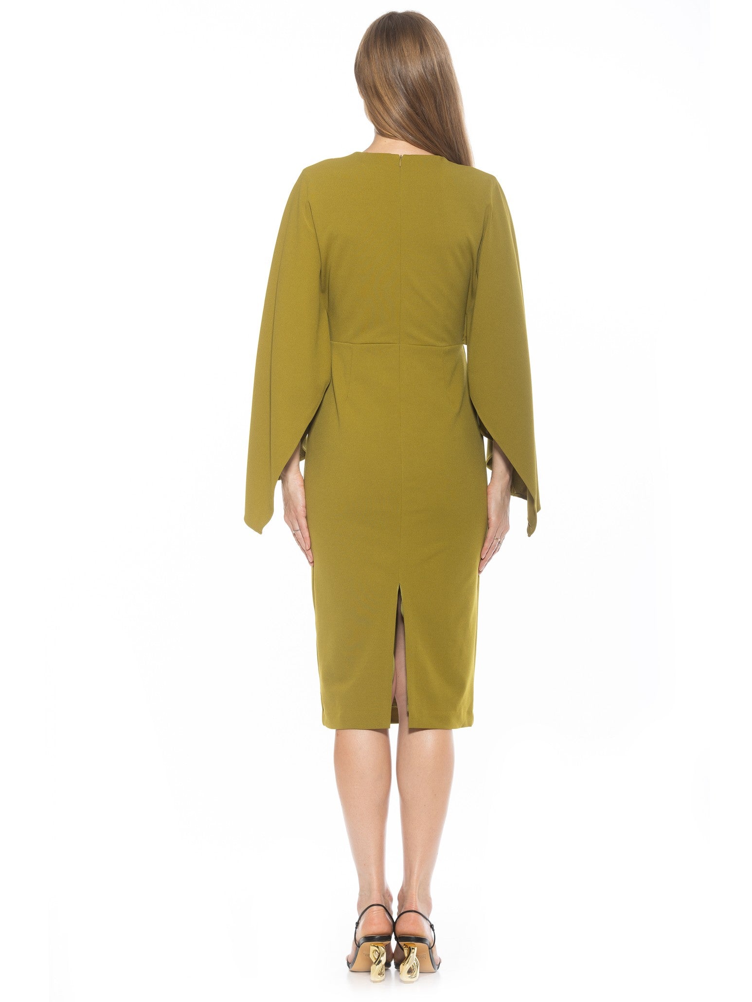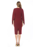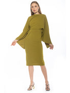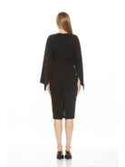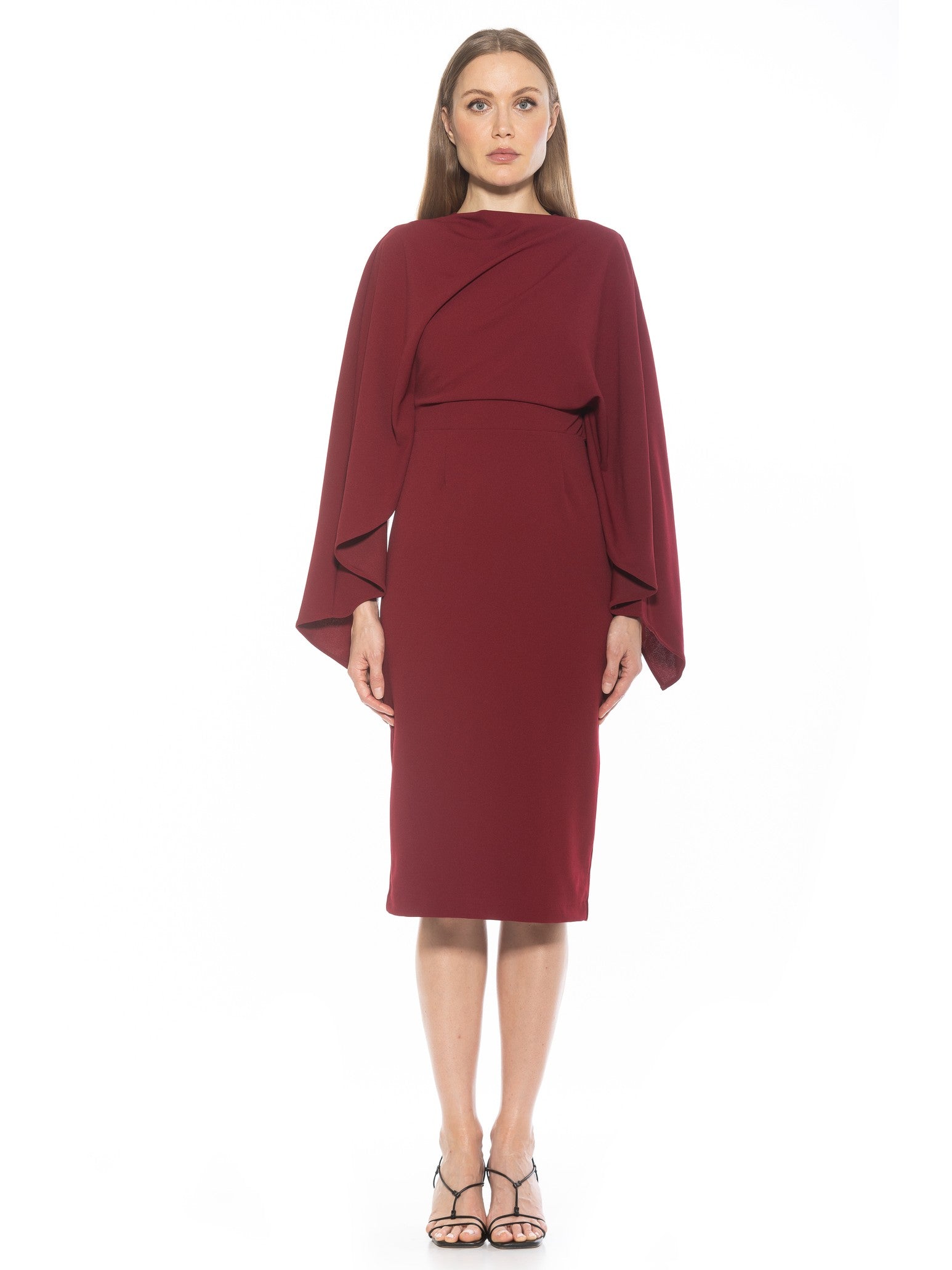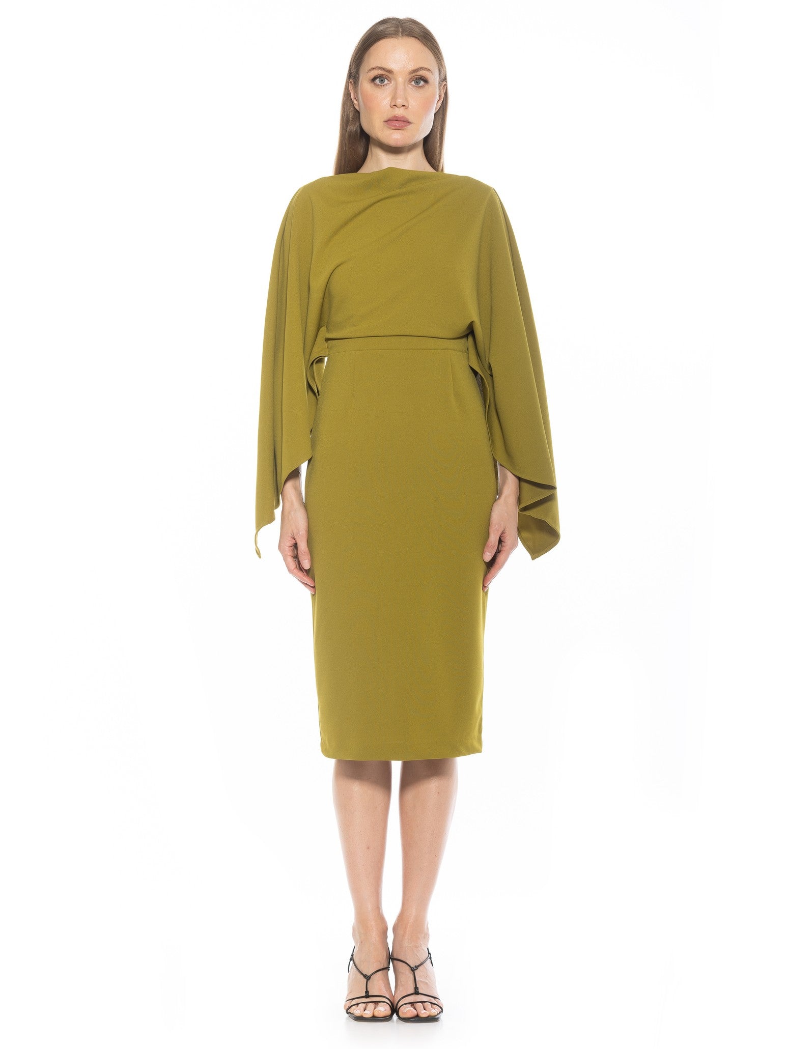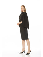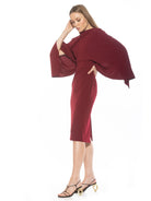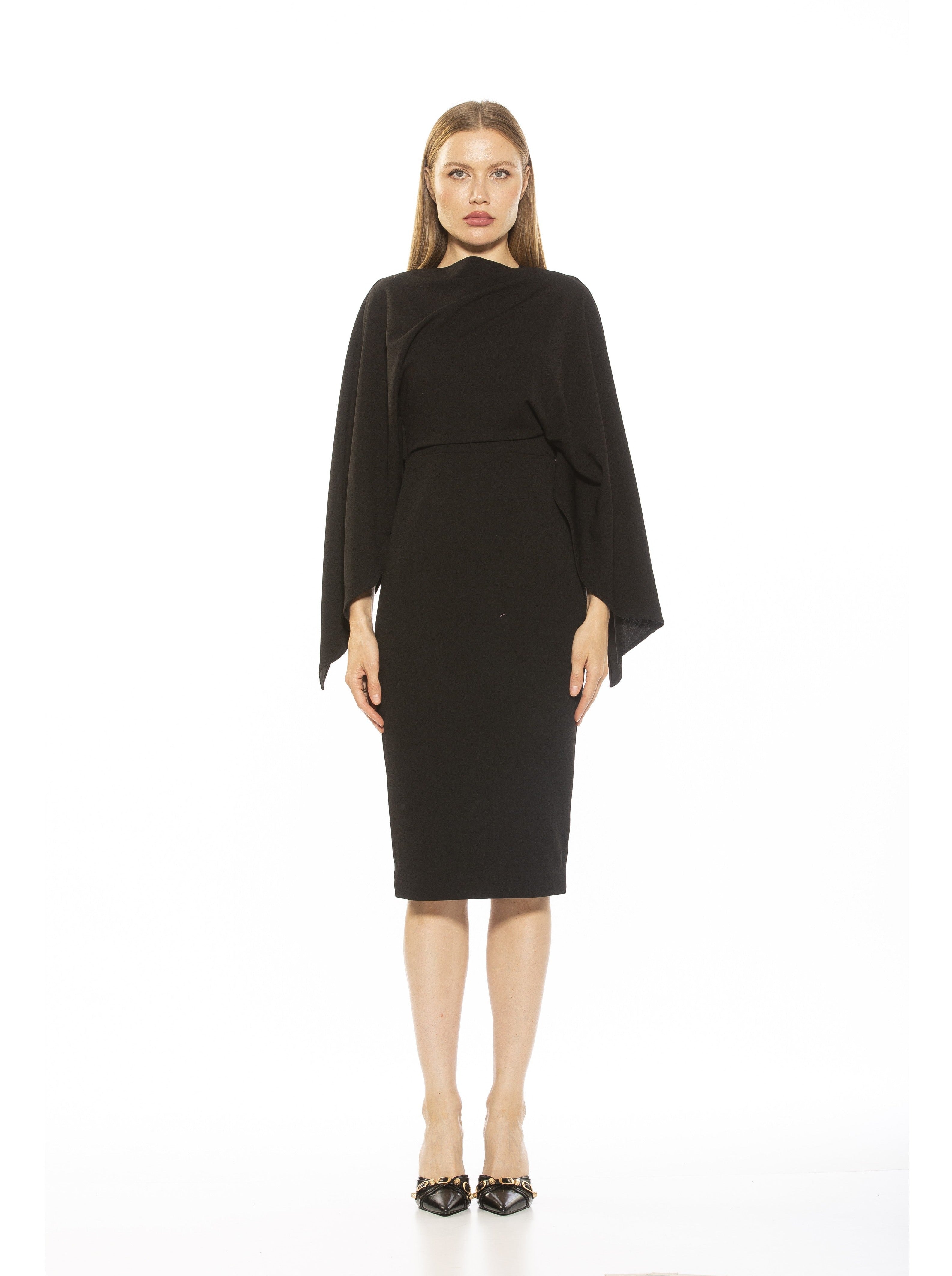 Indulge in luxury with our Vida dress. The high neck adds a touch of sophistication while the draped cape sleeve creates an elegant silhouette. The sheath design and midi length offer a stylish and flattering look. Elevate any occasion with this must-have piece.