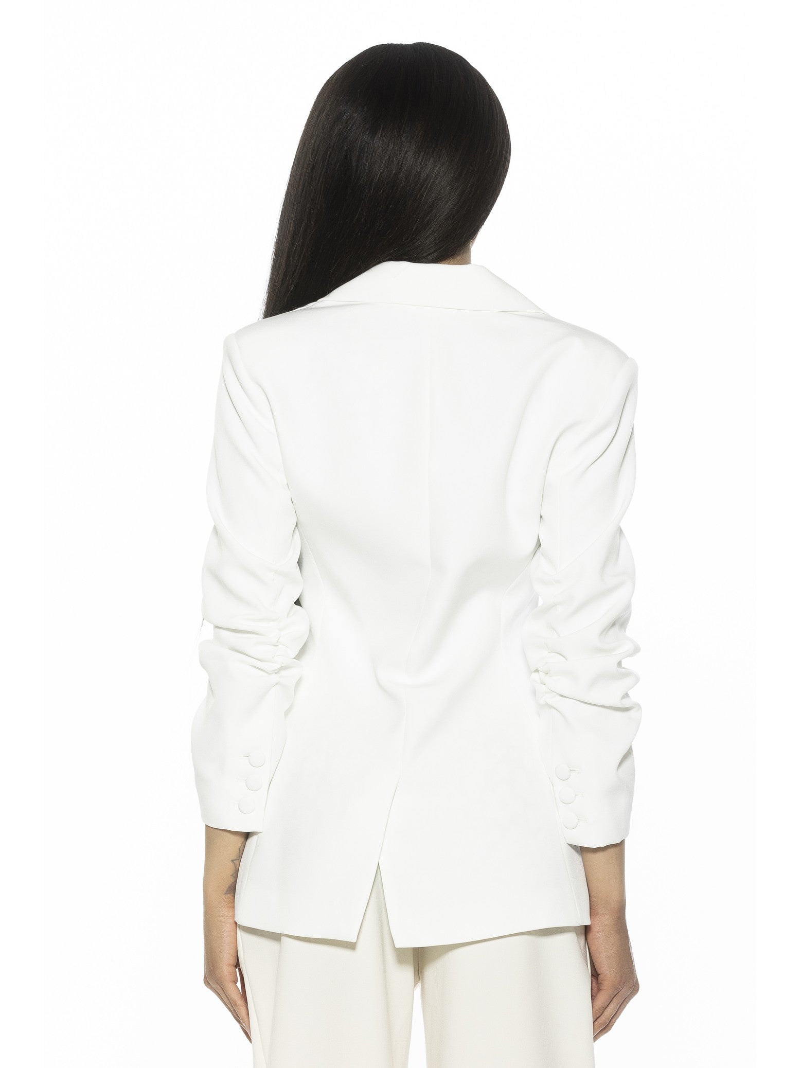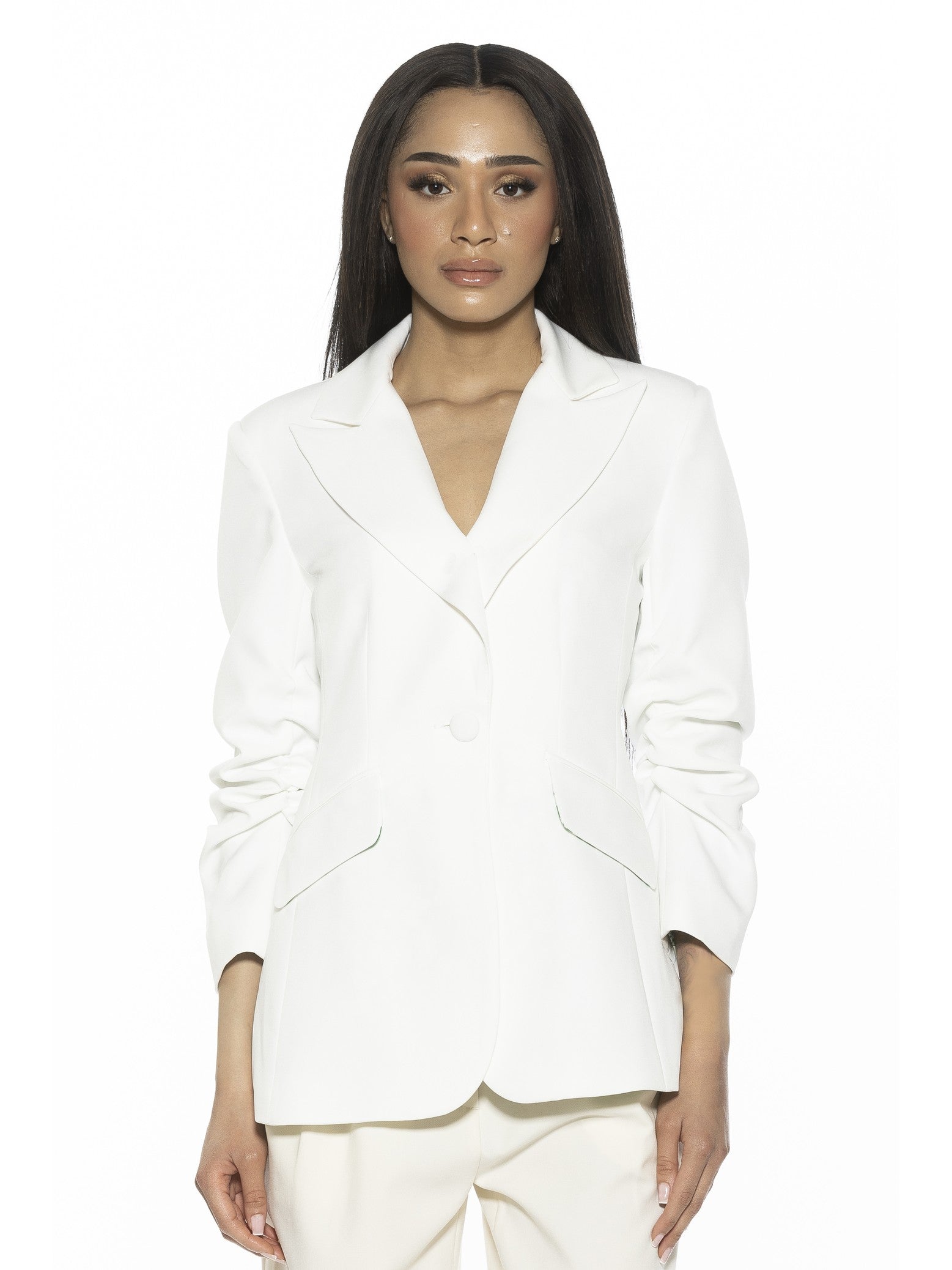 Introducing the Tau Blazer with elegant scrunched sleeve detail. This sophisticated blazer adds a touch of refinement to any outfit. The unique scrunched sleeves exude an air of exclusivity and luxury. Elevate your style with this must-have piece.