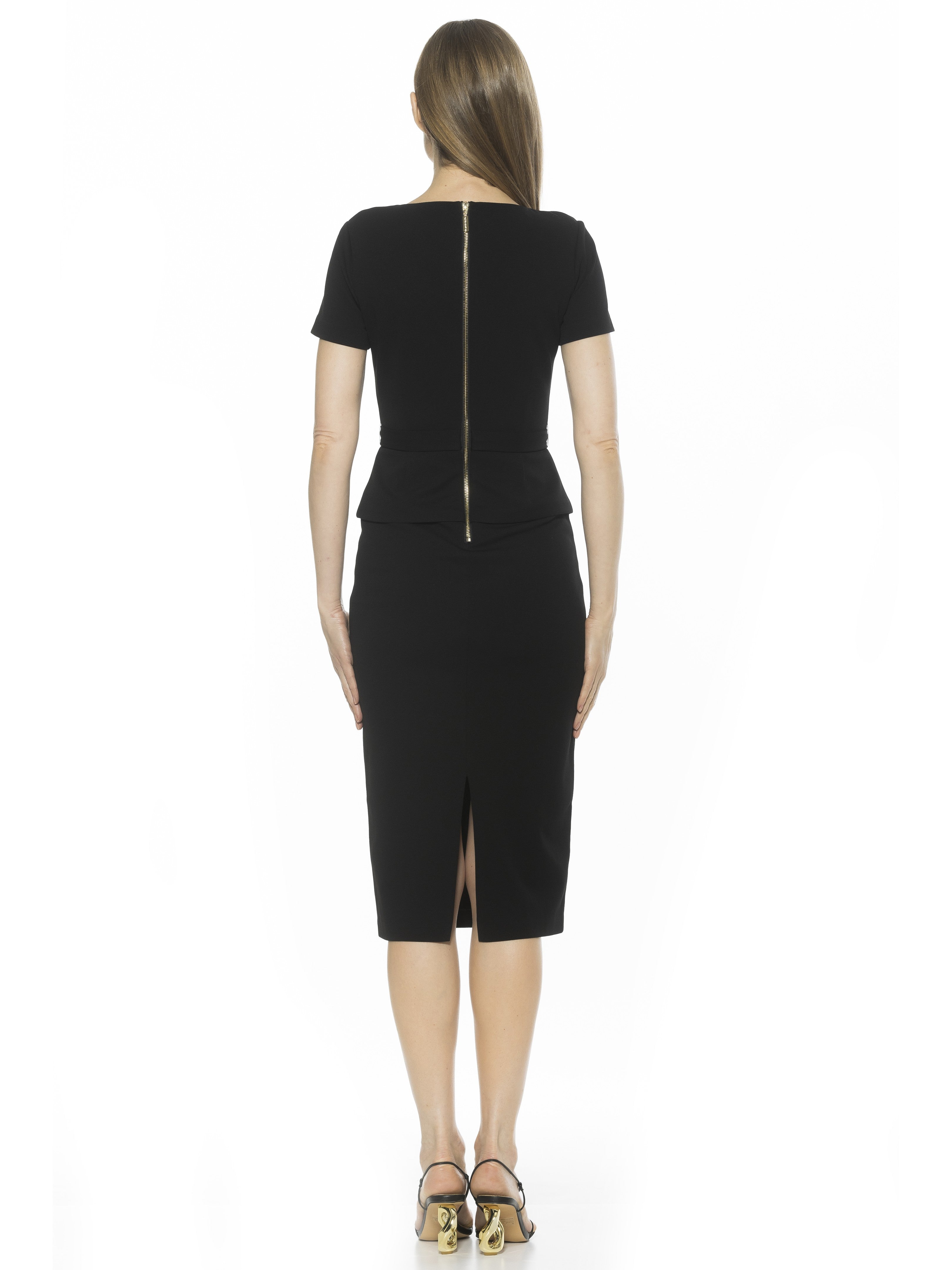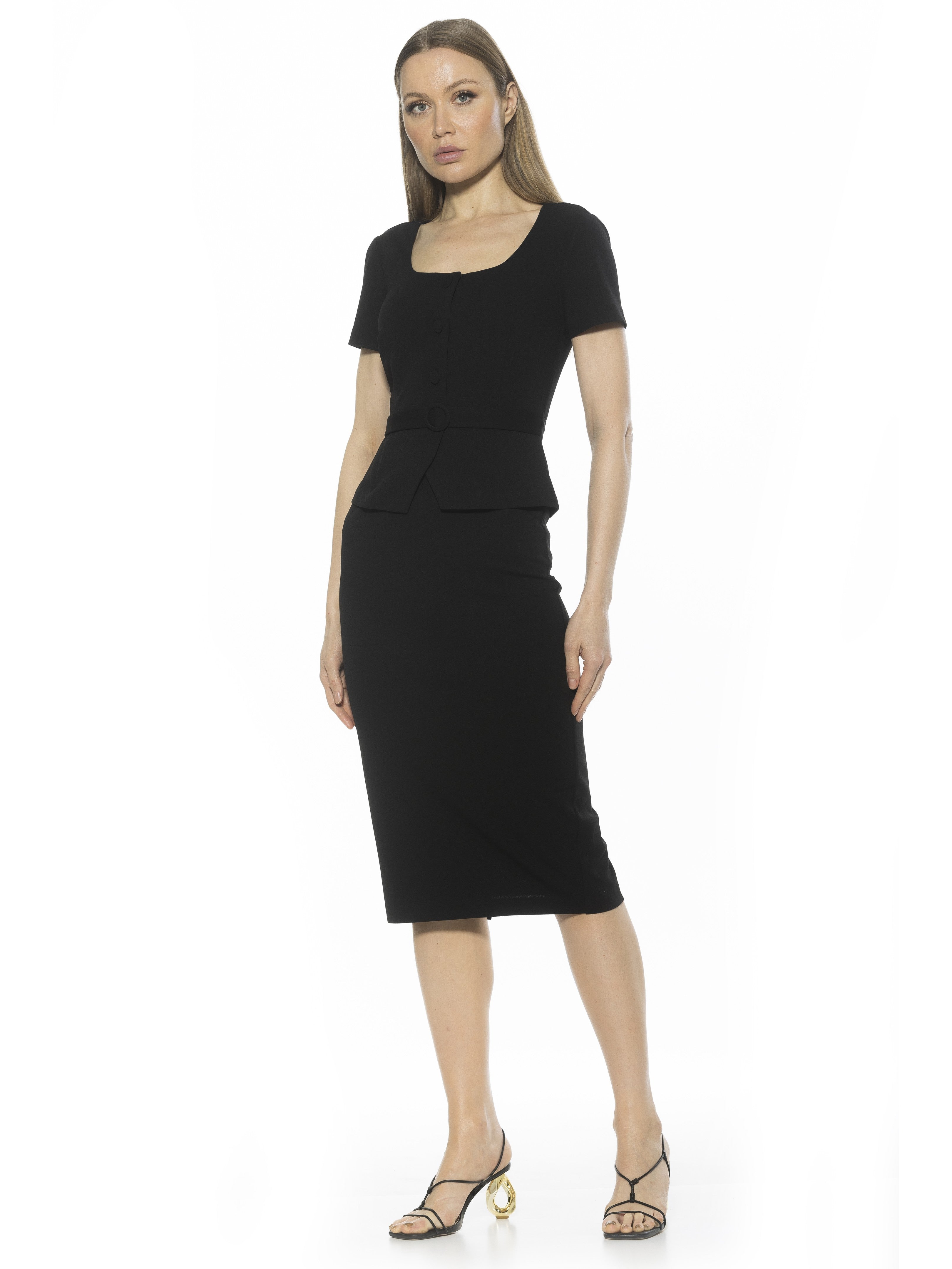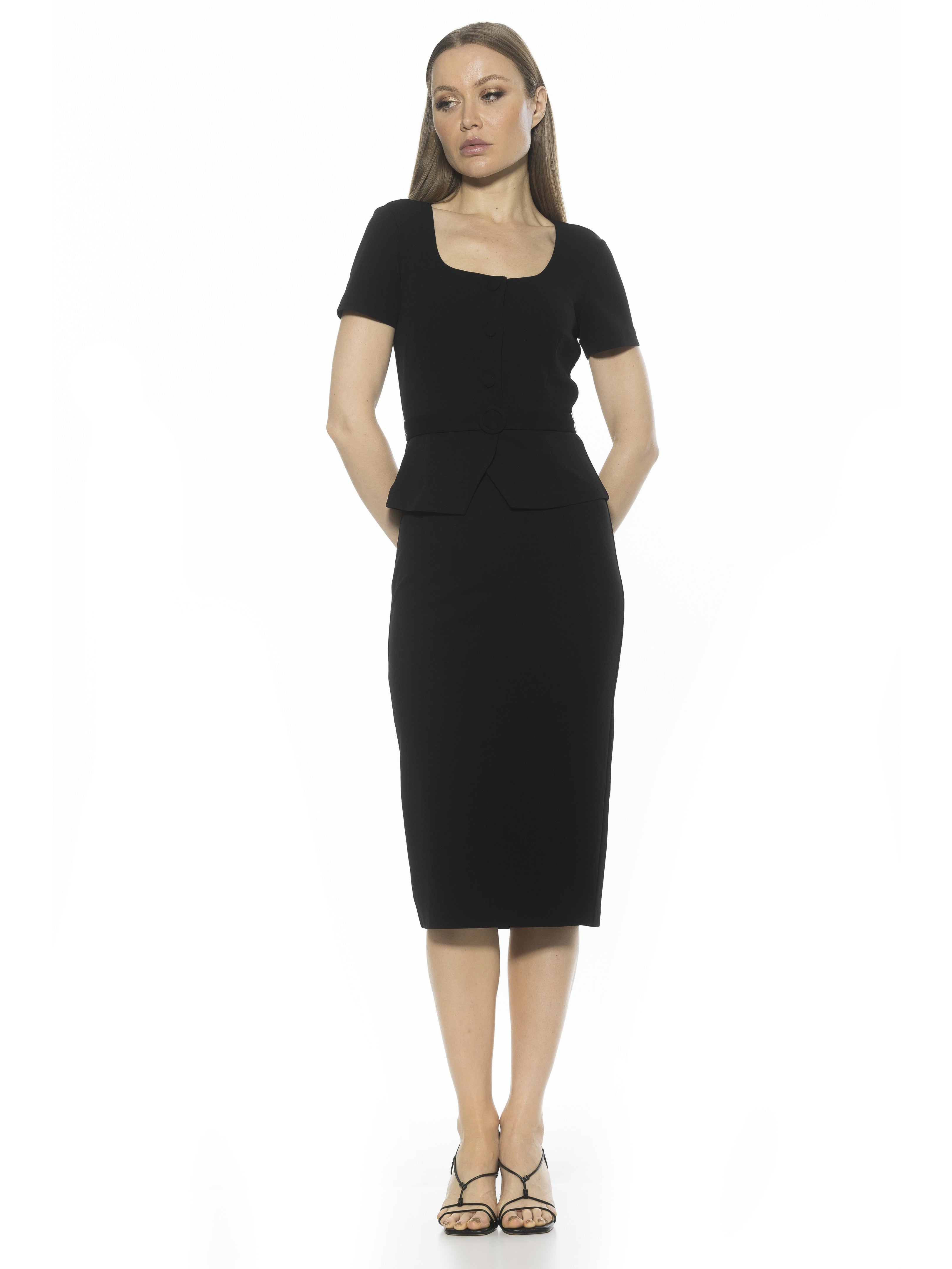 Indulge in timeless elegance with the Vance Dress. With a square neckline and short sleeves, this peplum sheath dress complements your figure while exuding sophistication. Perfect for any occasion, this dress is a must-have for any fashion-conscious individual. Elevate your wardrobe today.