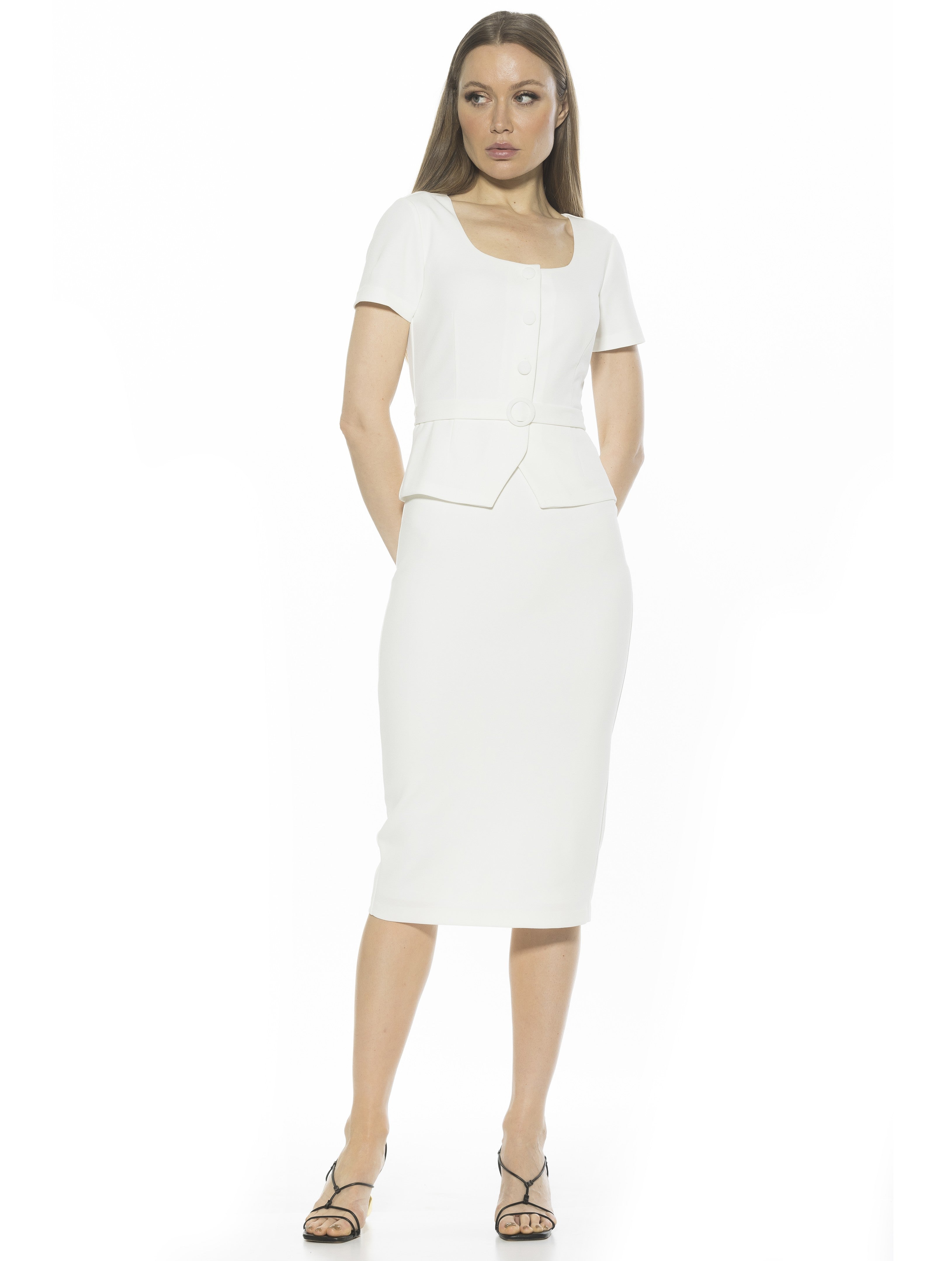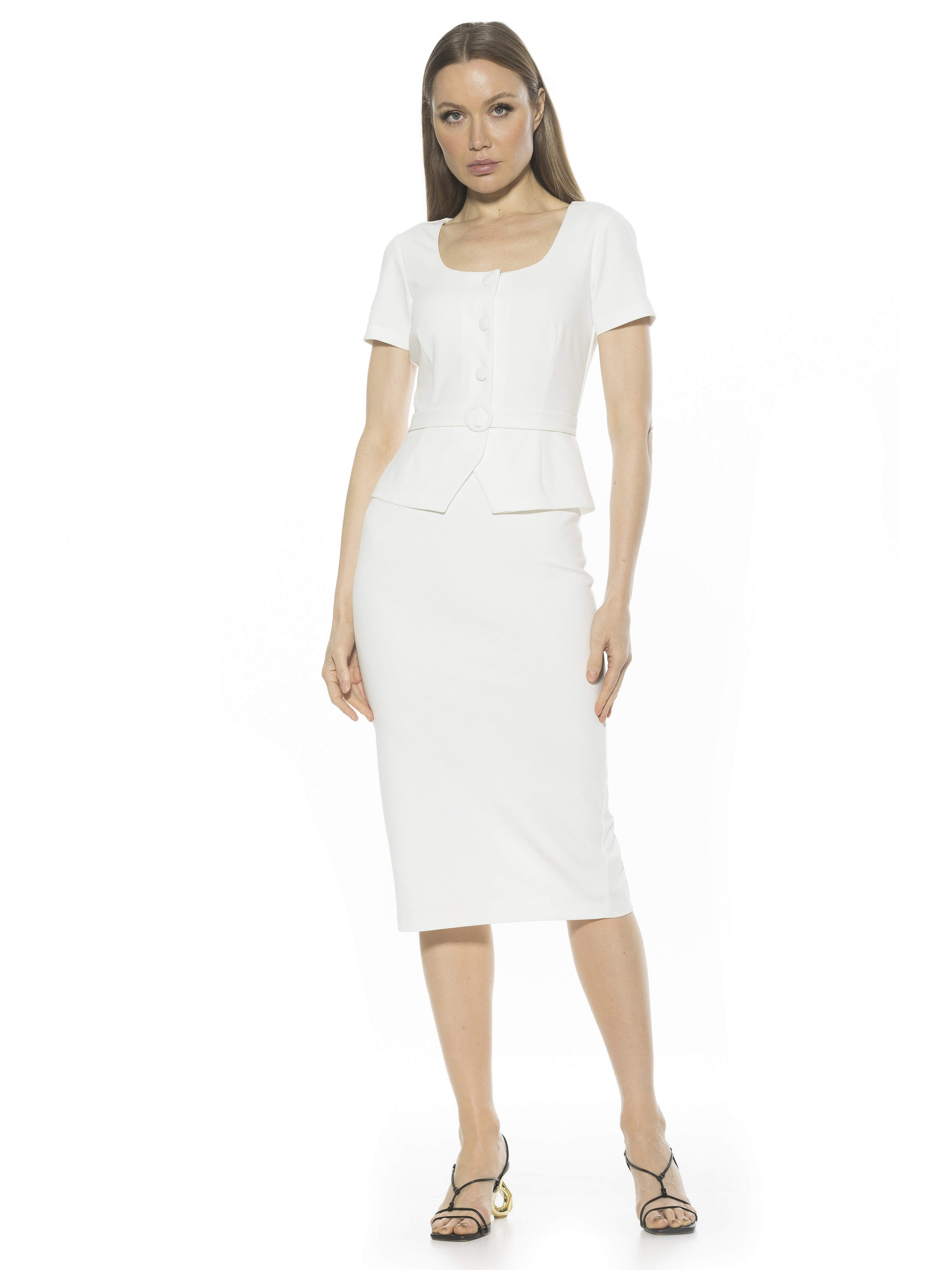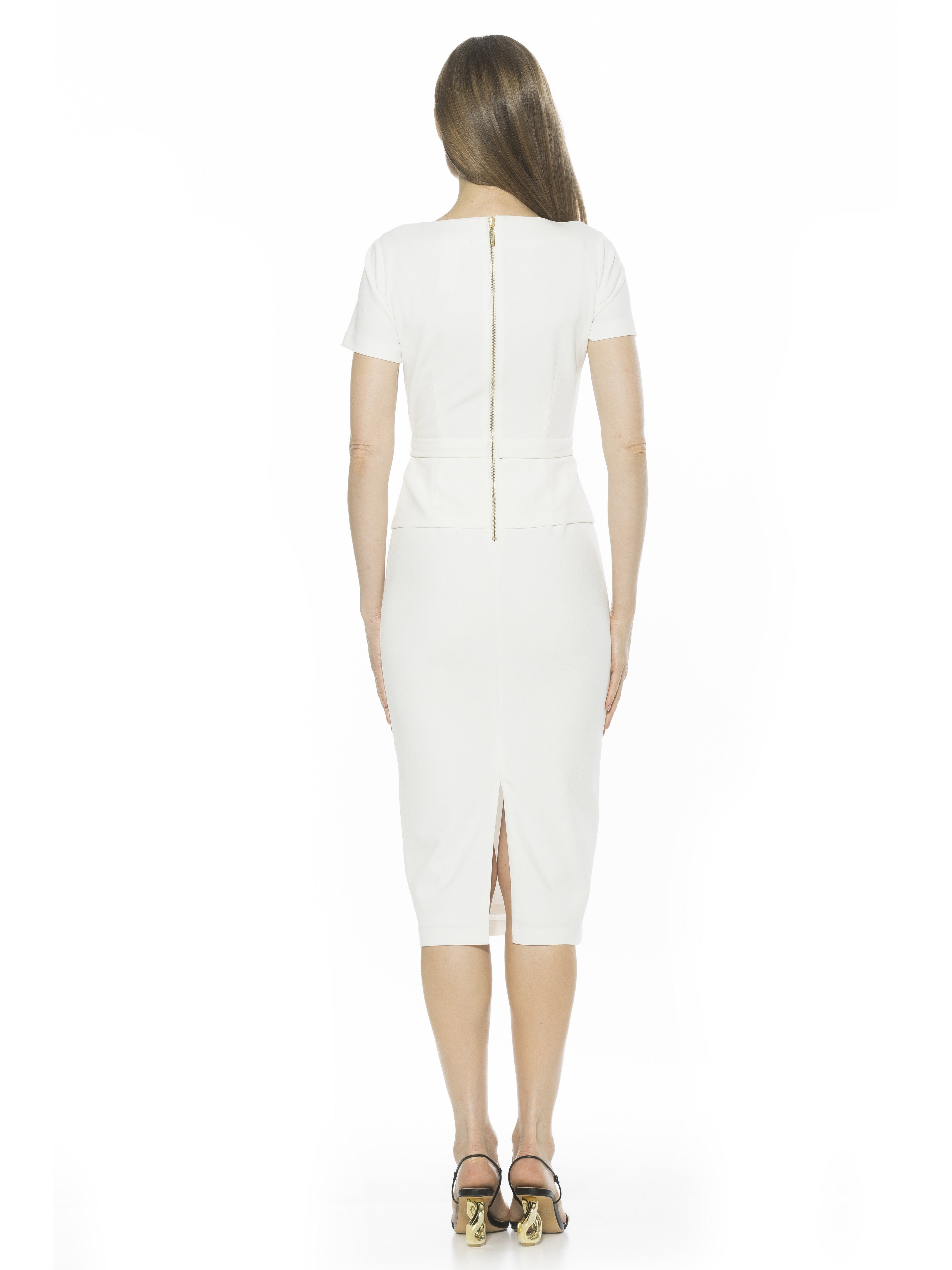 Indulge in timeless elegance with the Vance Dress. With a square neckline and short sleeves, this peplum sheath dress complements your figure while exuding sophistication. Perfect for any occasion, this dress is a must-have for any fashion-conscious individual. Elevate your wardrobe today.