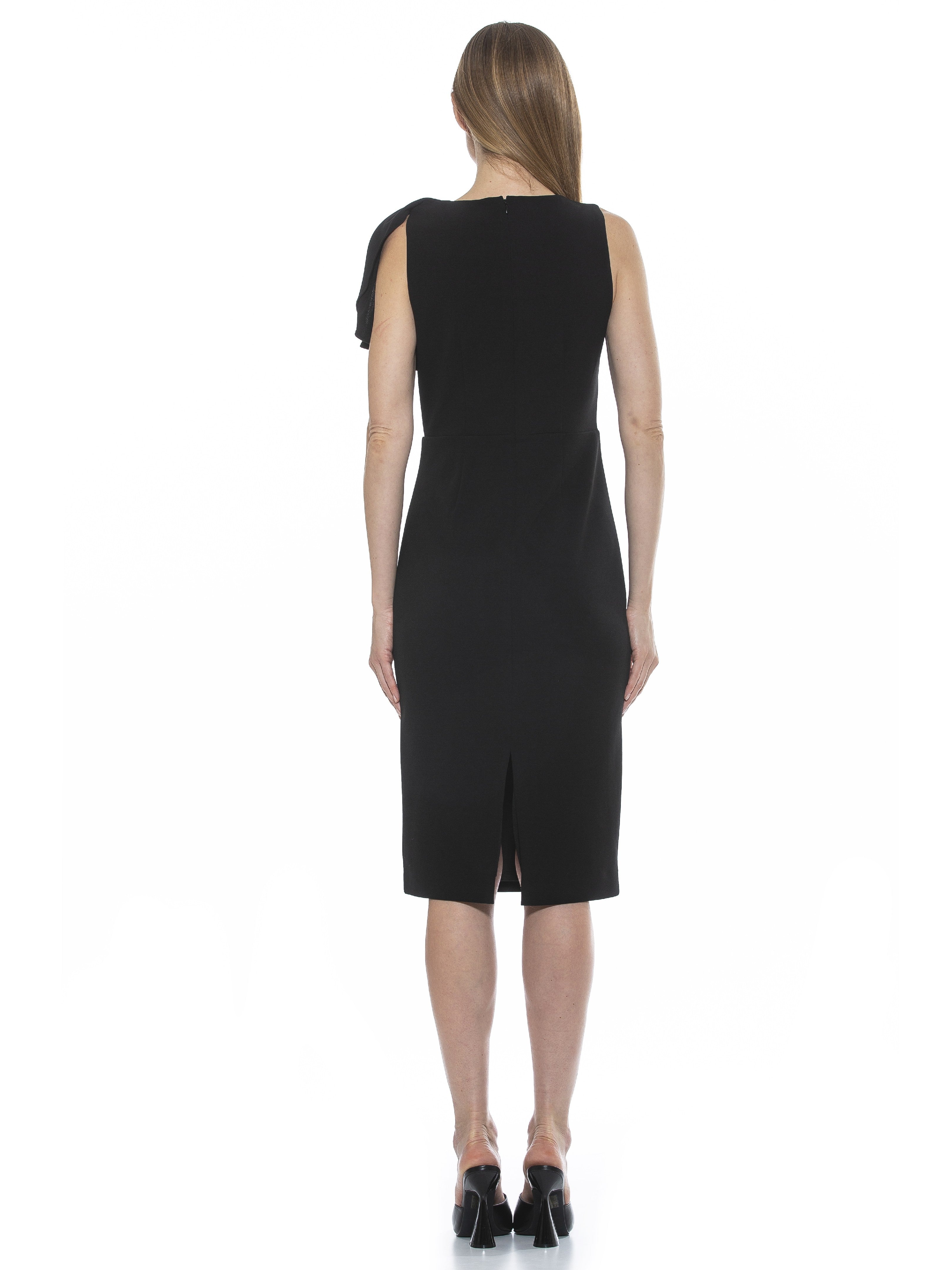 The Amazon Dress is form-fitting cocktail dress is designed in elegant, sleeveless style with a high crew neck and shoulder draping detail for a timeless and sophisticated look.