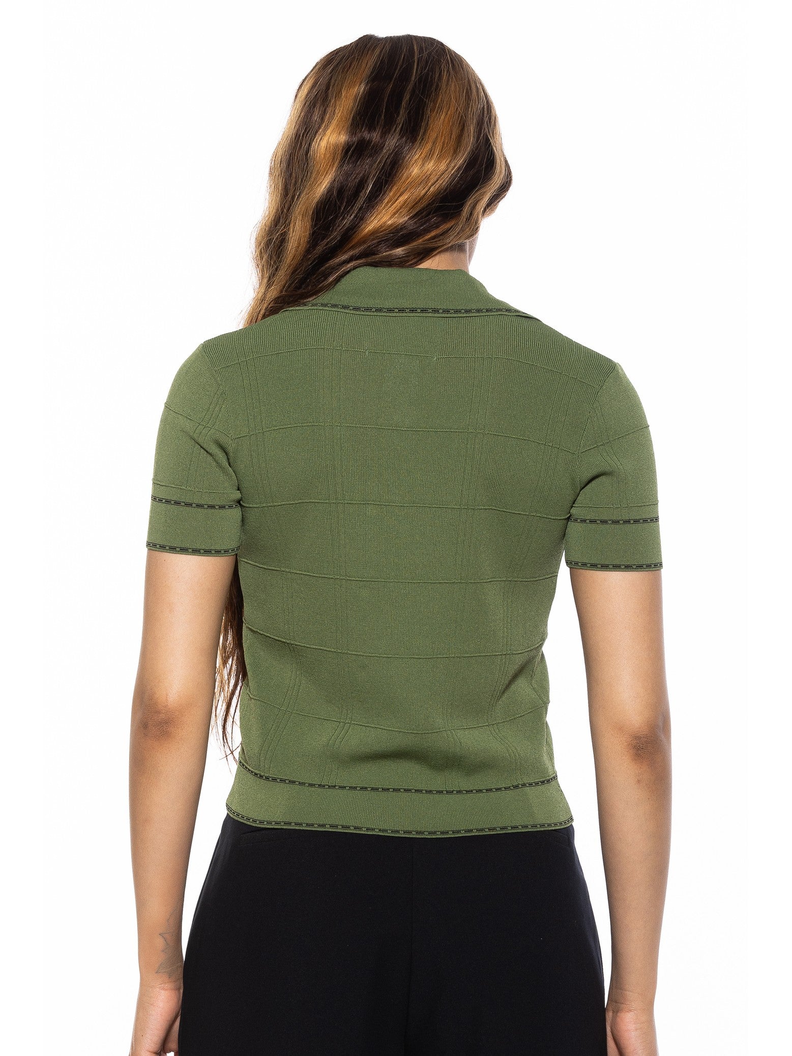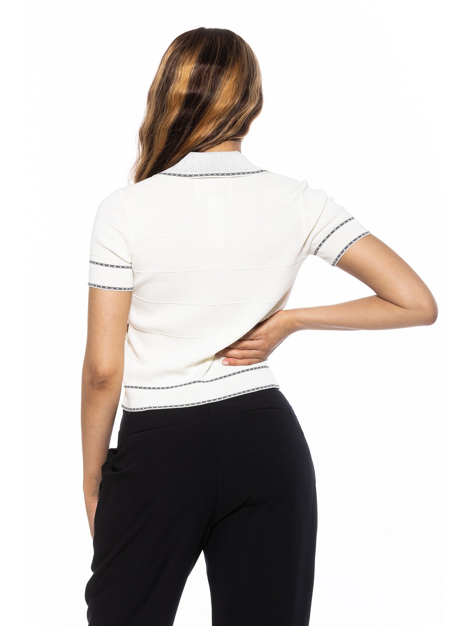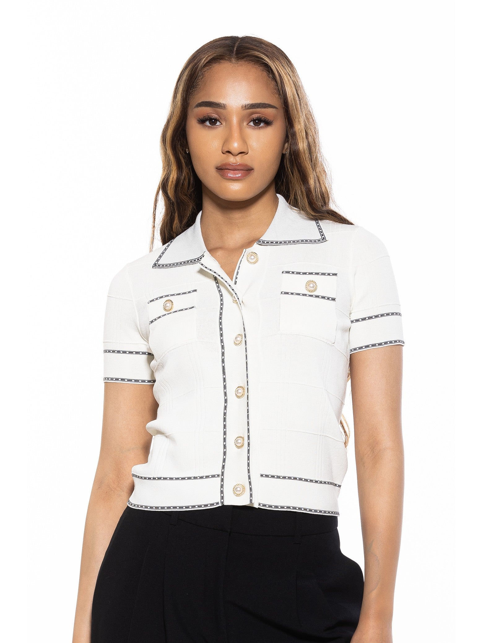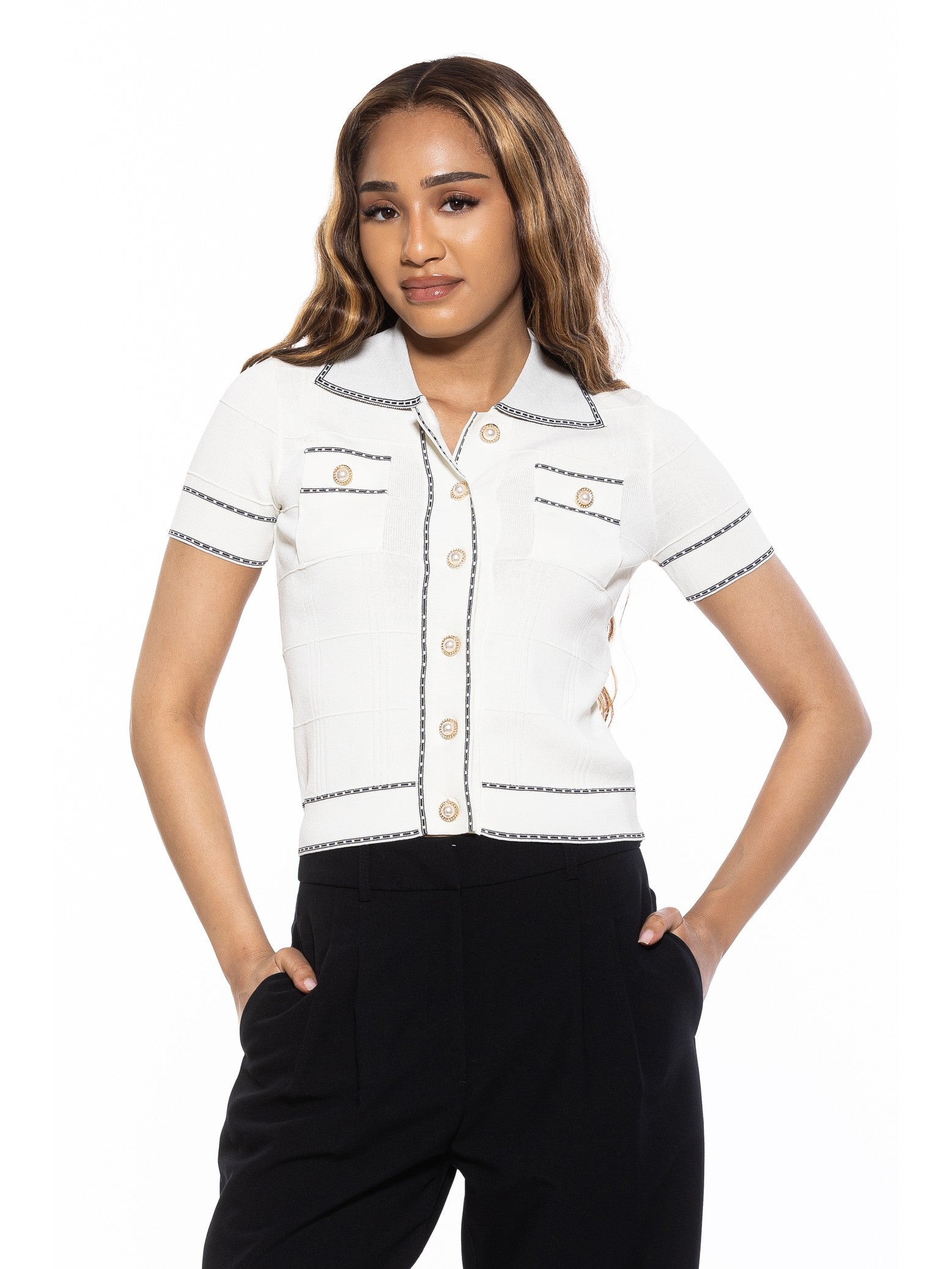 Introducing the Arya Top with pearl buttons, short sleeves, and a cropped collared knit design. Elevate your wardrobe to new heights with this luxurious and tasteful piece. The perfect blend of sophistication and style, the Arya Top is a must-have for any fashion-forward individual.