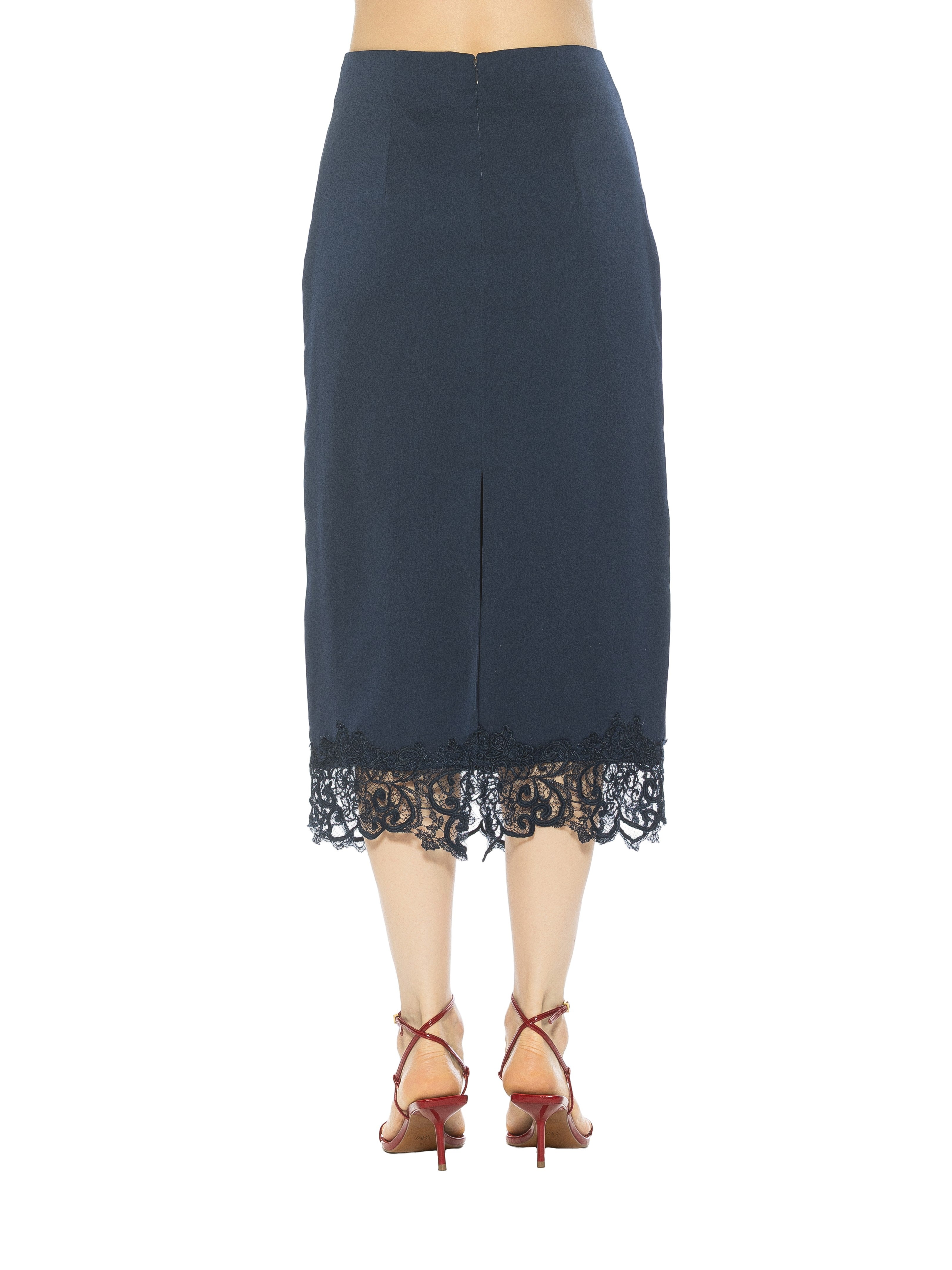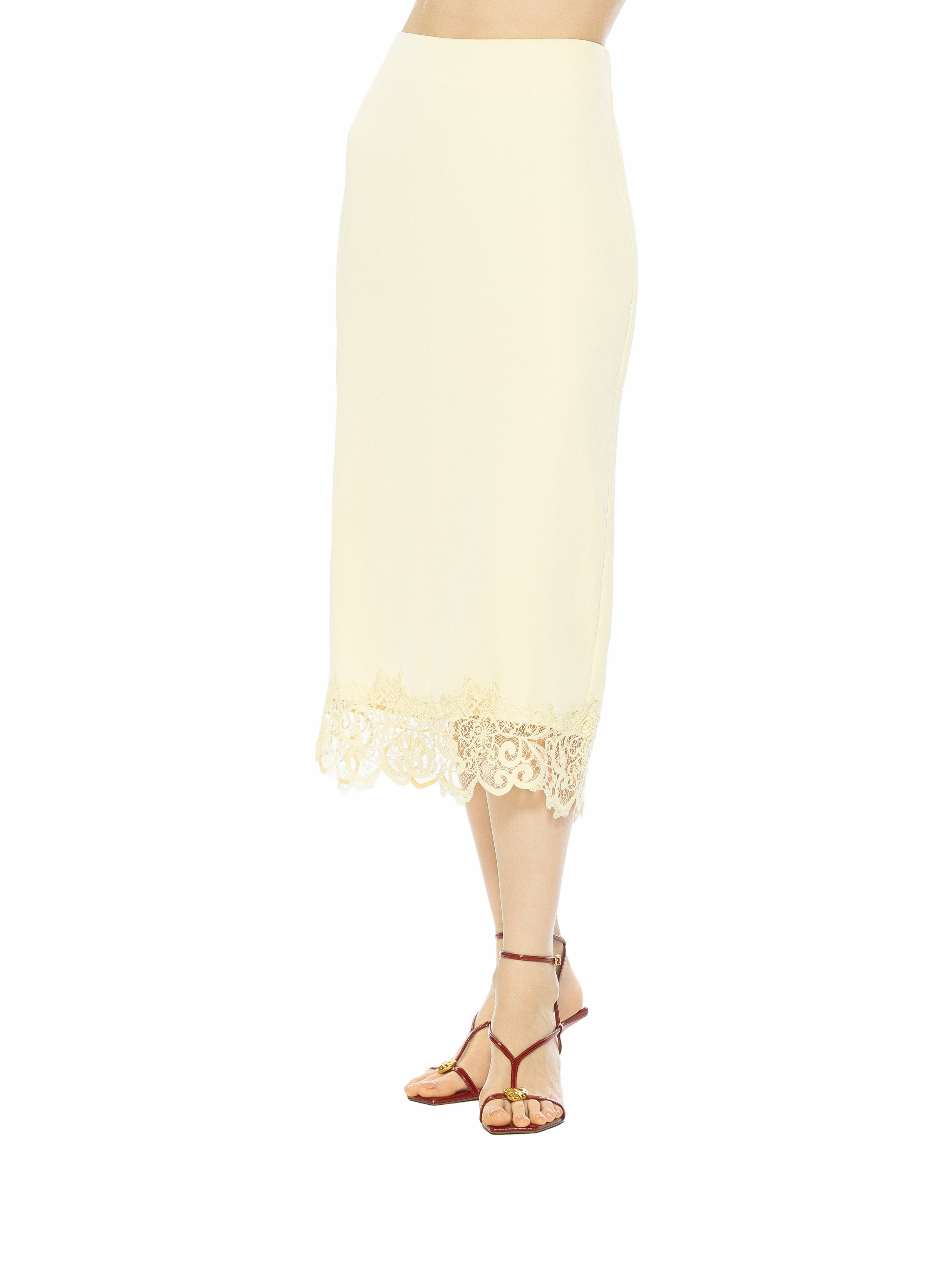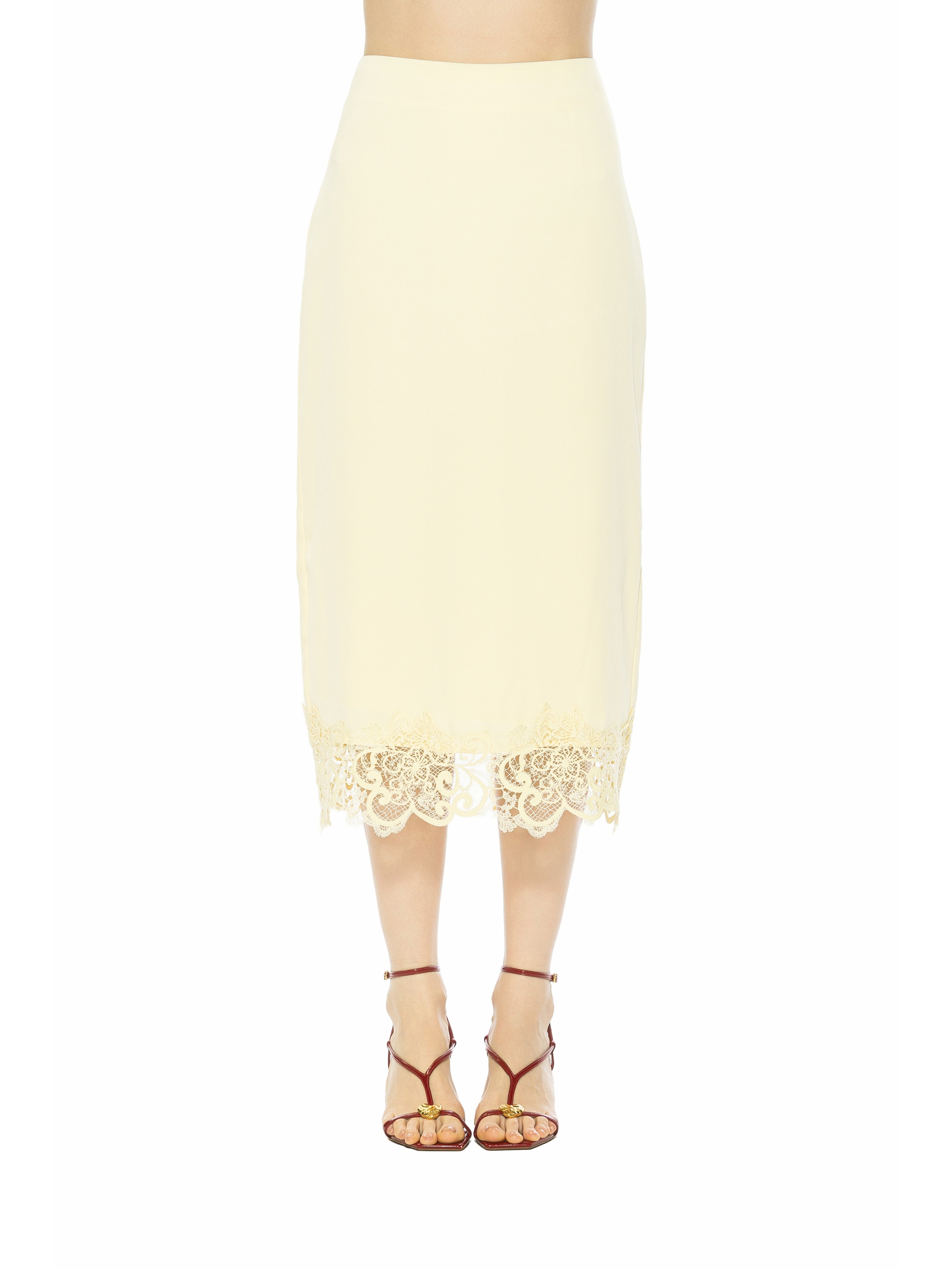 An emblem of refined femininity, the Ashen Midi Skirt with Lace Hem fuses architectural tailoring with delicate lace artistry. Impeccably cut to graze the calf, its sleek silhouette is punctuated by a whisper-soft lace trim that evokes both timeless elegance and subtle romance. This skirt effortlessly elevates day-to-evening wardrobes.