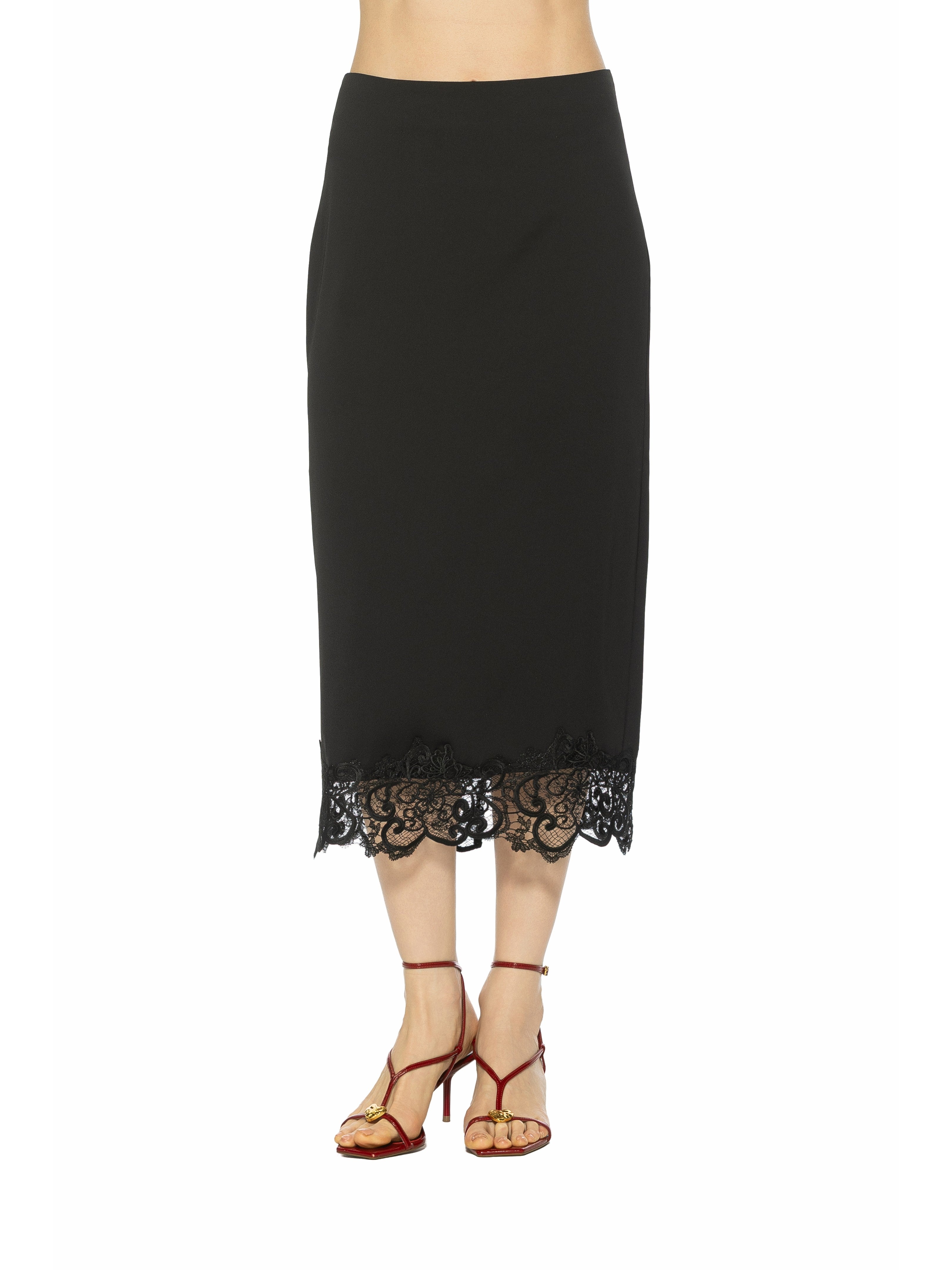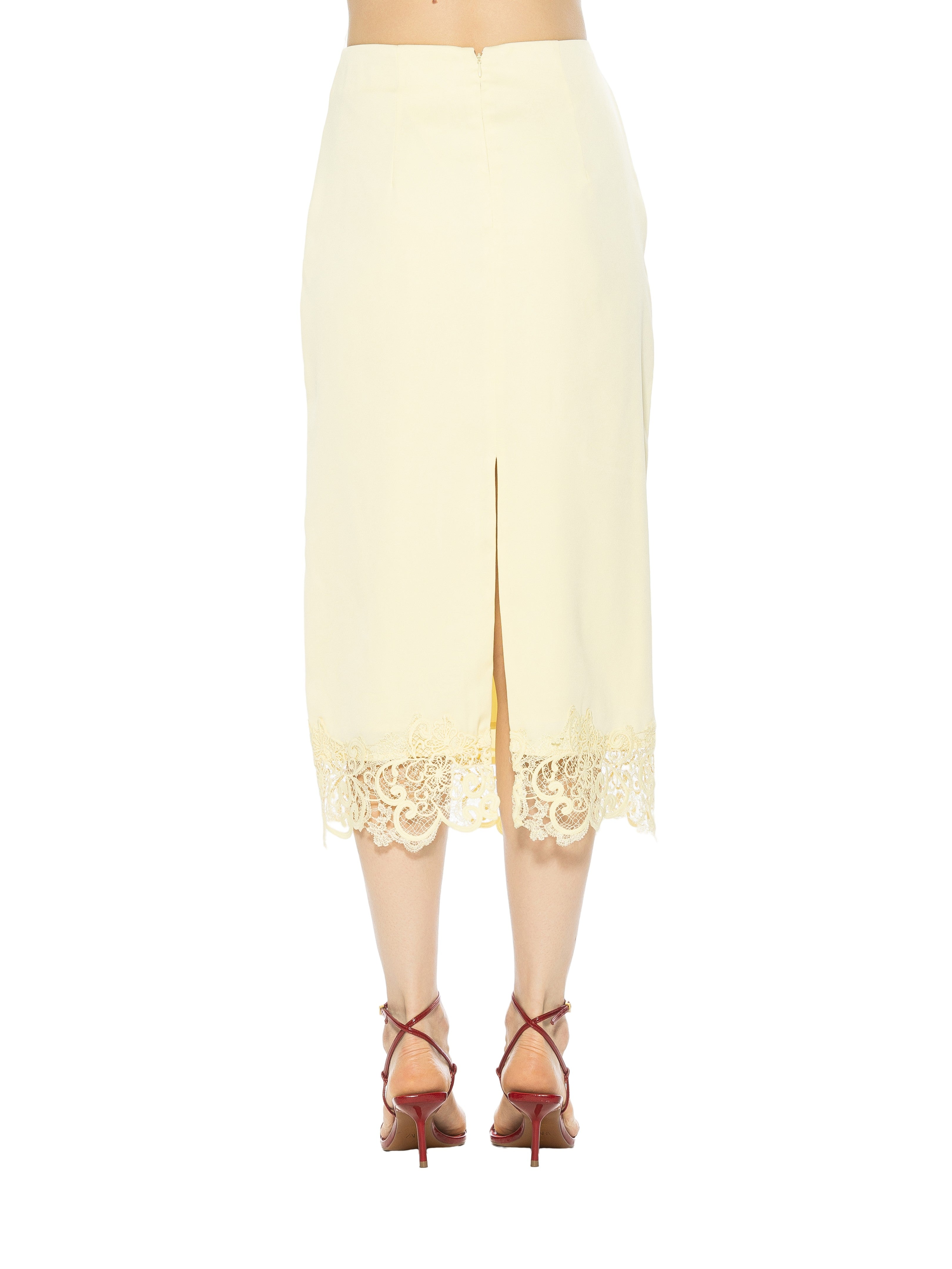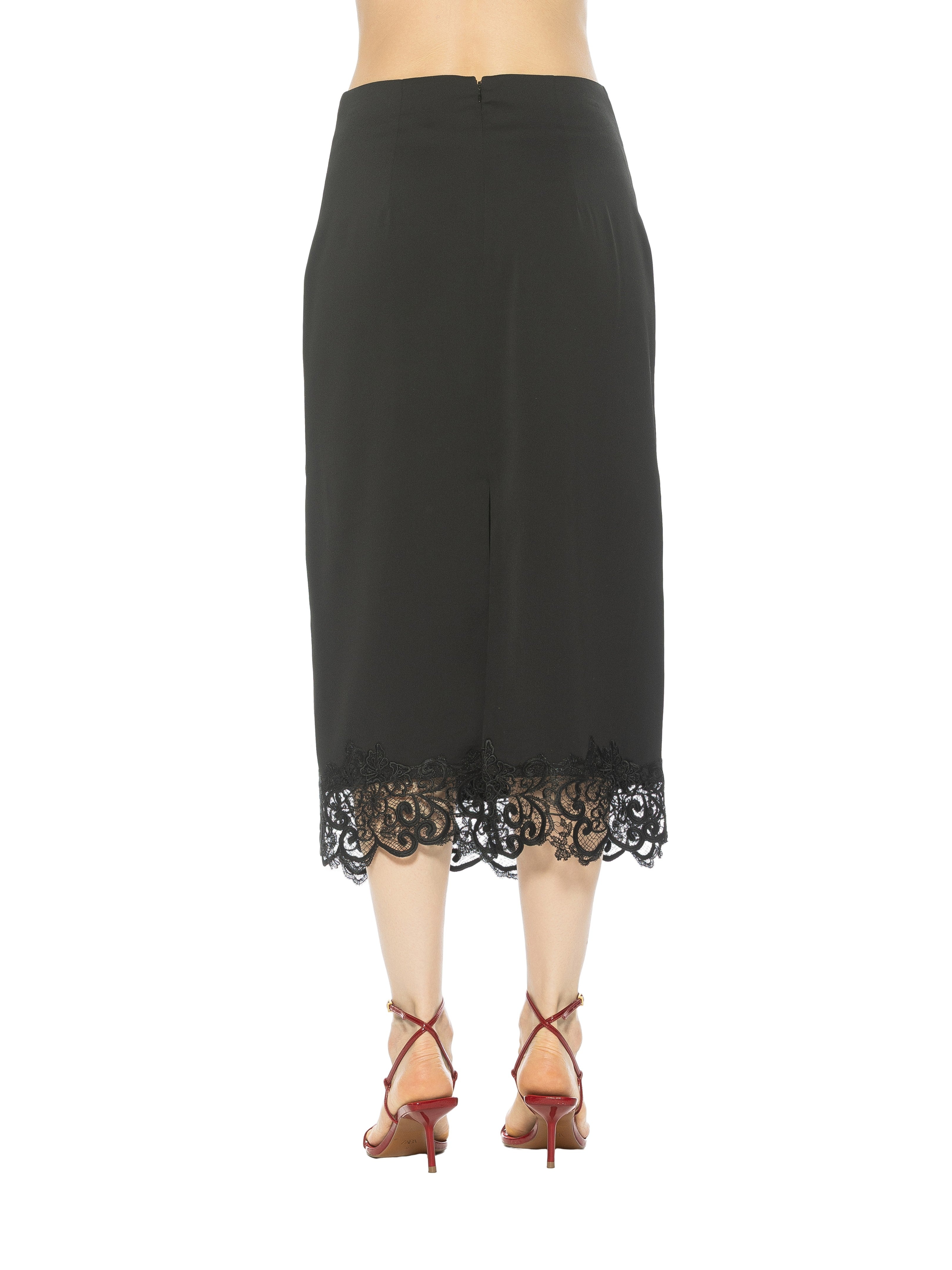 An emblem of refined femininity, the Ashen Midi Skirt with Lace Hem fuses architectural tailoring with delicate lace artistry. Impeccably cut to graze the calf, its sleek silhouette is punctuated by a whisper-soft lace trim that evokes both timeless elegance and subtle romance. This skirt effortlessly elevates day-to-evening wardrobes.