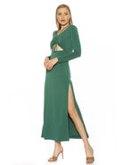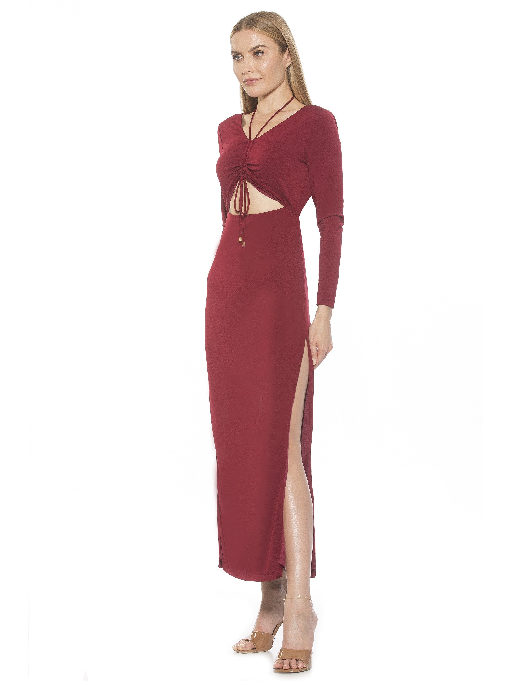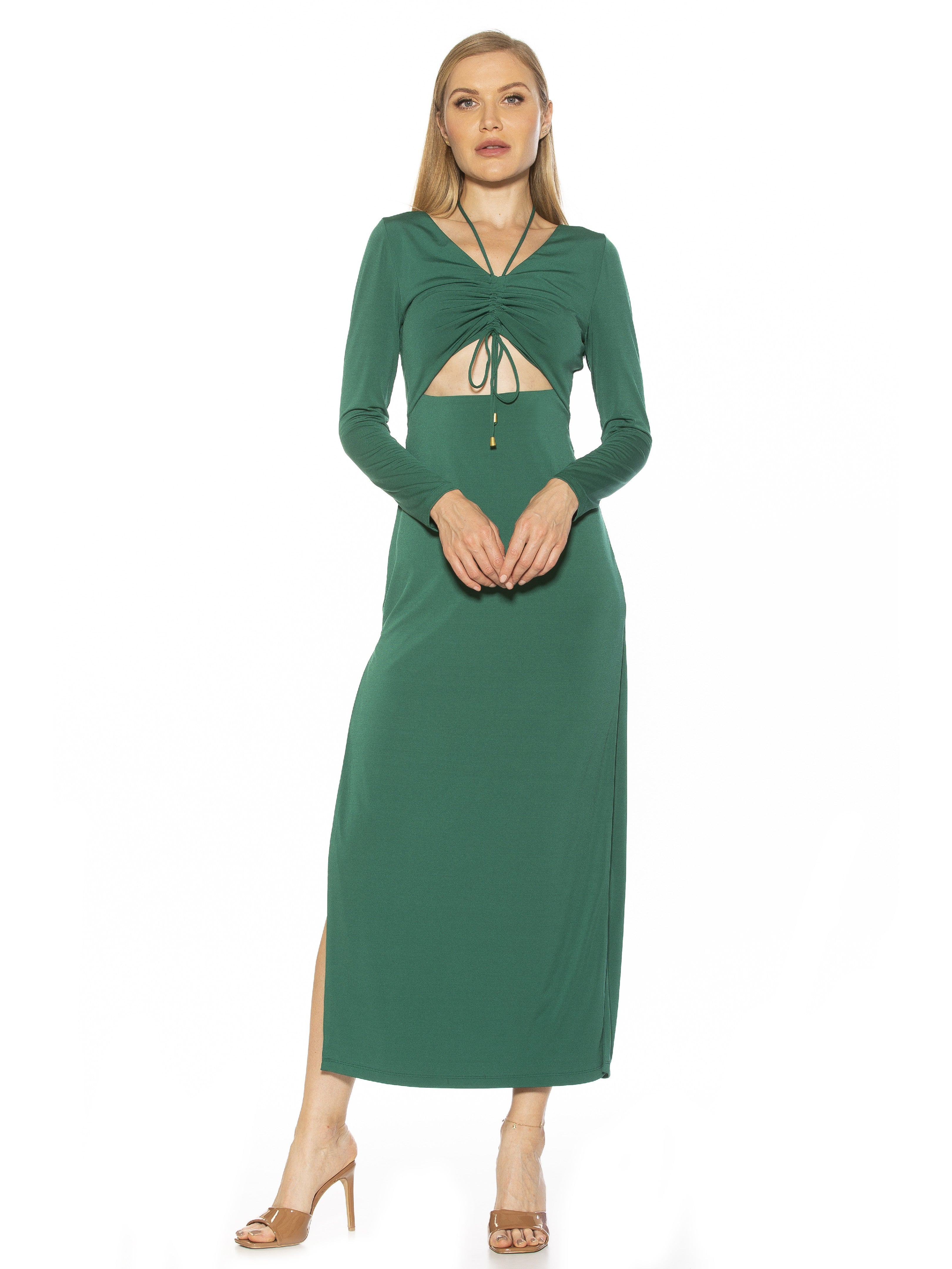 The Farish long sleeve maxi dress with cutout detail is a must have piece for your wardrobe. This dress features long sleeves, luxe stretch fabric, front cutout detail, adjustable ruched bodice and long maxi skirt. This dress fits true to size.