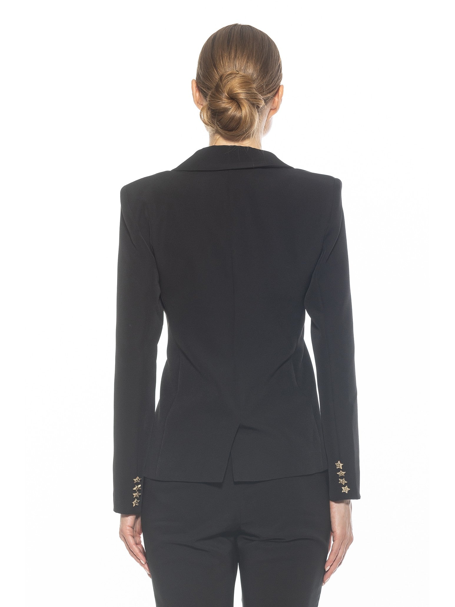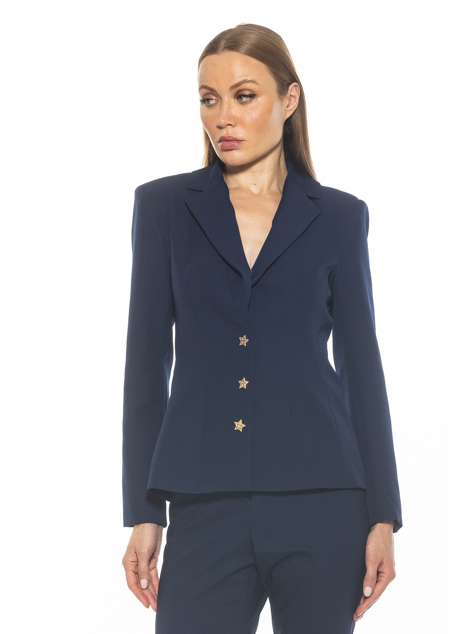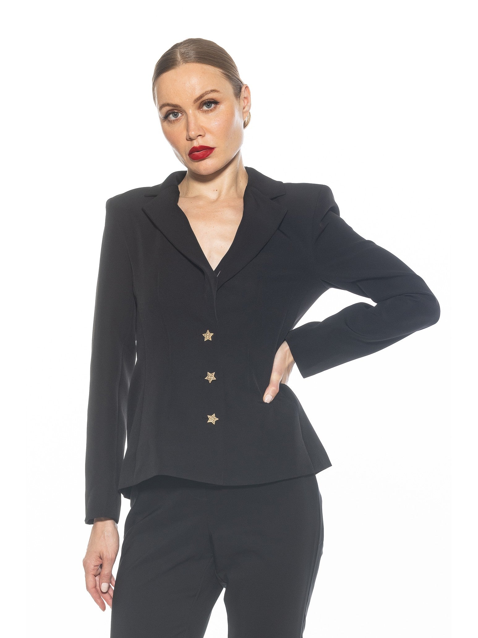Introducing our Gwen Fitted Jacket with Star Button Detail. Elevate your wardrobe with this fitted blazer that features luxurious star buttons and shoulder pads for a sophisticated and exclusive look. Perfect for any occasion, it adds a touch of elegance and style to your outfit.
