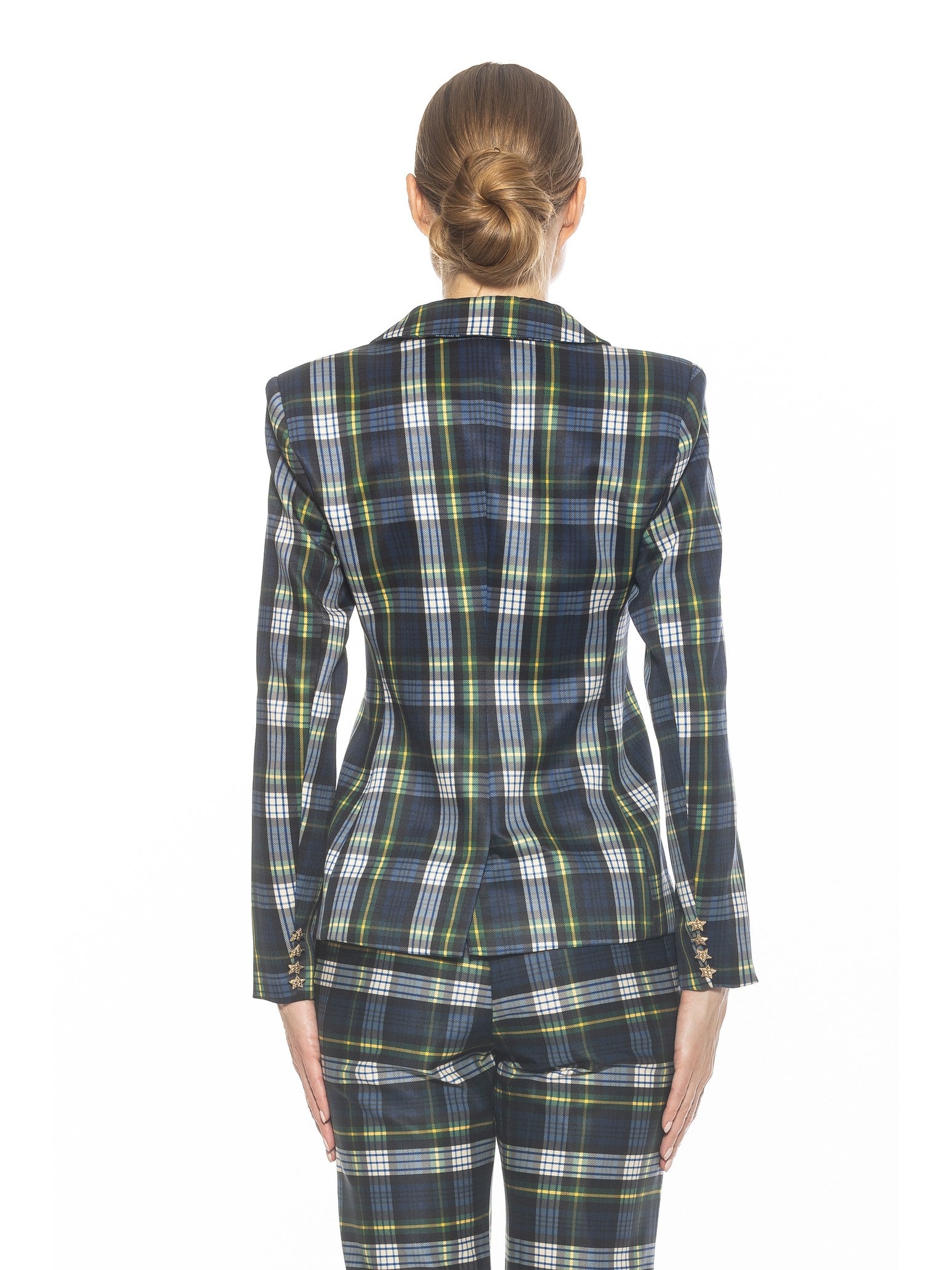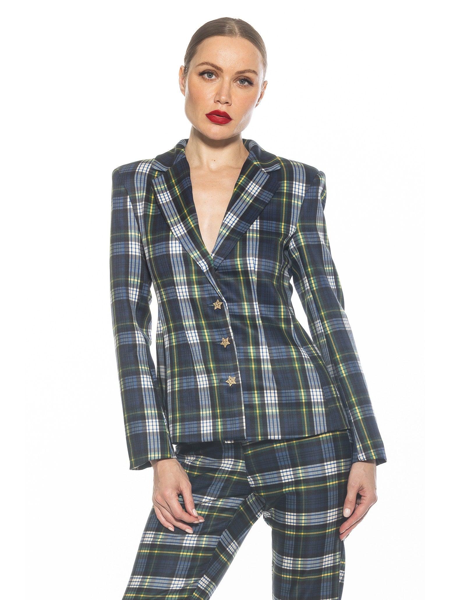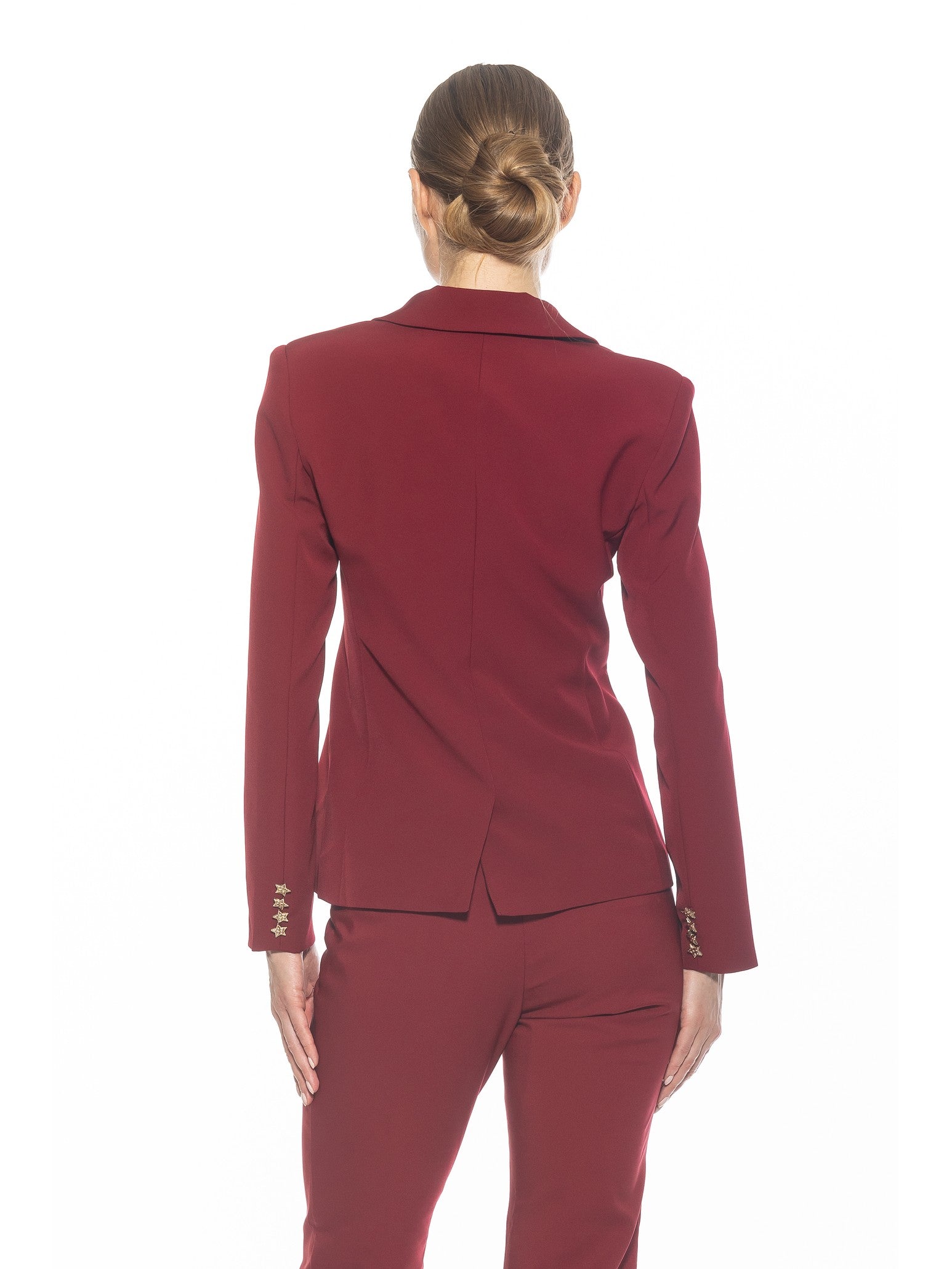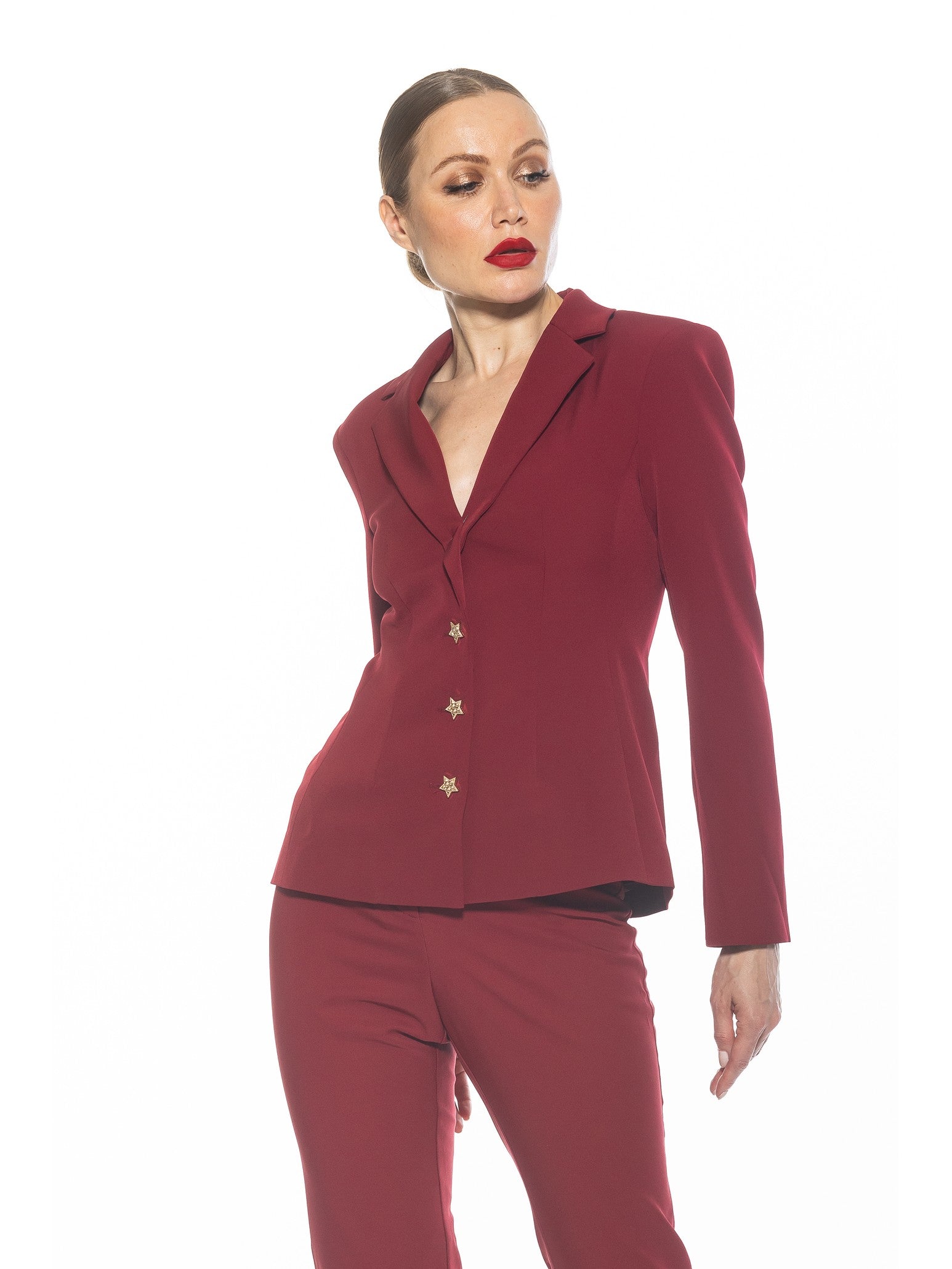 Introducing our Gwen Fitted Jacket with Star Button Detail. Elevate your wardrobe with this fitted blazer that features luxurious star buttons and shoulder pads for a sophisticated and exclusive look. Perfect for any occasion, it adds a touch of elegance and style to your outfit.