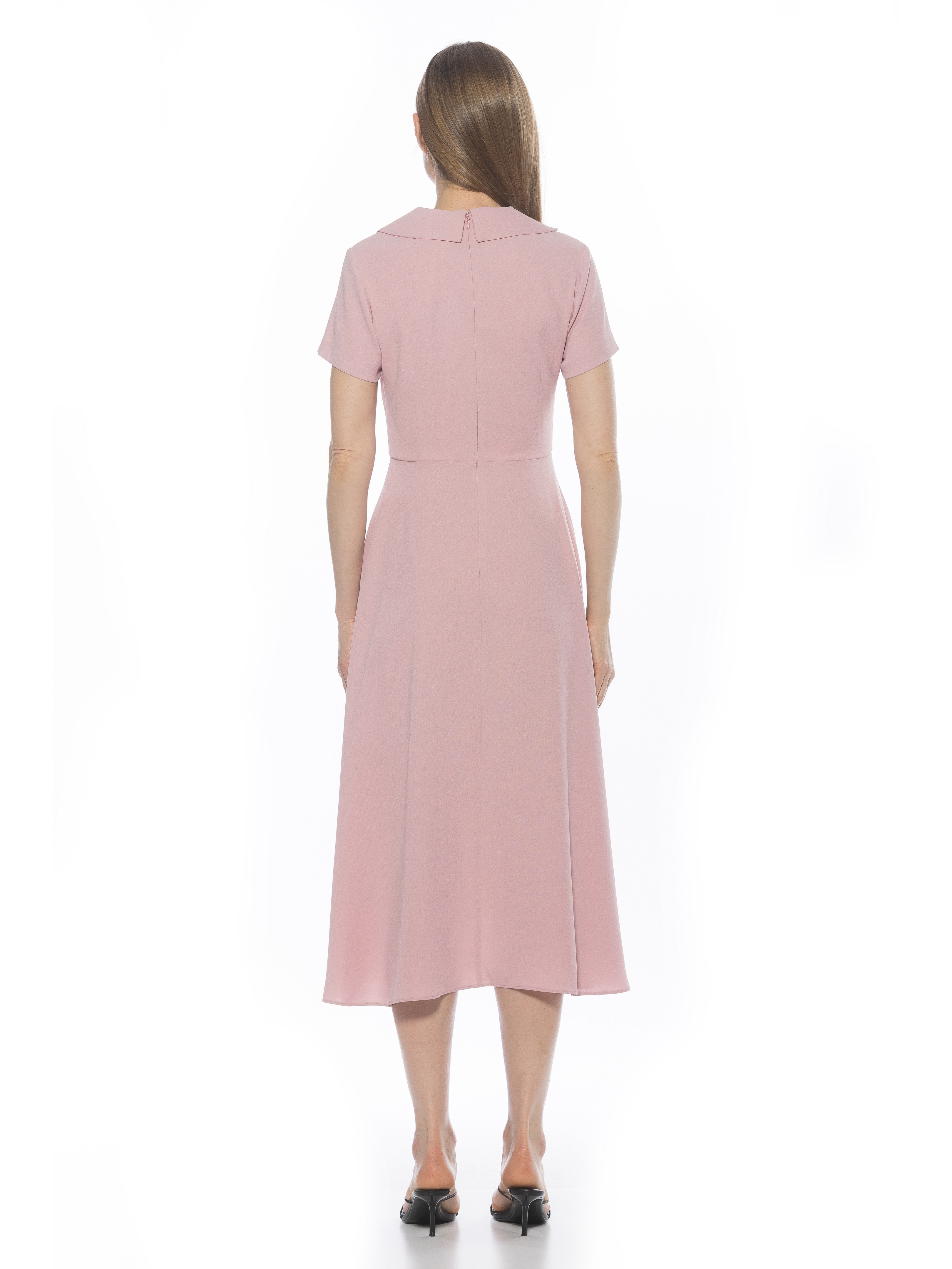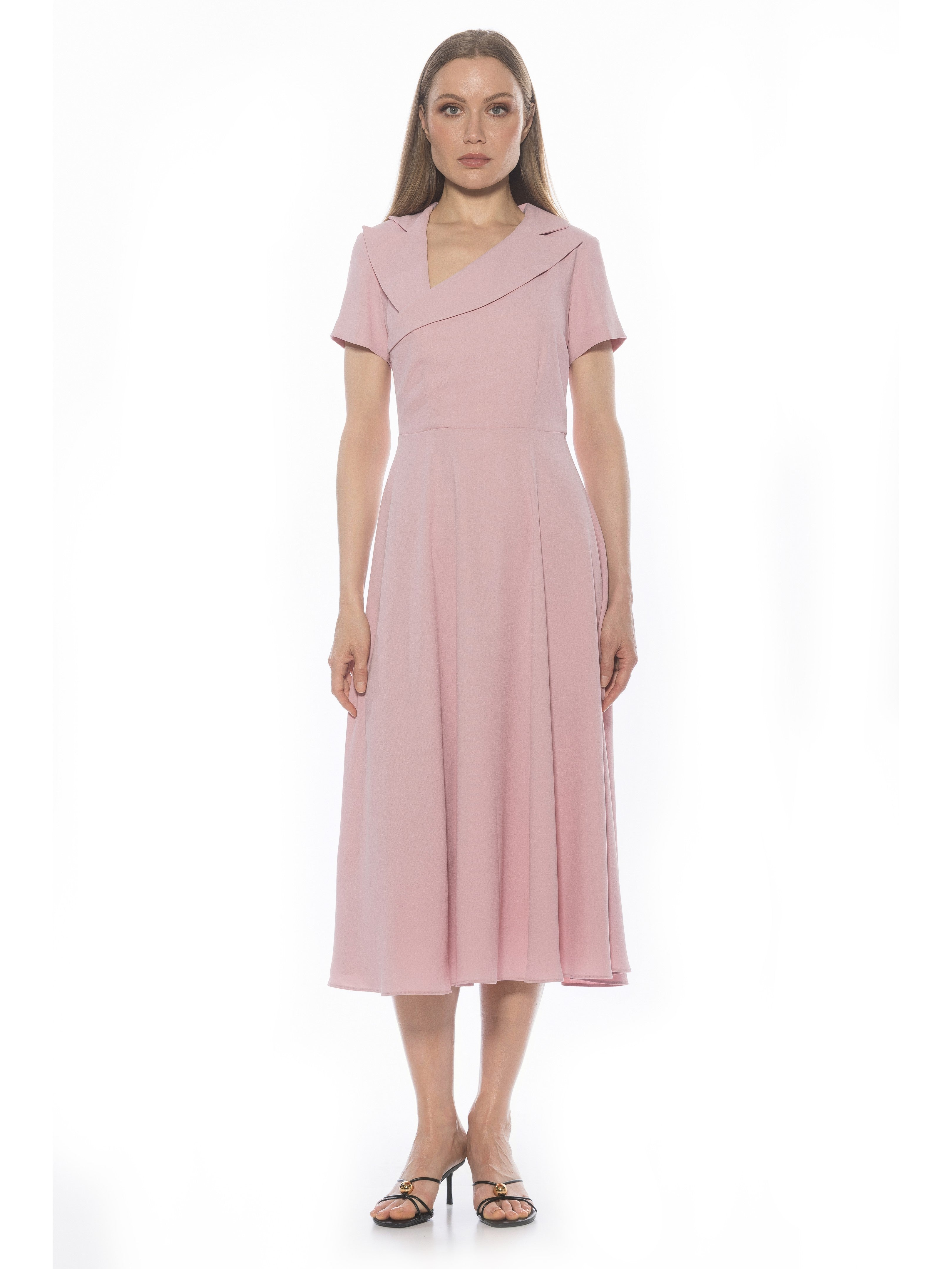 The Jackie Asymmetrical Collar Fit And Flare Short Sleeve Dress Is A Must Have For Your Closet.  This Elegant Dress Features Asymmetrical Neckline Detail, Short Sleeves, And Midi Length Full Skirt.  This Dress Runs Small.