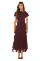 The Kaelith Dress is a romantic chiffon midi featuring soft flutter ruffle sleeves and an elegant asymmetrically draped hem for beautiful movement. Light and feminine, it’s finished with a back adjustable tie to shape the waist. A feminine, flowy look perfect for daytime events or special occasions.