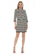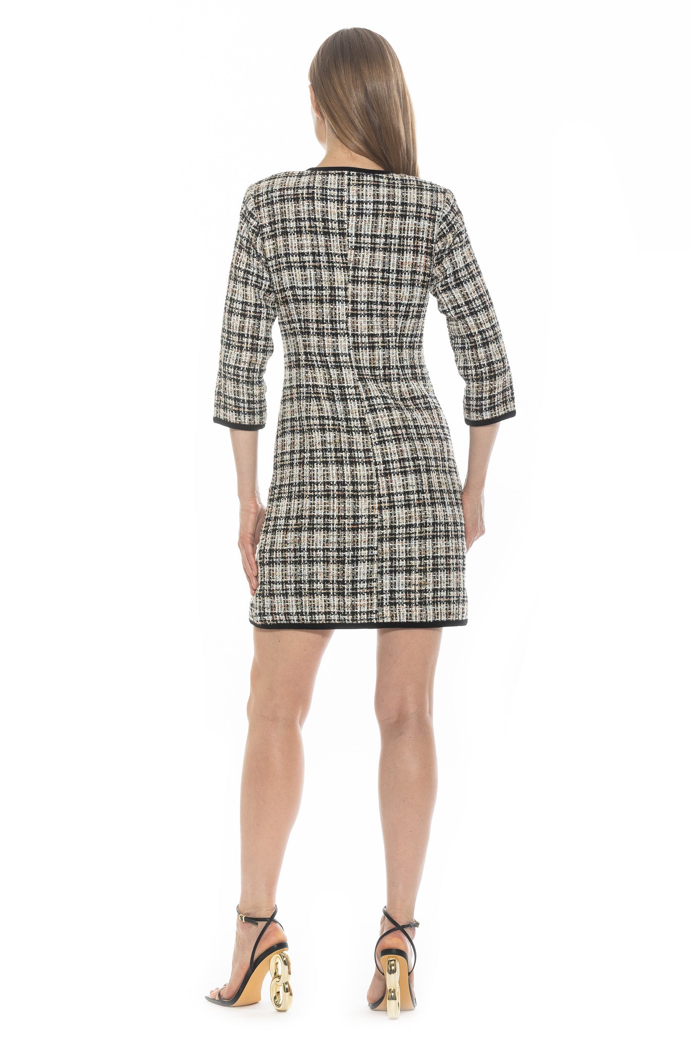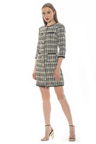 Indulge in sophistication with our Kara tweed dress. This mini dress features a crewneck and three quarter sleeves, accented with elegant pearl buttons. The button down design is elevated by contrast piping, adding a touch of luxury to this timeless tweed dress.