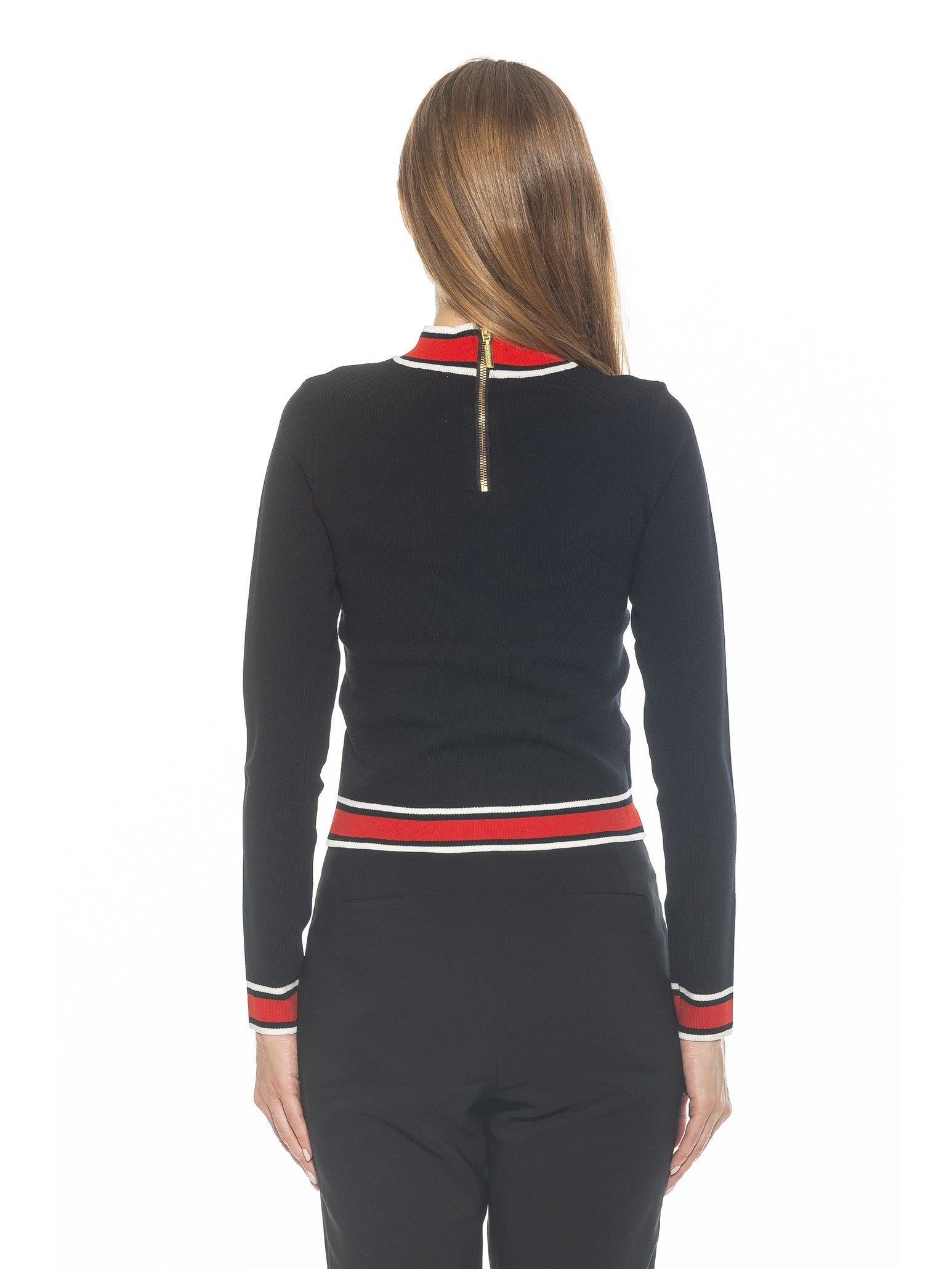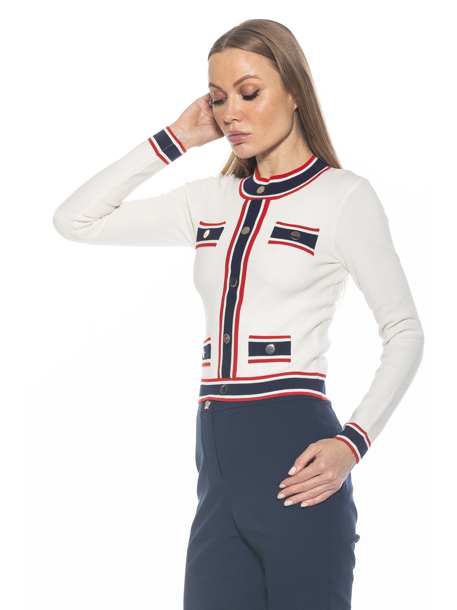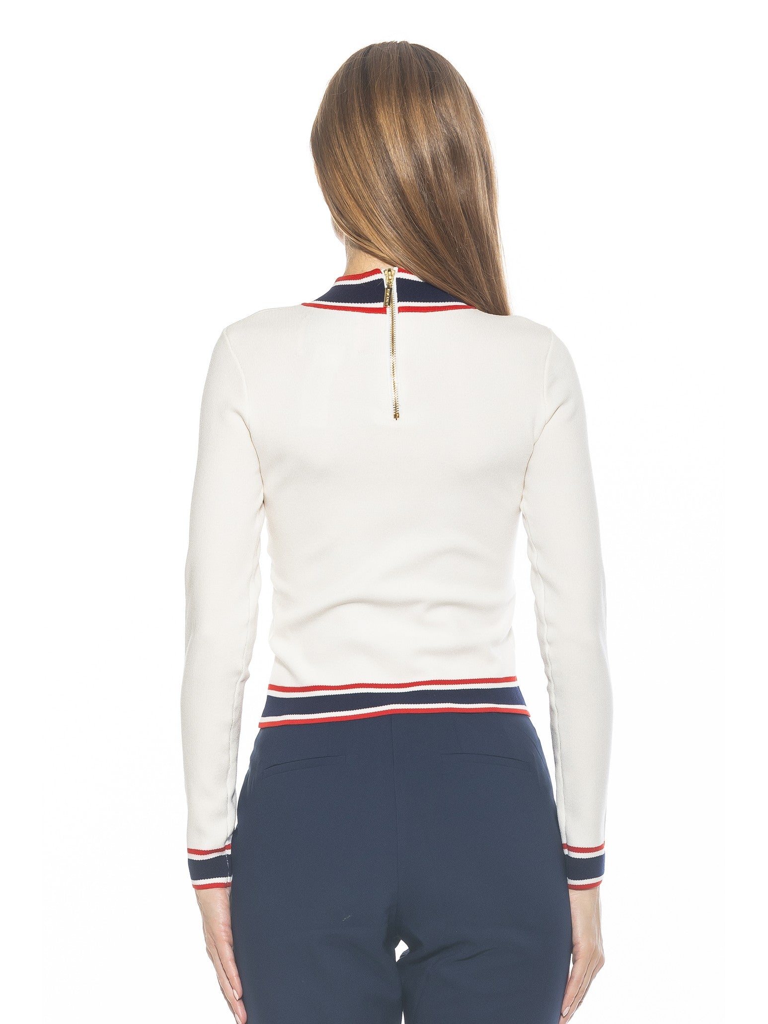 Indulge in luxury with our Kiley Sweater. The mock neck design, gold button details, and contrast trim make a sophisticated statement. With long sleeves, this sweater is perfect for any occasion. Elevate your style and embrace exclusivity with this must-have piece.