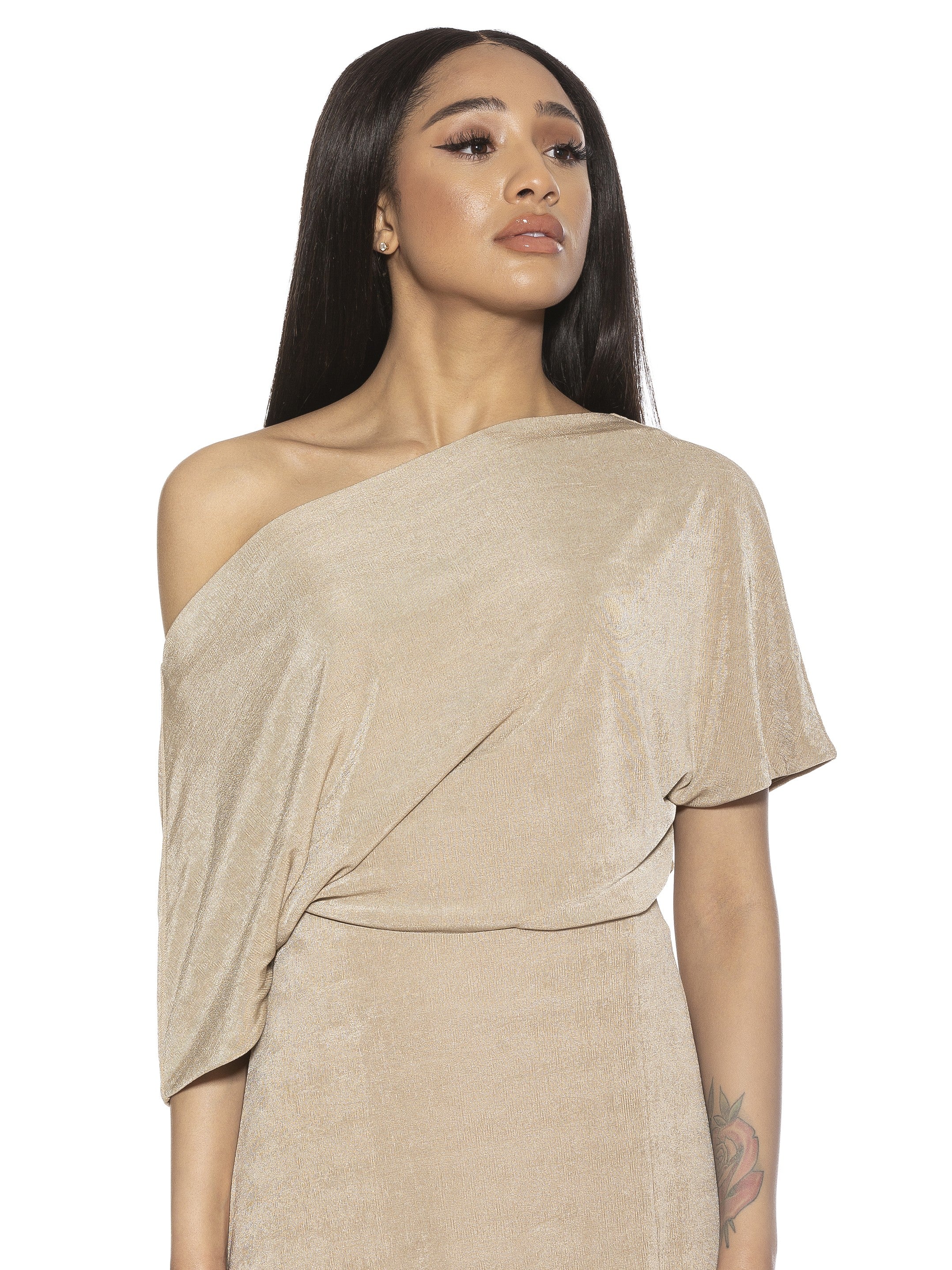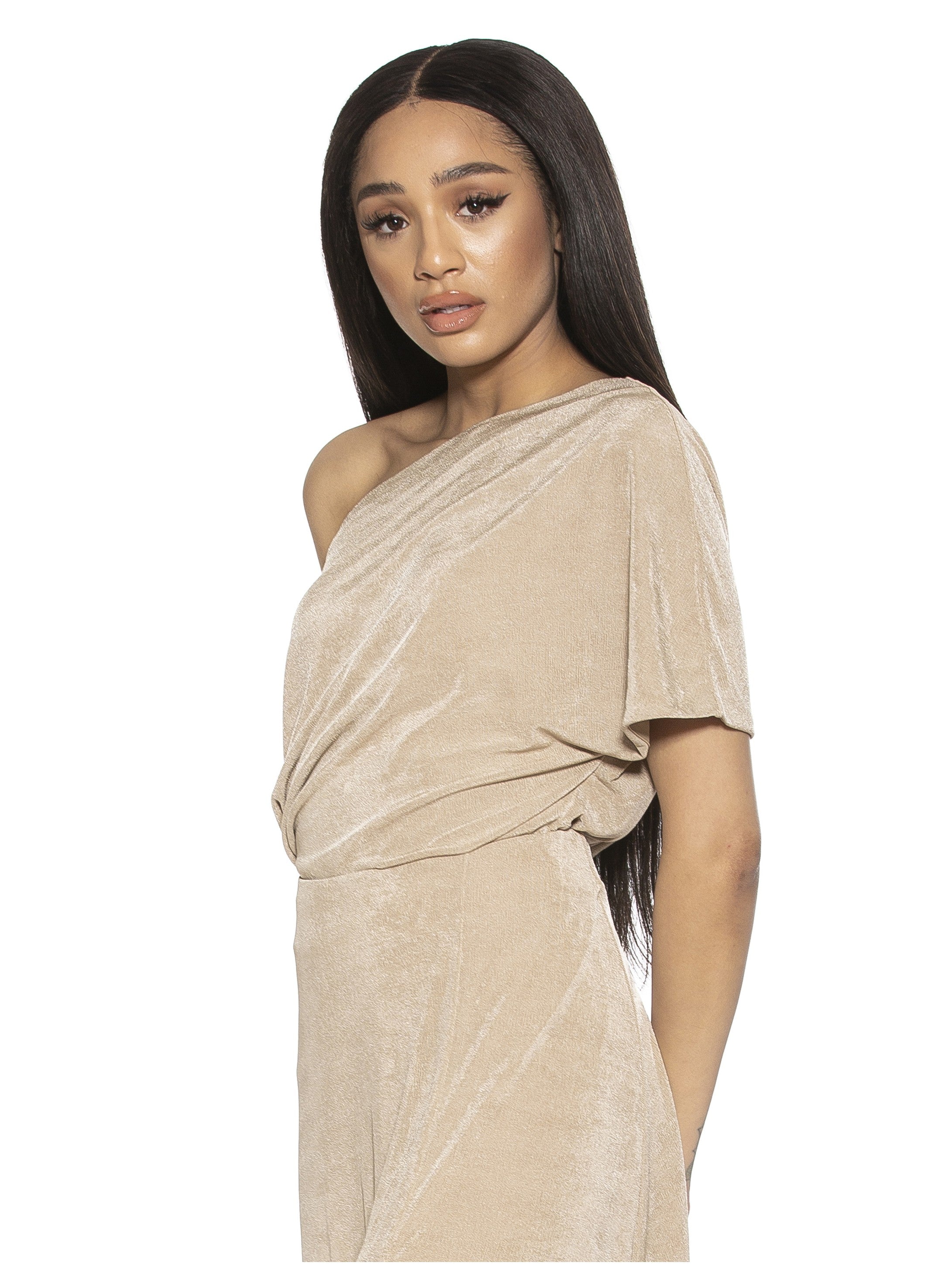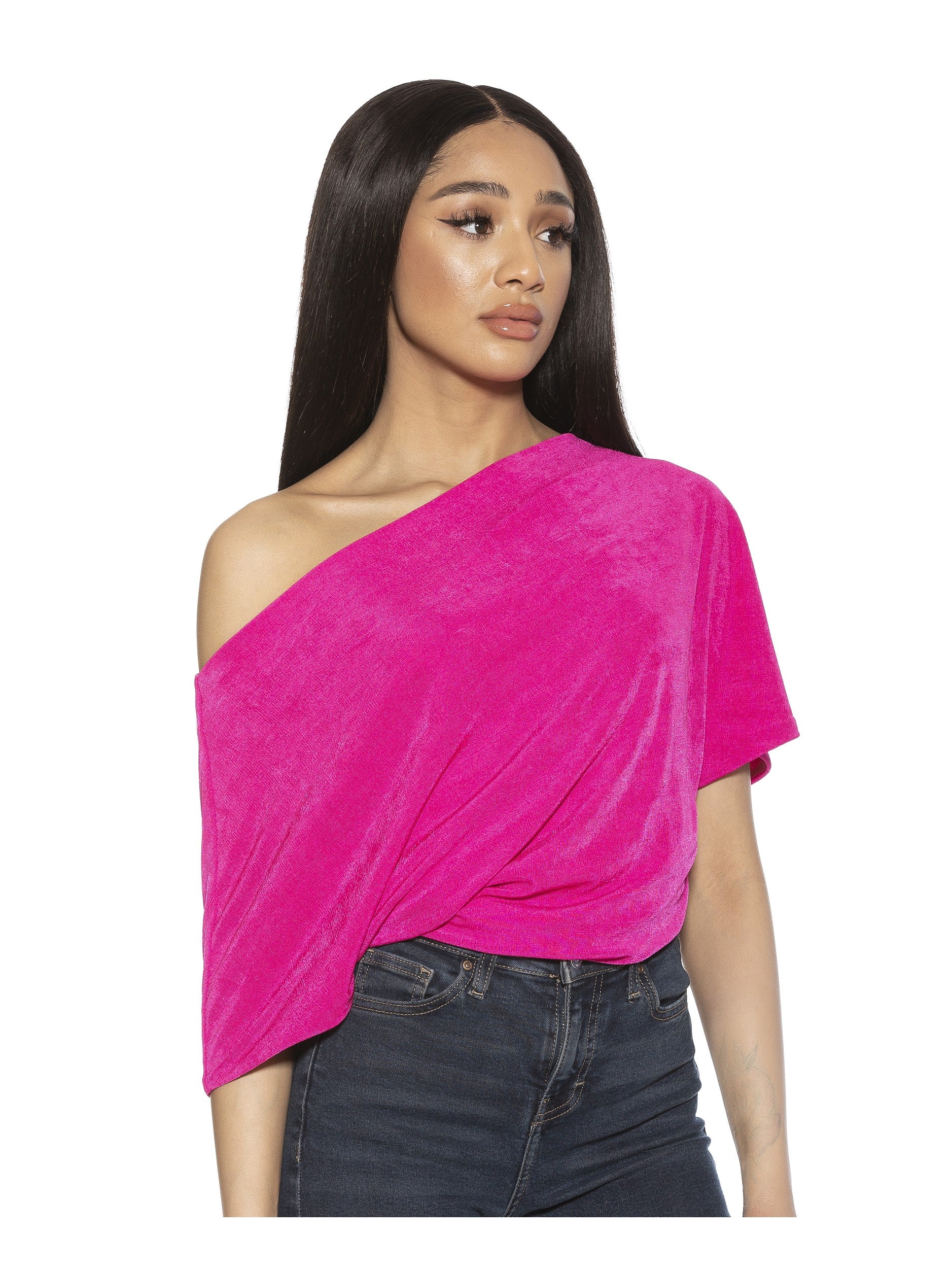 This One Shoulder Bodysuit is perfect for making a statement. Its off-shoulder design, short sleeve, draped silhouette, and sleek material provide a combination of style and comfort. This bodysuit is ideal for any occasion.