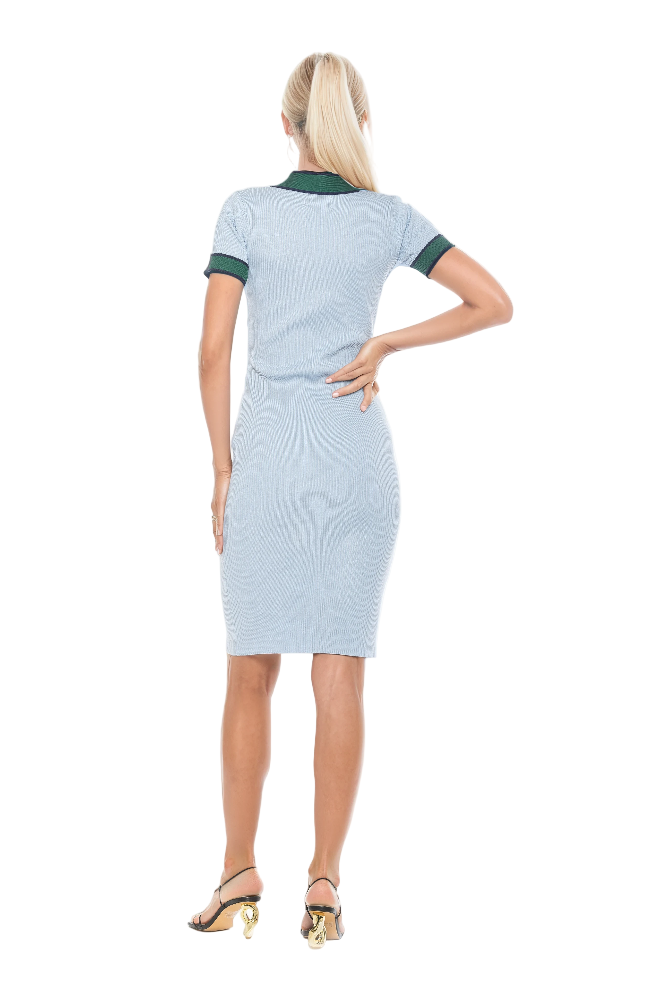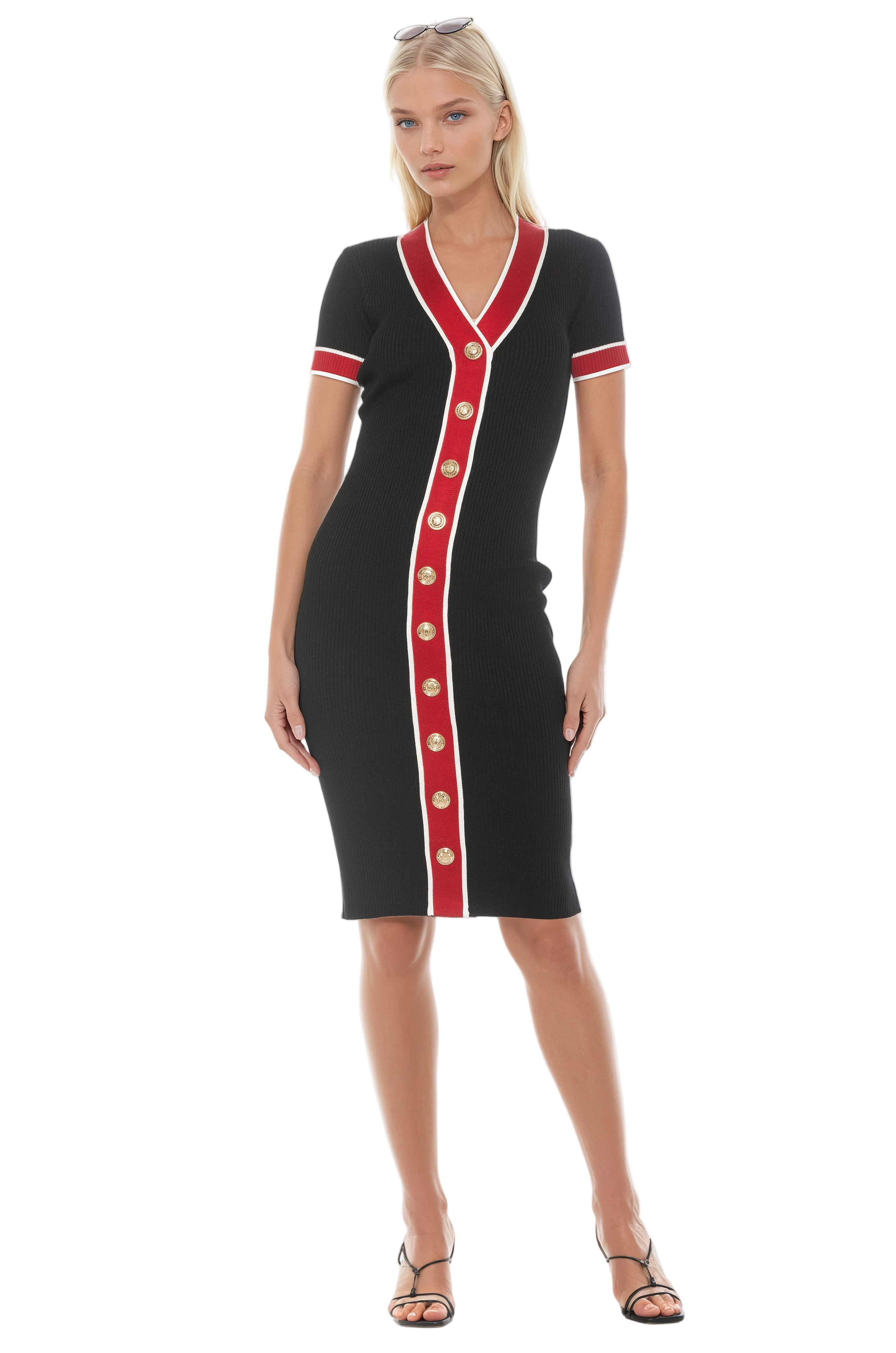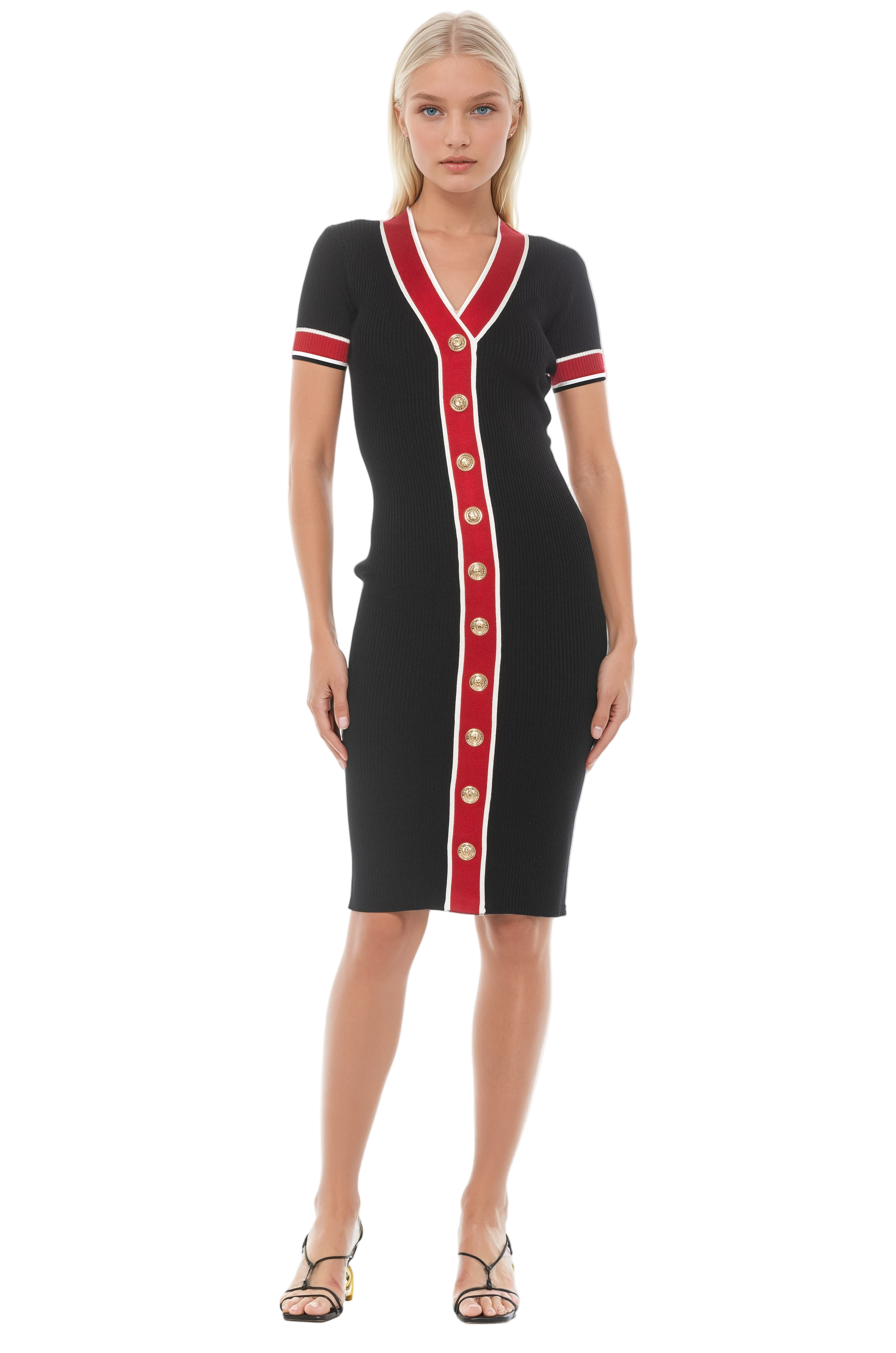 Effortless texture meets modern polish. Cut from a fine-rib knit, this midi dress features a flattering V-neckline, contrast piping that defines the silhouette and gold-tone buttons that elevate the design. Short sleeves and a structured yet stretch-rich body make it equally suited for daytime sophistication and evening transitions.