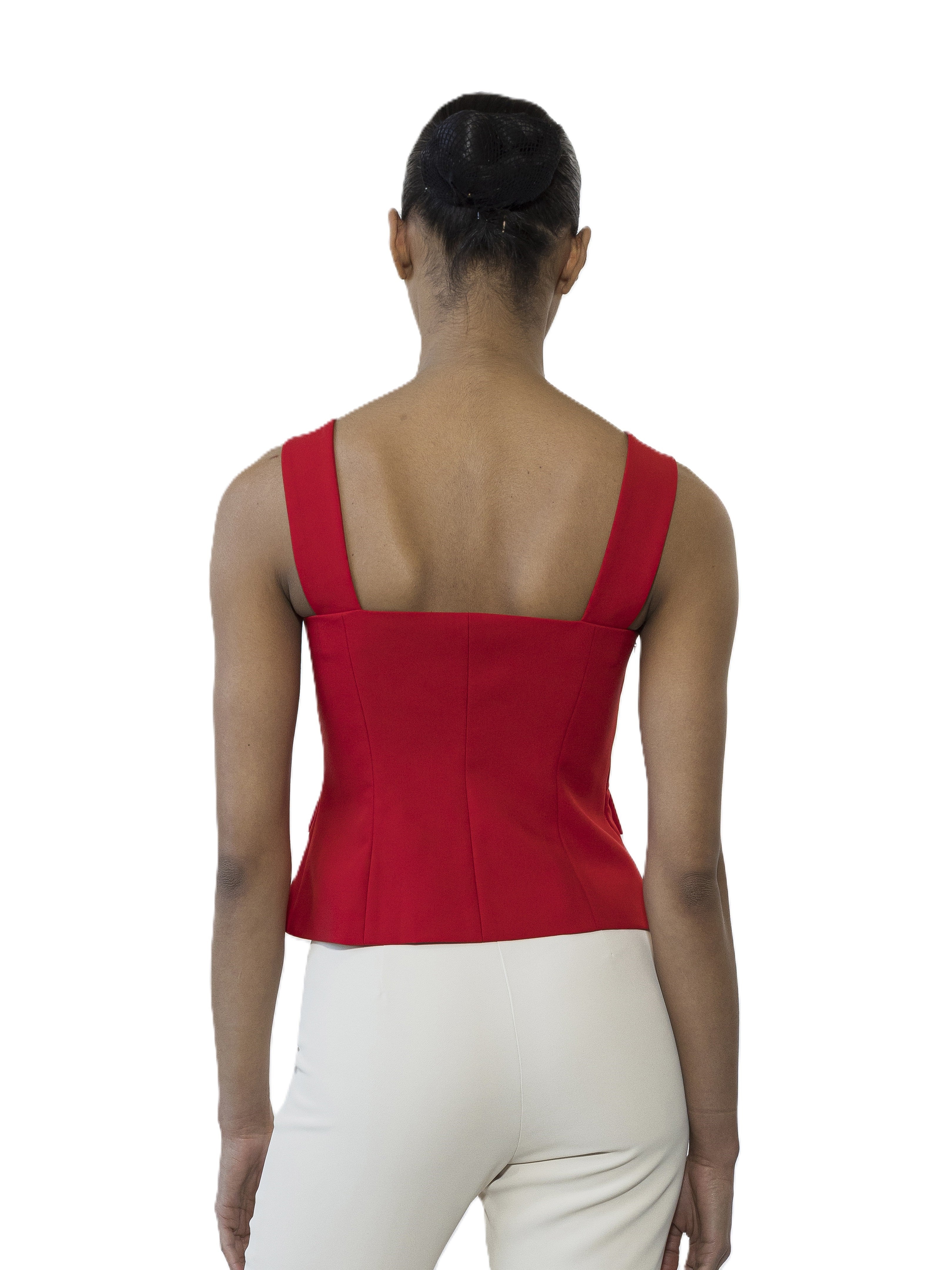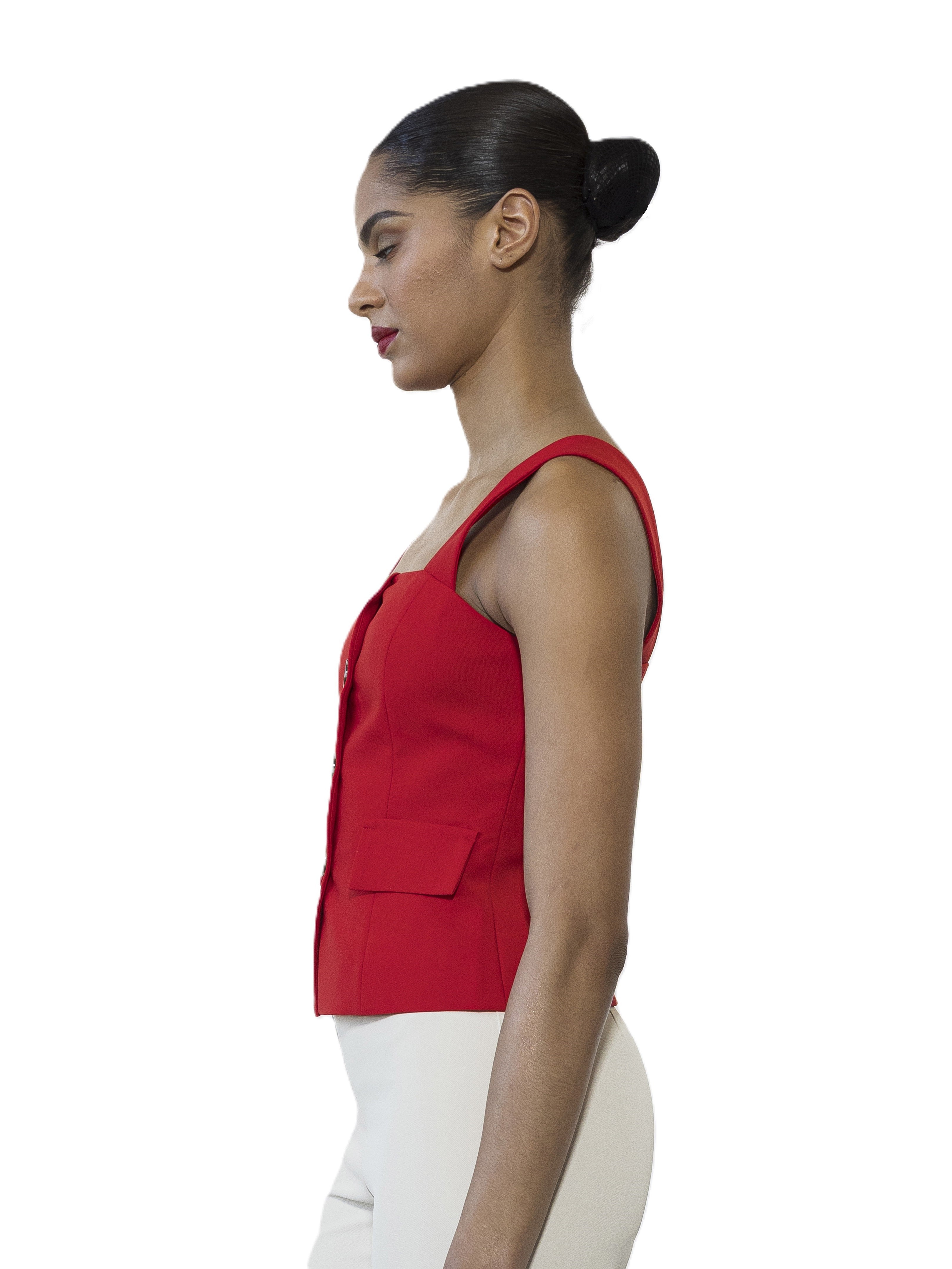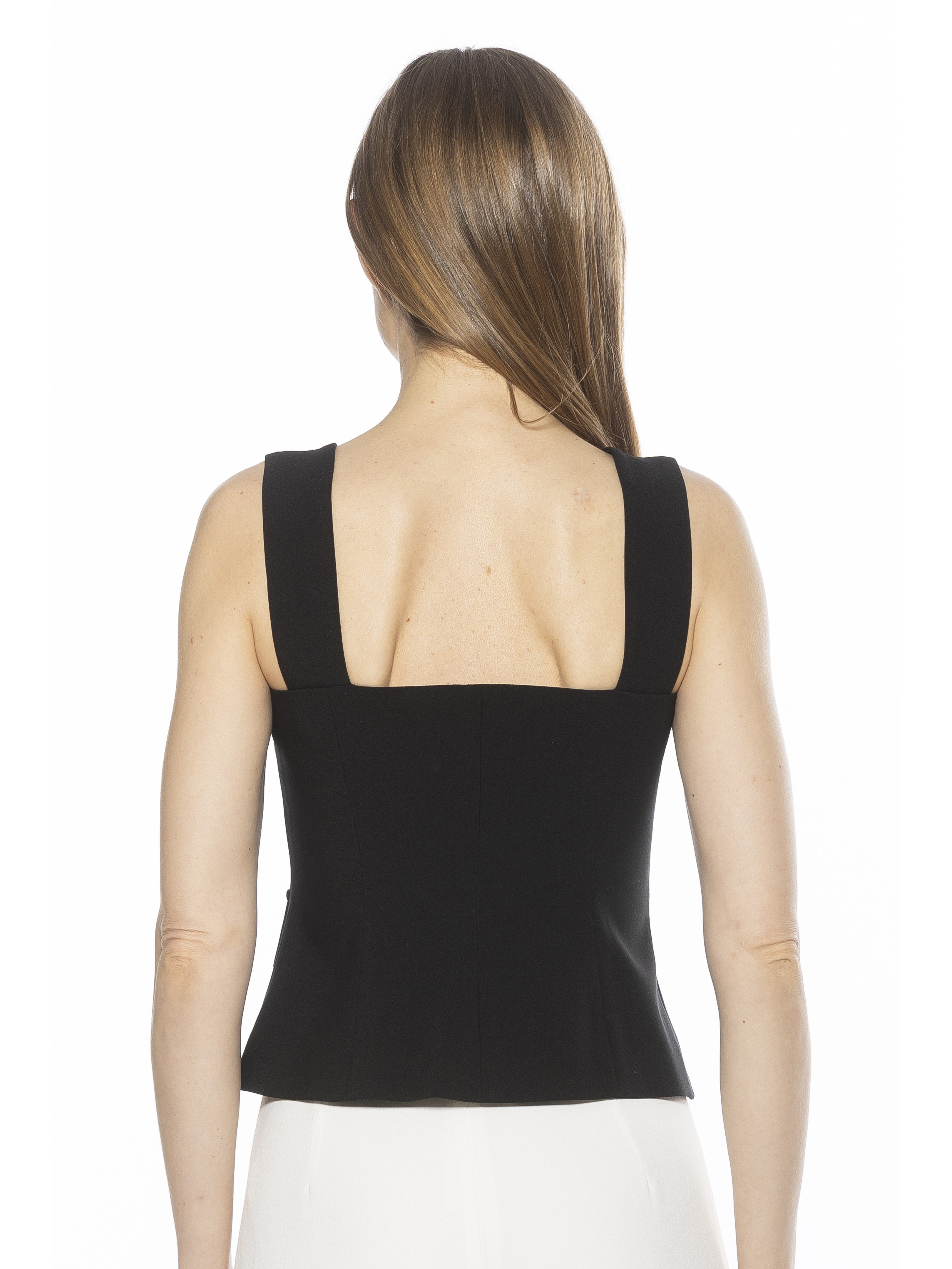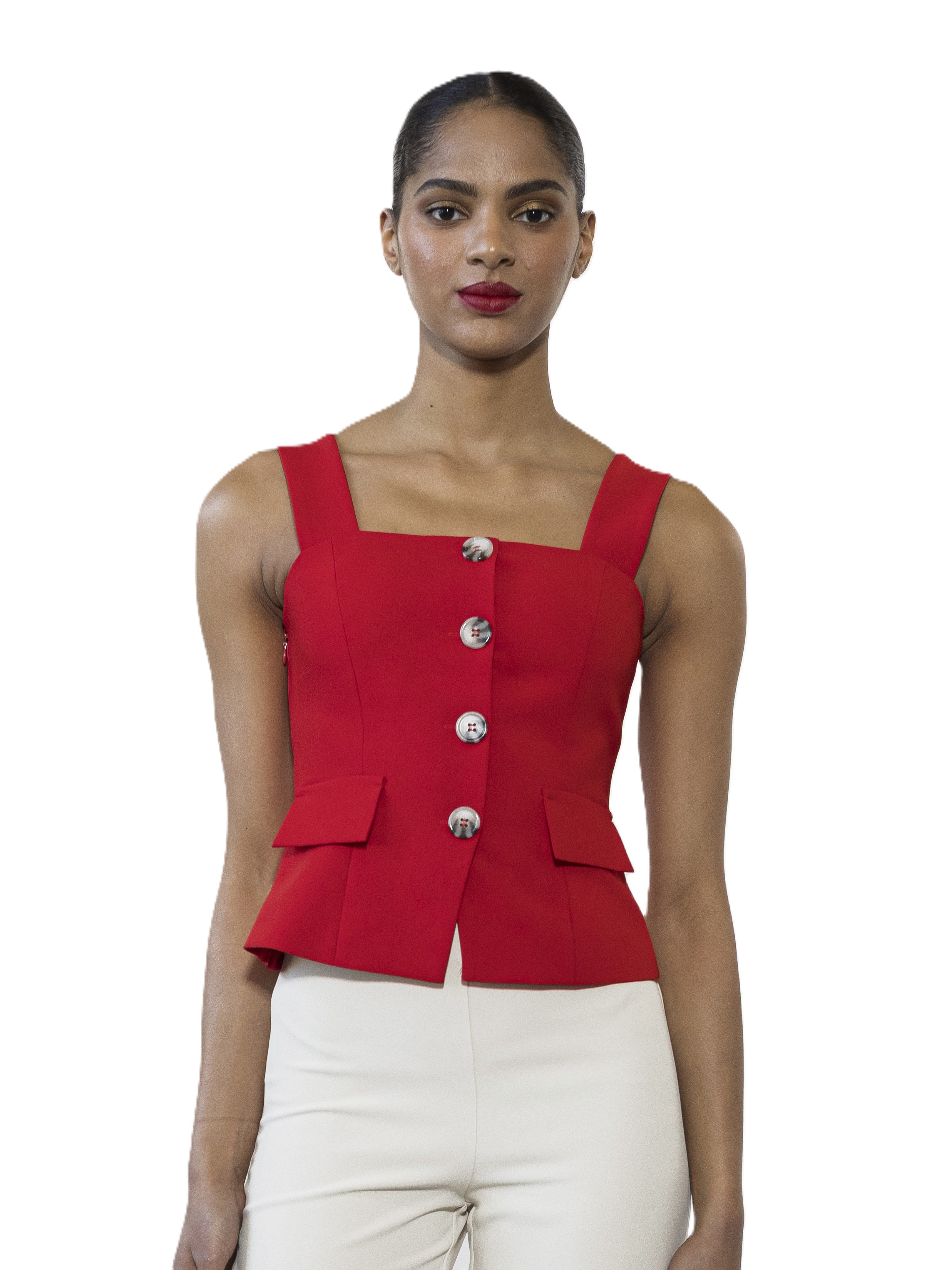 The Poelne Strap Button Down Vest Top Is A Must Have For Your Closet. This Top Features Luxe Fabric, Front Button Detailing, Straps, And Fitted Bodice. This Top Runs Small.